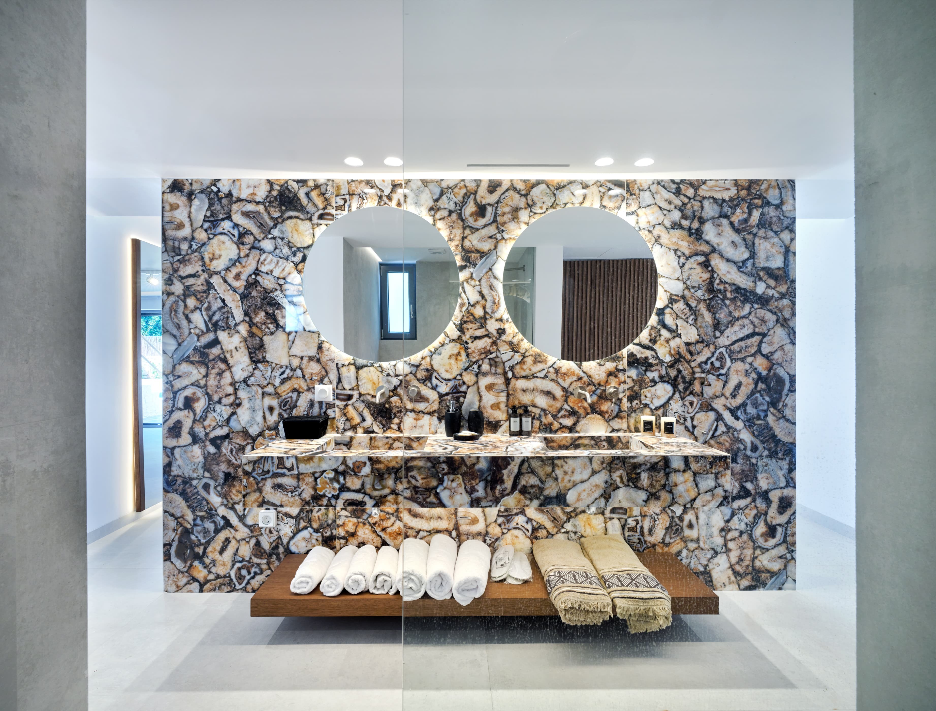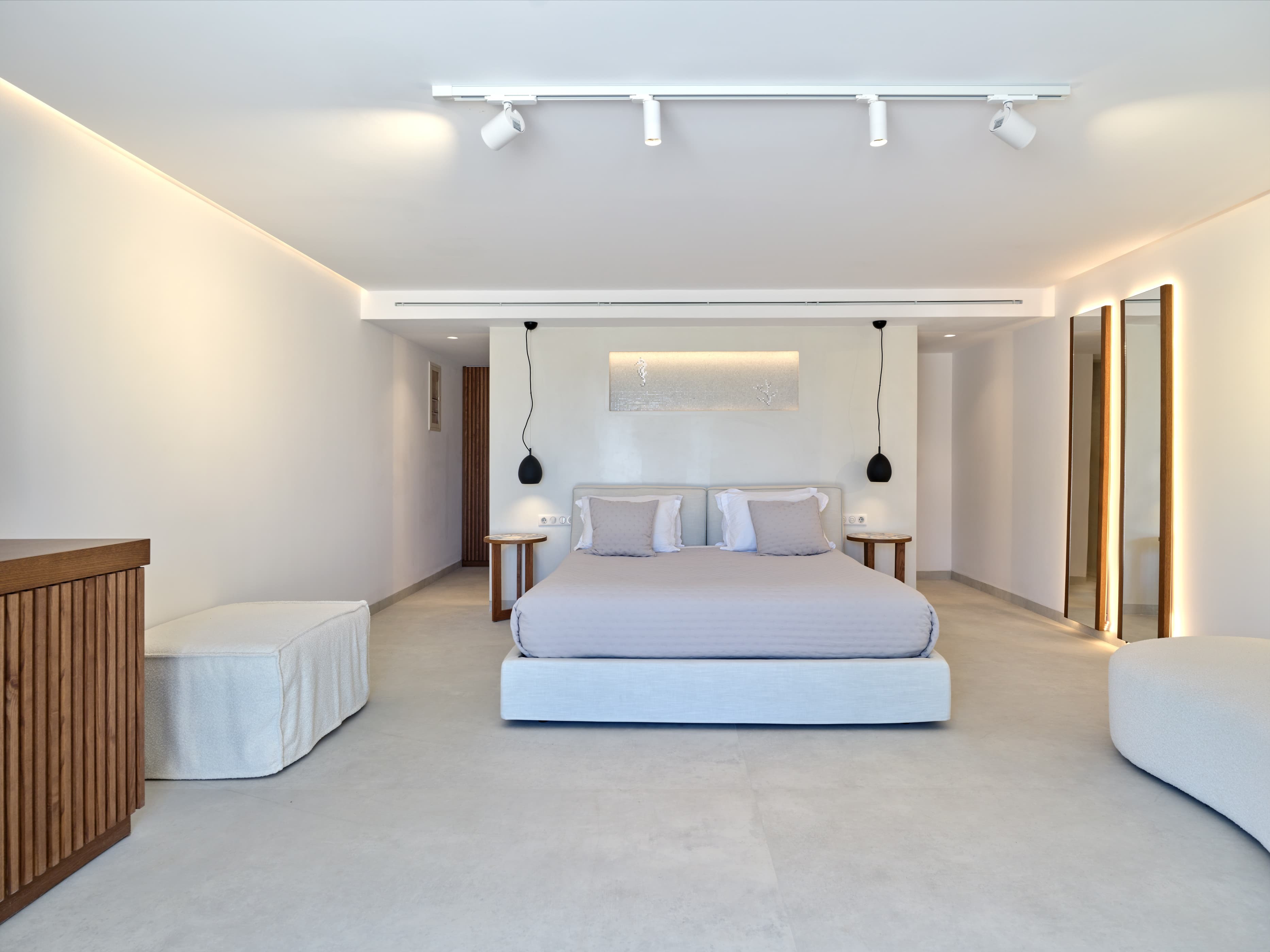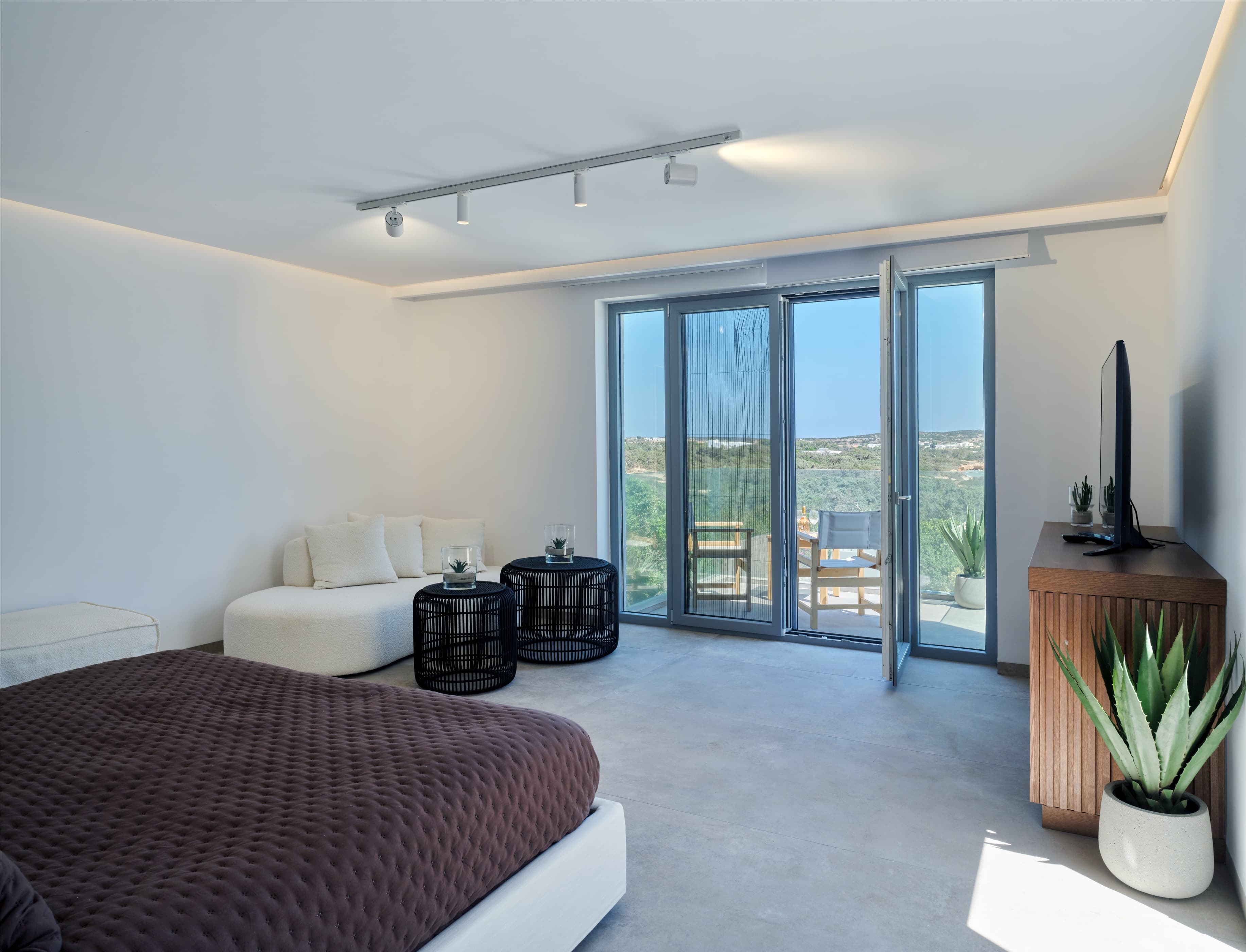Expansive, open-plan living areas designed to maximise light and uninterrupted views across Santa Maria Bay and the Aegean. The main lounge flows directly onto the veranda and outdoor terraces, creating a seamless indoor-outdoor environment where the landscape becomes part of the experience. Multiple living areas across different levels allow for both social gatherings and quieter, more private moments.
