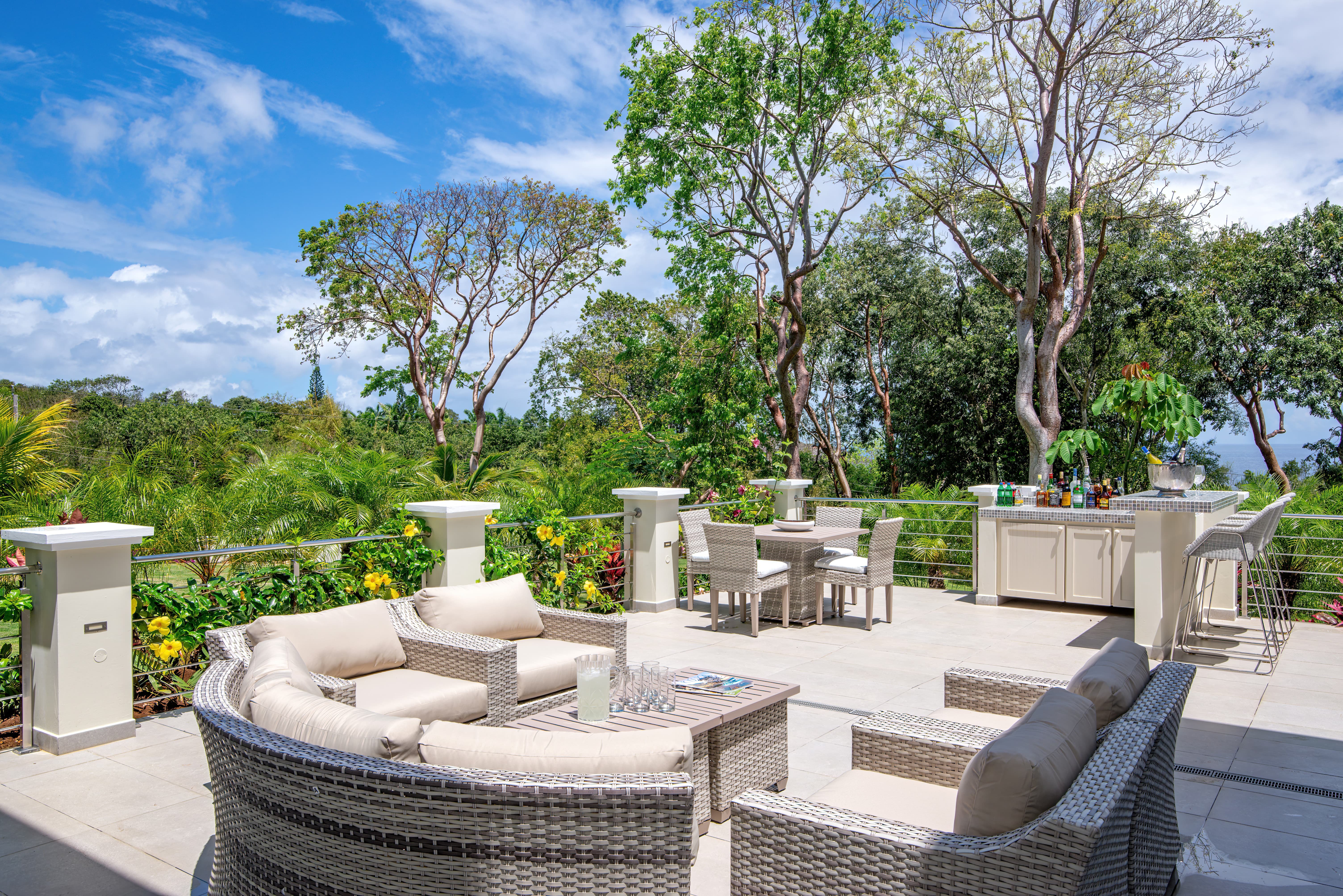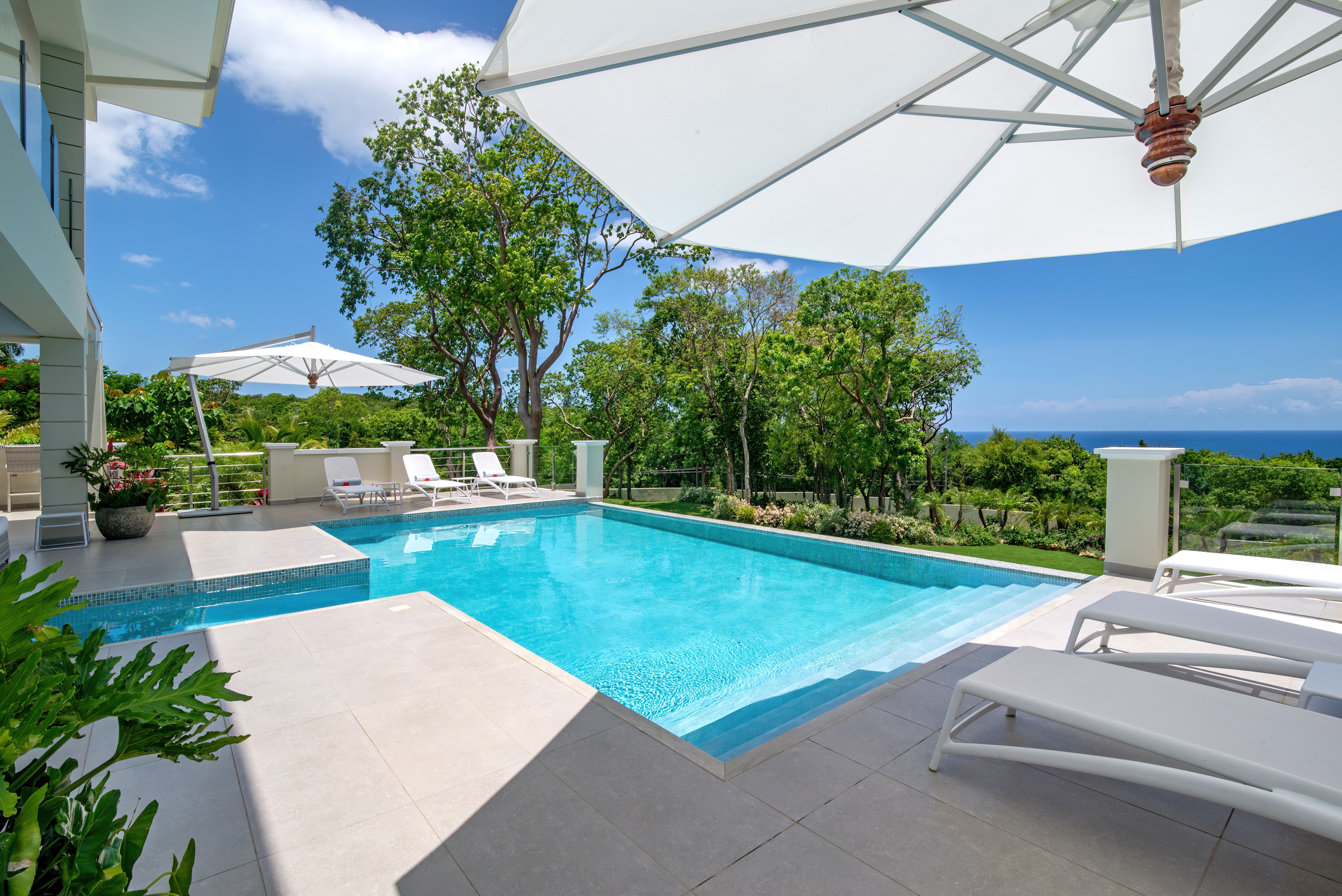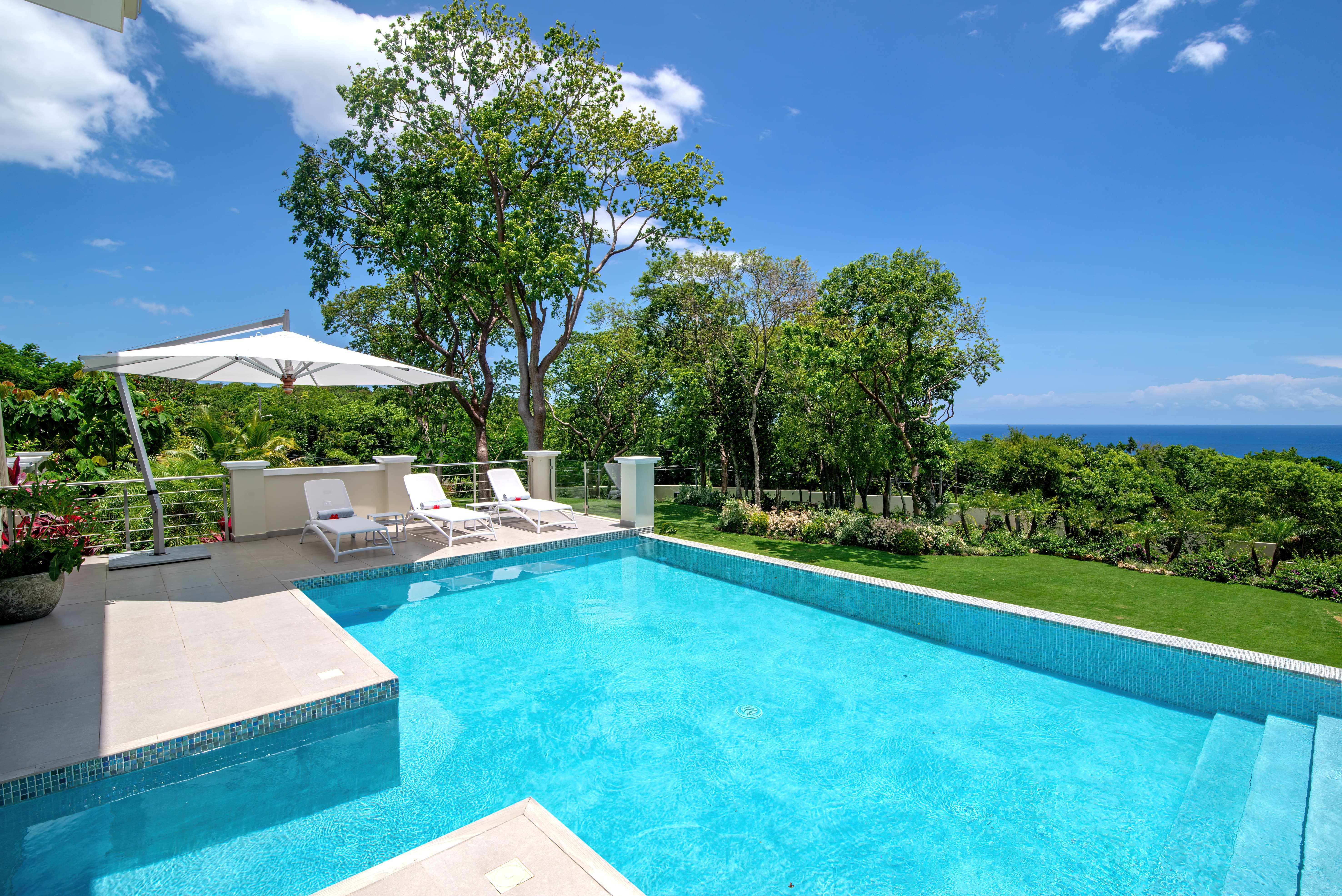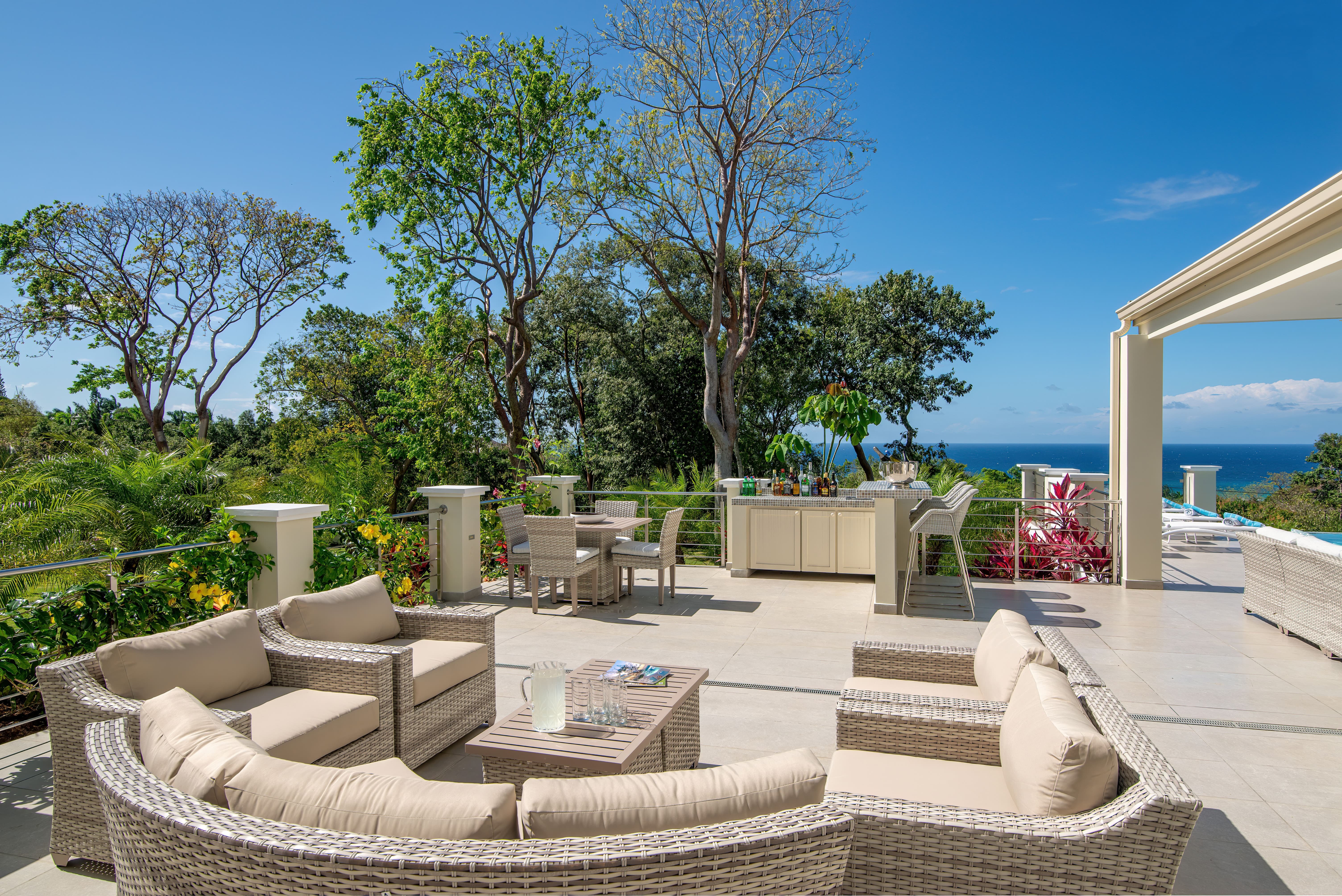 Expansive terraces and landscaped gardens frame a private swimming pool with sun loungers and shaded seating. Outdoor dining areas invite leisurely meals in the open air, with views stretching across the coastline and Caribbean Sea.
