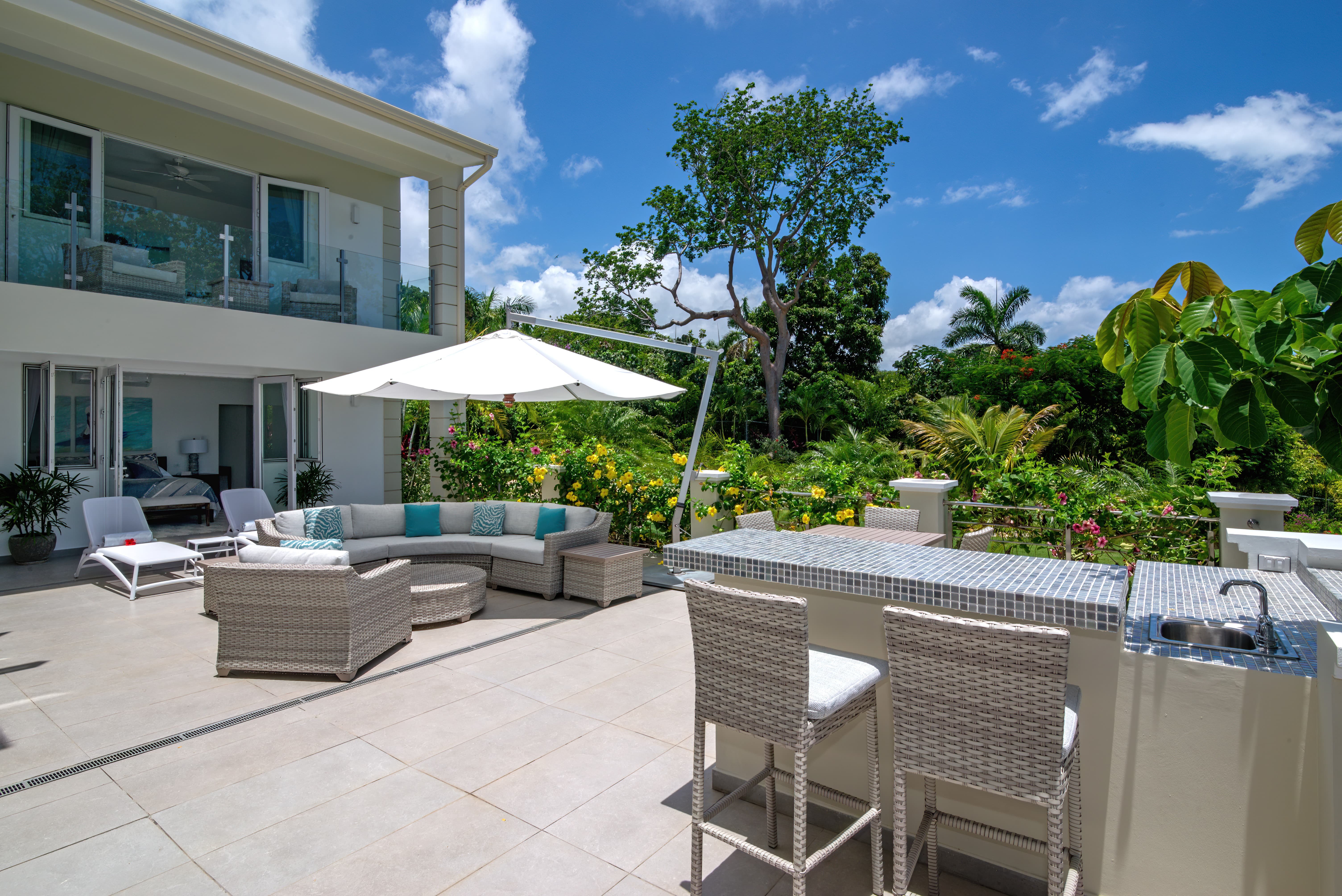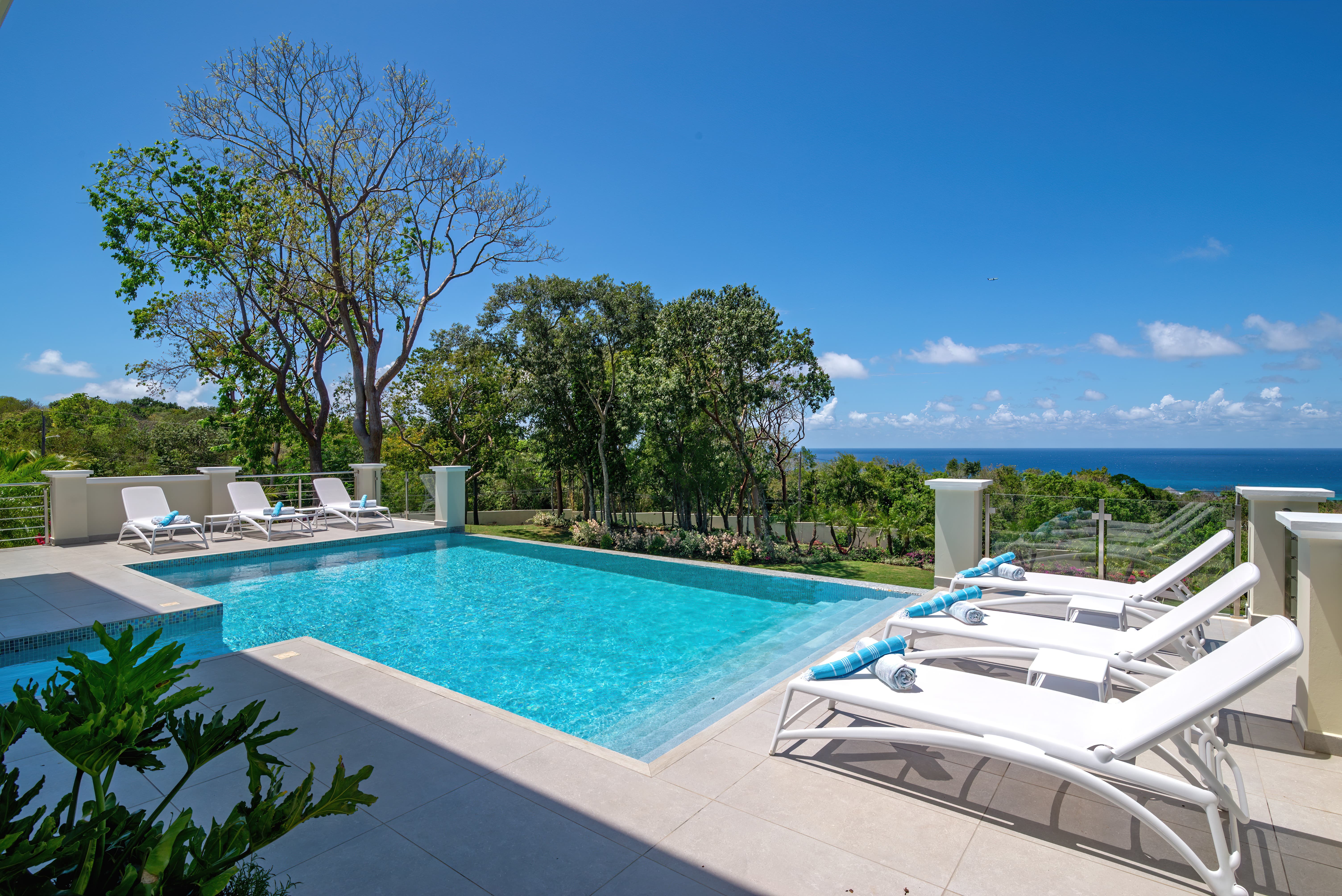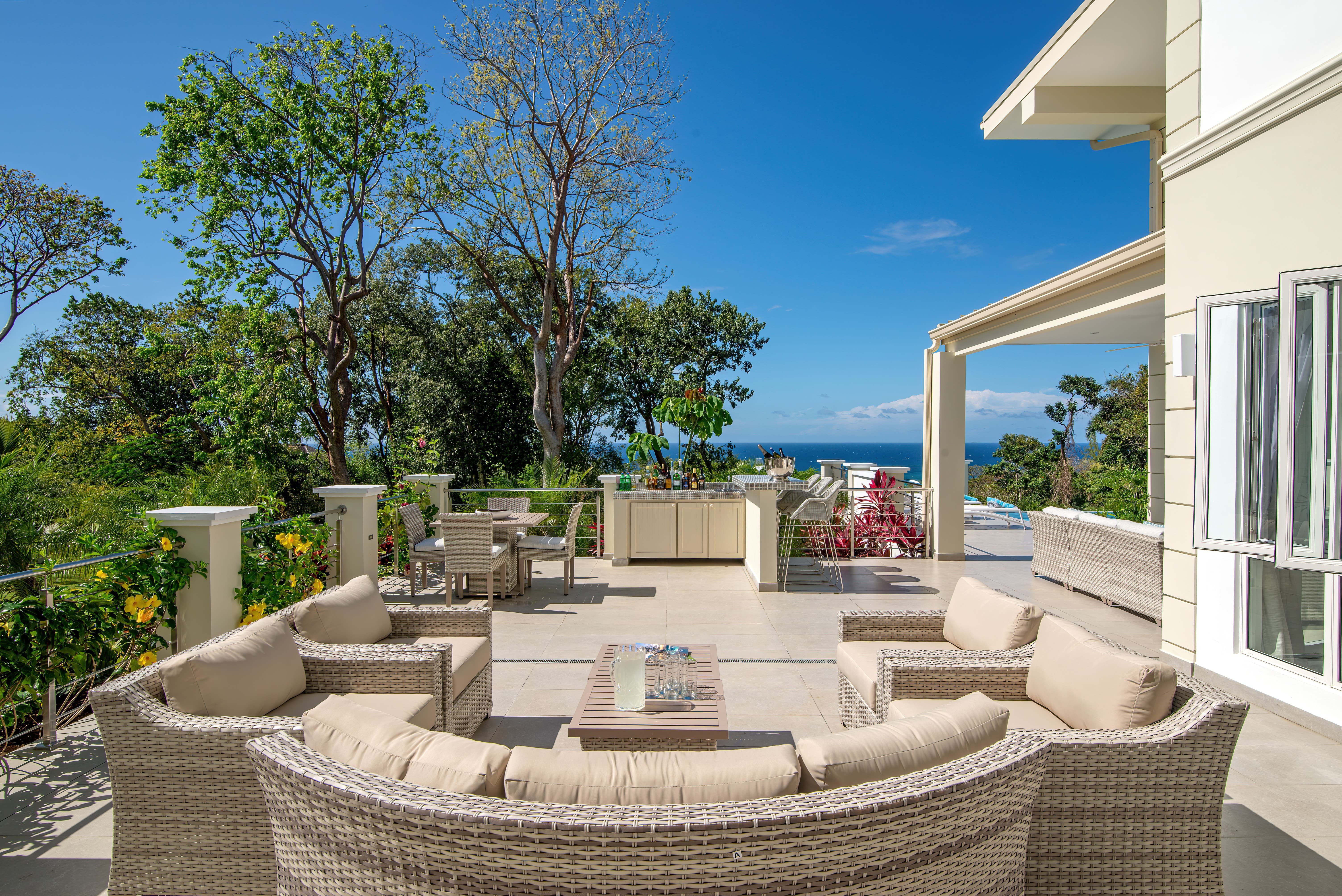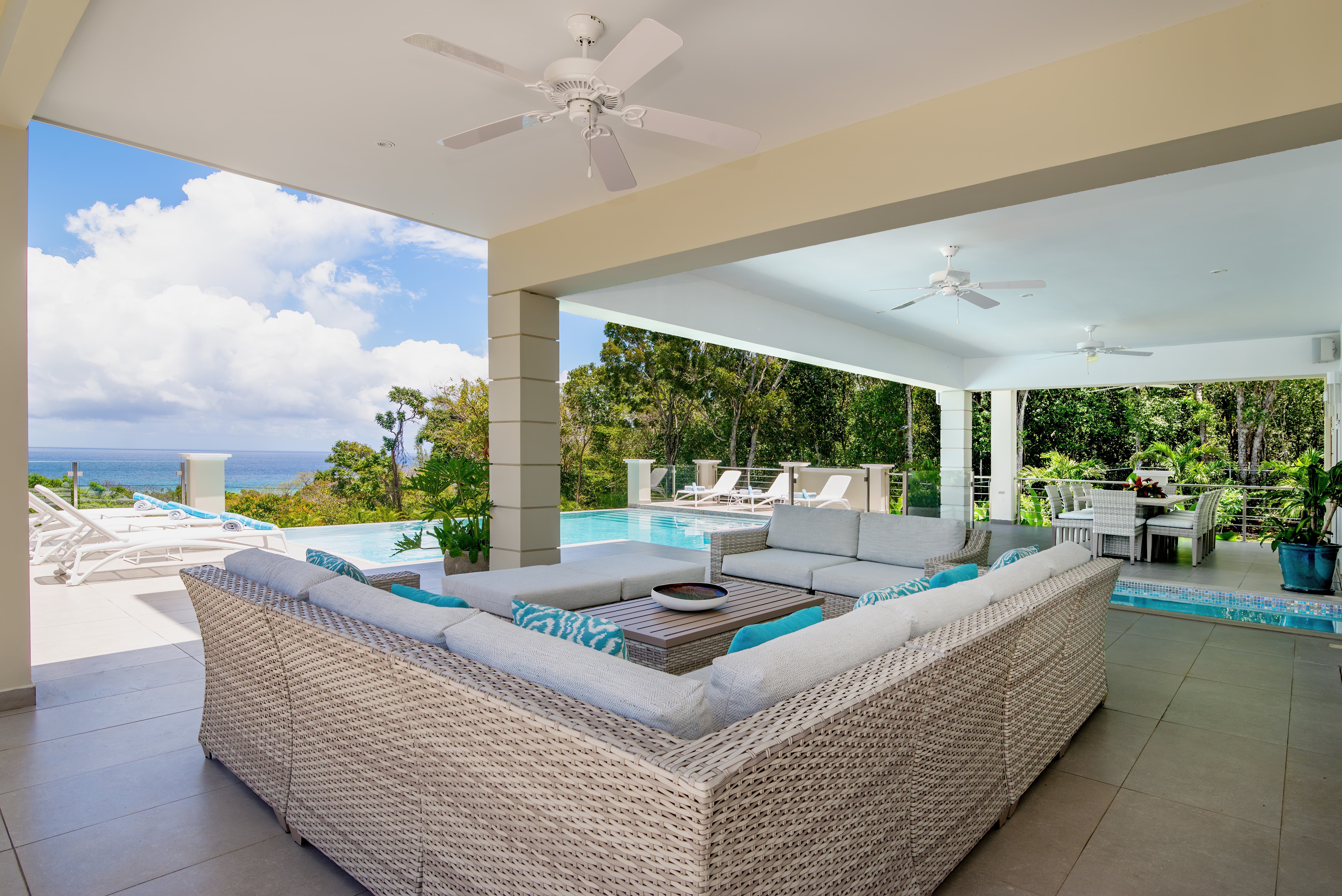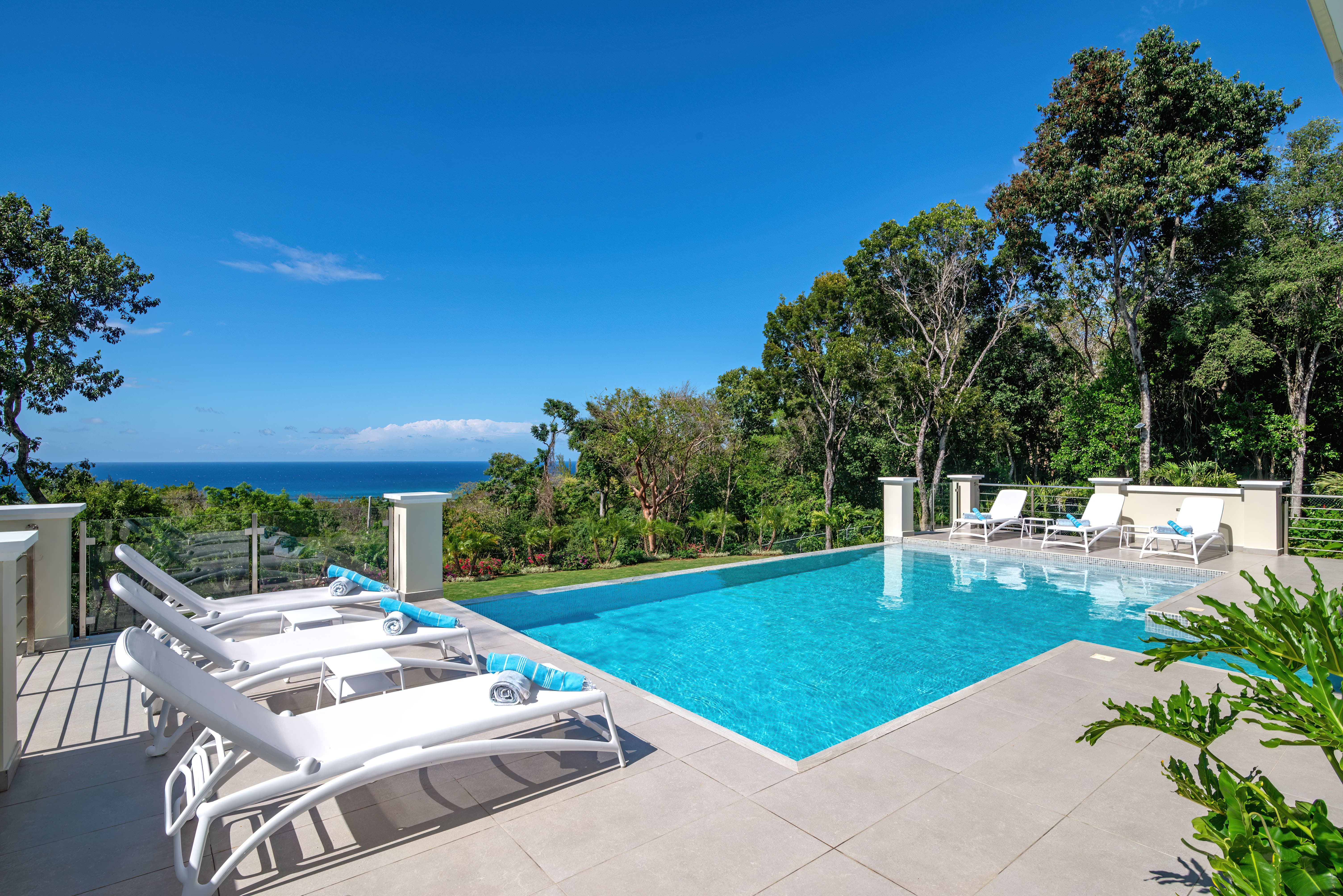 Expansive terraces and landscaped gardens frame a private swimming pool with sun loungers and shaded seating. Outdoor dining areas invite leisurely meals in the open air, with views stretching across the coastline and Caribbean Sea.