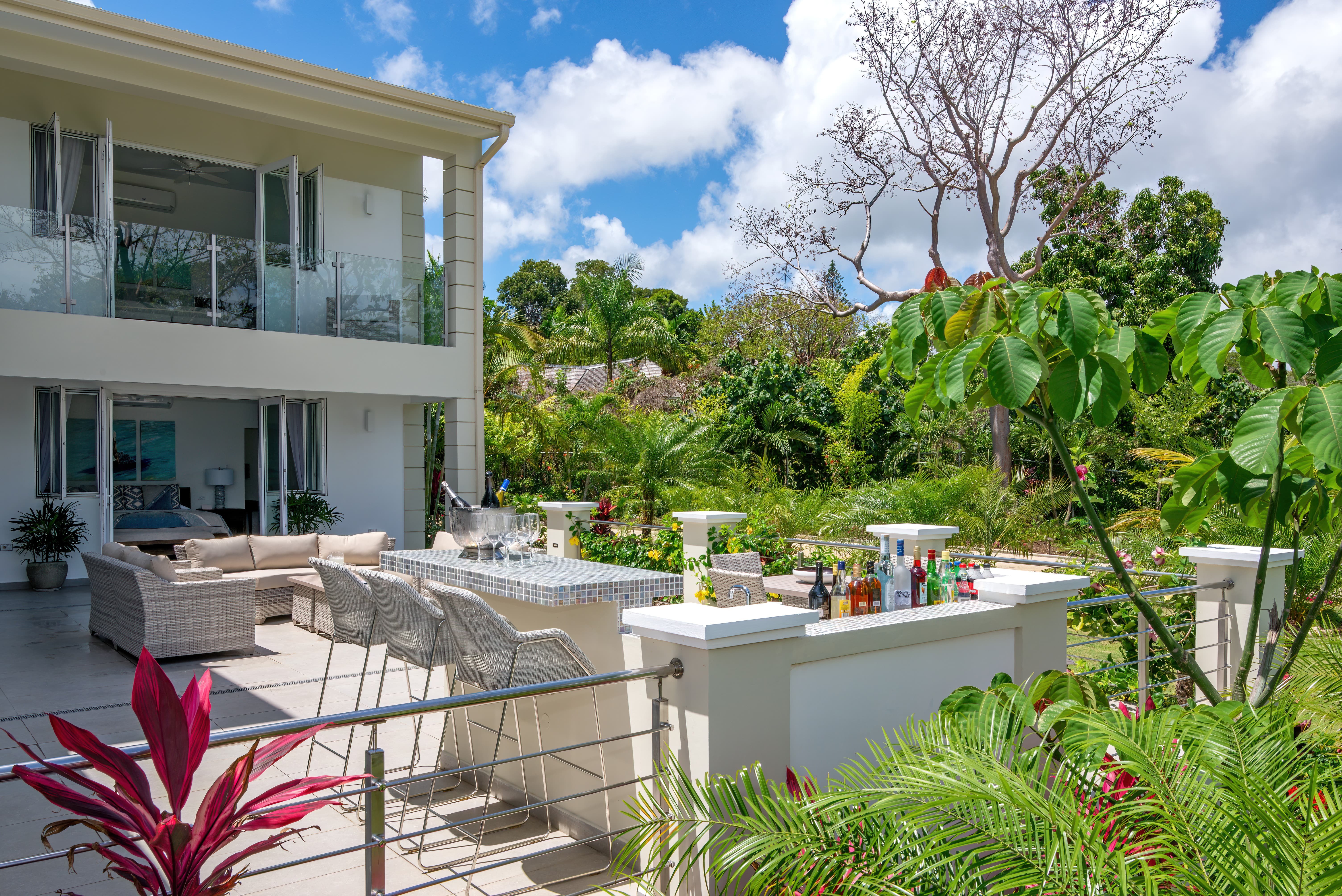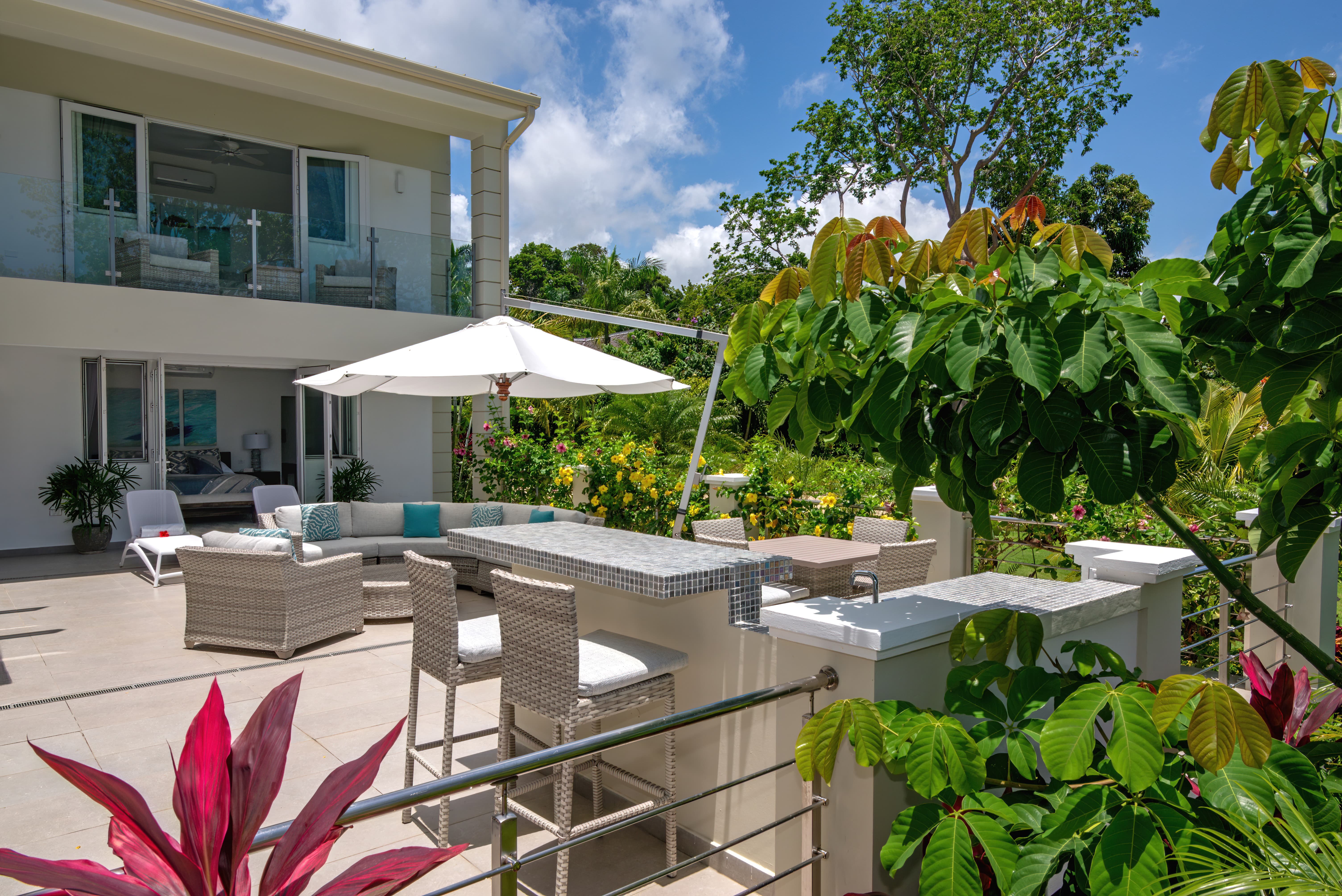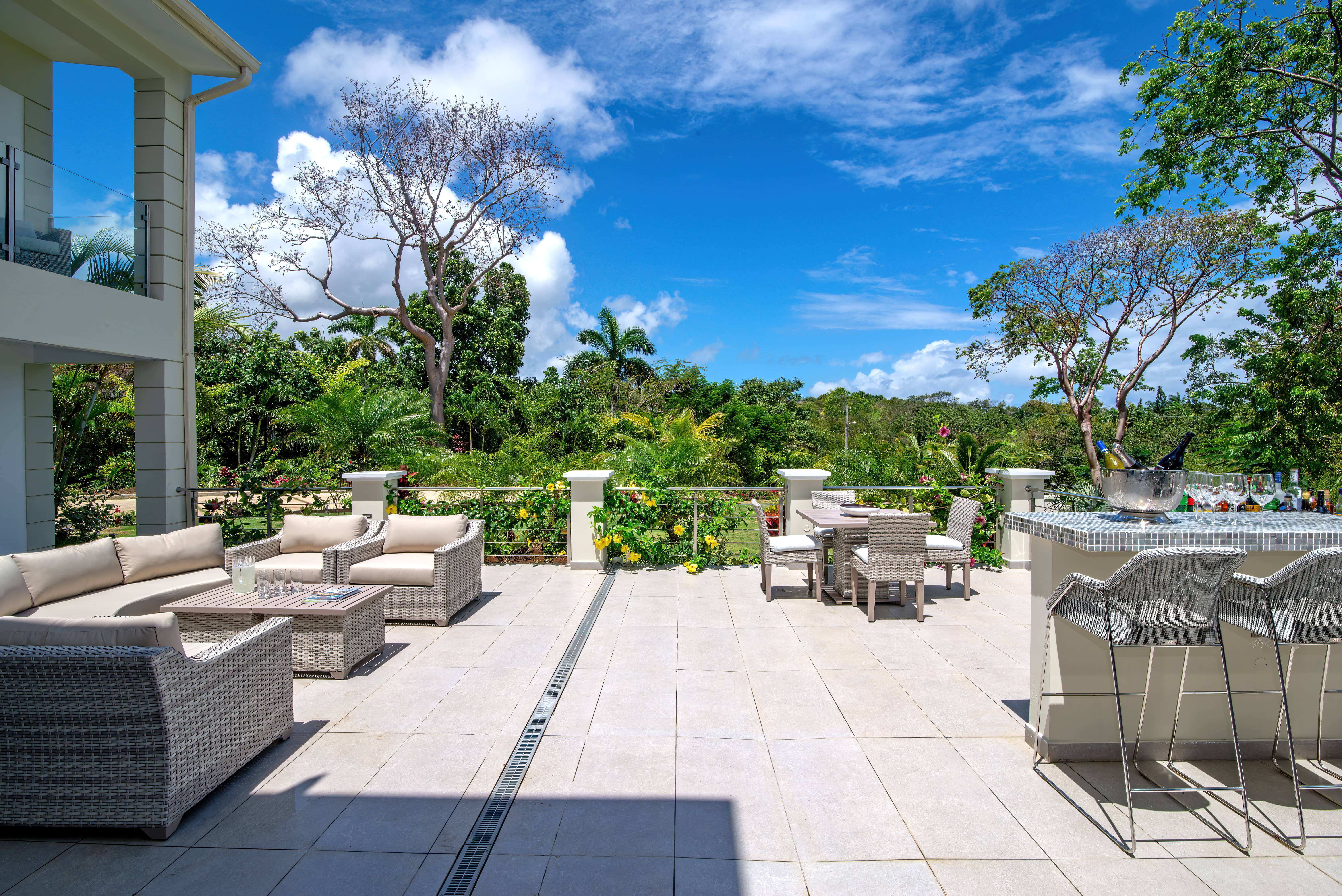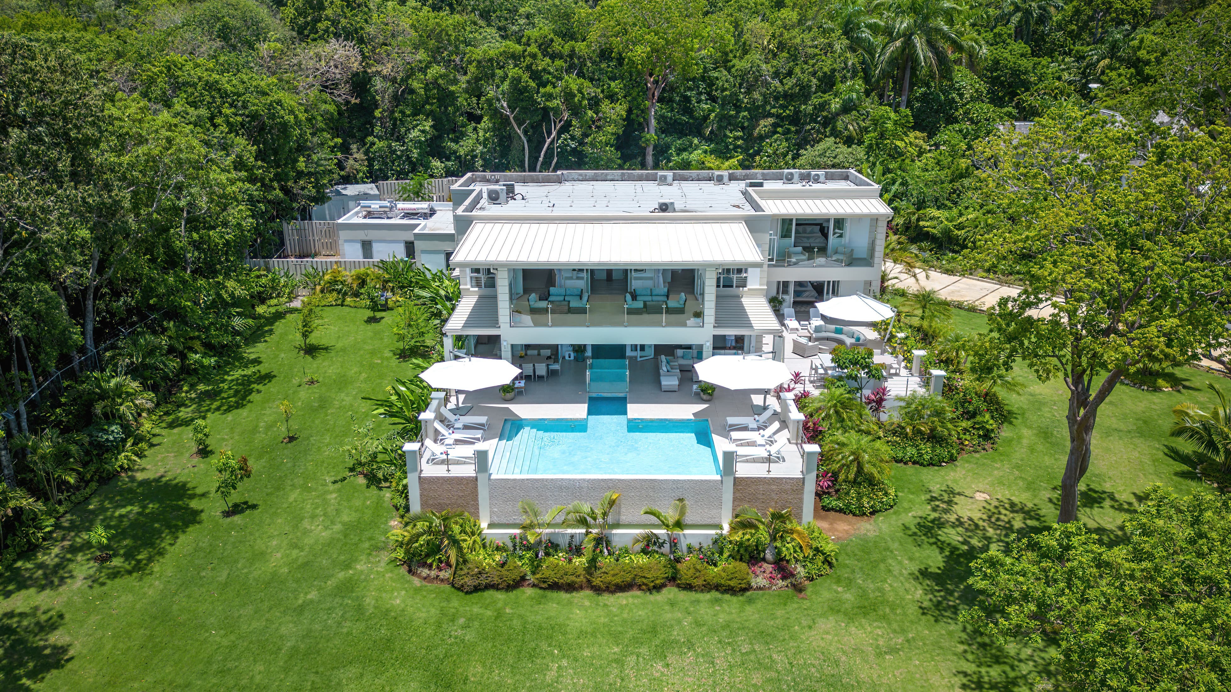 Expansive terraces and landscaped gardens frame a private swimming pool with sun loungers and shaded seating. Outdoor dining areas invite leisurely meals in the open air, with views stretching across the coastline and Caribbean Sea.