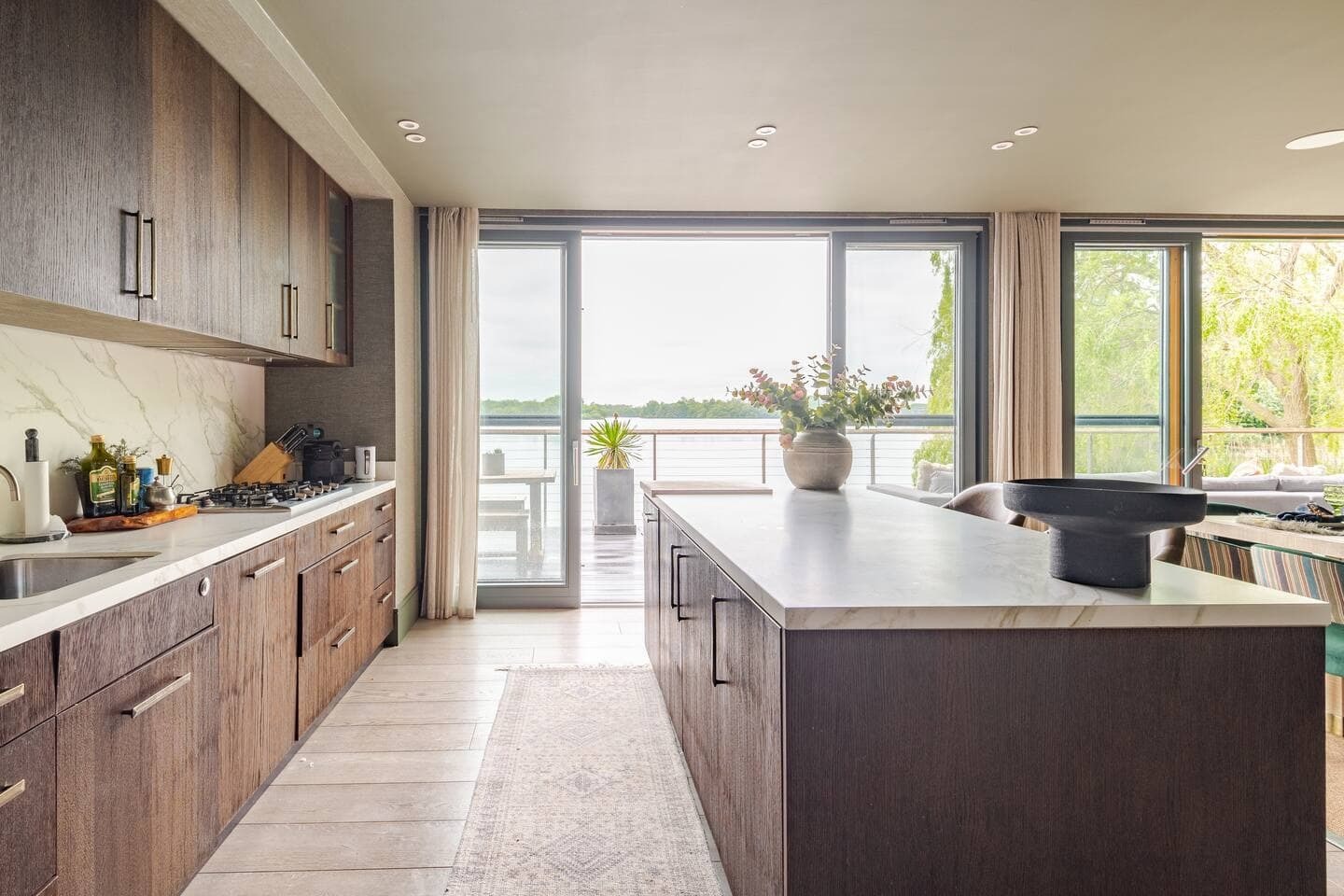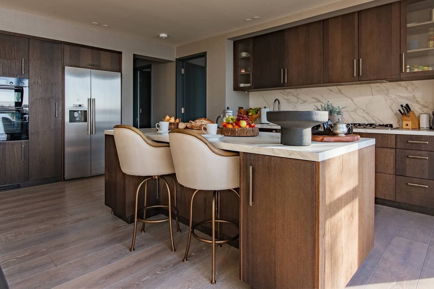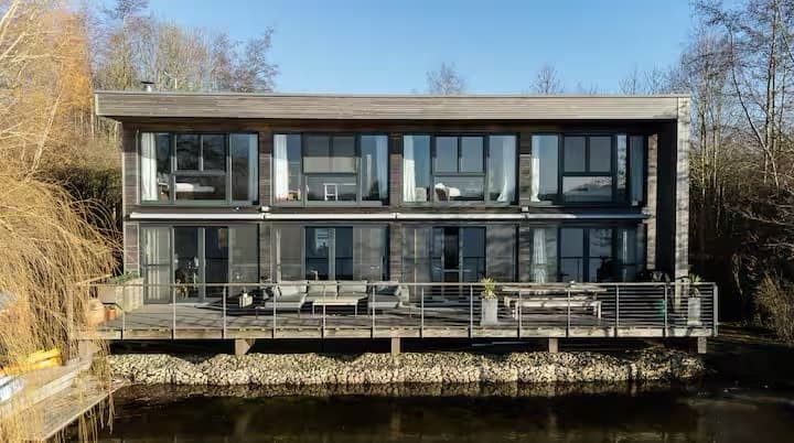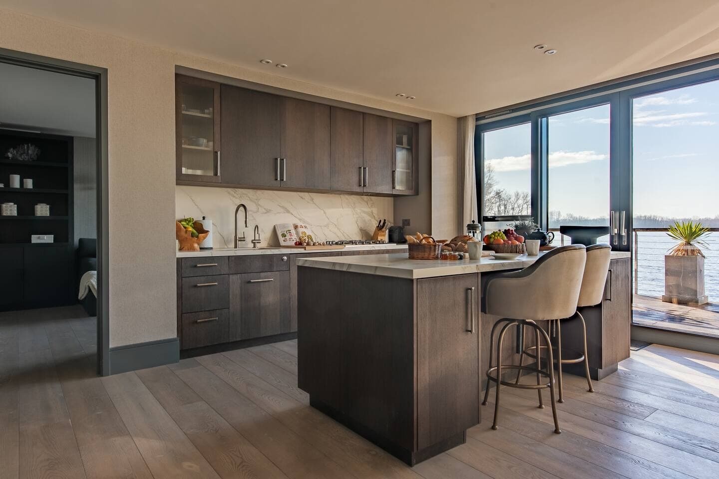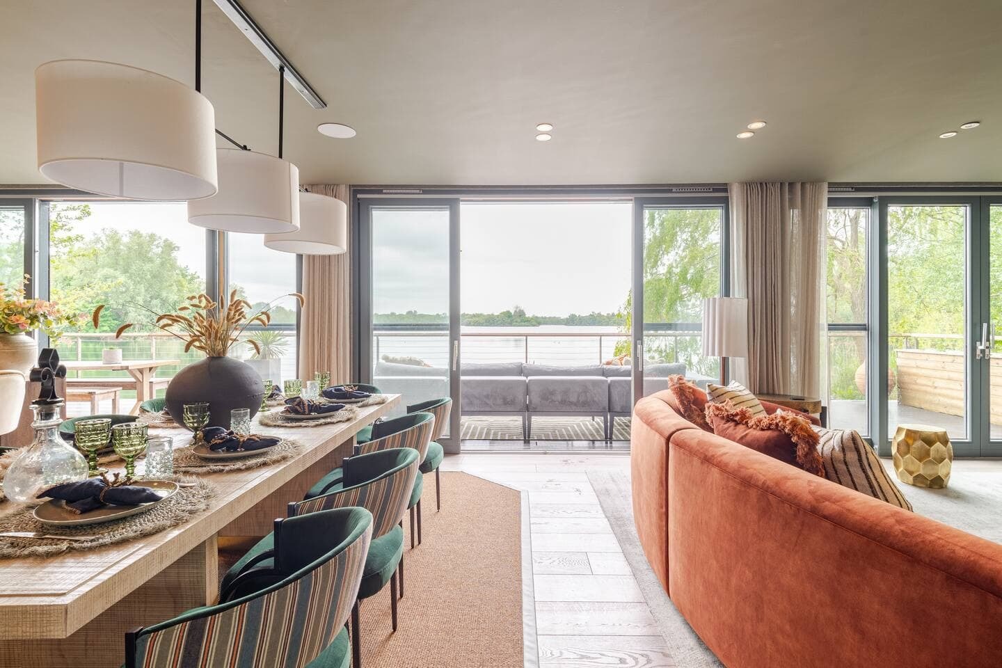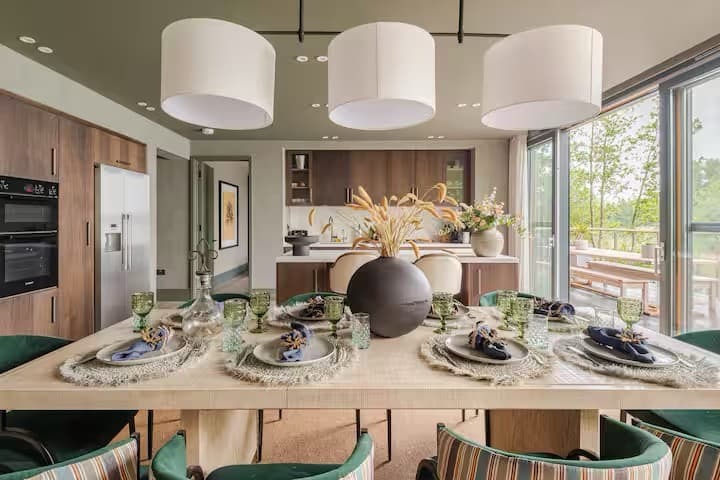 The kitchen is fully equipped and thoughtfully laid out, ideal for shared cooking or catered meals. Modern appliances, generous worktops, and a sociable layout make it easy to gather while preparing food. Dining spaces are positioned to enjoy lake views, whether indoors or outside, making every meal feel unhurried and connected to the setting.
