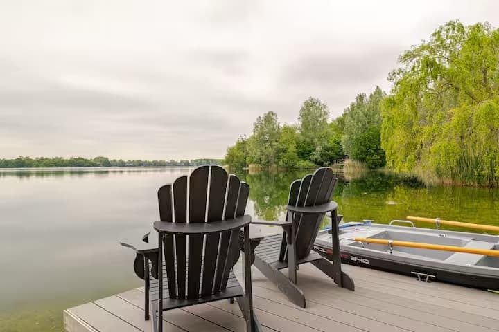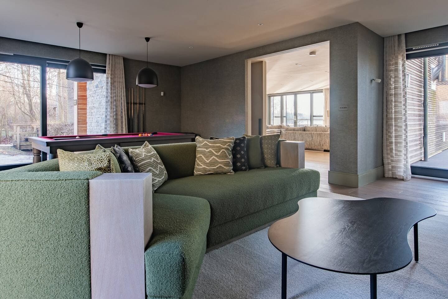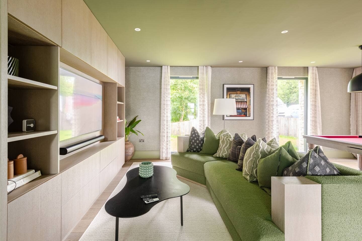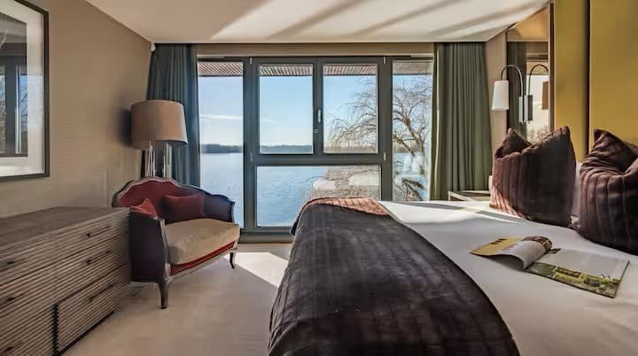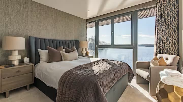 Bowmore Lodge offers generous, light filled living areas designed around the lake views. The main living space is open and welcoming, with large windows and doors that frame the water and allow daylight to pour in throughout the year. The atmosphere is calm and refined, combining modern classic design with comfortable furnishings that suit both relaxed family time and social gatherings. At 3,500 sq ft, the house feels spacious without losing its sense of warmth.