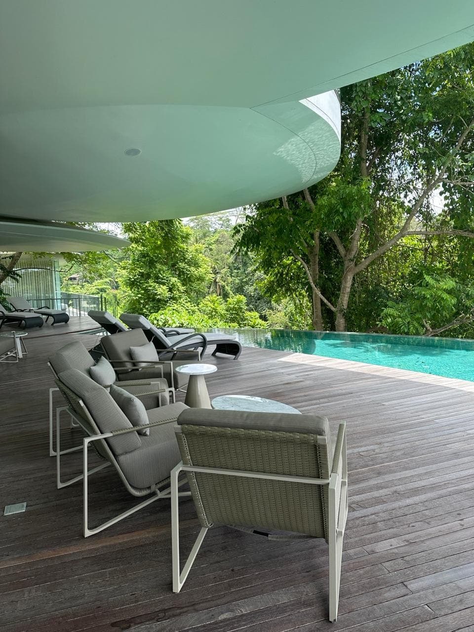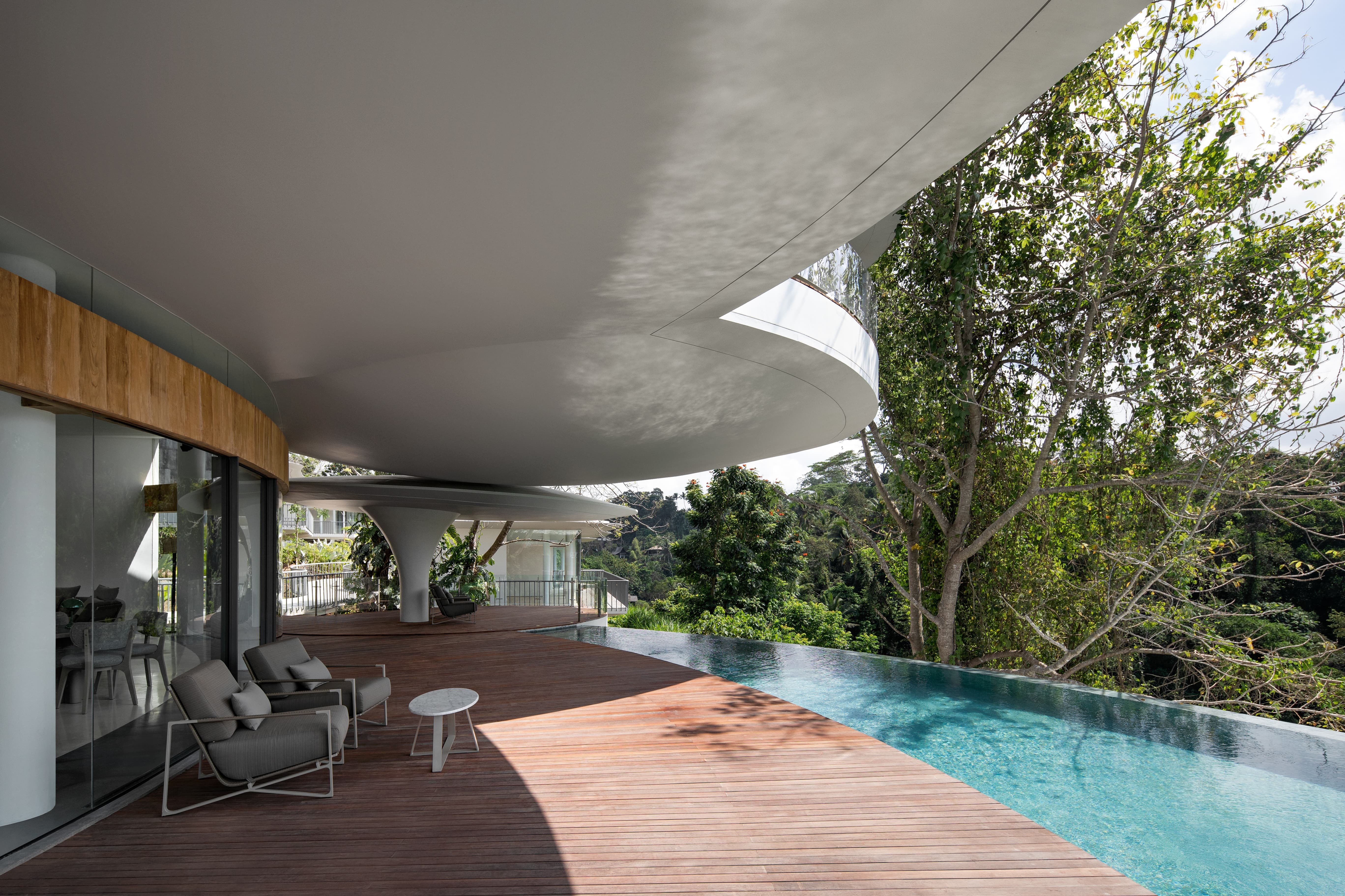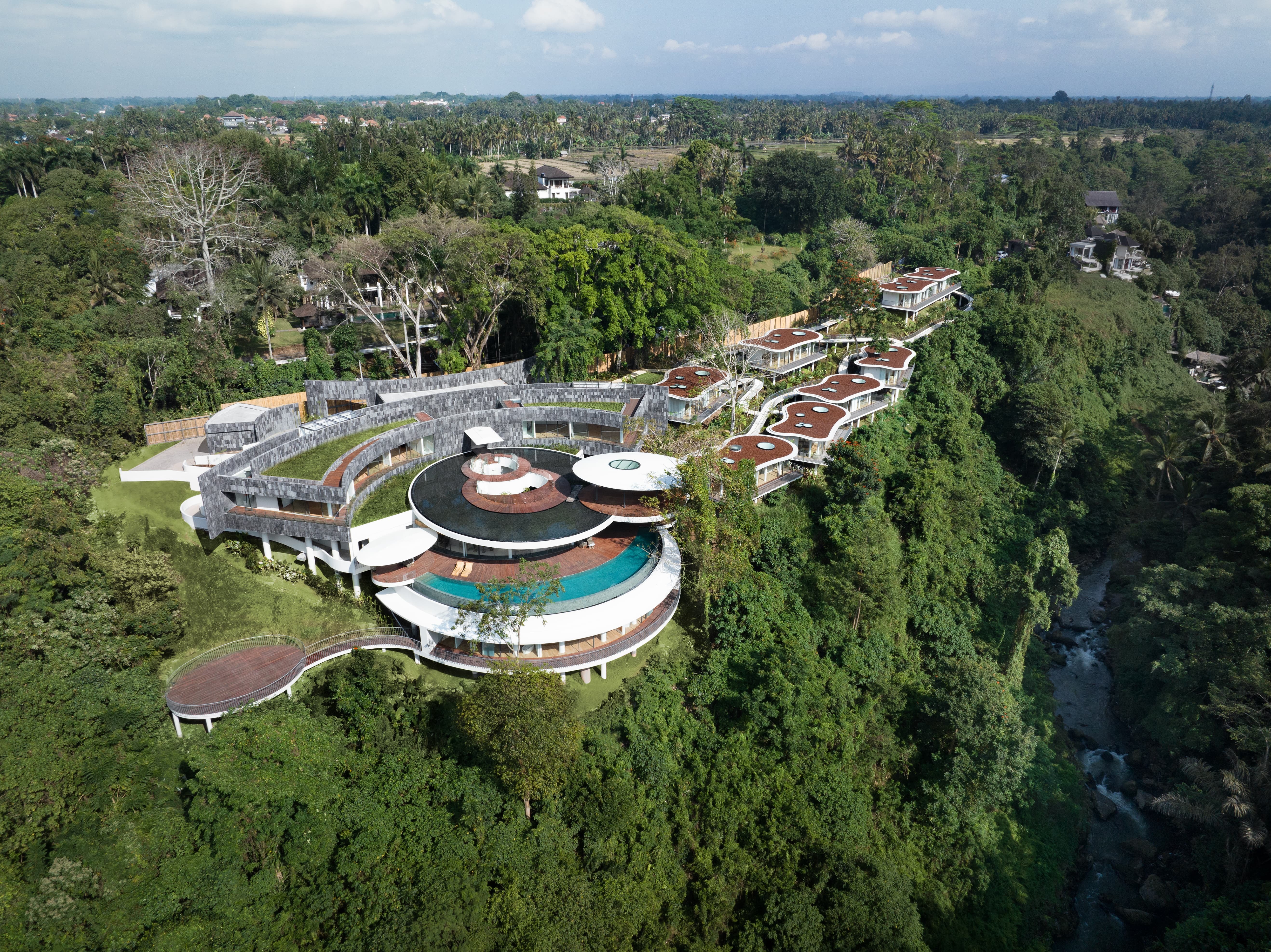 This private estate offers a refined sanctuary where curved modern architecture meets traditional Balinese influences. Villas sit quietly among the surrounding greenery, each designed as a self-contained retreat with spacious living areas, private terraces, and panoramic views across jungle valleys or river ravines. Interiors combine natural textures, soft tones, and thoughtful craftsmanship, creating an atmosphere that feels both sophisticated and deeply connected to nature.