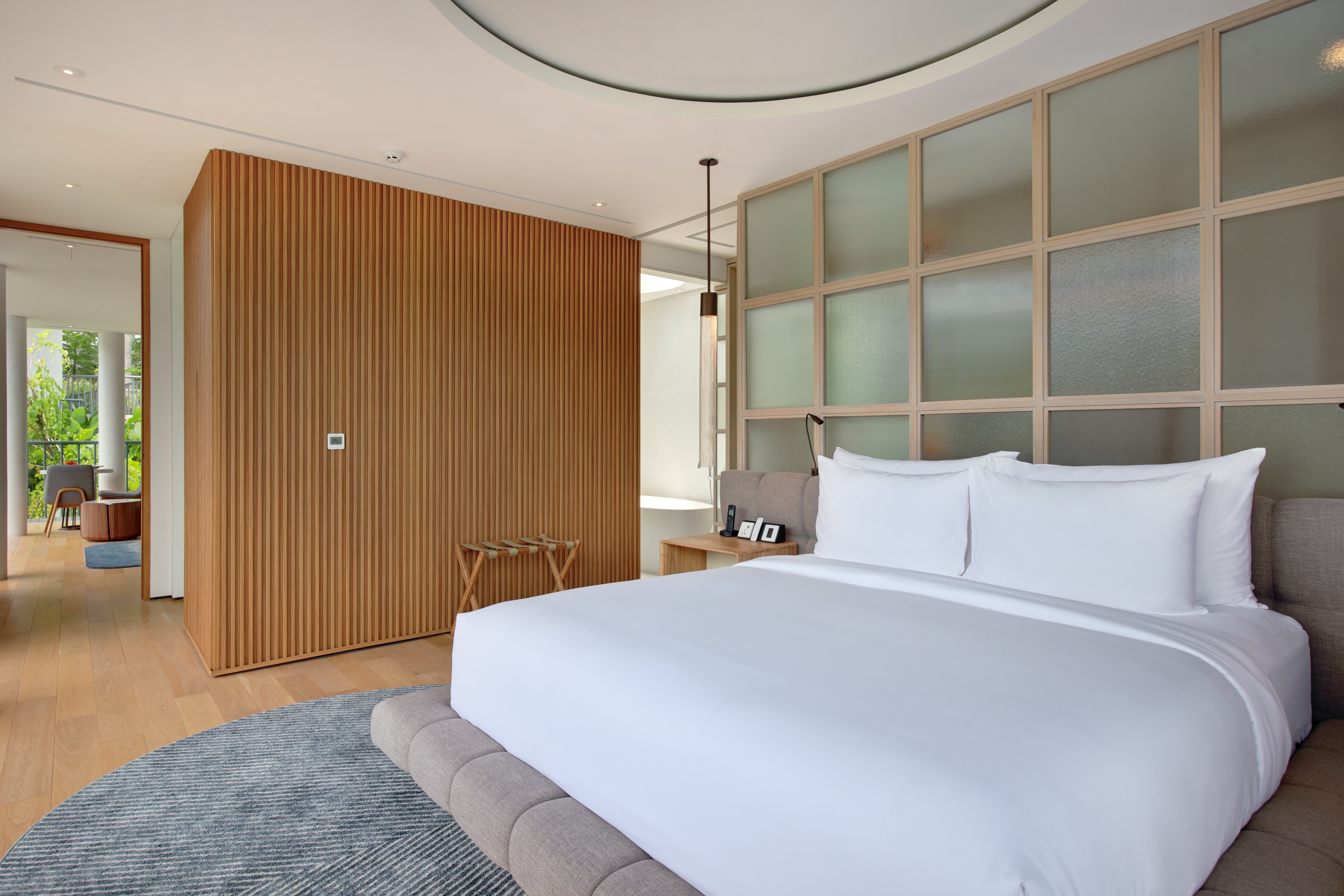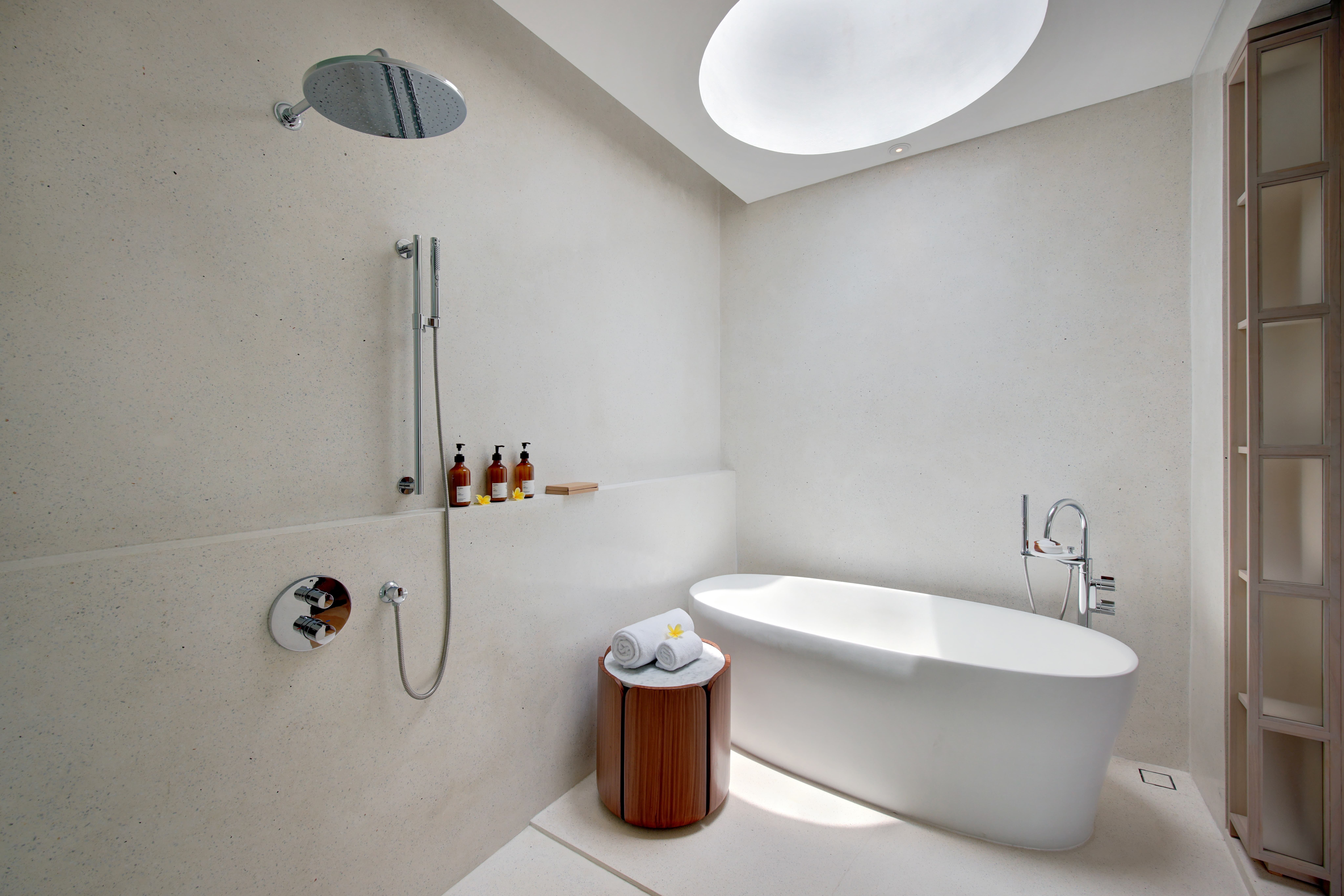 Each villa features a spacious en-suite bathroom designed with natural textures and calming tones. Bathrooms include walk-in rain showers, deep soaking tubs, artisan toiletries, and walk-in closets. The design focuses on creating a spa-like environment where guests can unwind after a day exploring Bali.