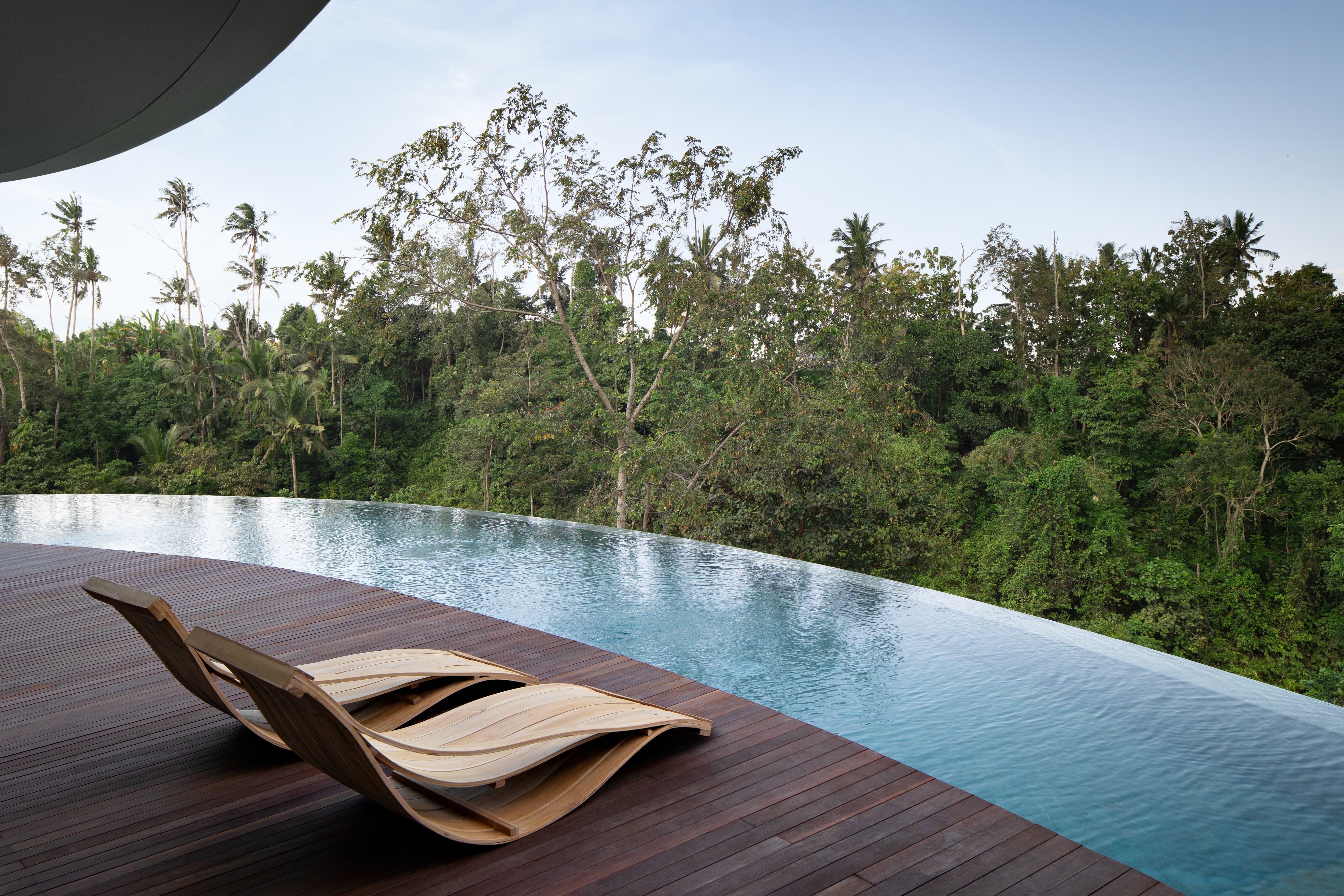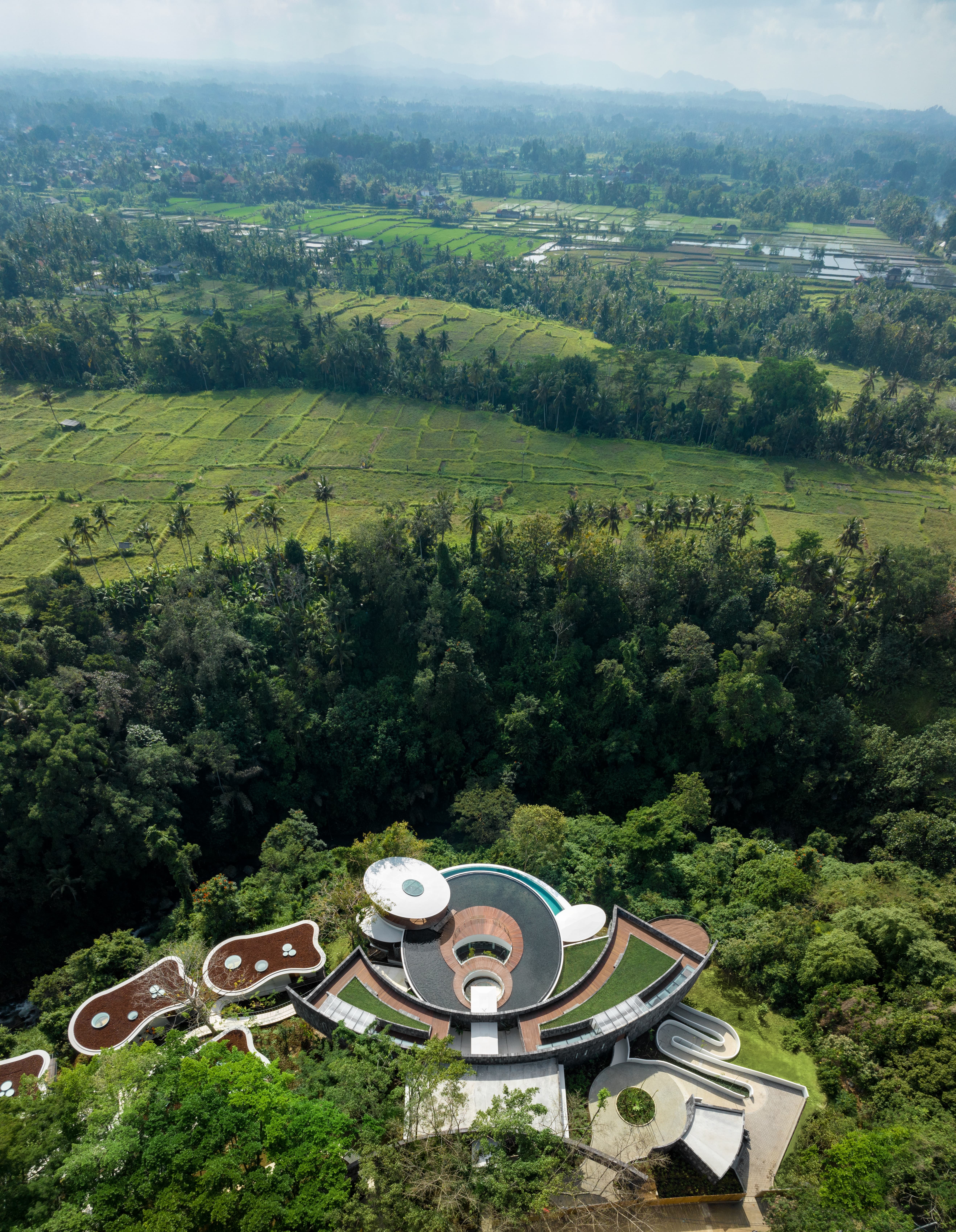 Set among the lush rice terraces and jungle valleys of Ubud, Bumi Kinar is a striking architectural retreat designed for complete immersion in Bali’s natural beauty. Positioned across rolling hills overlooking the Petanu River and framed by views toward Mount Agung, the resort blends contemporary design with the spiritual calm of the island’s interior.