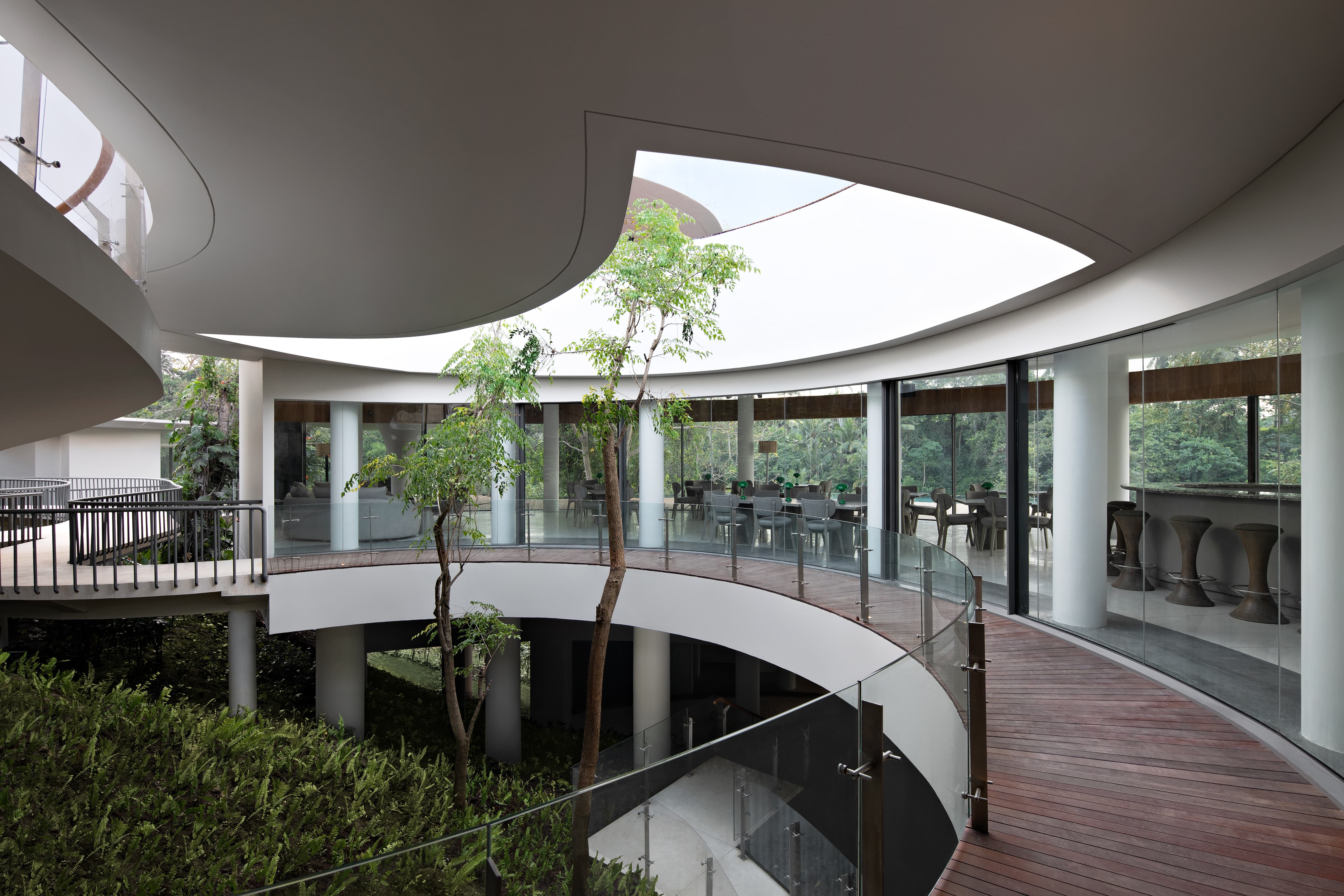 The living spaces at Bumi Kinar are designed to immerse guests in the surrounding jungle landscape while maintaining a sense of calm architectural elegance. Each villa features spacious open-plan interiors with a living room, dining area, and private terrace overlooking the Petanu River valley or the surrounding rice terraces. Floor-to-ceiling glass invites natural light and fresh tropical air into the interiors, while curved architectural lines and natural materials create a tranquil and contemporary Balinese atmosphere. Communal areas across the estate include lounge spaces, terraces, and pavilions positioned to maximise views of the valley and surrounding rainforest.
