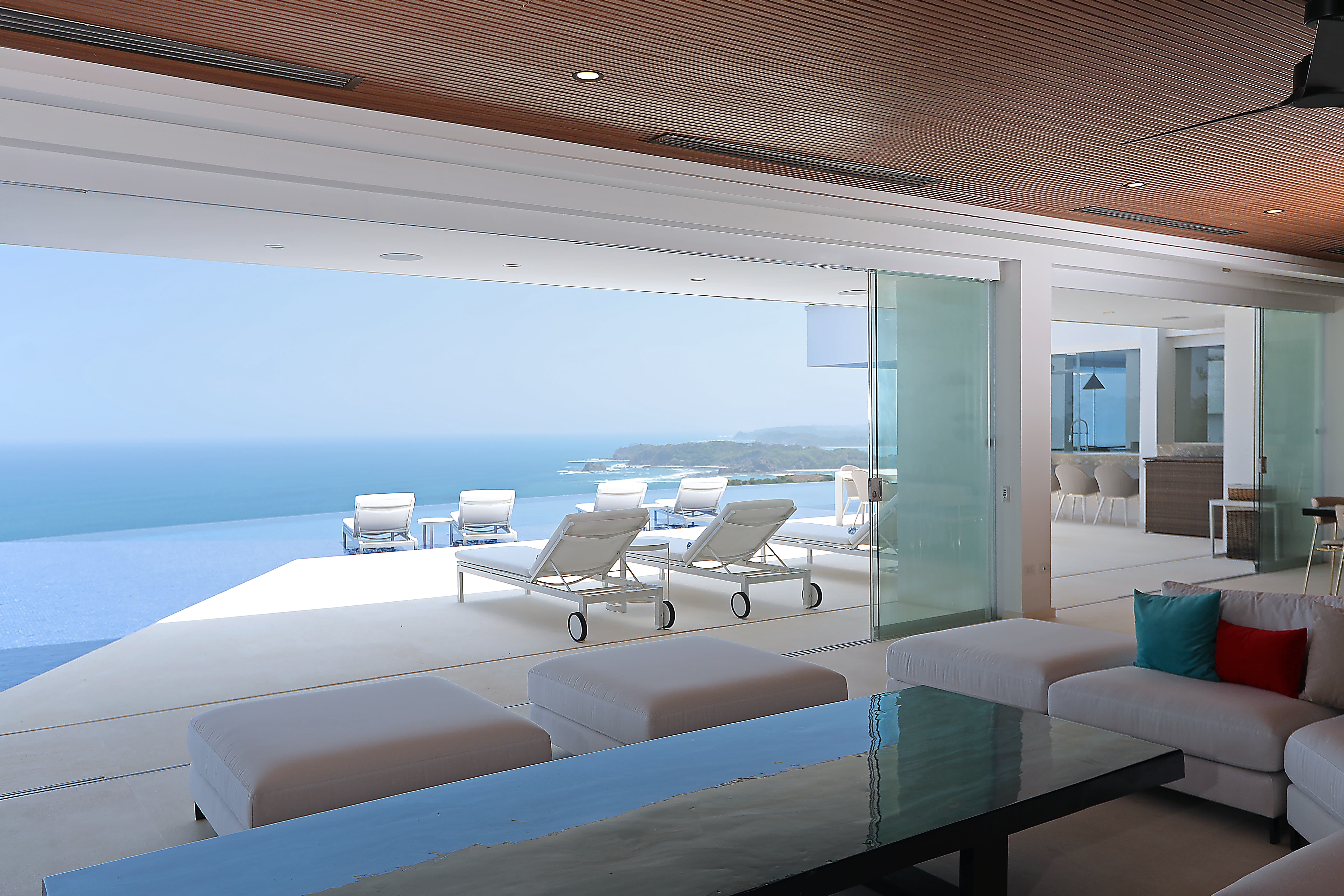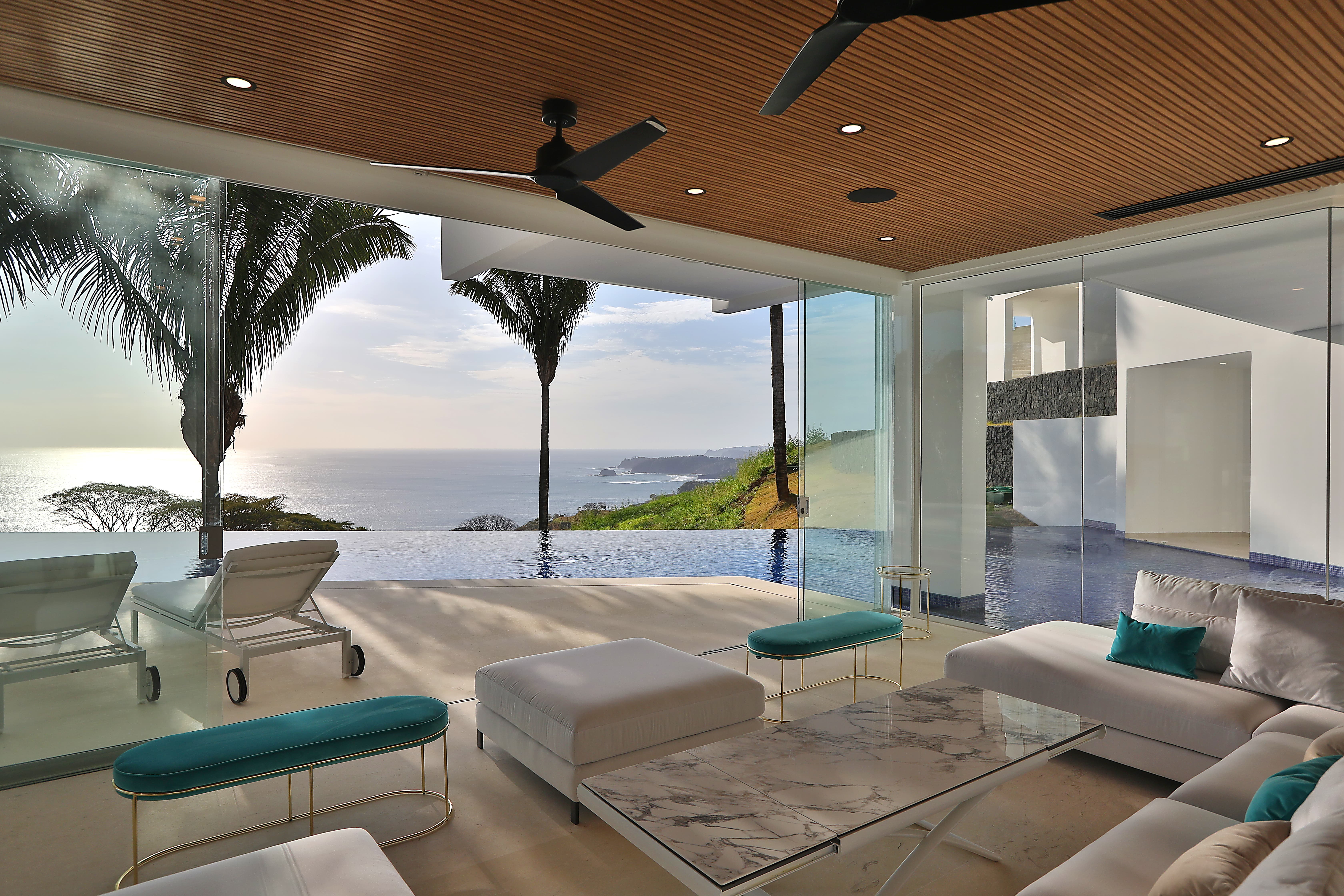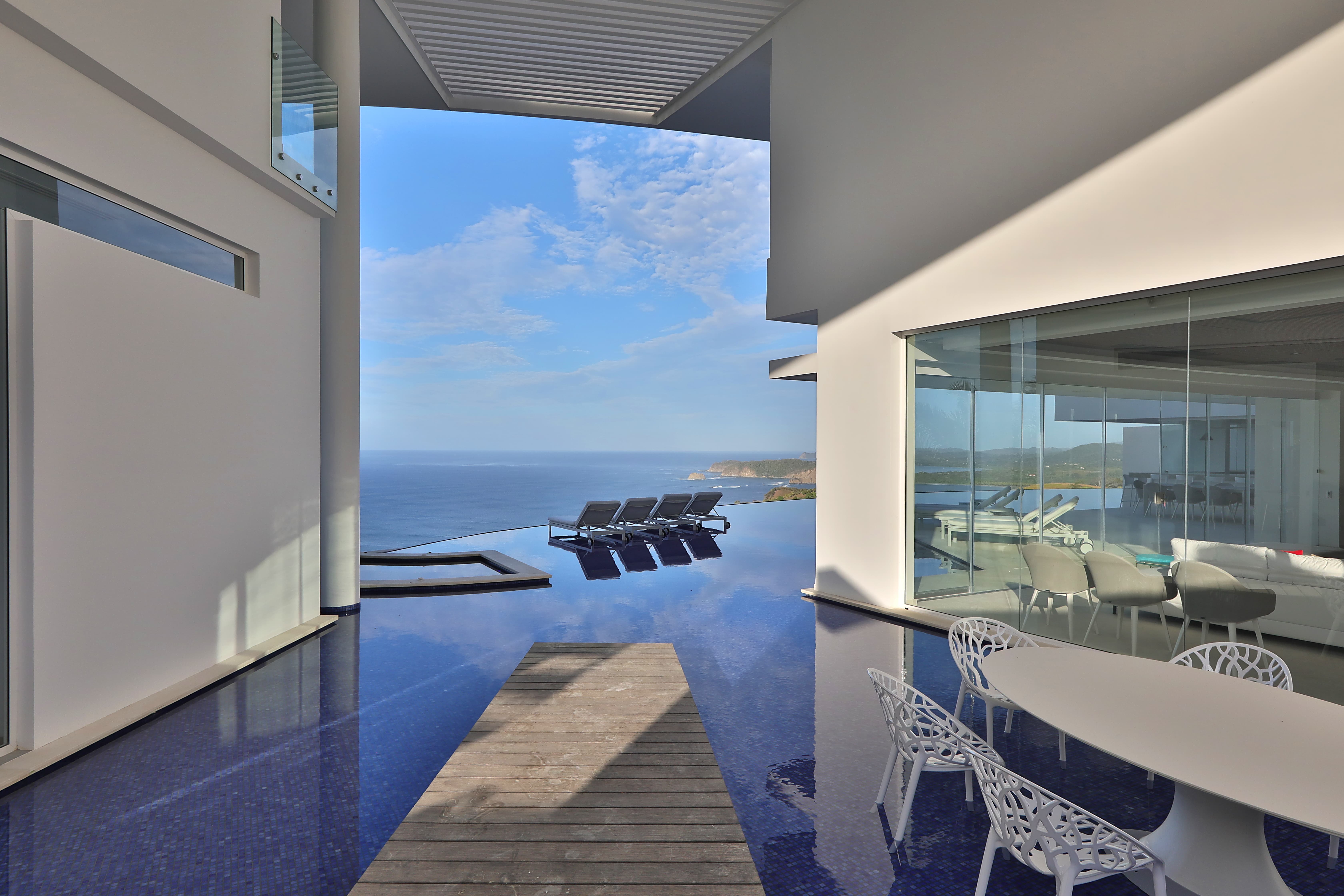 Carrillo Ridge Estate is designed for seamless indoor–outdoor living, with expansive open-plan spaces that frame sweeping Pacific Ocean views through floor-to-ceiling windows. The villa features multiple lounges, elegant open-air living areas, and panoramic terraces that allow guests to relax while surrounded by the lush landscapes of the Nicoya Peninsula. A grand entrance walkway crosses over a tranquil water feature before opening into the main living area, where ocean breezes and natural light flow through the home.