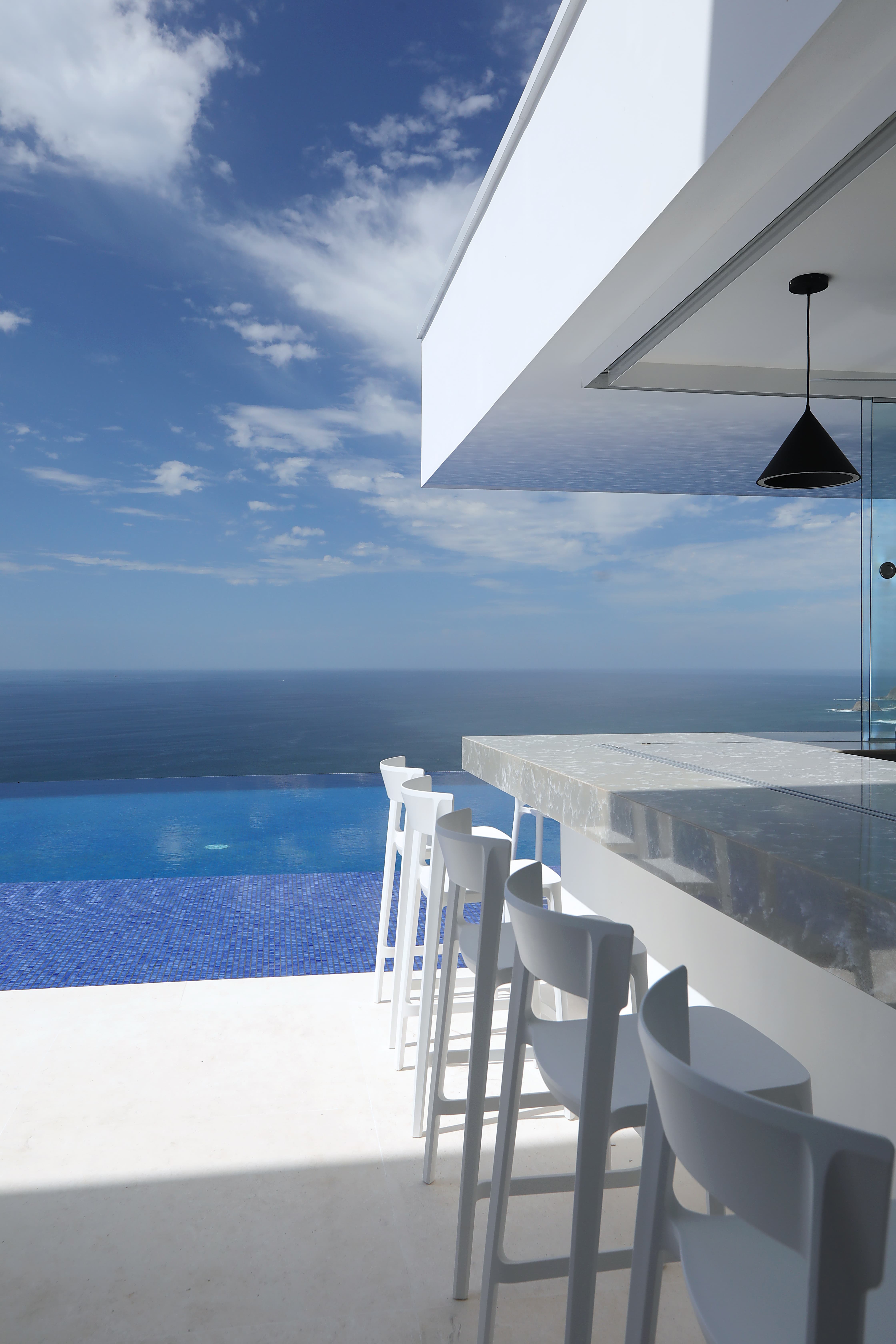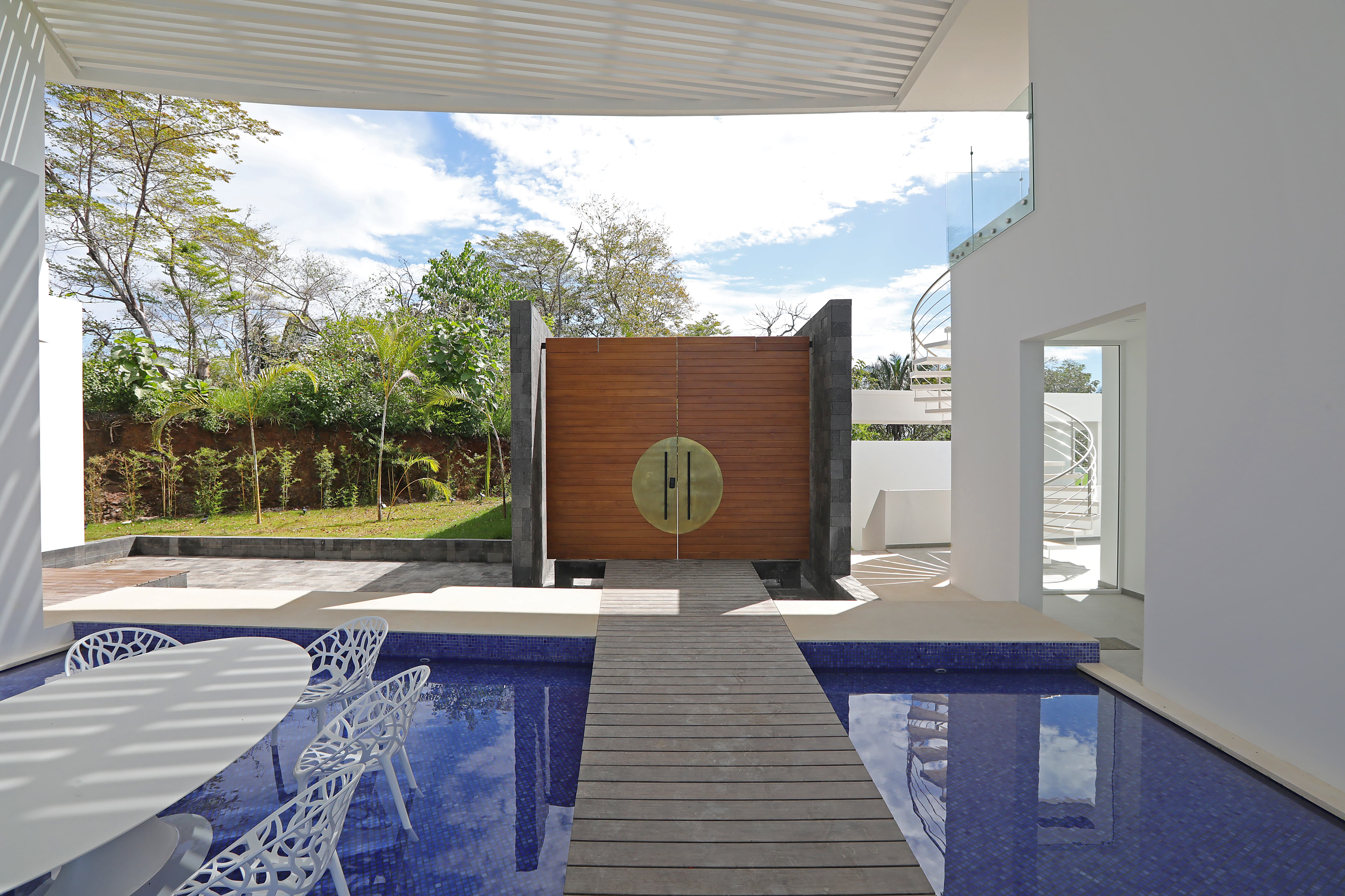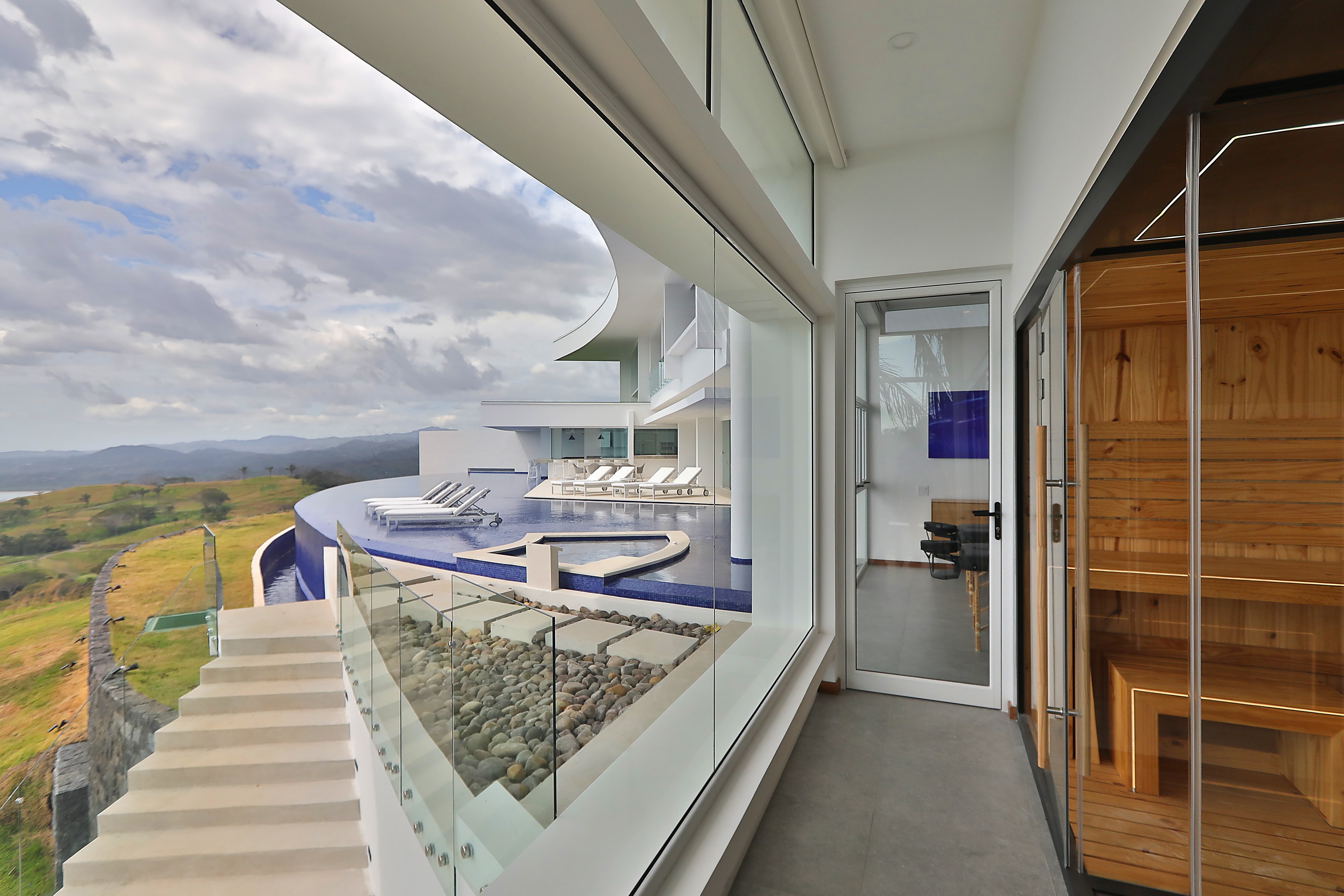 Carrillo Ridge Estate is designed for seamless indoor–outdoor living, with expansive open-plan spaces that frame sweeping Pacific Ocean views through floor-to-ceiling windows. The villa features multiple lounges, elegant open-air living areas, and panoramic terraces that allow guests to relax while surrounded by the lush landscapes of the Nicoya Peninsula. A grand entrance walkway crosses over a tranquil water feature before opening into the main living area, where ocean breezes and natural light flow through the home.