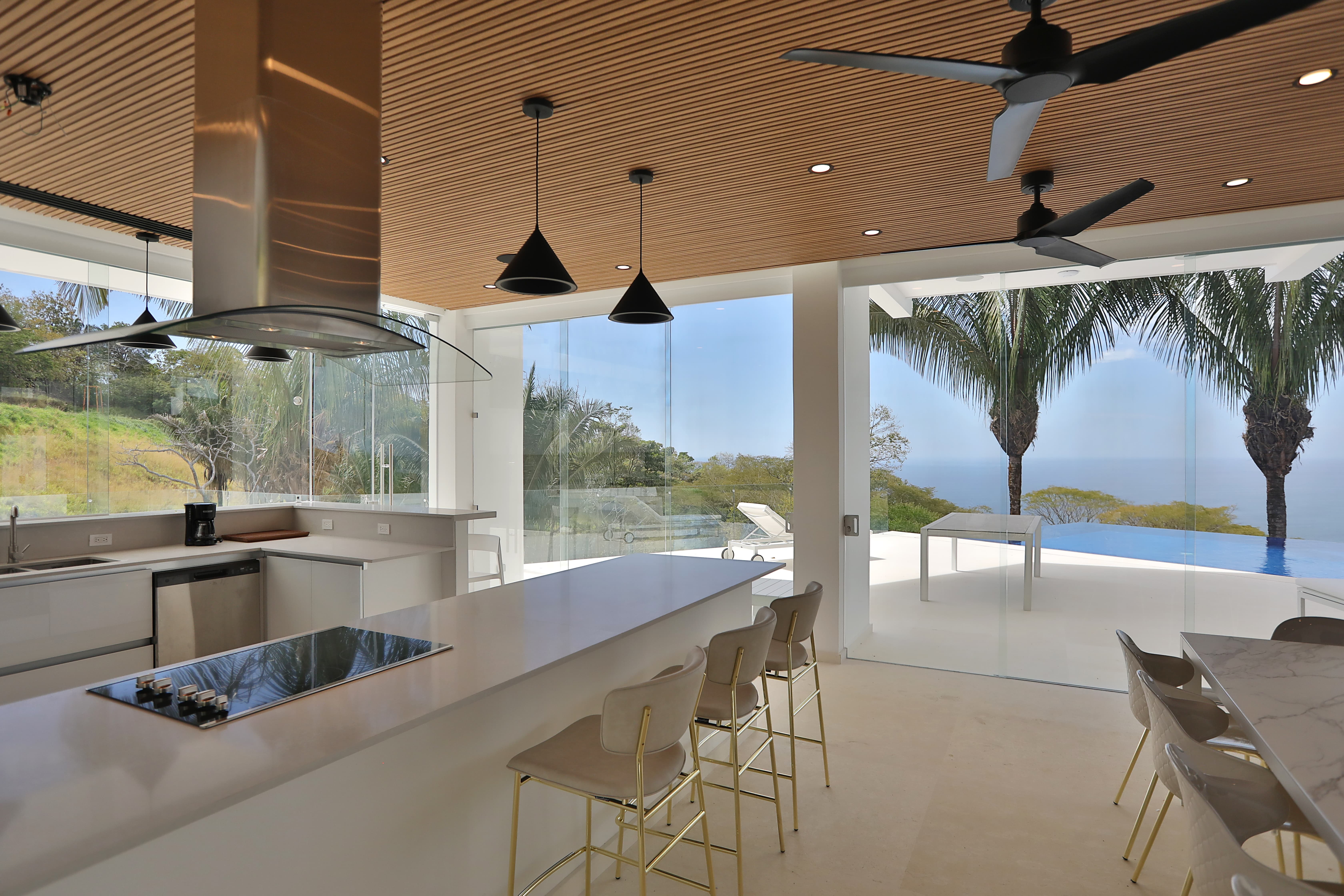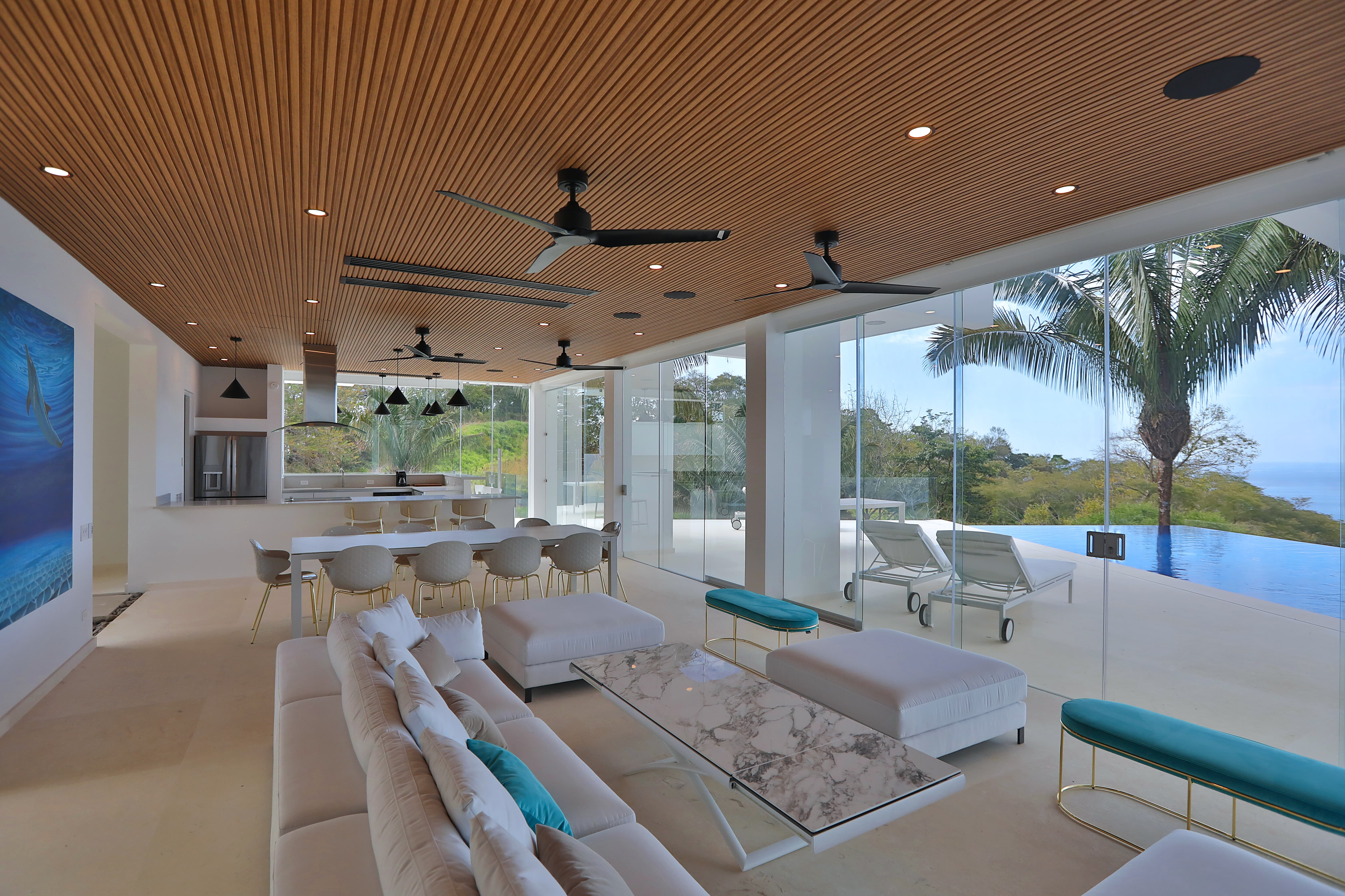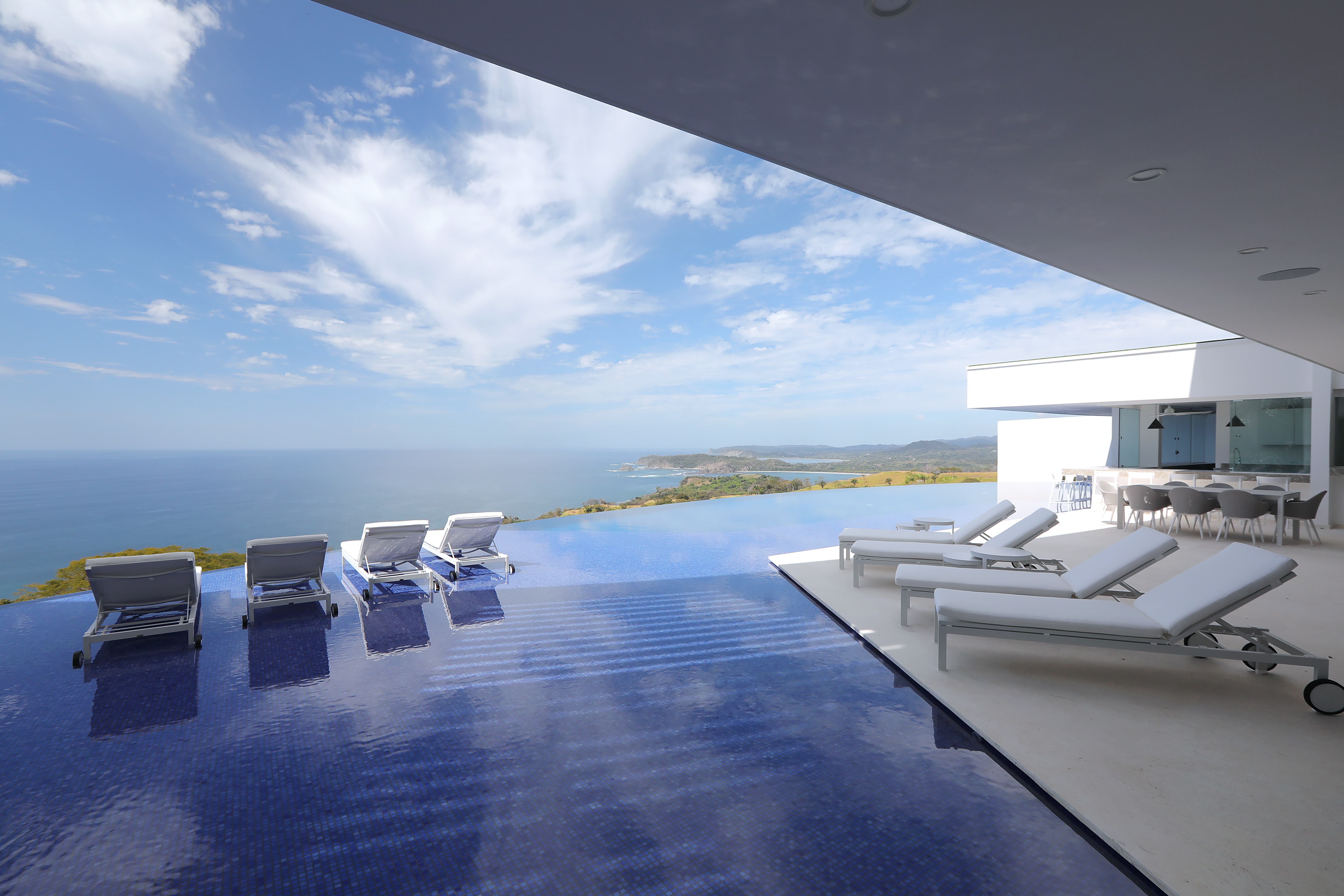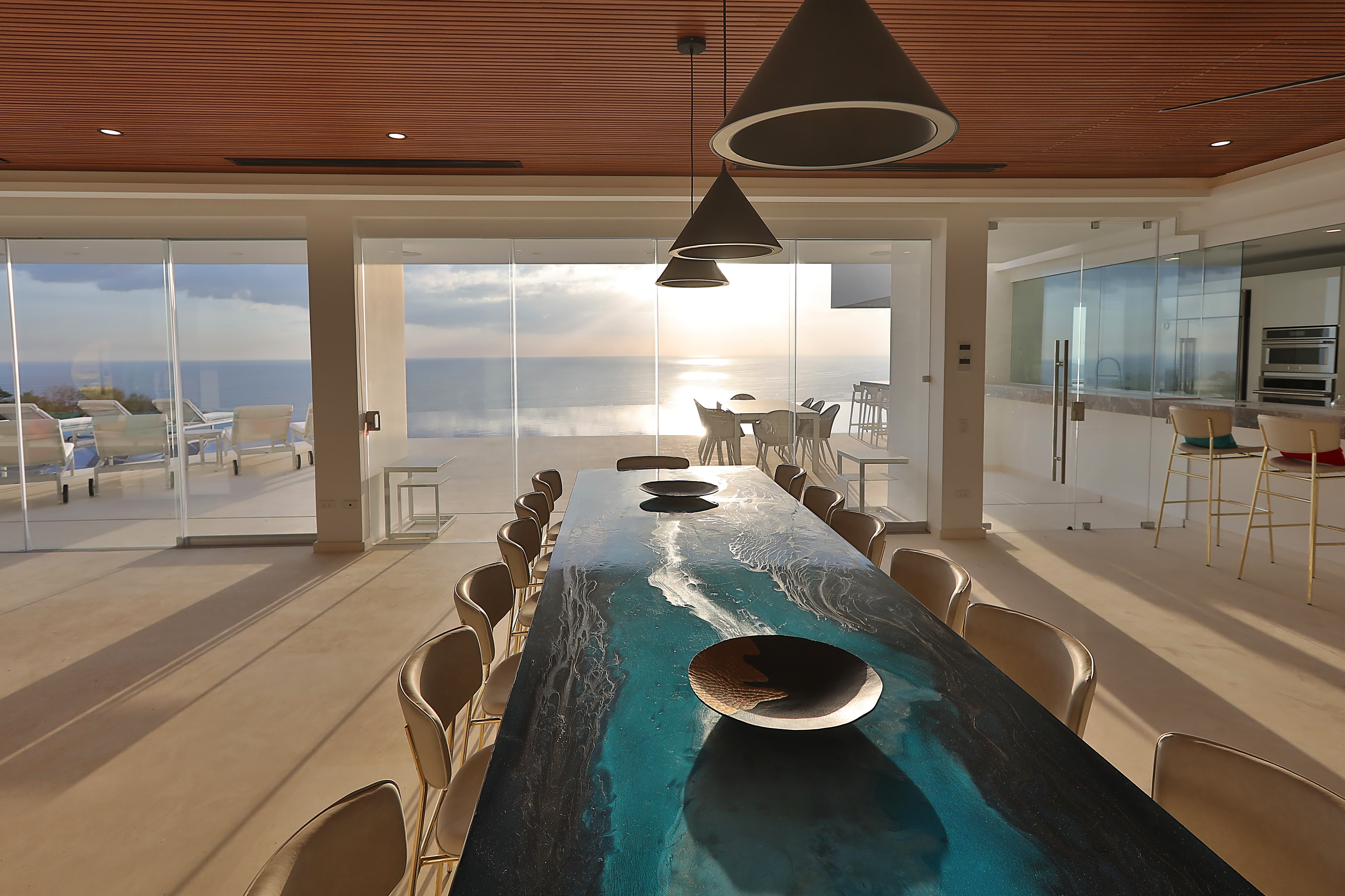 Carrillo Ridge Estate features three fully equipped gourmet kitchens designed to support private chef dining and larger group stays. Guests enjoy curated menus prepared by the villa’s private chef, highlighting fresh Costa Rican ingredients, tropical produce, and local seafood. Dining can be enjoyed indoors in the open-air dining room, beside the infinity pool, or on outdoor terraces overlooking the Pacific.