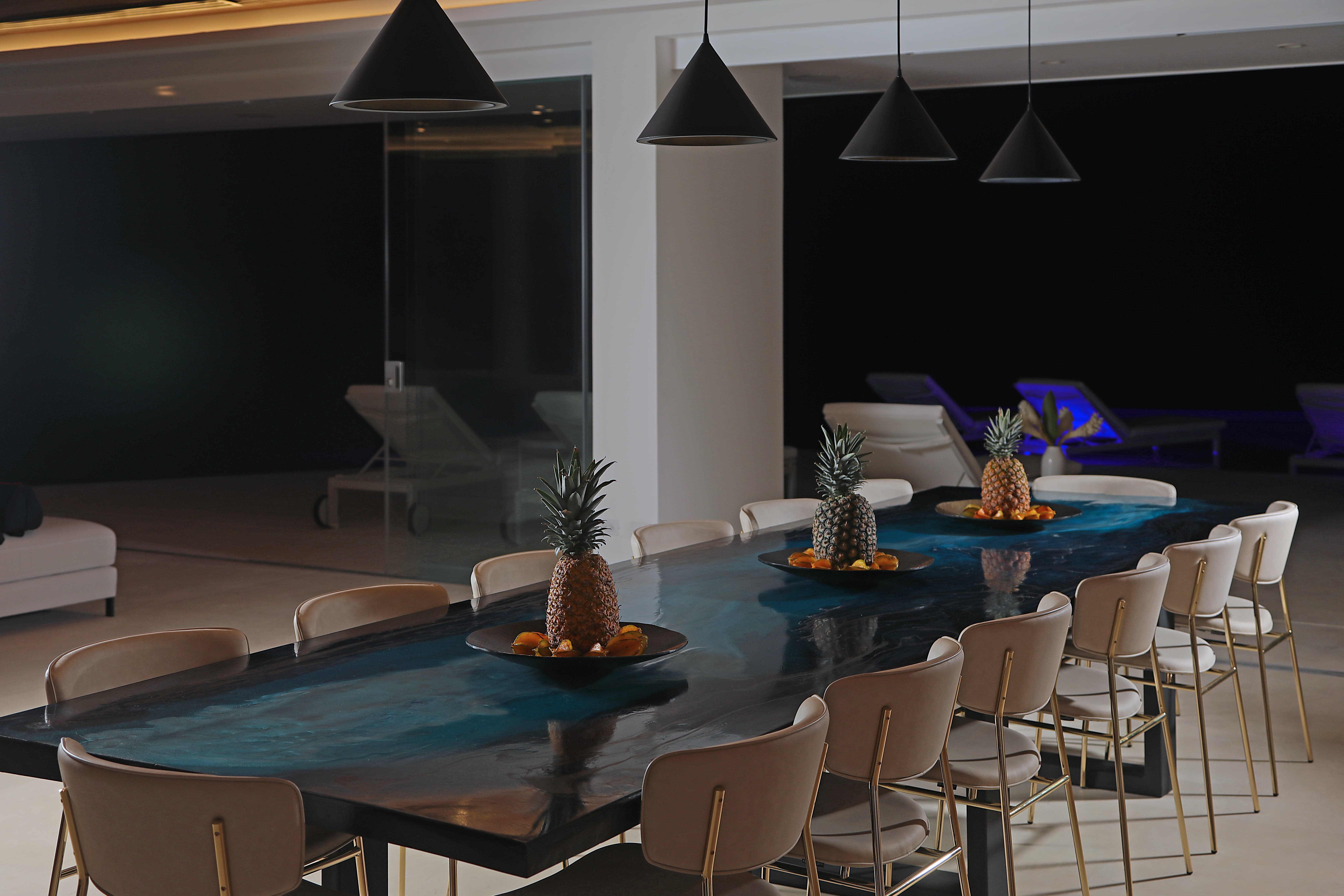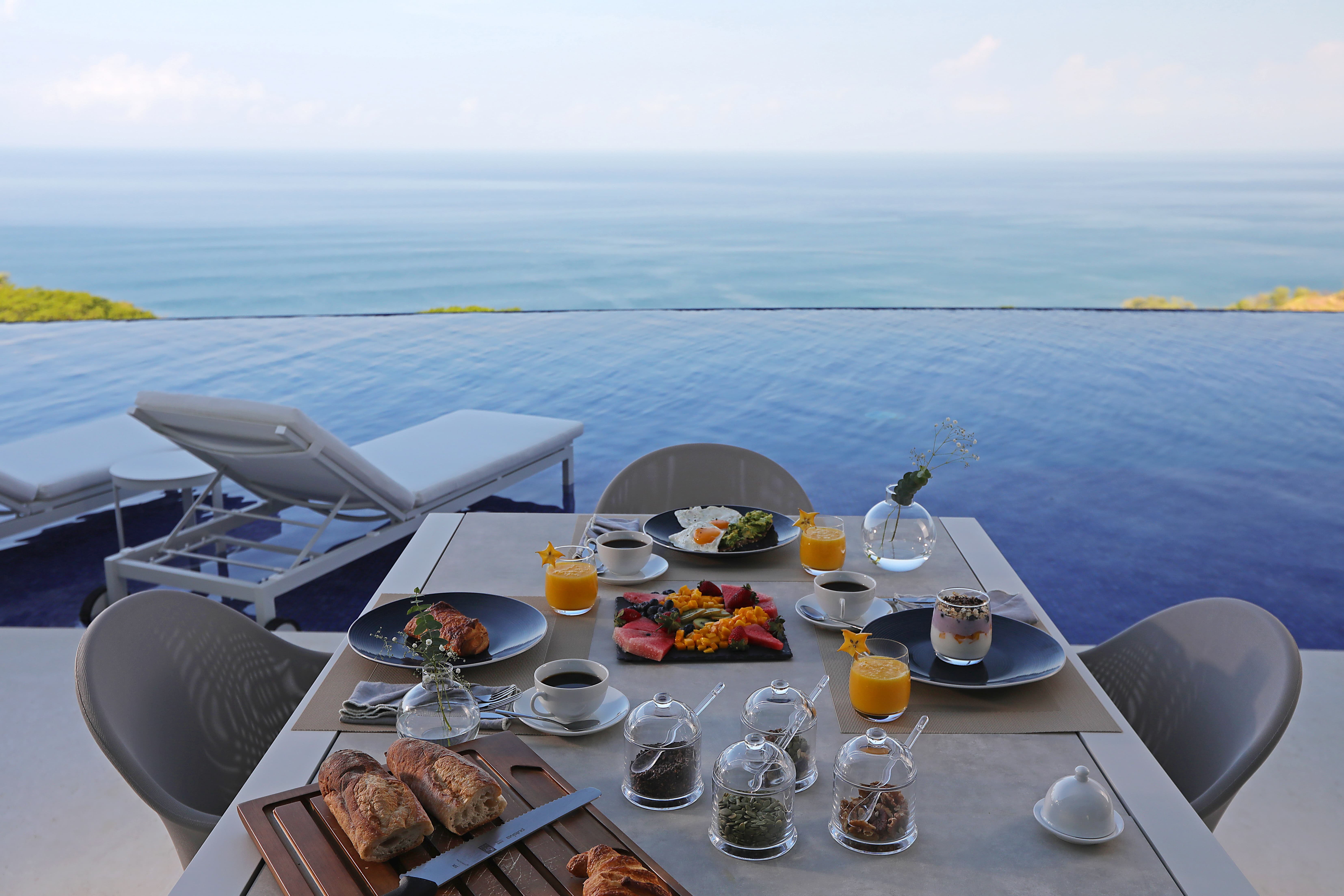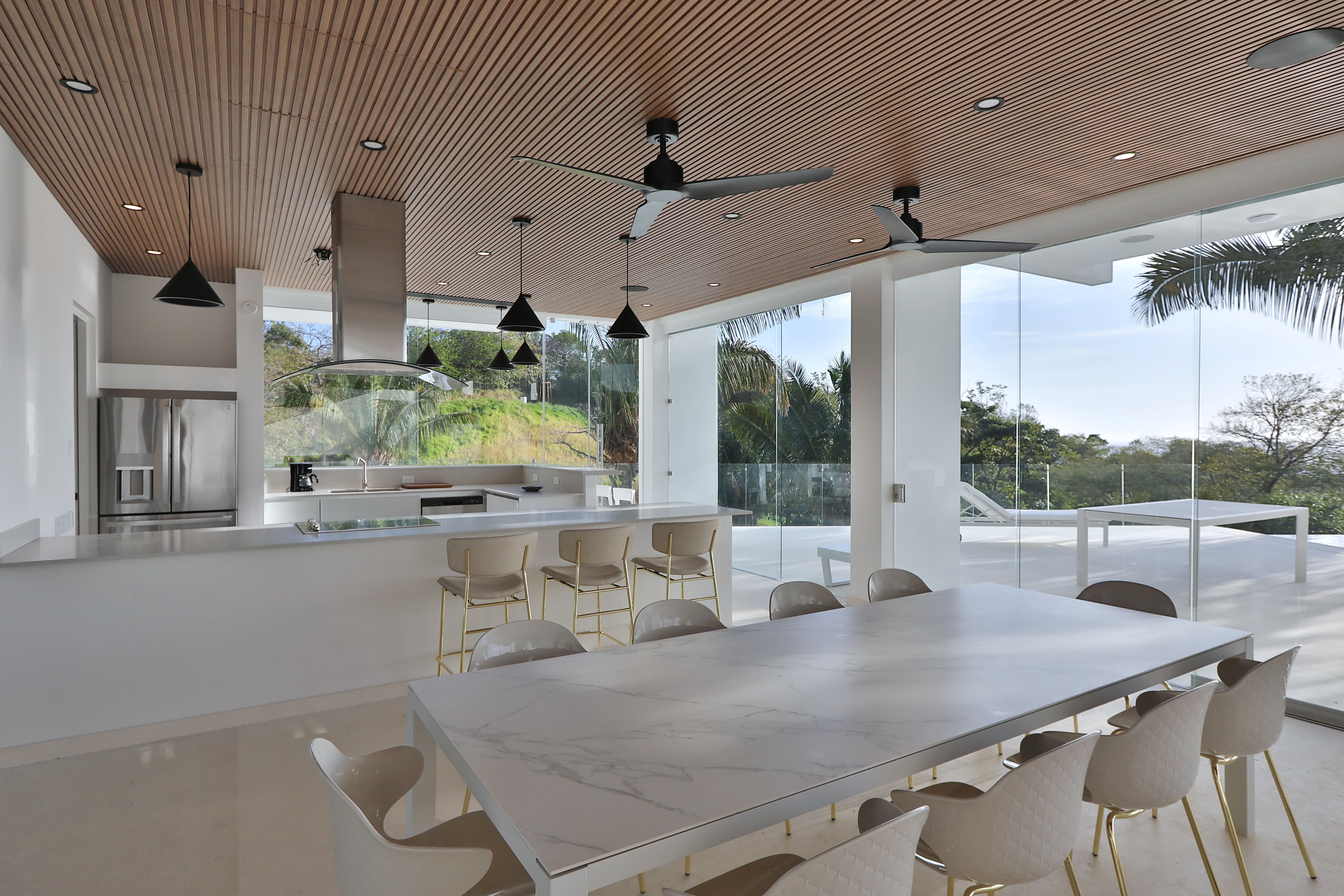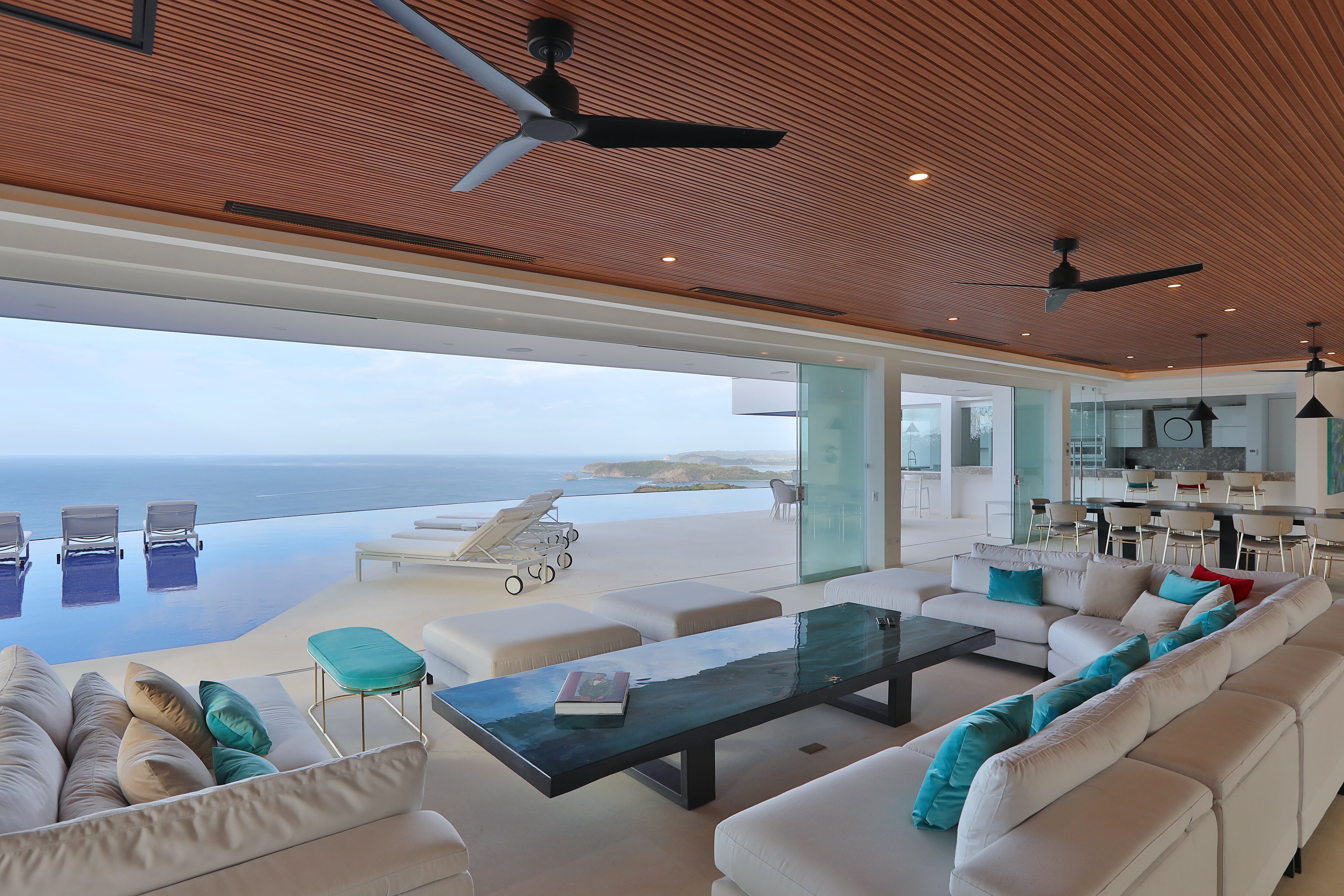 Carrillo Ridge Estate features three fully equipped gourmet kitchens designed to support private chef dining and larger group stays. Guests enjoy curated menus prepared by the villa’s private chef, highlighting fresh Costa Rican ingredients, tropical produce, and local seafood. Dining can be enjoyed indoors in the open-air dining room, beside the infinity pool, or on outdoor terraces overlooking the Pacific.