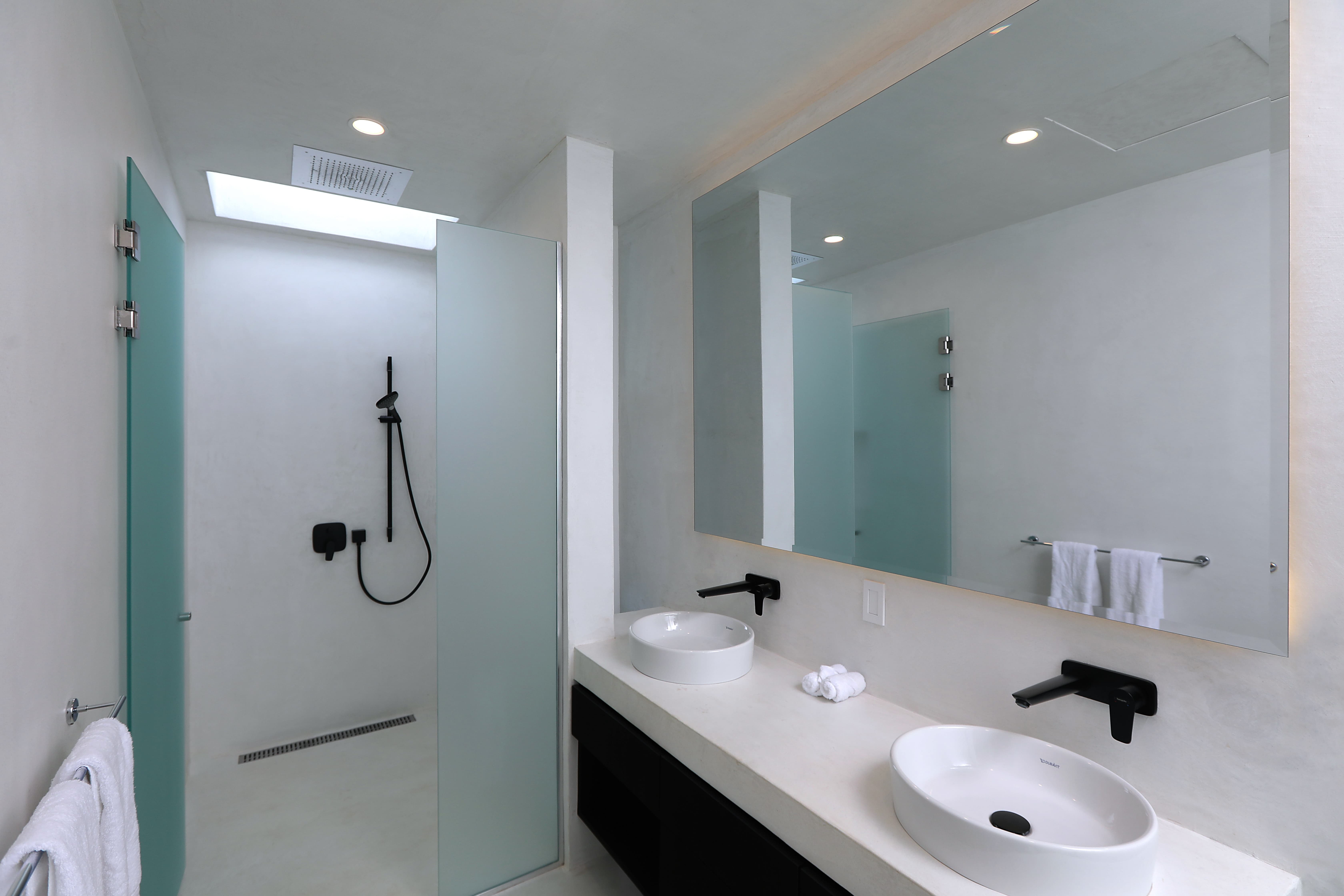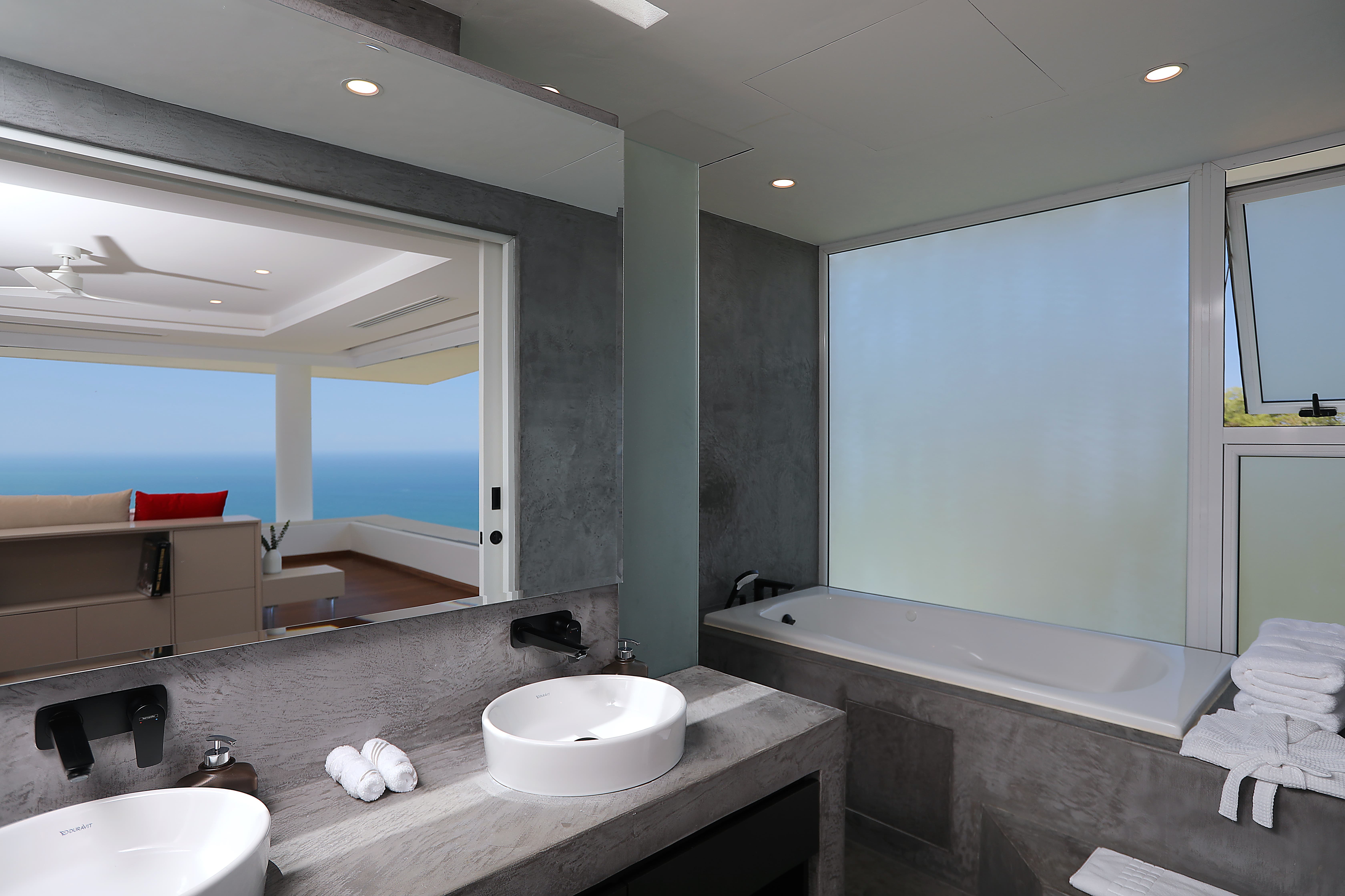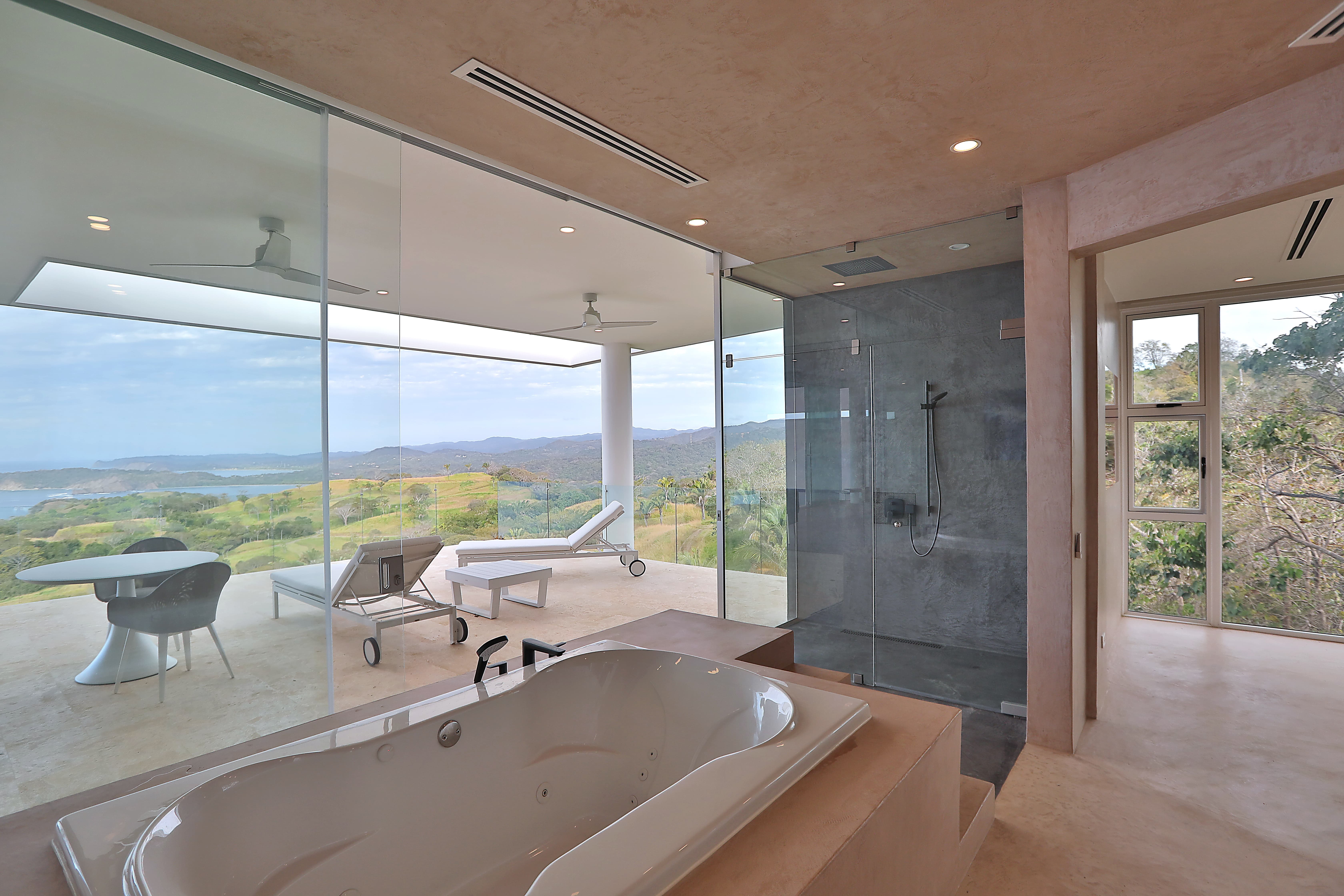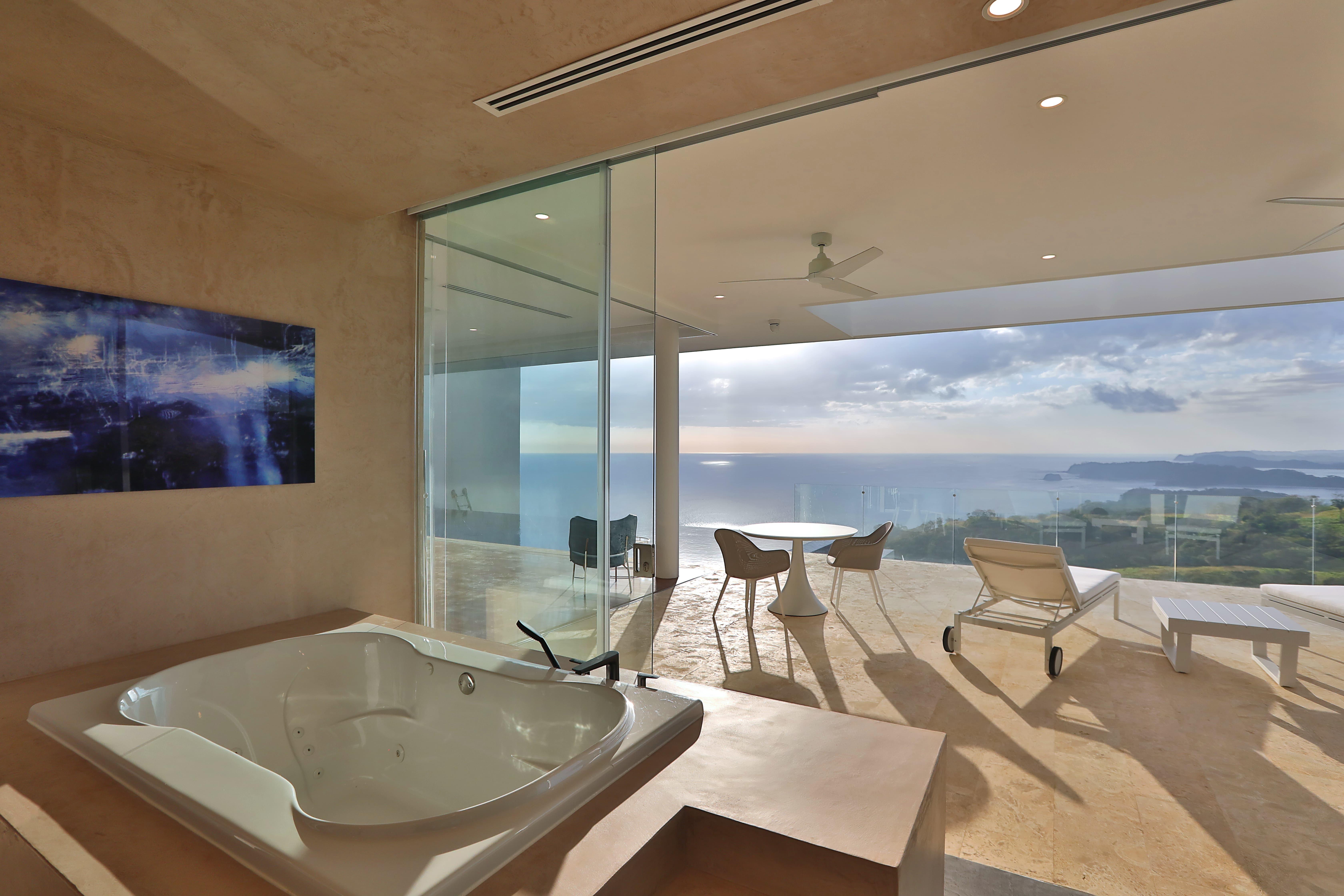Each suite includes a spacious en-suite bathroom finished with elegant natural materials. Bathrooms feature walk-in showers, premium amenities, large vanities, and in several suites oversized jacuzzi bathtubs. The master suite also includes a dramatic outdoor shower experience with ocean views.