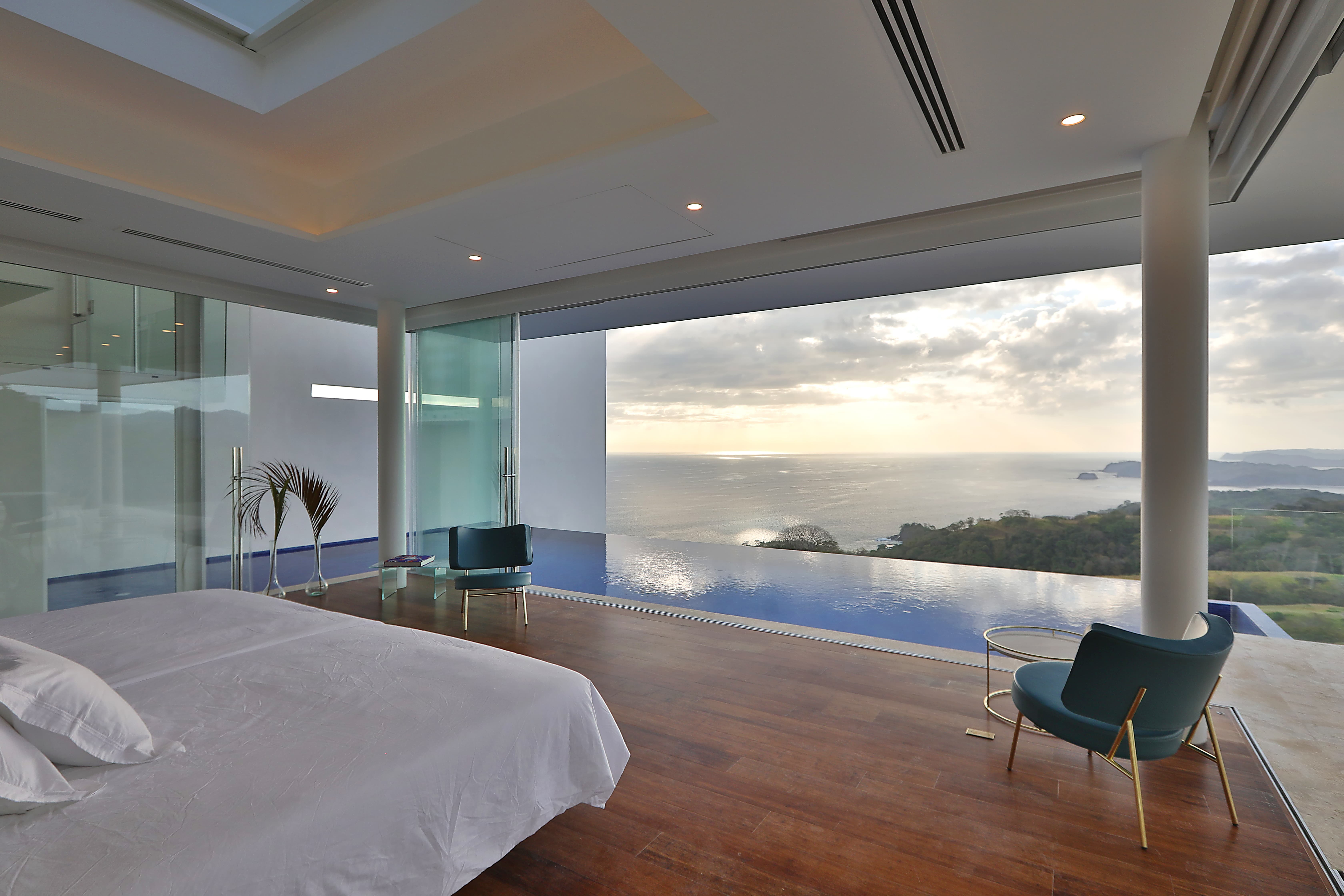 Designed as a modern architectural masterpiece, the villa blends expansive glass walls, open-air living spaces, and natural materials to create a seamless connection between indoor luxury and the surrounding landscape. The residence accommodates up to sixteen guests across eight thoughtfully designed suites, each offering private terraces, panoramic Pacific views, and elegant interiors finished with Egyptian cotton linens, walk-in closets, and spa-inspired bathrooms. The master suite enjoys exceptional privacy, complete with its own infinity plunge pool, outdoor shower, private office, and uninterrupted vistas stretching across the coastline.
