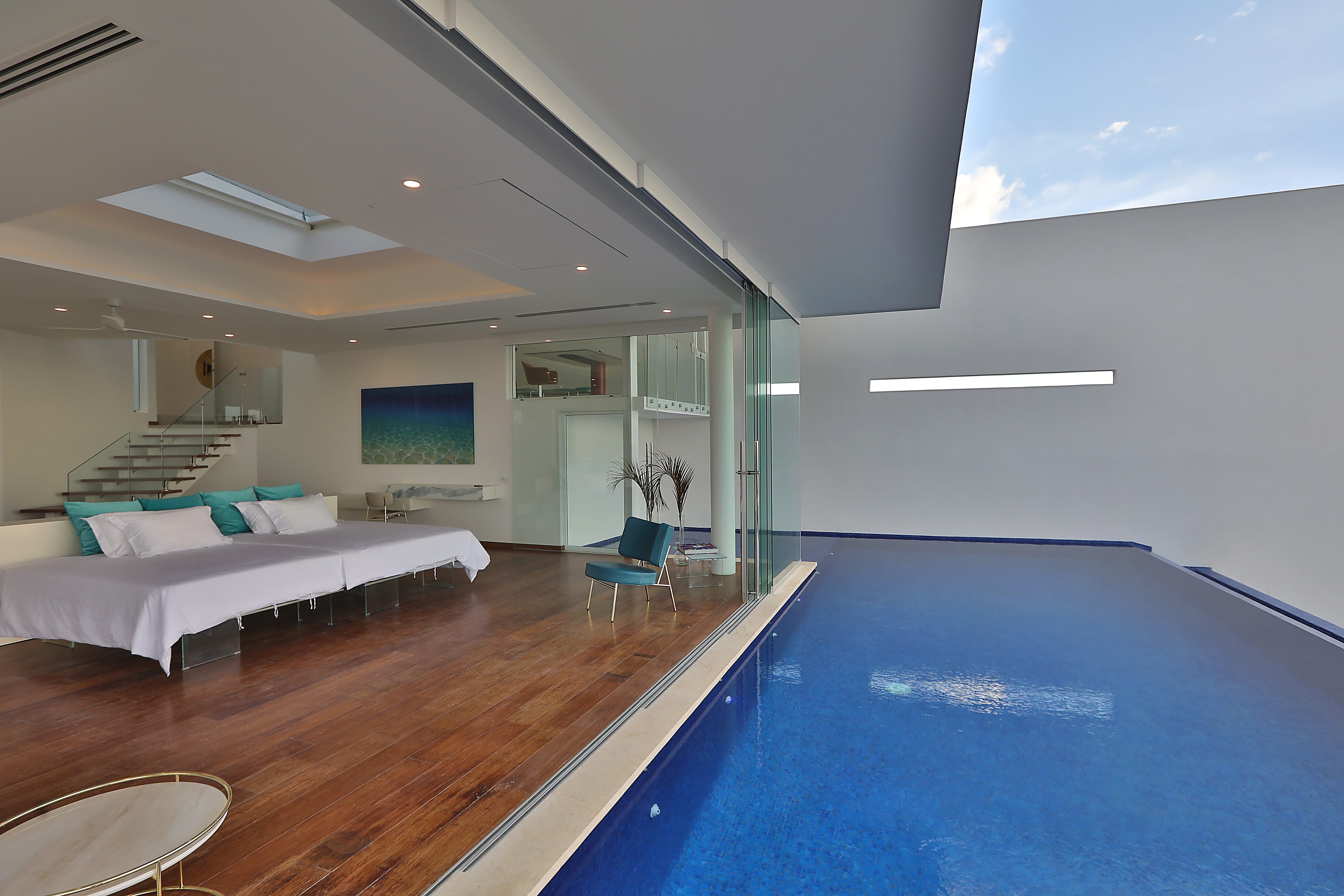 The property offers expansive outdoor terraces, rooftop lounges, and landscaped tropical gardens designed for relaxation and exploration. The infinity pool blends into the ocean horizon, while poolside lounge areas and shaded terraces provide spectacular settings for sunset gatherings. Nearby Playa Carrillo beach can be reached within minutes.
