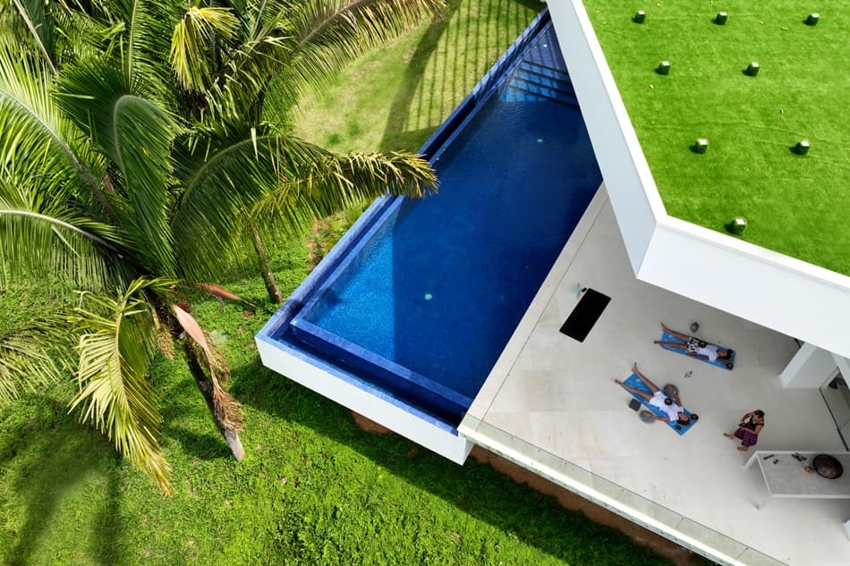 The estate offers a wide range of entertainment spaces including a private movie theatre, wine cellar, rooftop lounge, and multiple relaxation terraces. Guests can enjoy the infinity pool with swim-up bar, a private spa room, sauna, yoga deck, and fully equipped gym. The property also features an 18-tee eco golf course designed to integrate with the surrounding natural landscape.
