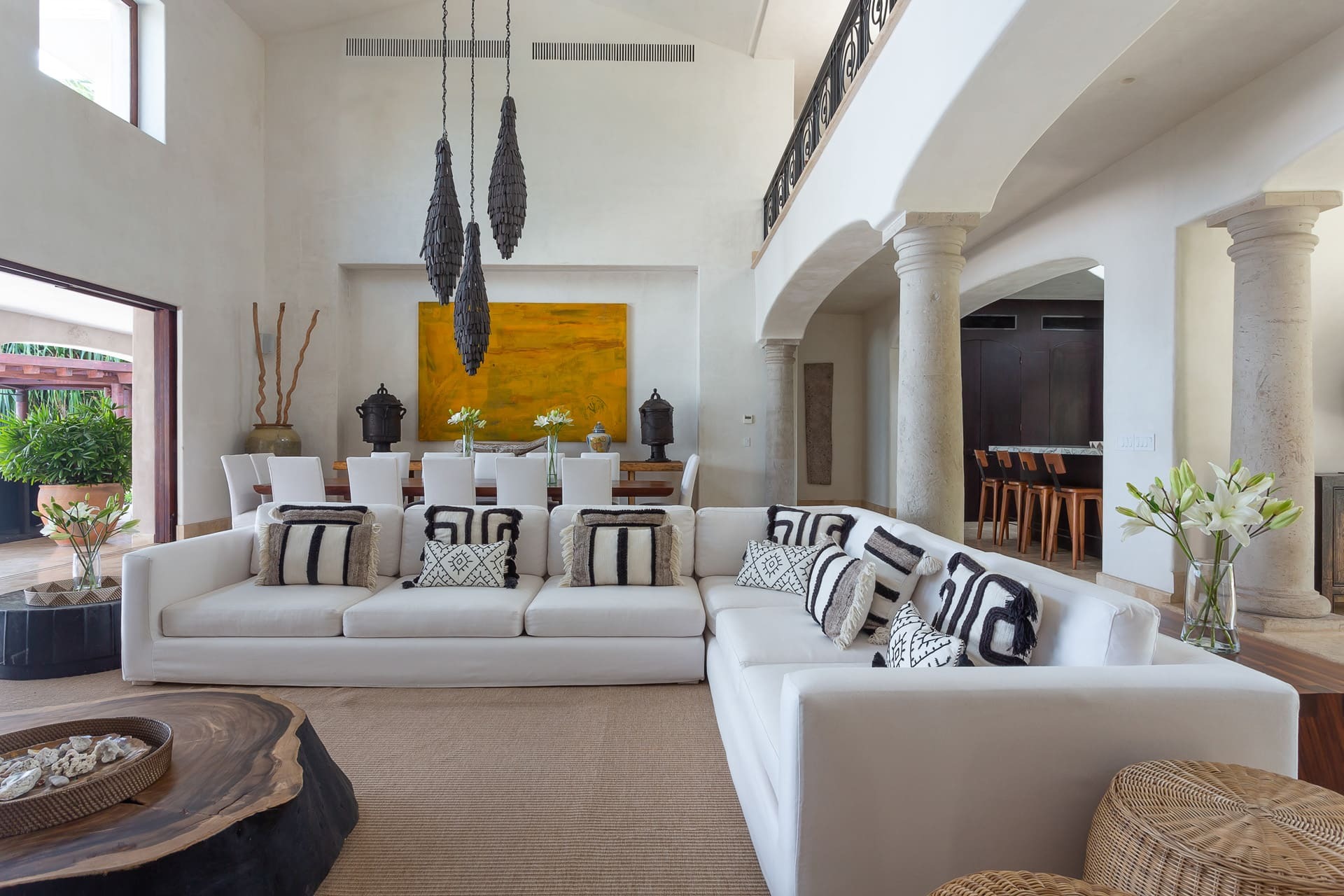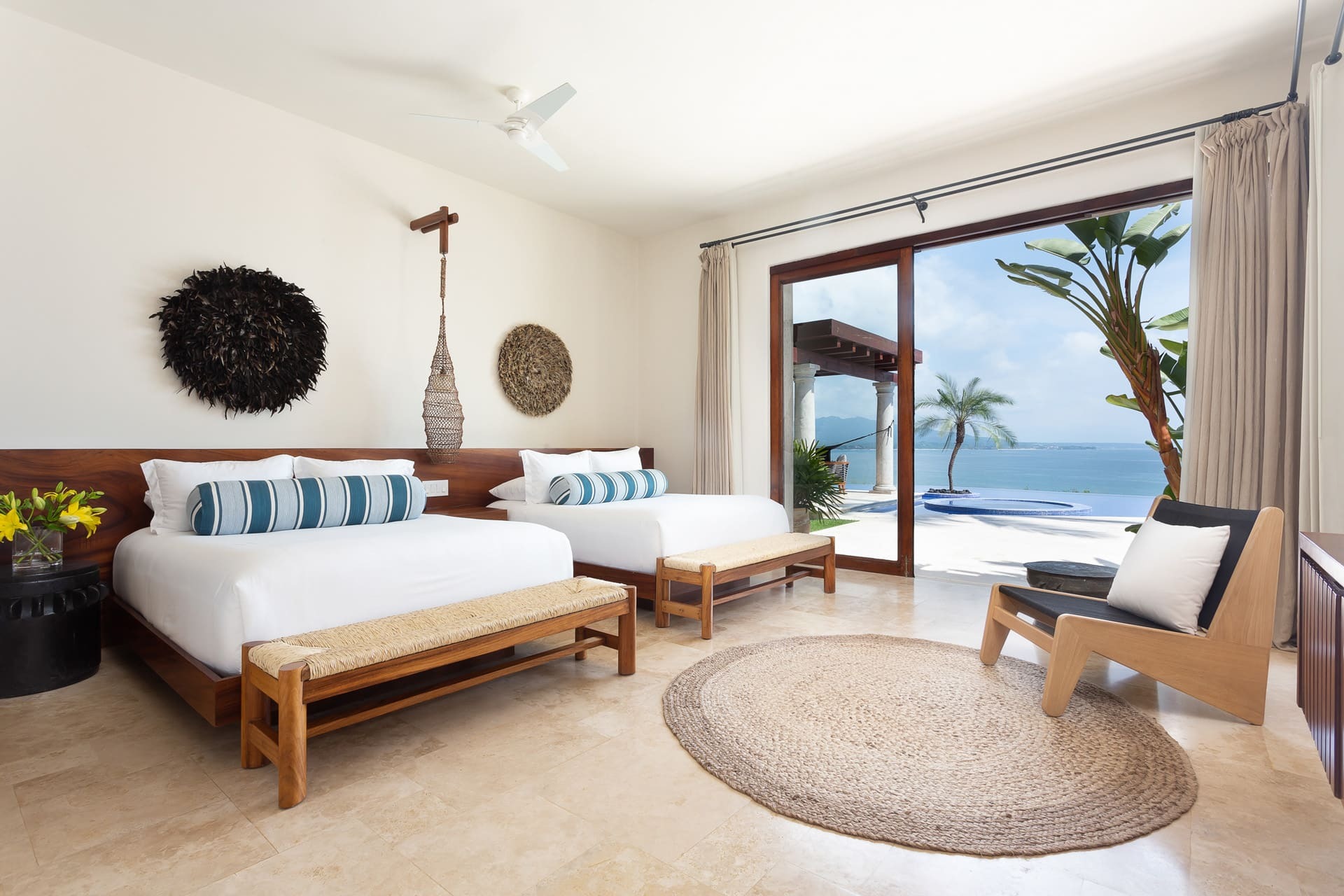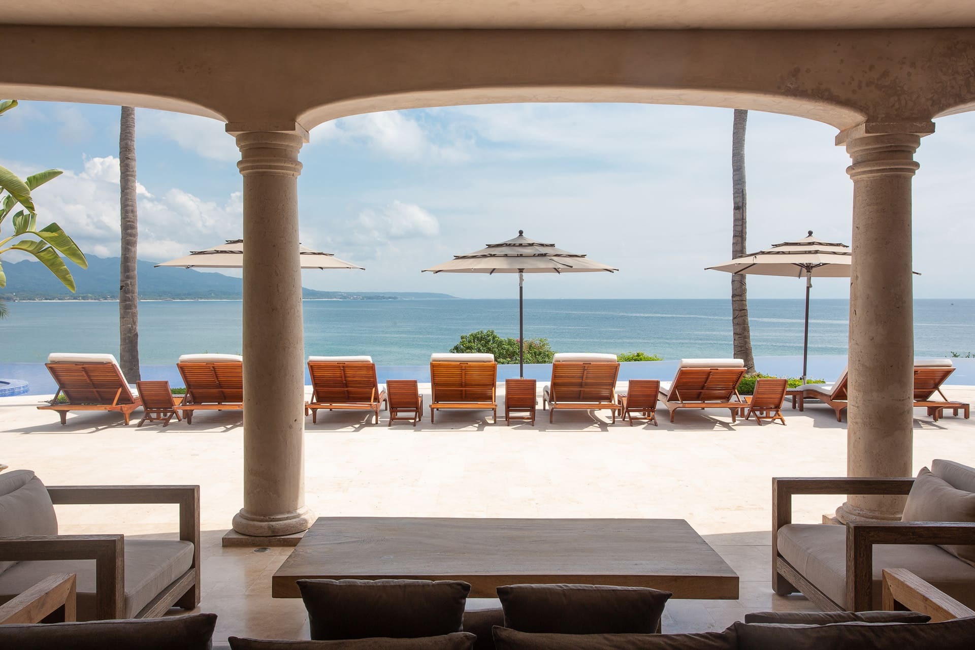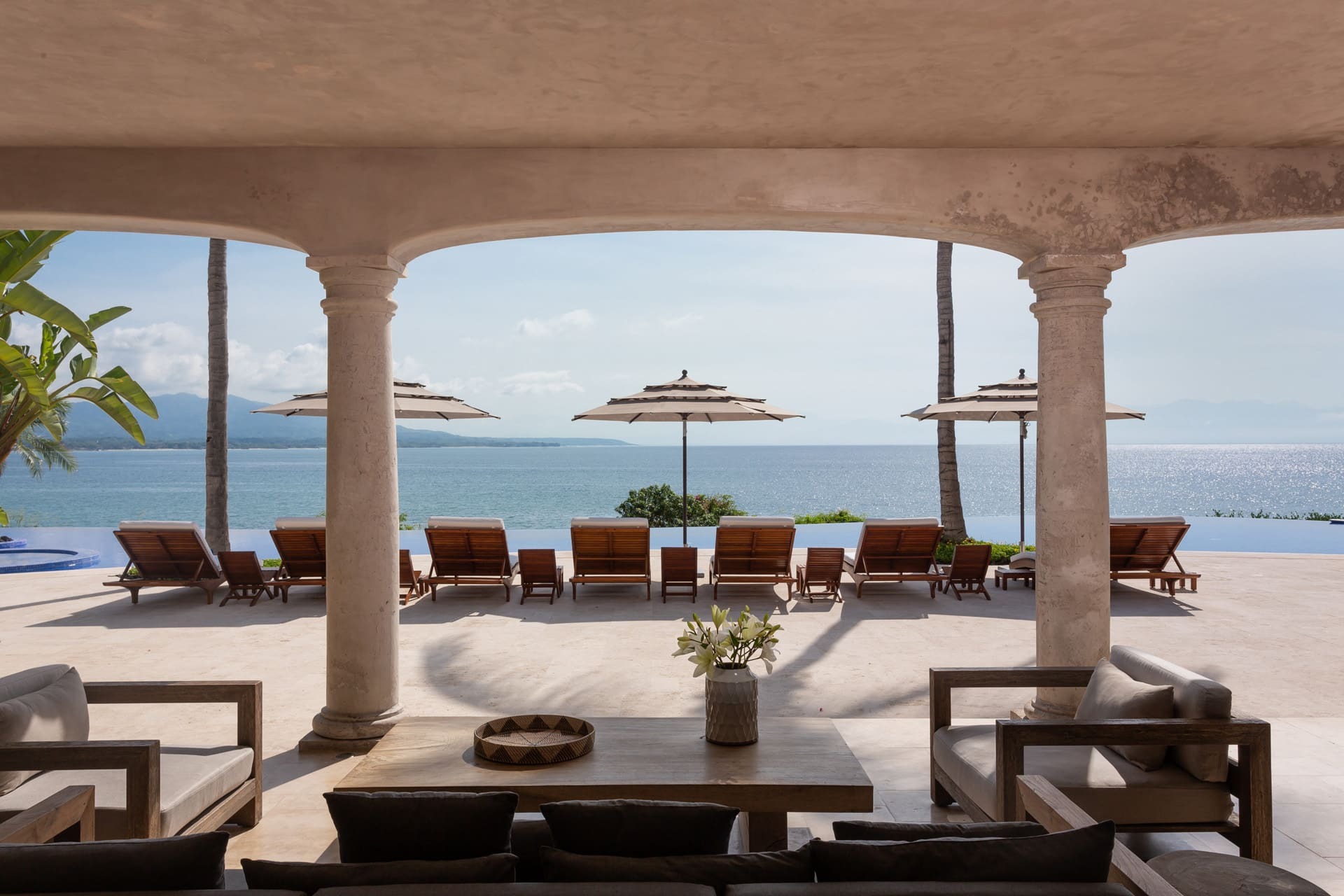 The villa offers multiple open-plan living areas designed to flow seamlessly to the terraces and pool. Large sliding glass walls open the interiors to ocean air and light, creating relaxed social spaces for gathering, dining, and unwinding with uninterrupted sea views.