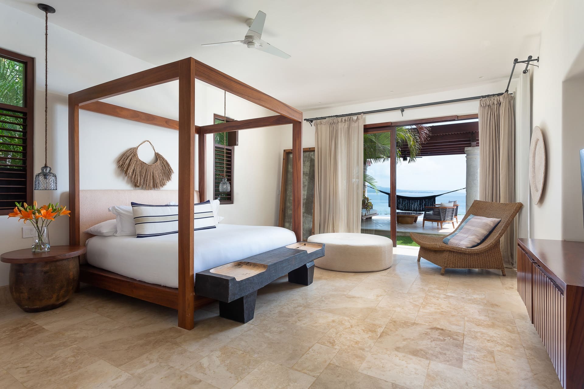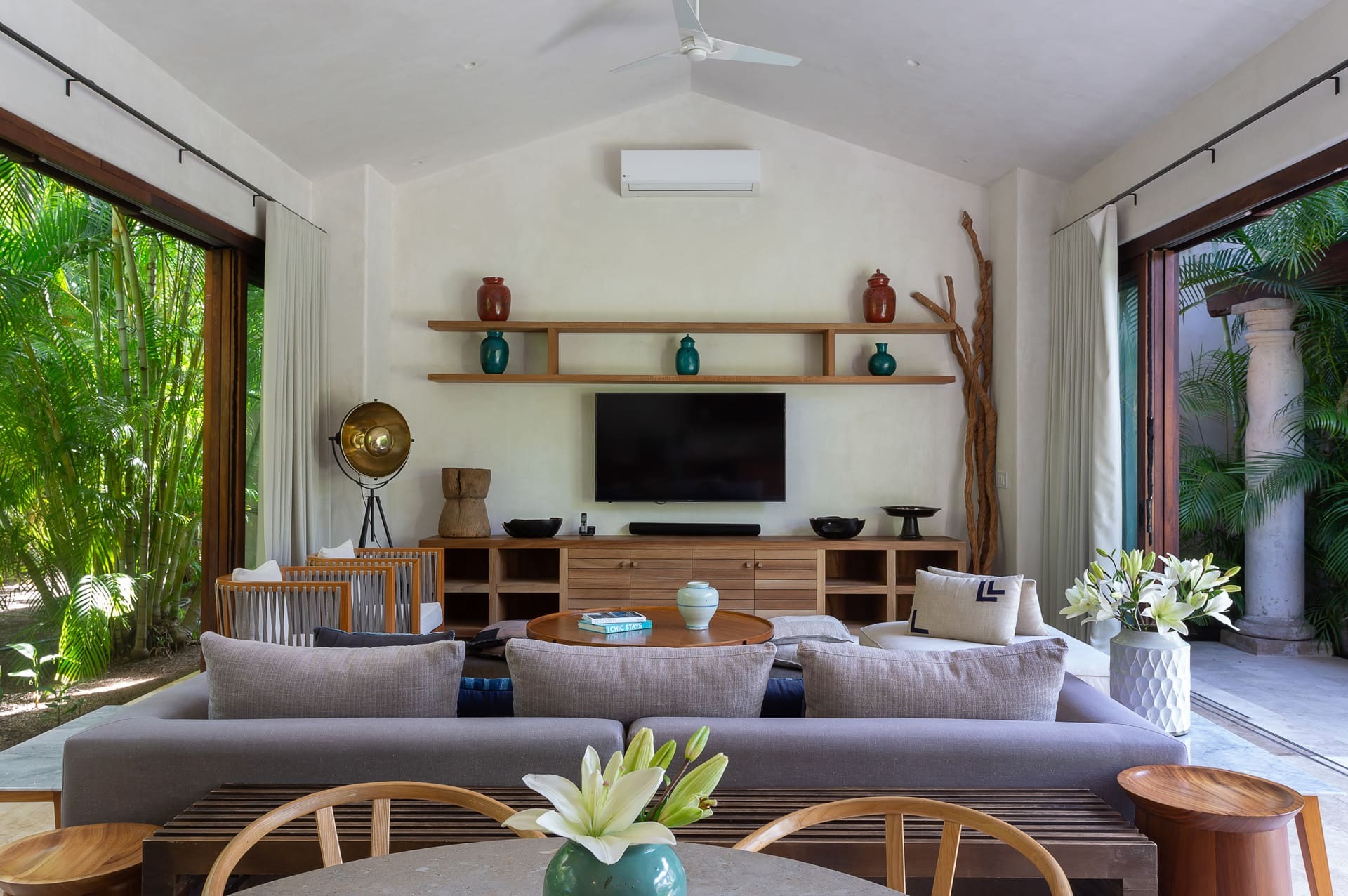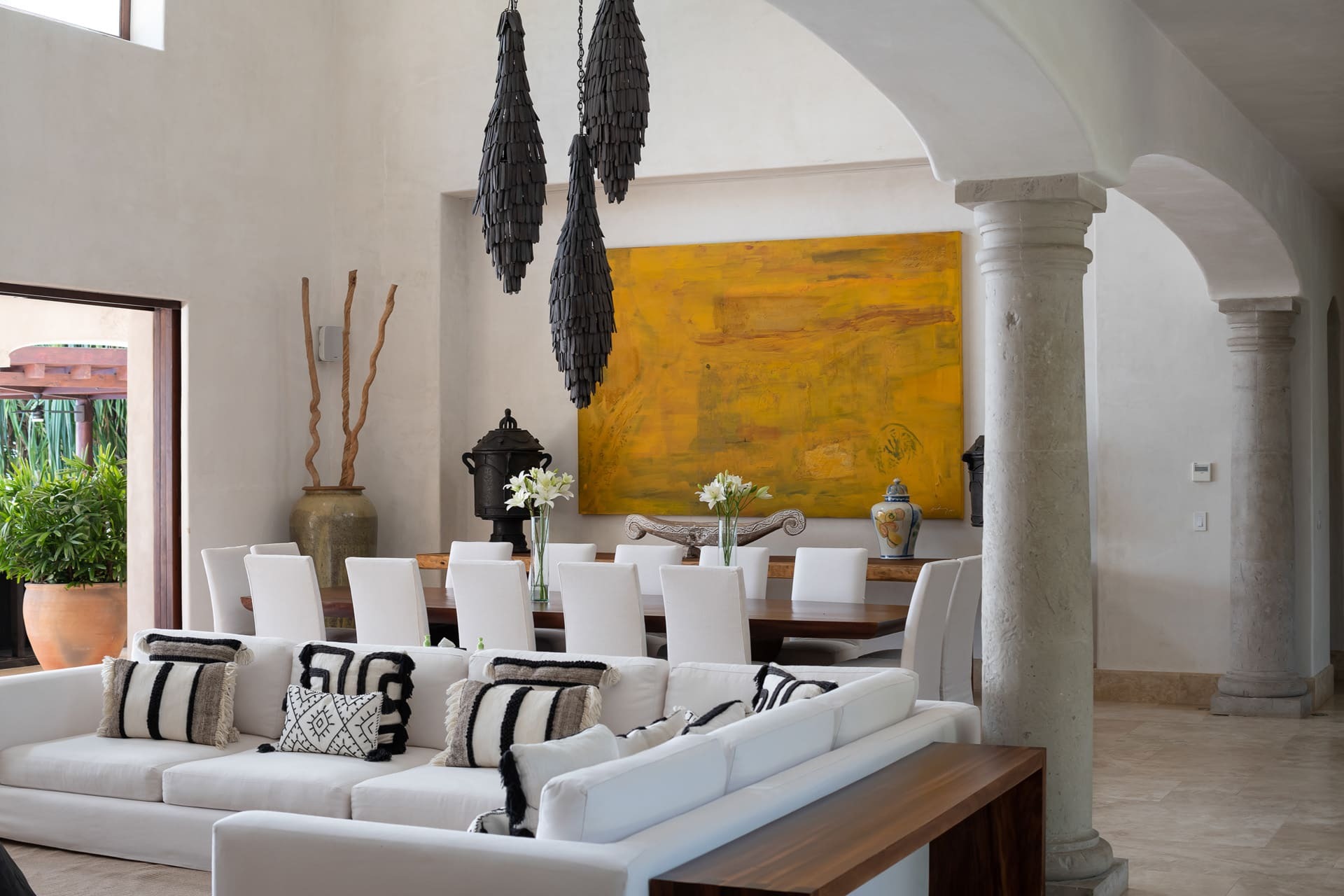 The villa offers multiple open-plan living areas designed to flow seamlessly to the terraces and pool. Large sliding glass walls open the interiors to ocean air and light, creating relaxed social spaces for gathering, dining, and unwinding with uninterrupted sea views.