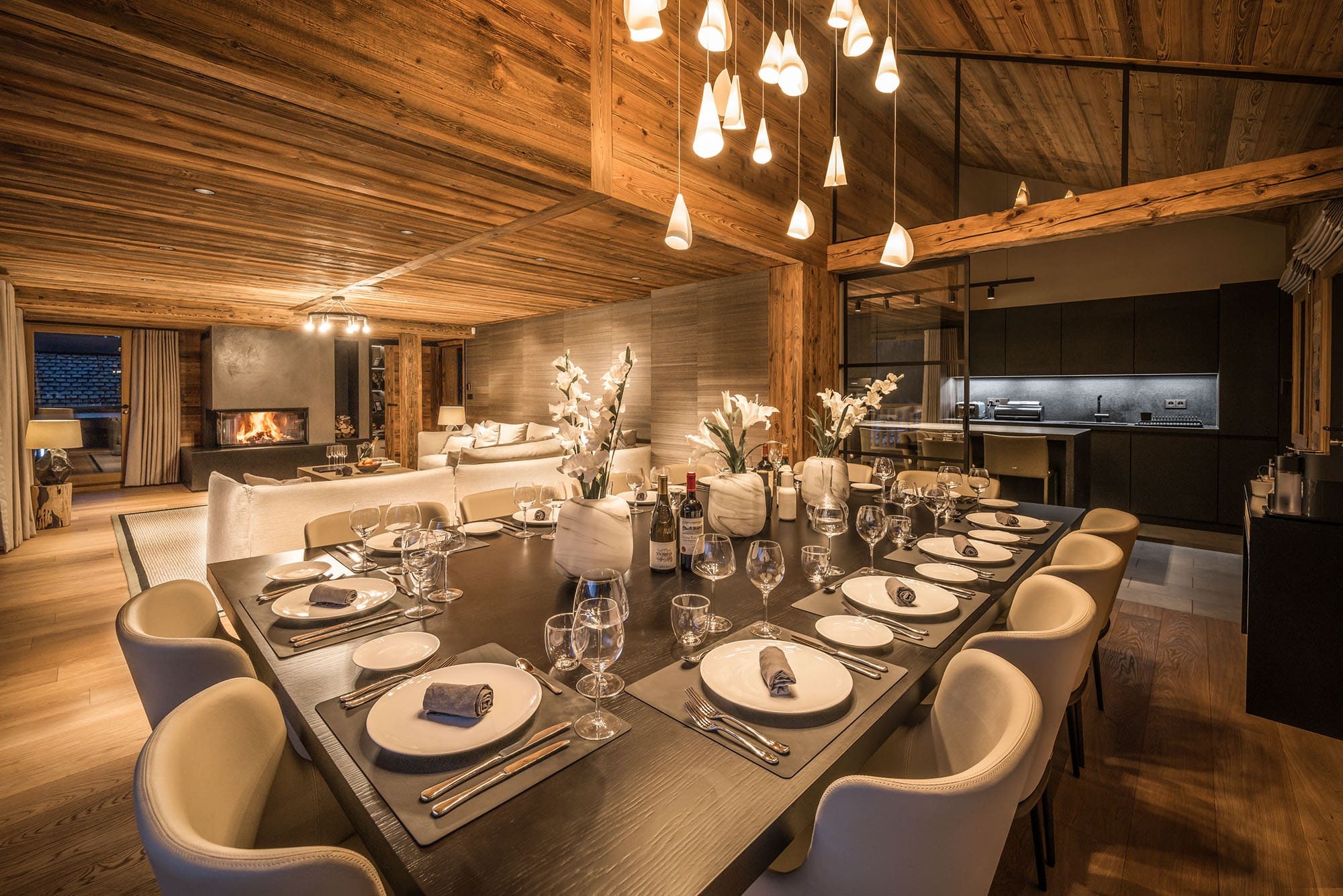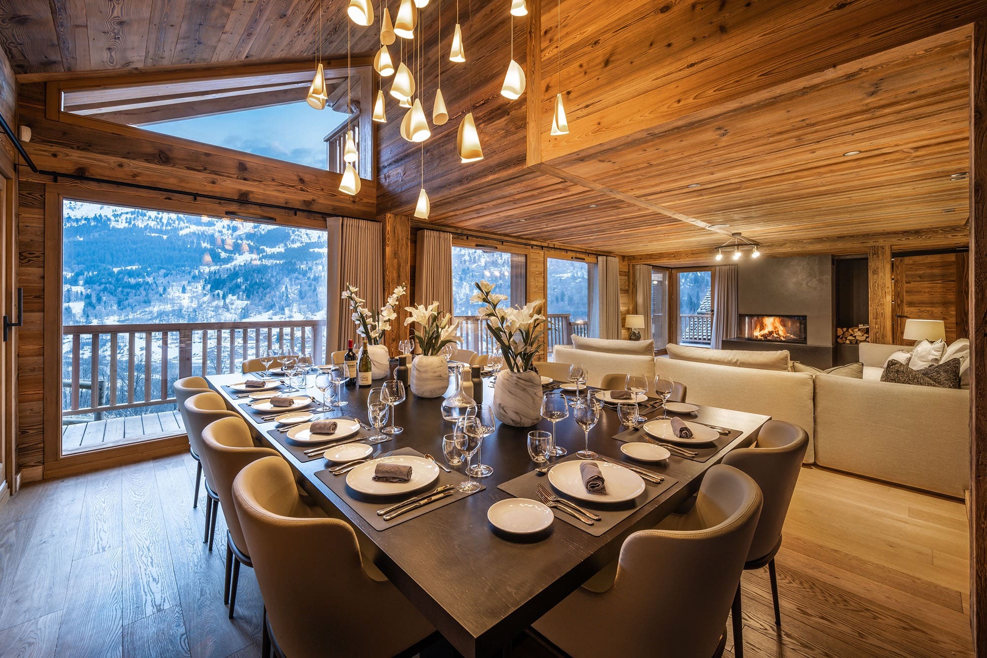 The main living room is a warm and welcoming alpine haven, designed for comfort after long days on the slopes. Large sofas invite guests to gather around the fireplace, creating a relaxed and sociable atmosphere. Expansive windows frame panoramic mountain views, ensuring that even moments indoors remain connected to the surrounding peaks.