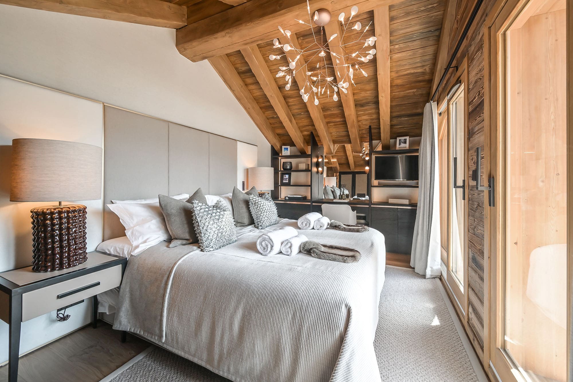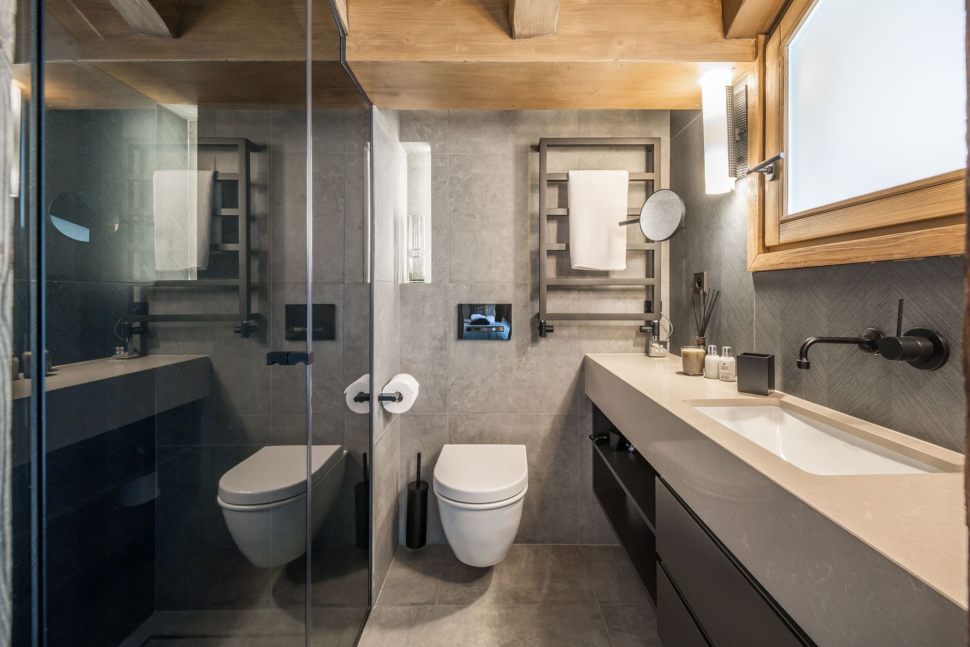 Five comfortable bedrooms each feature their own ensuite bathroom, offering privacy and ease for families or groups. Furnished in a modern classic style with refined fabrics and natural materials, the rooms feel both elegant and restful. Four bedrooms offer flexible bedding arrangements, allowing beds to be configured as doubles or twins to suit your group. Fresh linen, bath towels, chalet slippers, and towelling dressing gowns are provided for every guest. A dedicated laundry room includes a washing machine, dryer, and in-chalet safe for added convenience.