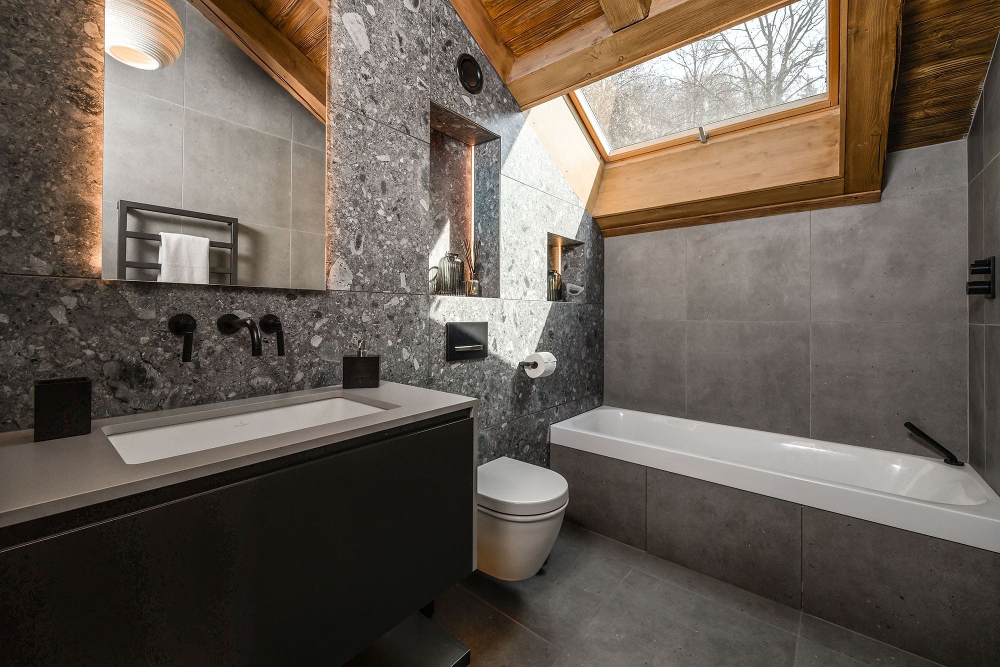 Each of the five bedrooms includes its own ensuite bathroom, finished in a classic alpine style and designed for comfort and privacy.