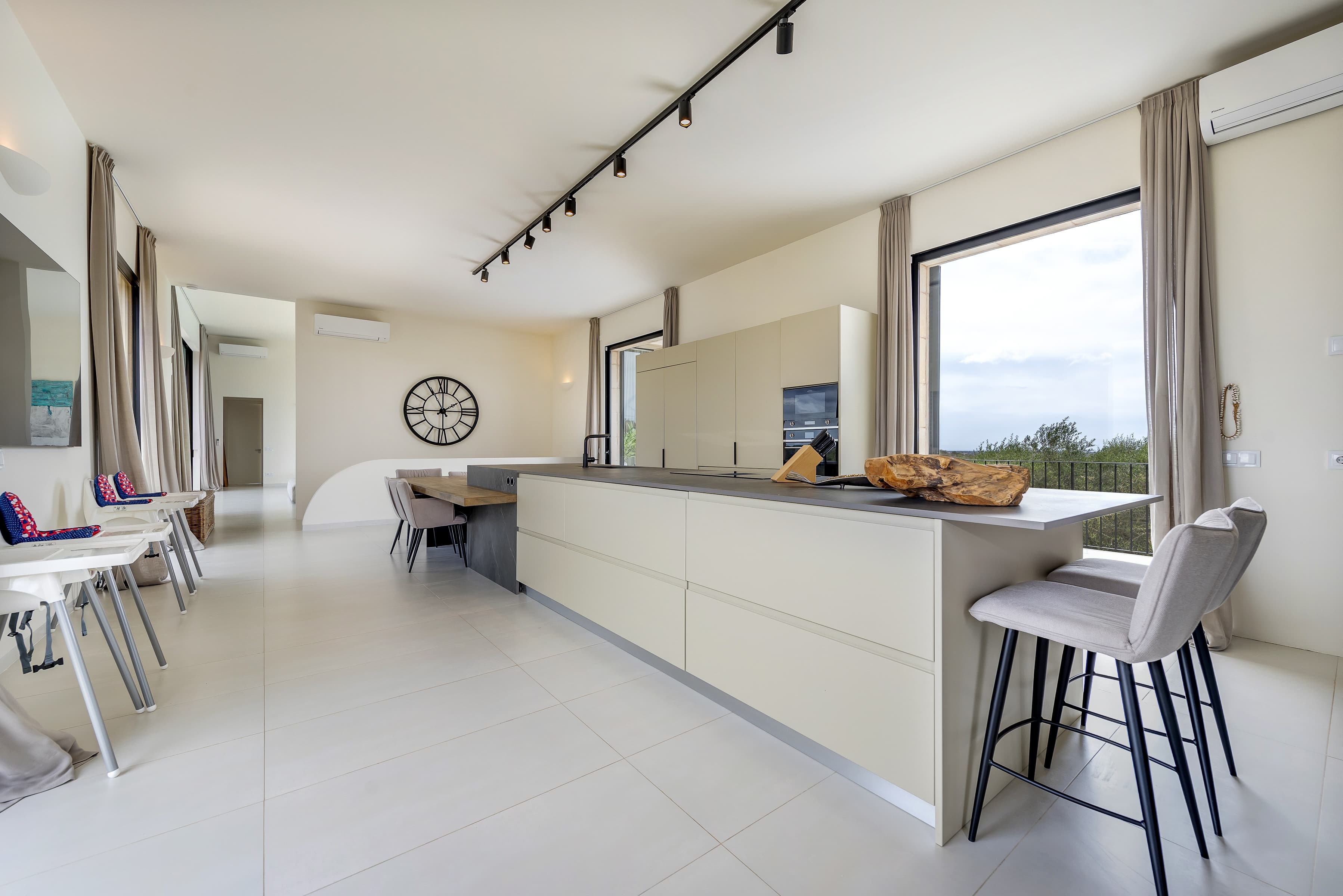 Two fully equipped designer kitchens allow for effortless daily living and seamless entertaining. A central island forms a natural gathering point, while indoor and outdoor dining spaces invite meals to unfold slowly, from relaxed breakfasts to long dinners beneath the open sky.