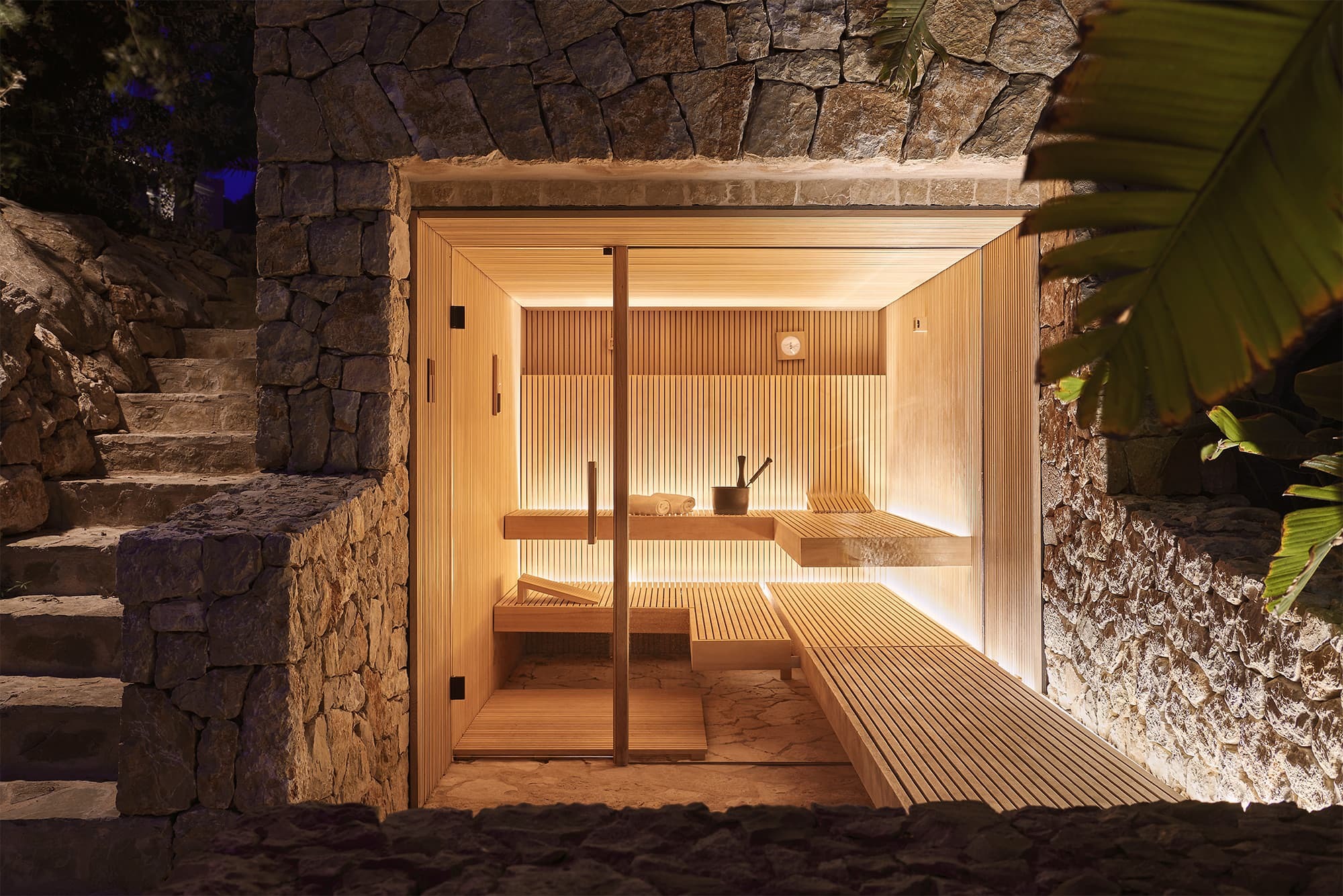 Set within 33,000 sqm of land, the outdoor areas offer space, privacy, and a strong connection to nature. A 16-metre heatable infinity pool, multiple terraces, shaded chill-out areas, and a sauna with panoramic views create a series of places to relax throughout the day.