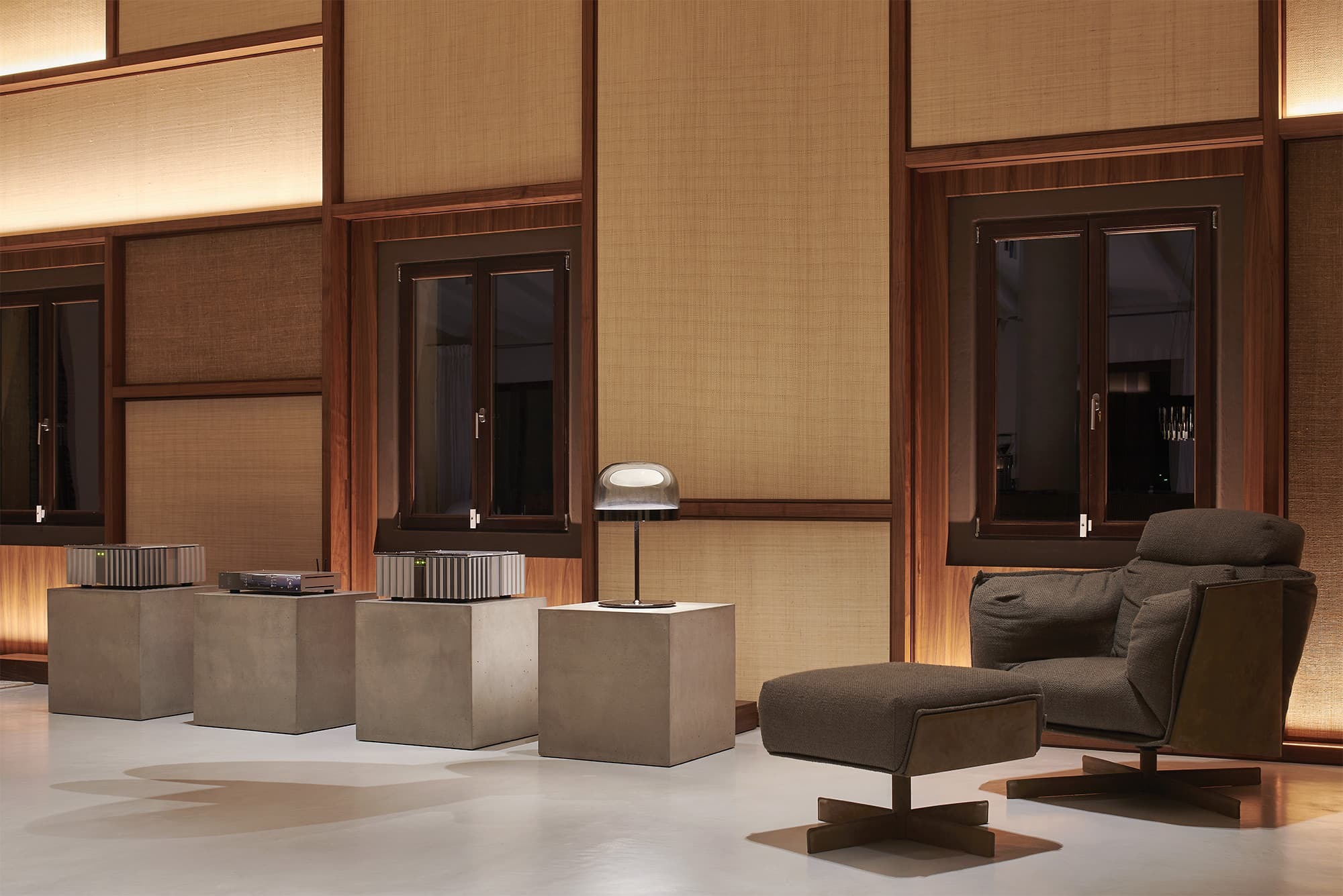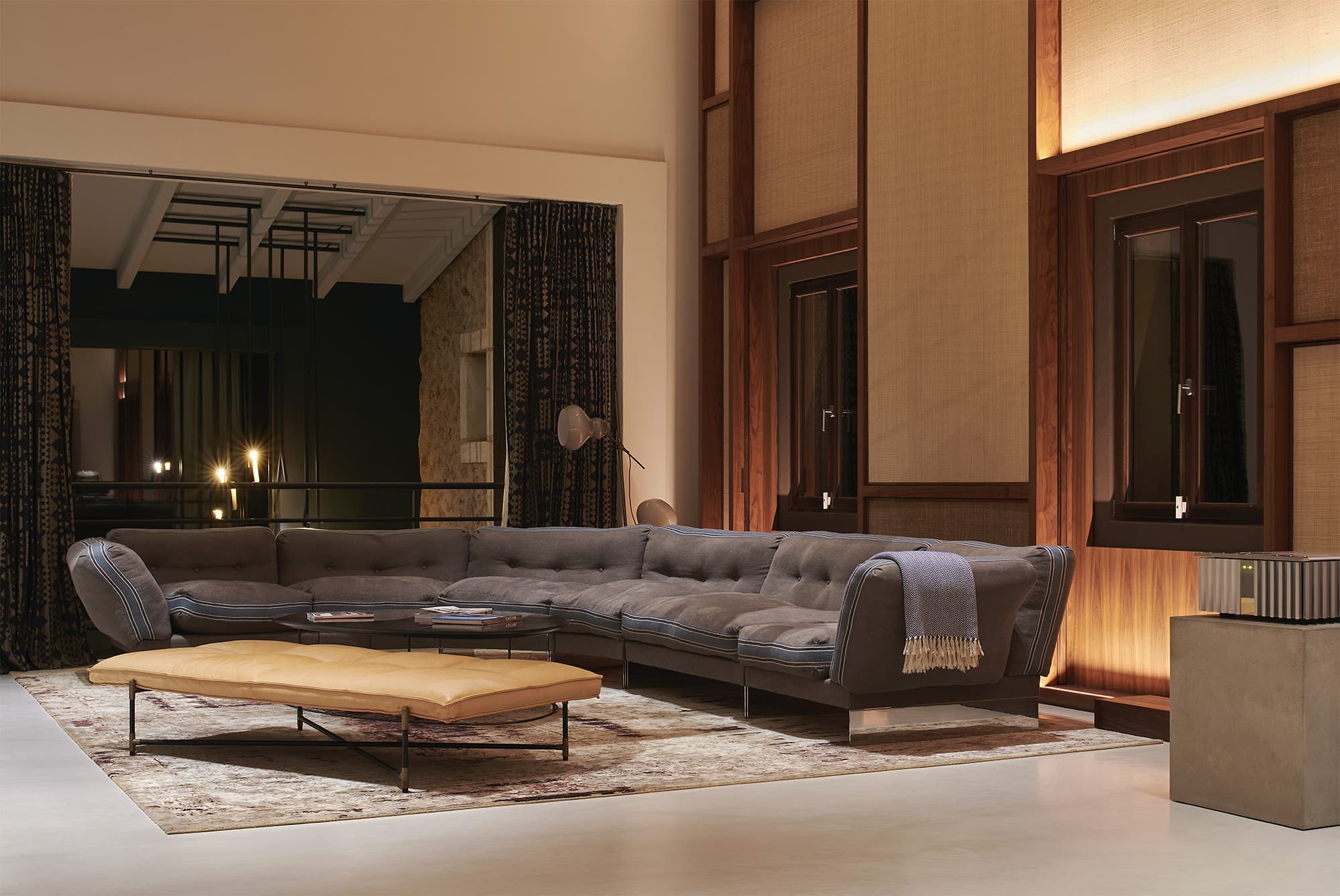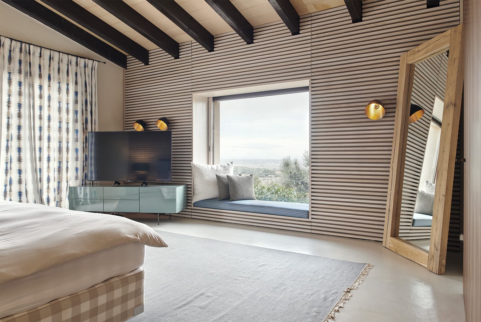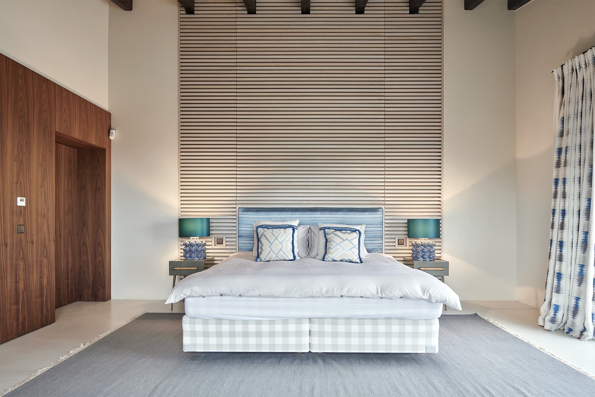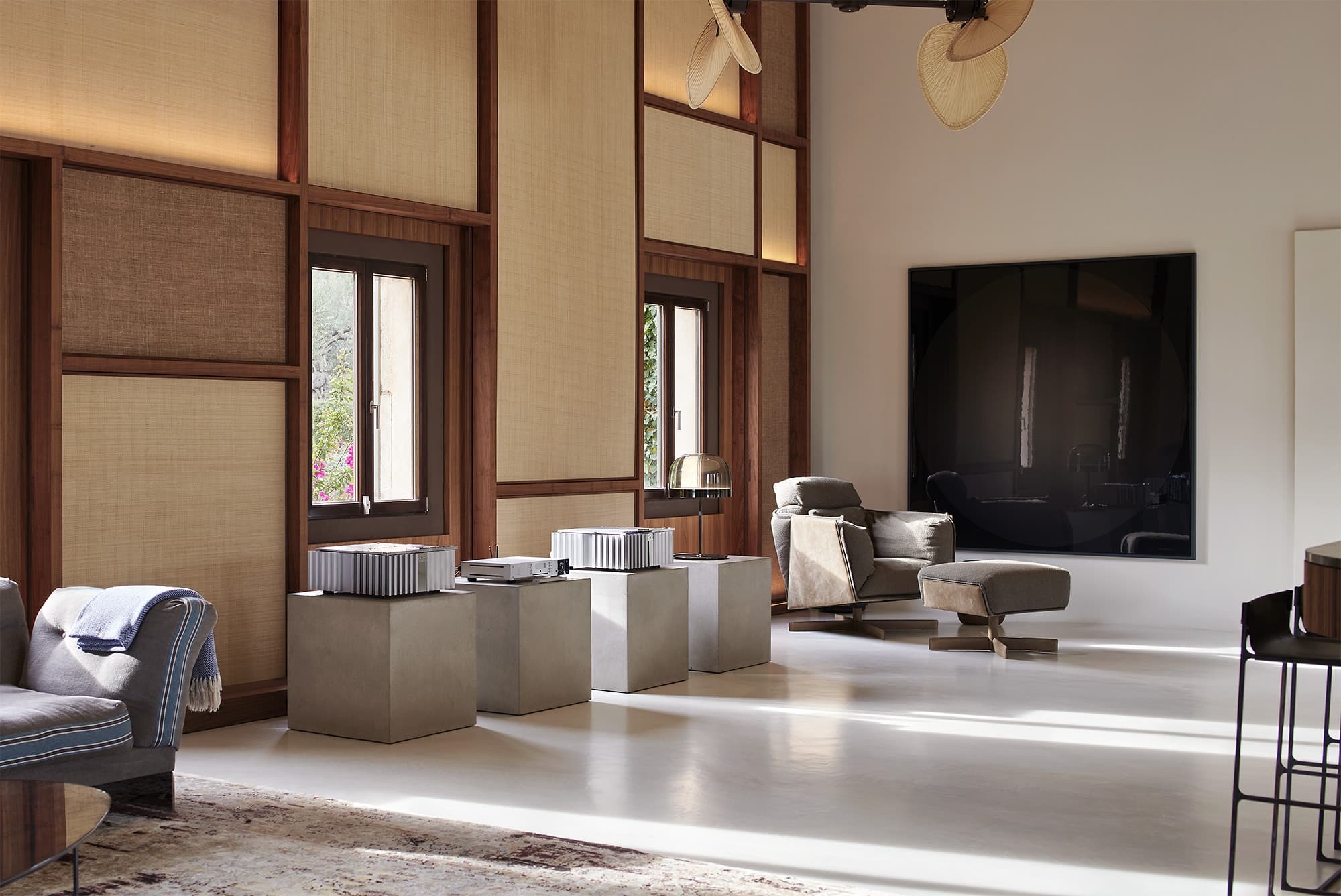A sense of openness defines the interiors, where high ceilings and expansive glazing draw the landscape into every room. The main living area is both generous and inviting, centred around soft seating, warm textures, and a natural flow towards the terraces, creating a seamless connection between indoor comfort and outdoor living.