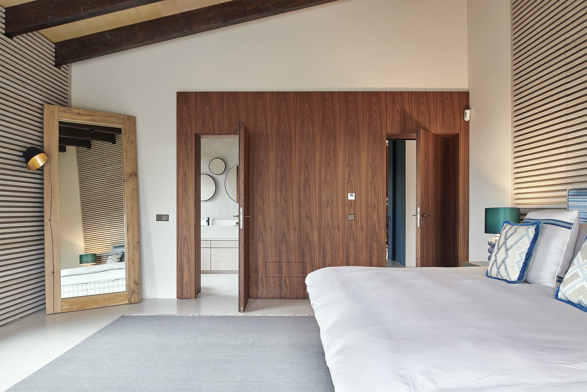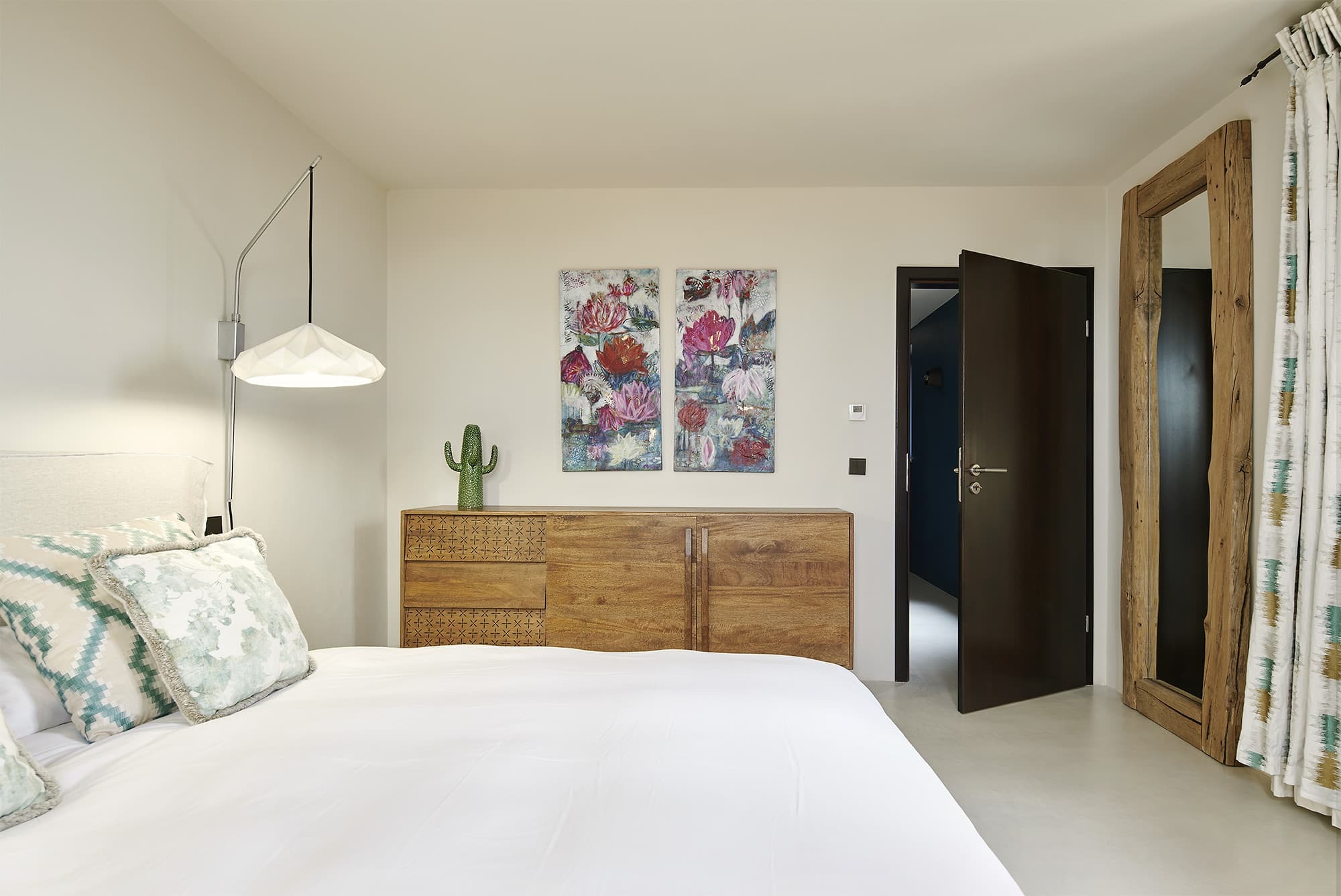 Five thoughtfully designed bedrooms are arranged between the main house and a separate guest house, offering both privacy and flexibility. Each room features its own en-suite bathroom, refined furnishings, and views across the surrounding countryside. Discreet laundry facilities support longer, effortless stays.