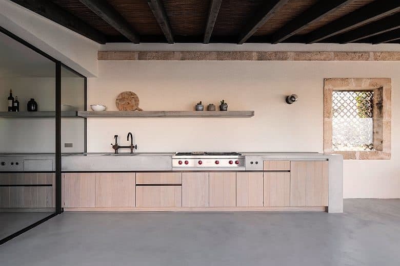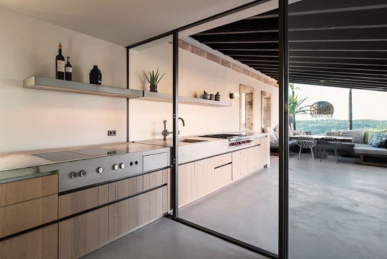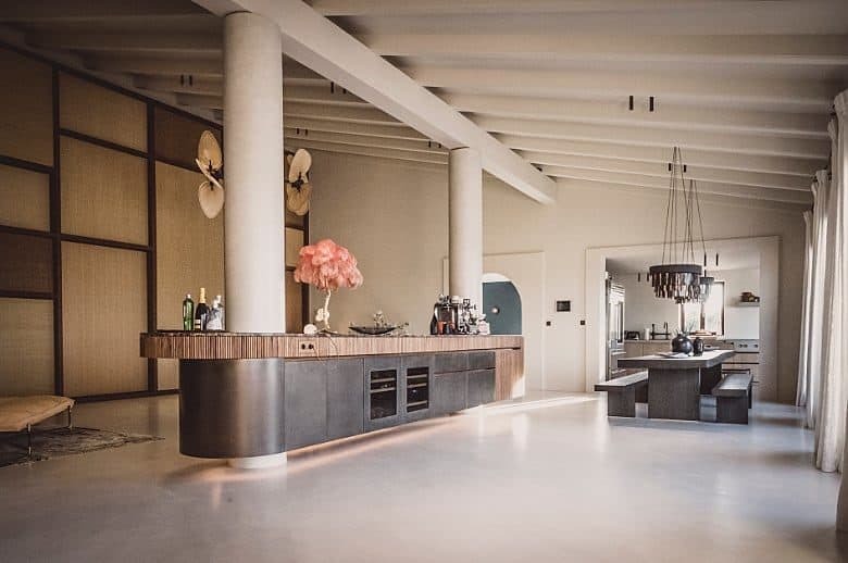 At the heart of the finca, a fully equipped designer kitchen is complemented by a striking 5.5-metre dining table, creating a natural gathering point for shared meals. A bar area adds to the social atmosphere, while the covered outdoor kitchen allows dining to extend easily onto the terraces for relaxed evenings under the open sky.
