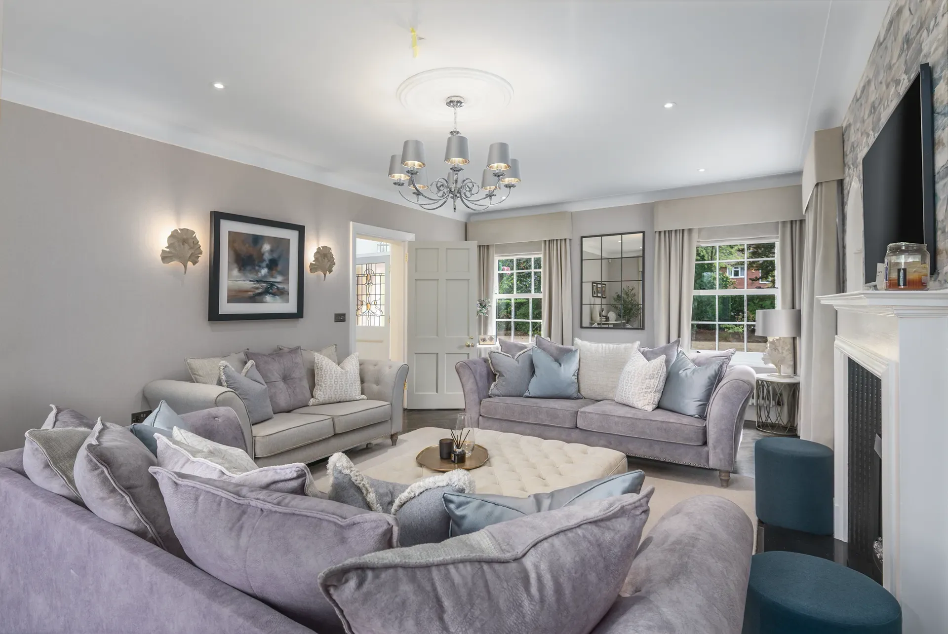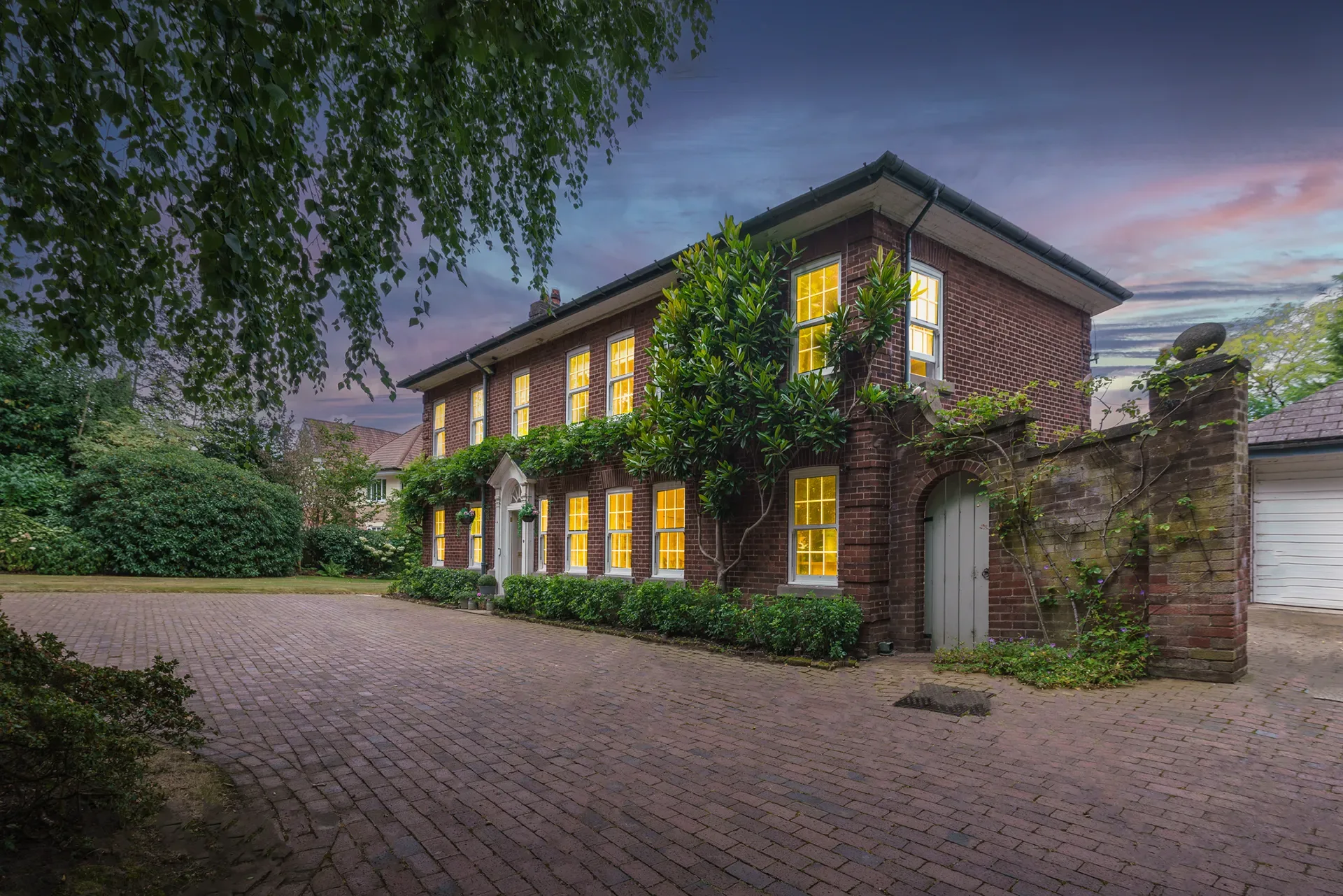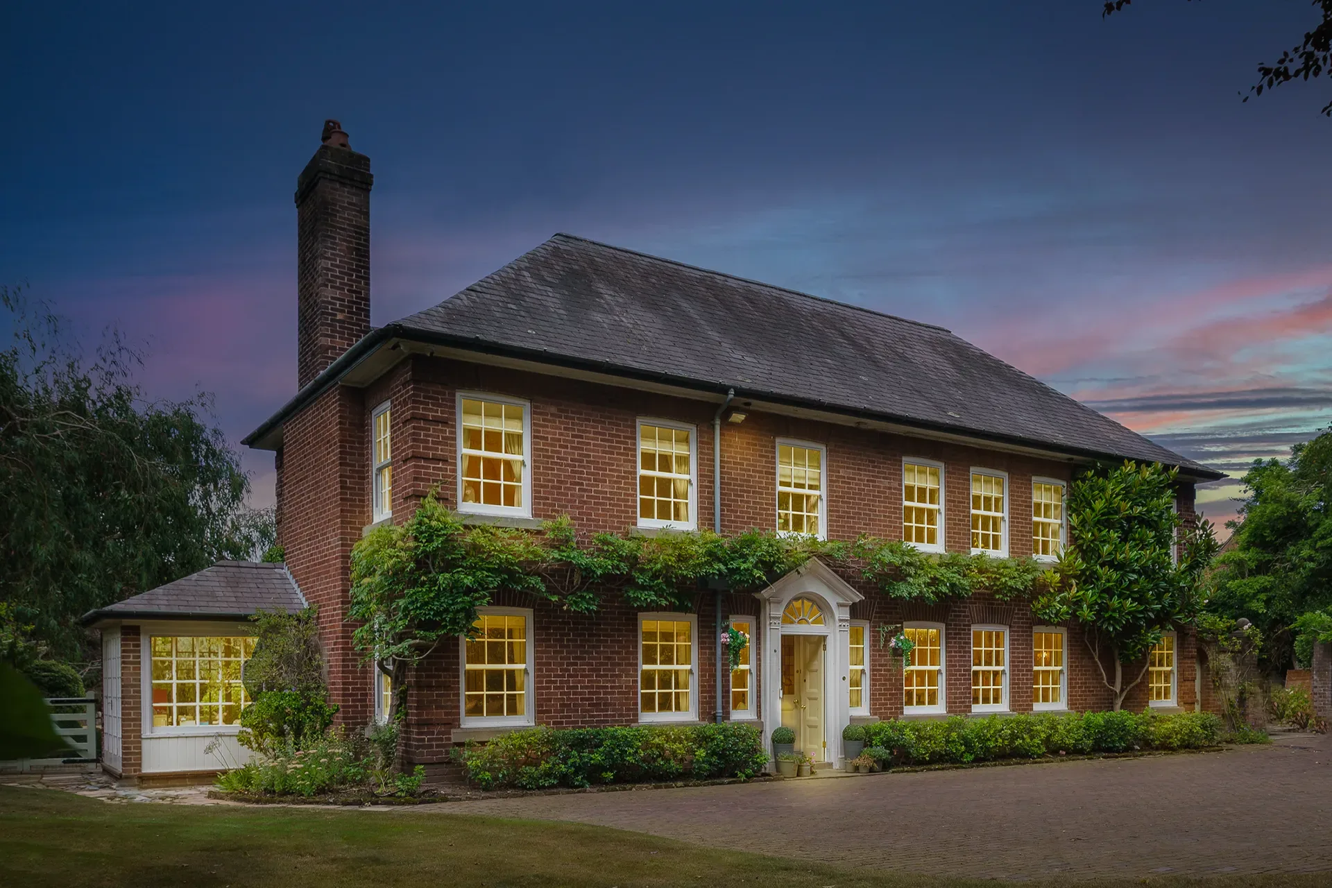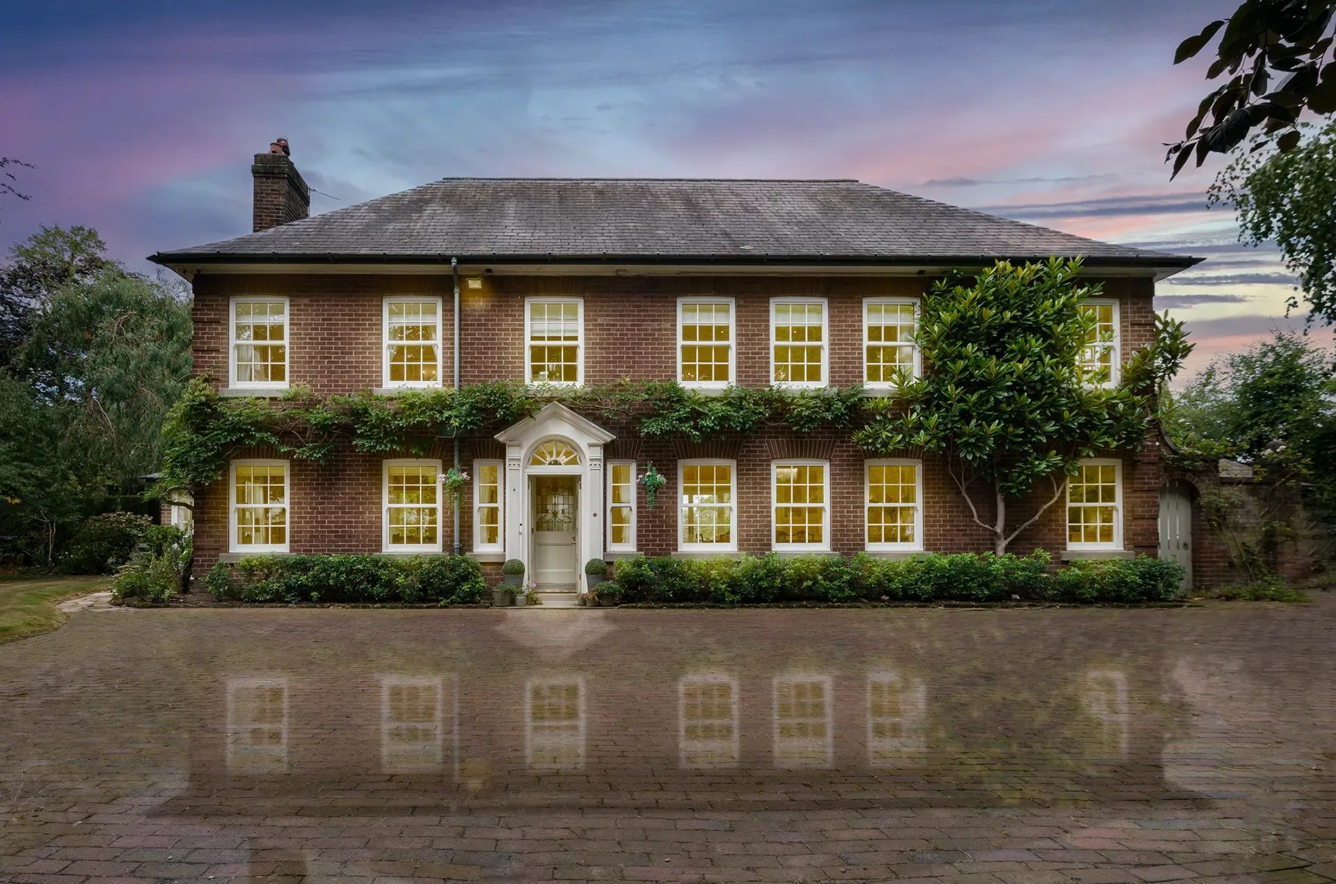 Grand Wisteria House is located in Cheshire, set within a private residential setting. The house offers a strong sense of scale and presence, with Georgian-inspired architecture that reads as both stately and welcoming on camera.