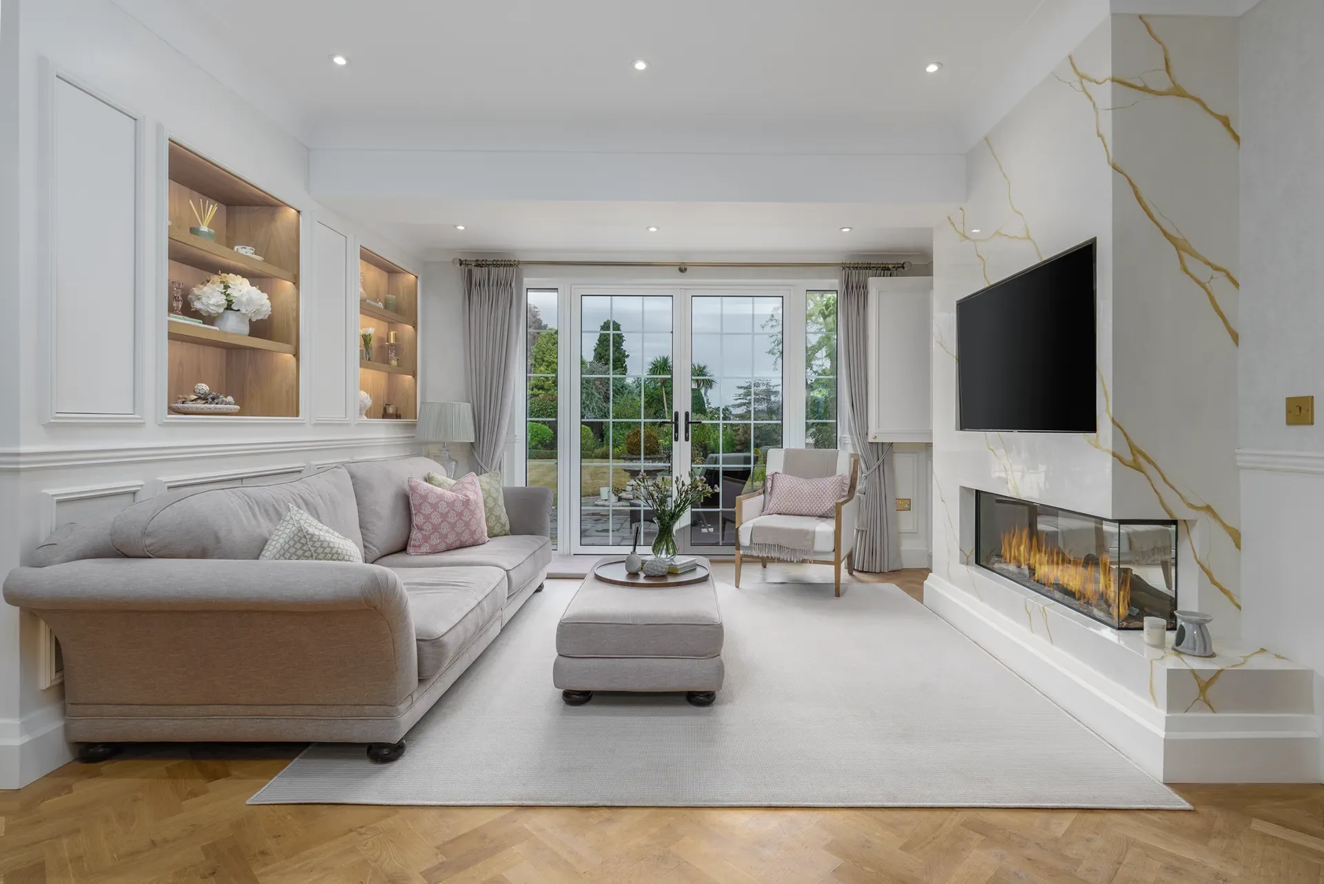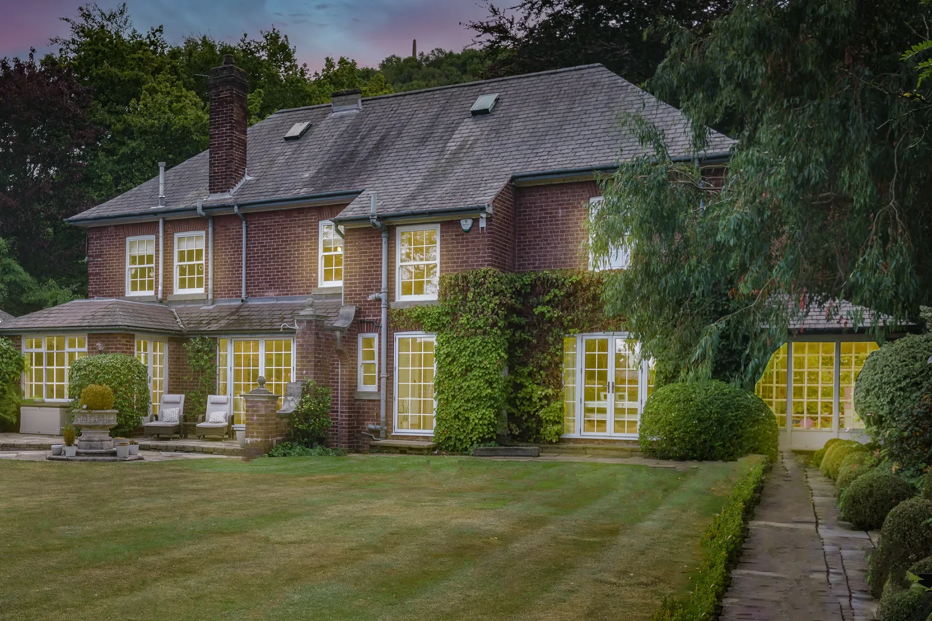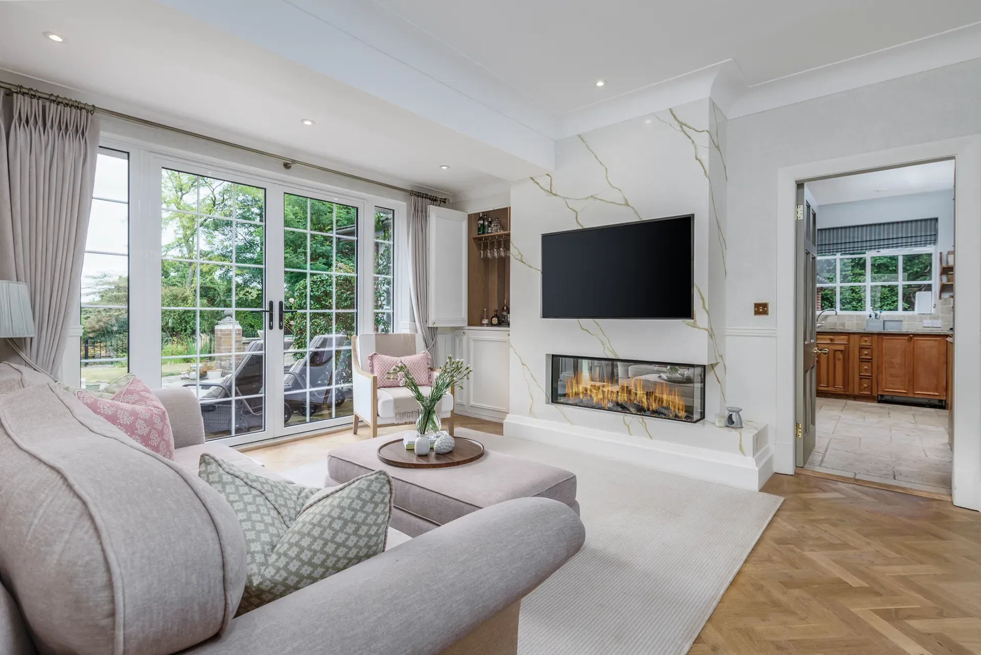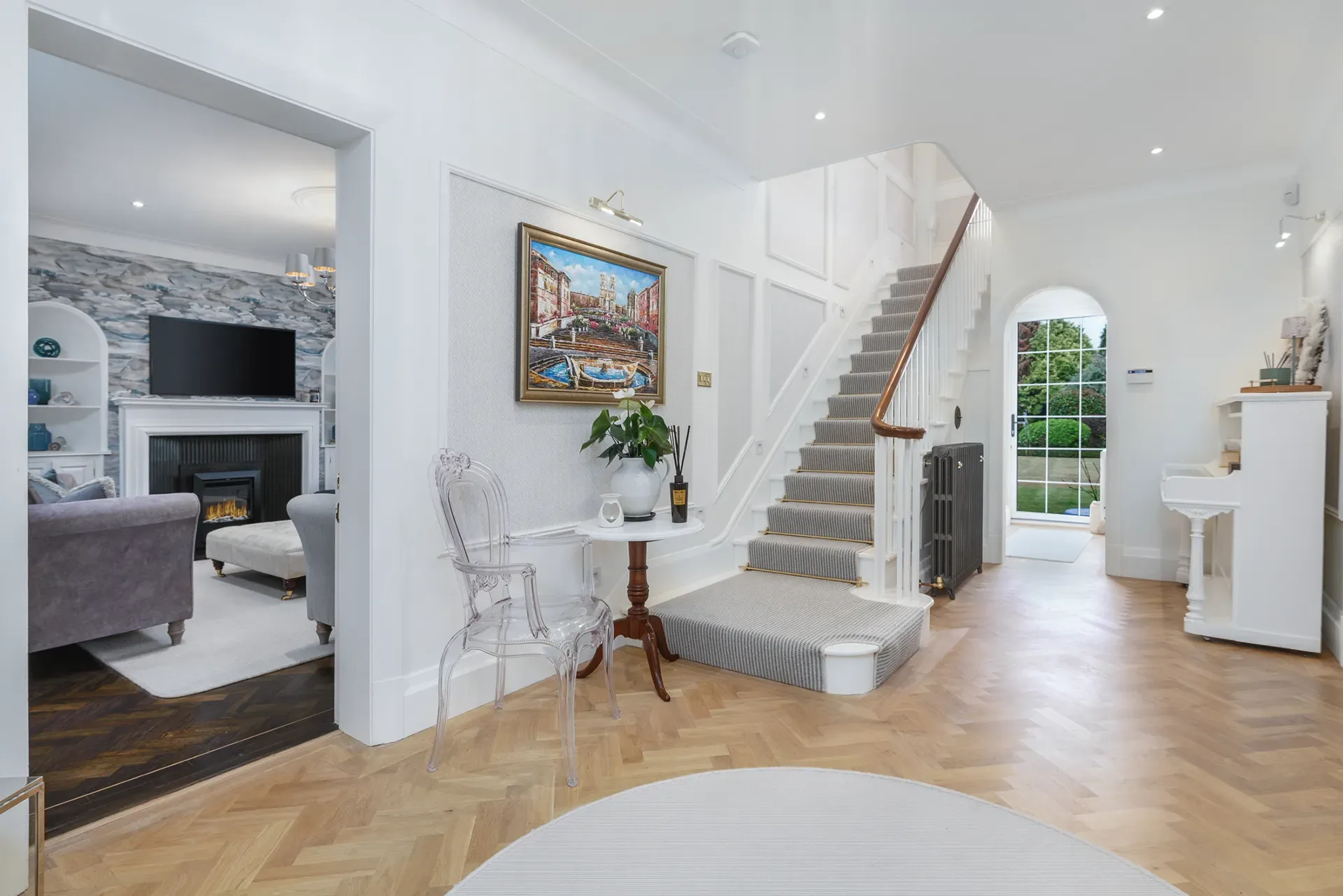 The home offers approximately twelve beautifully styled rooms for use, each thoughtfully curated to feel timeless, editorial and visually rich, while still retaining a sense of warmth and lived-in elegance. Set within just under an acre of mature, landscaped gardens and approached via a private driveway with parking for six to seven cars, the house provides a secluded yet highly versatile backdrop.