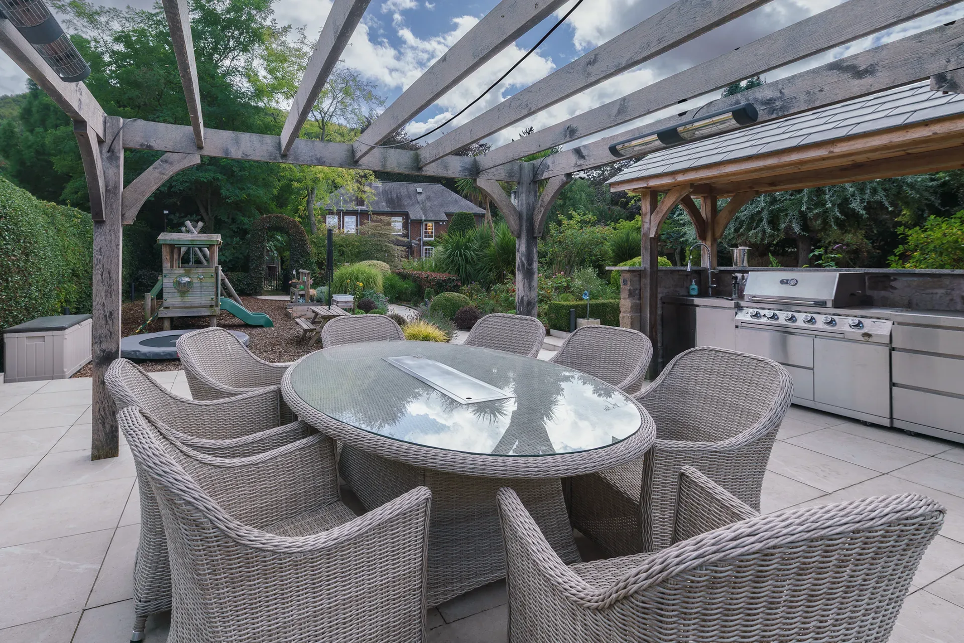 The property sits within just under one acre of mature, landscaped garden, providing extensive outdoor shooting options. The grounds include lawns, planting, and established greenery suitable for lifestyle, fashion, and editorial shoots.