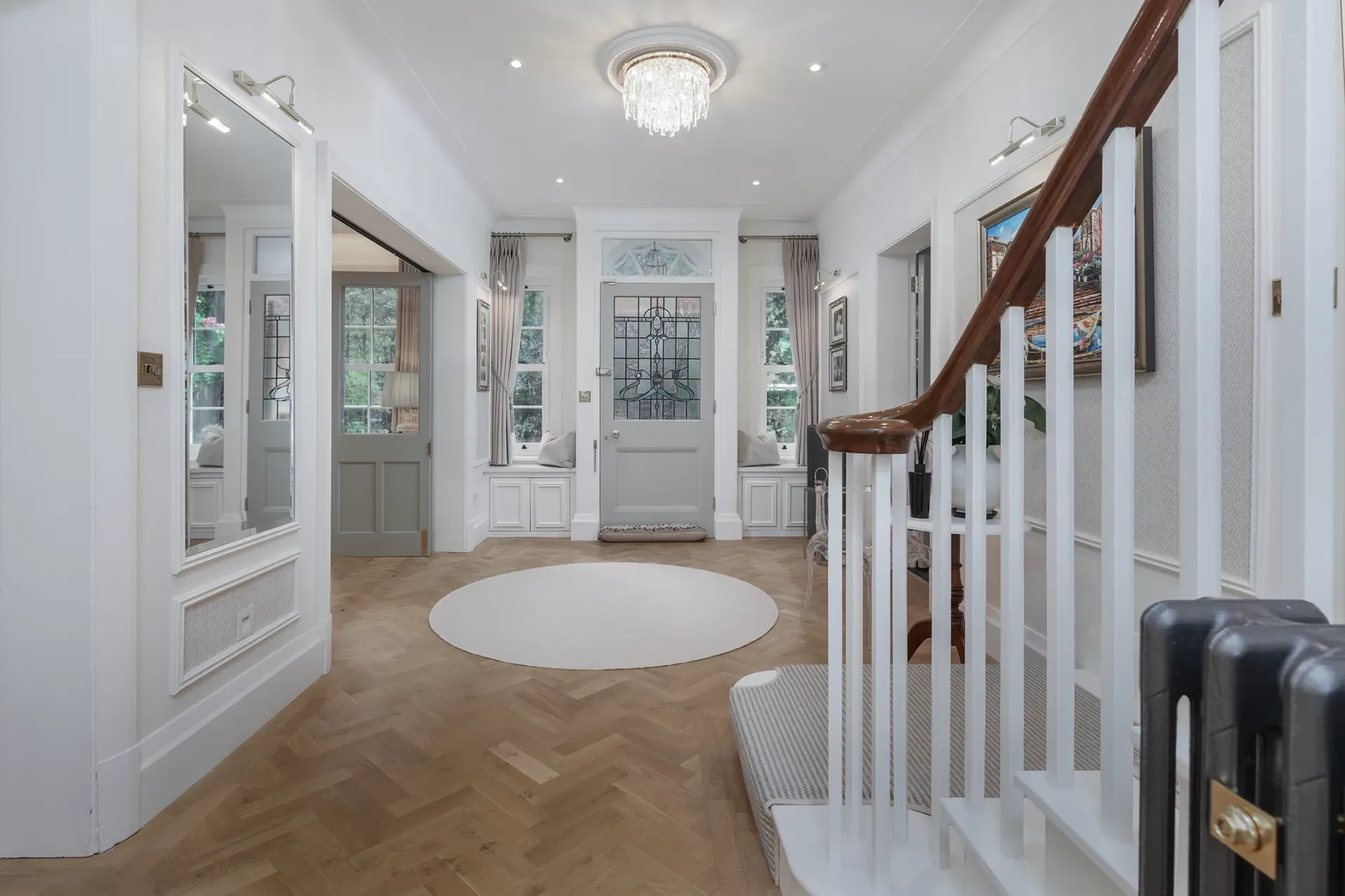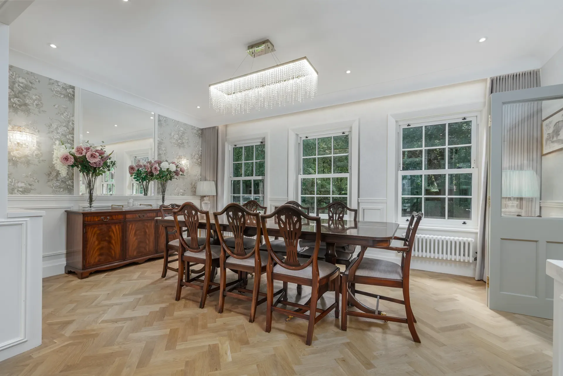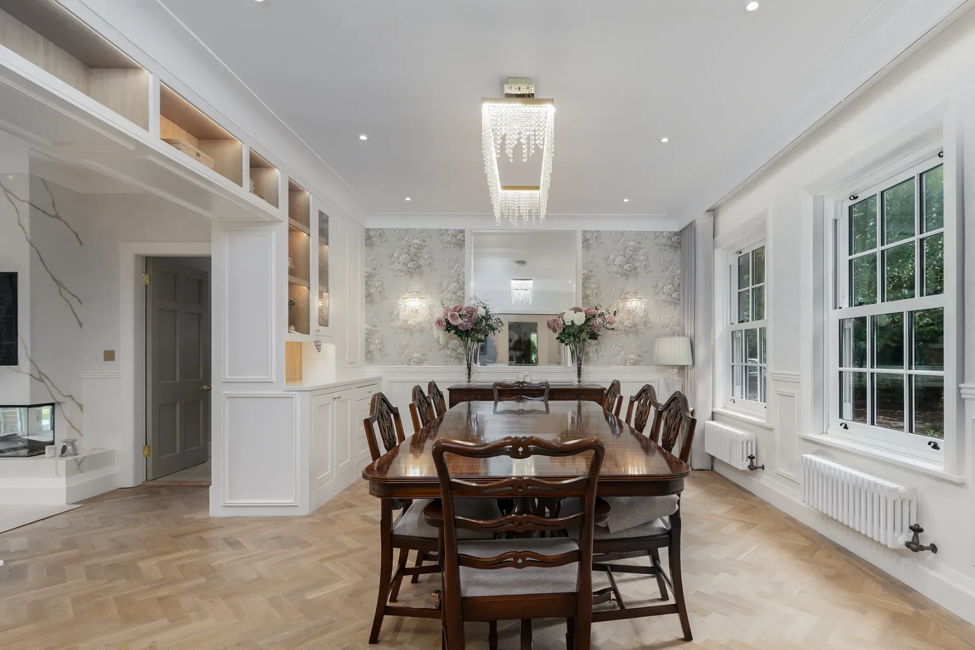 Grand Wisteria House is a Georgian-inspired private residence located in the heart of Cheshire, United Kingdom, available exclusively for location hire only. Originally built in the 1930s, the property combines a classic Georgian-style exterior with a modern-classic interior aesthetic, subtly infused with French chic.