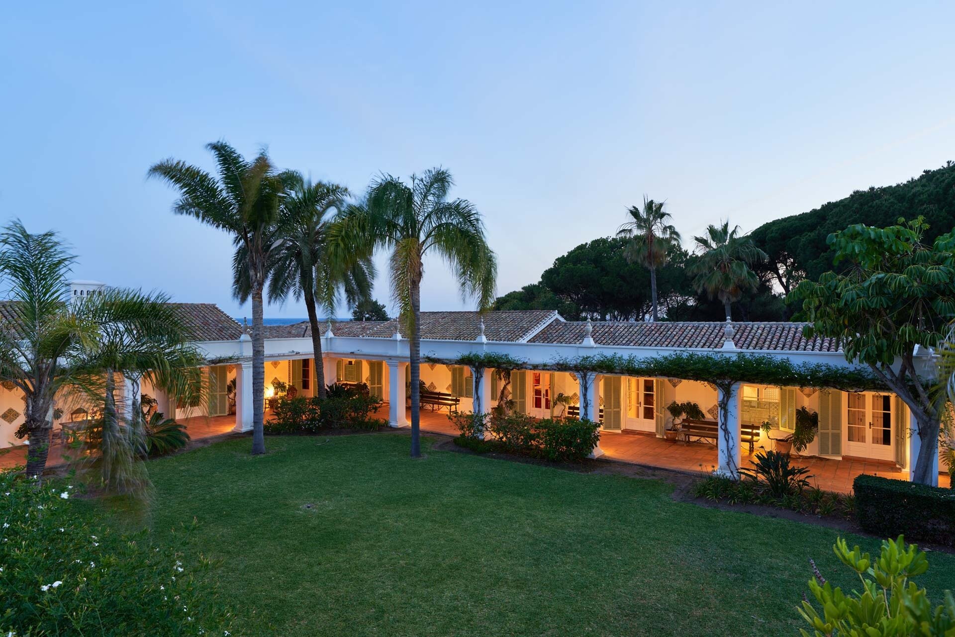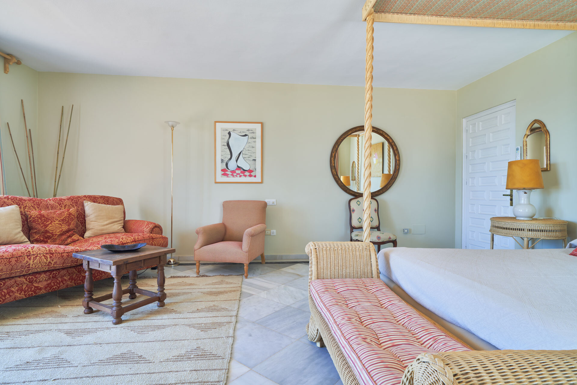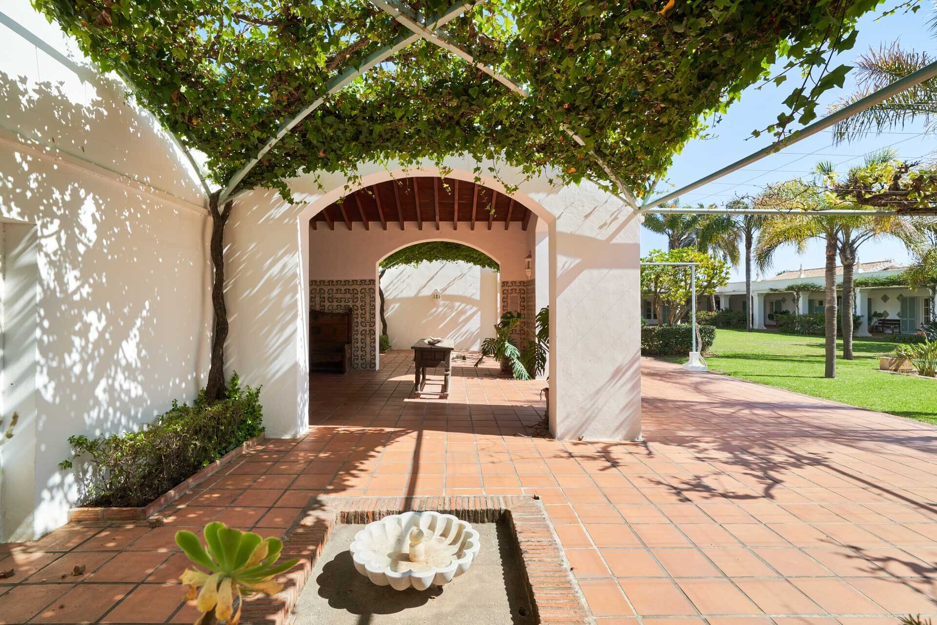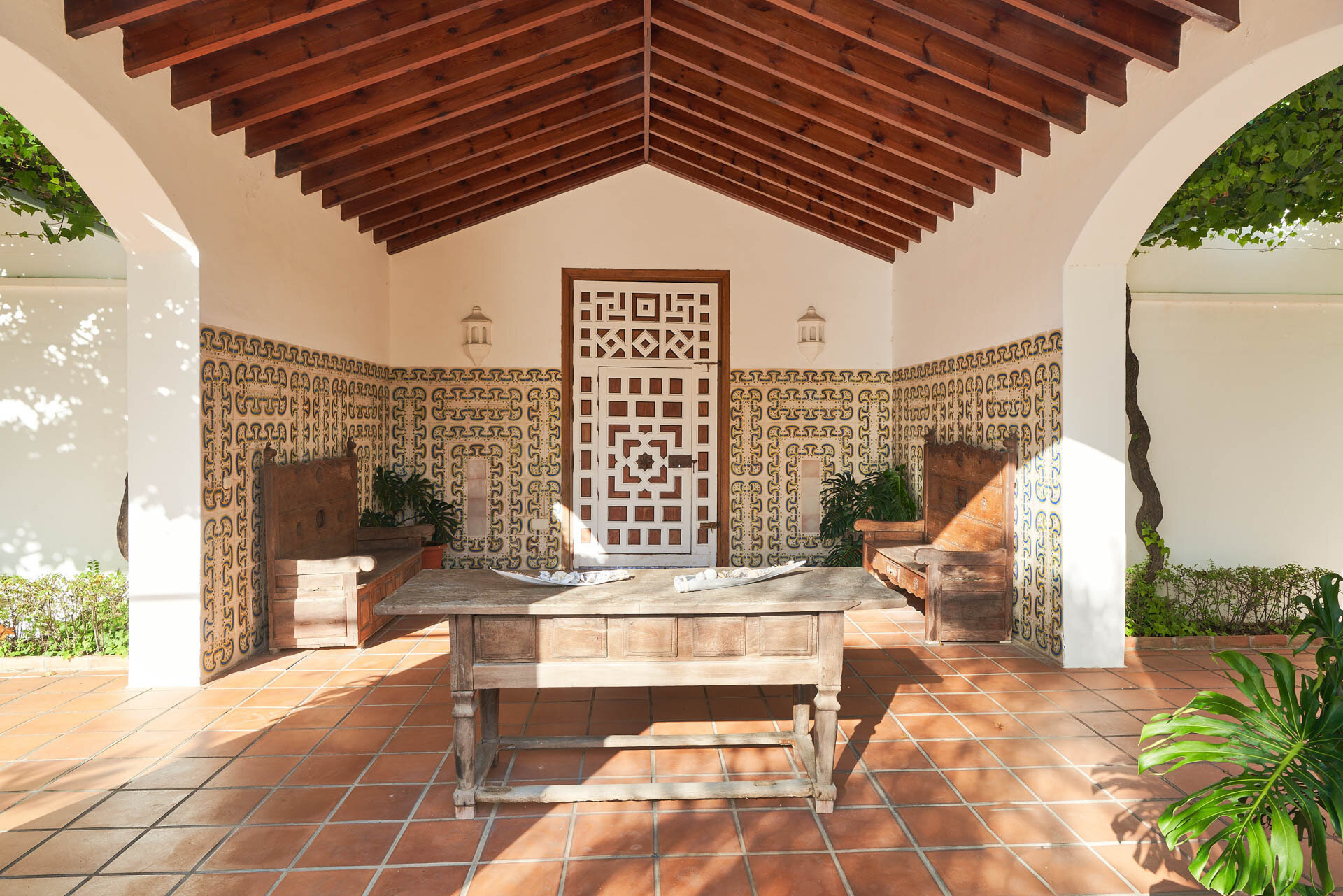 The hacienda is a celebration of classic Andalusian architecture. Whitewashed façades, arched walkways, tiled roofs, and terracotta paths define the estate, while shaded porches, fountains, and palm lined gardens evoke the timeless elegance of traditional Spanish living by the sea. Interiors favour authenticity and atmosphere over contemporary design, with patterned tiles, exposed wooden beams, and natural materials lending the house a warm, lived in character.