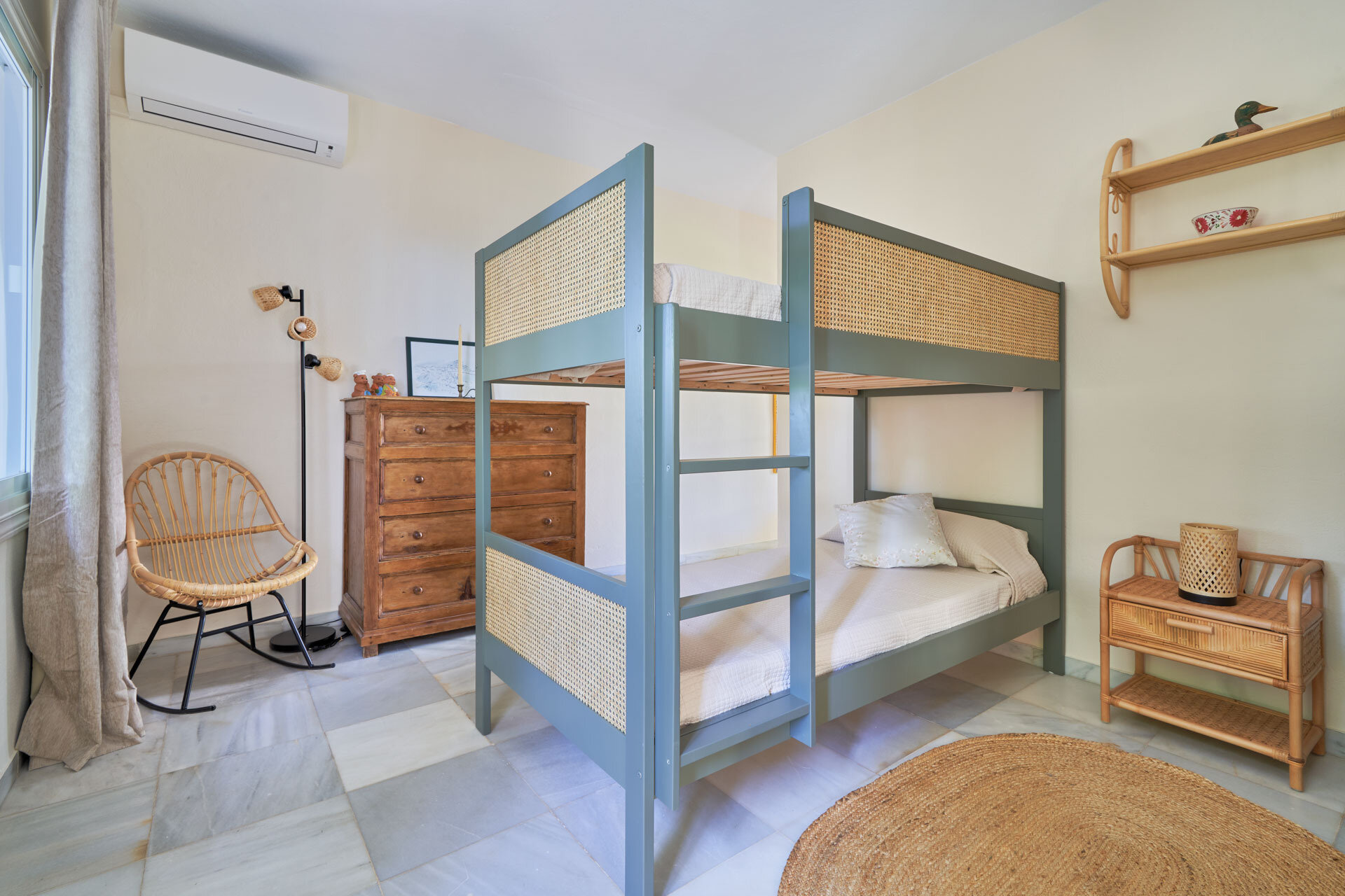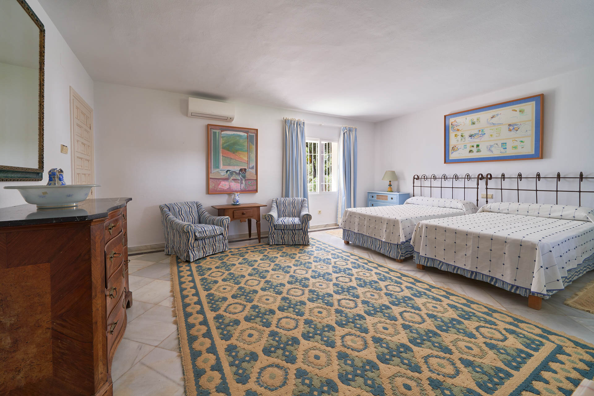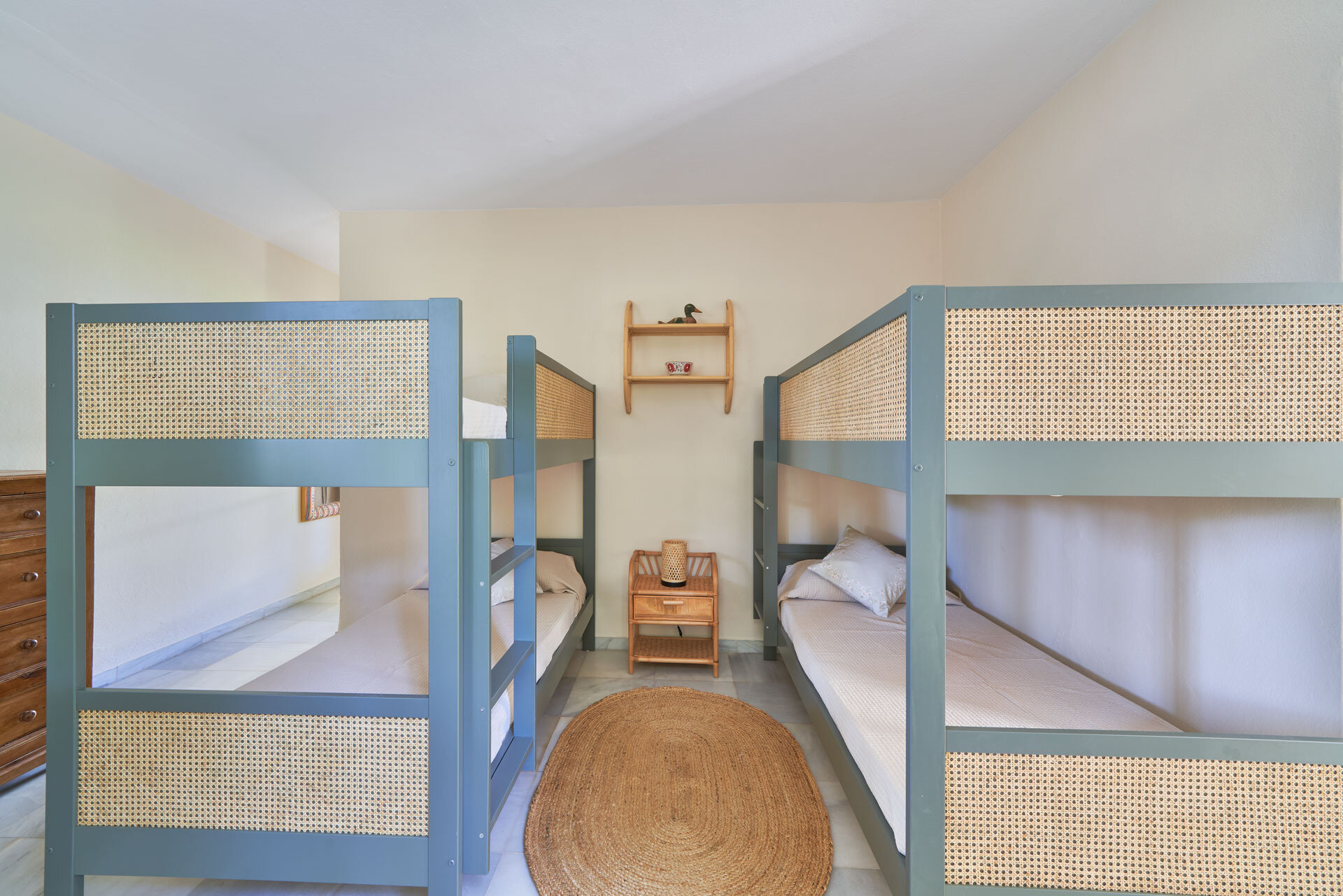 The hacienda accommodates up to fourteen guests across six bedrooms. Five bedrooms are designed for adults, while a dedicated children’s room with bunk beds makes the property particularly well suited to family stays. Bedrooms are arranged to offer privacy and comfort, many with garden or sea views. Housekeeping is included, with laundry services available on request.