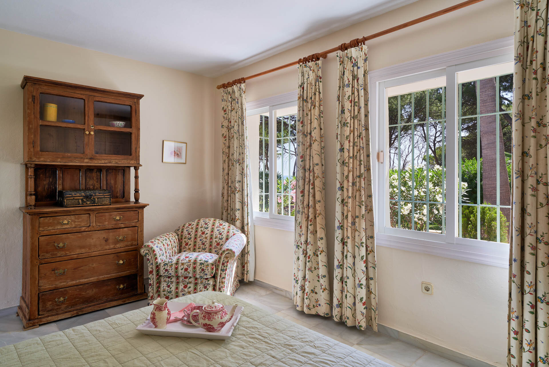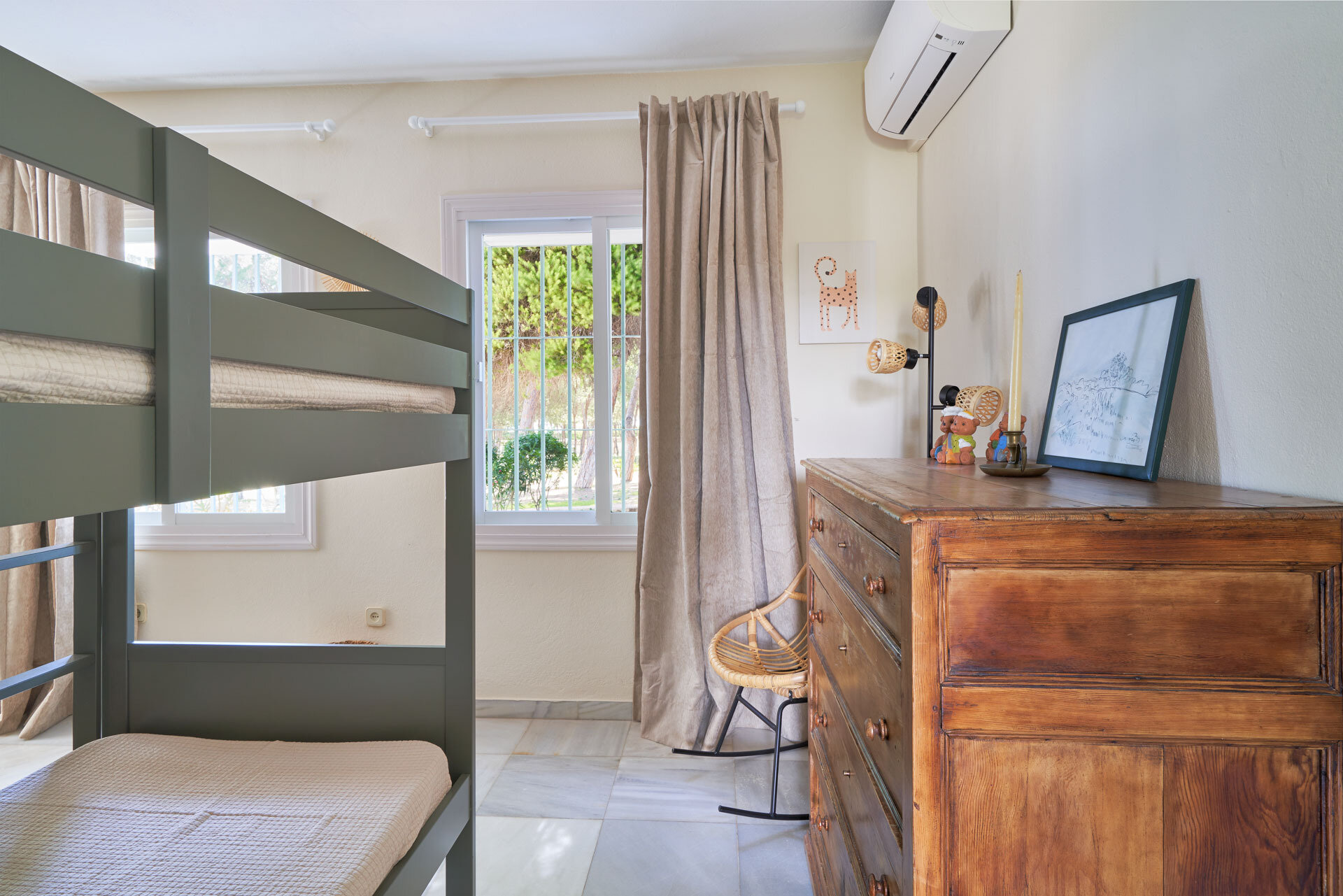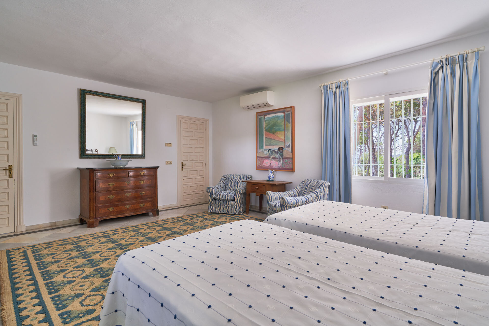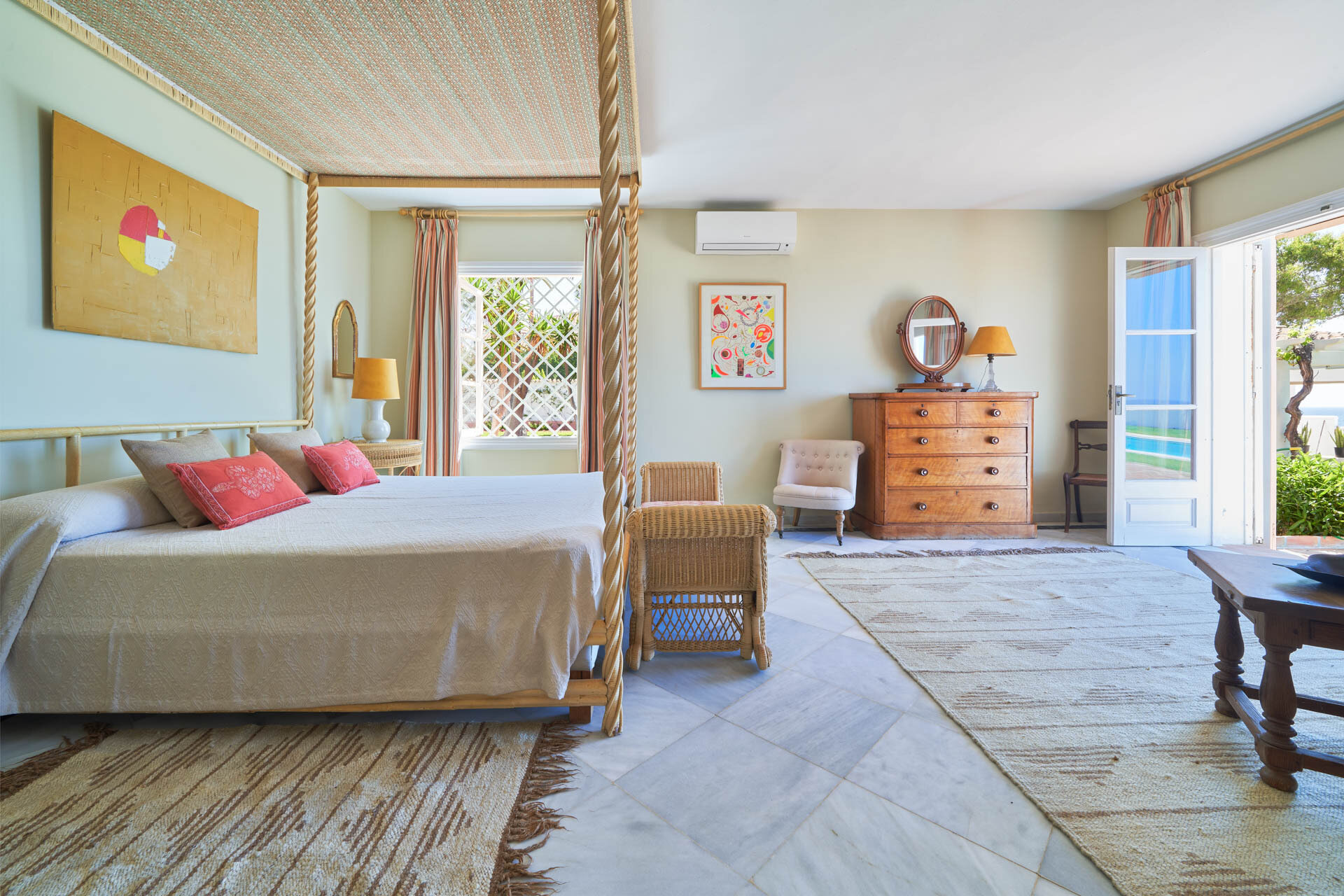 The hacienda accommodates up to fourteen guests across six bedrooms. Five bedrooms are designed for adults, while a dedicated children’s room with bunk beds makes the property particularly well suited to family stays. Bedrooms are arranged to offer privacy and comfort, many with garden or sea views. Housekeeping is included, with laundry services available on request.