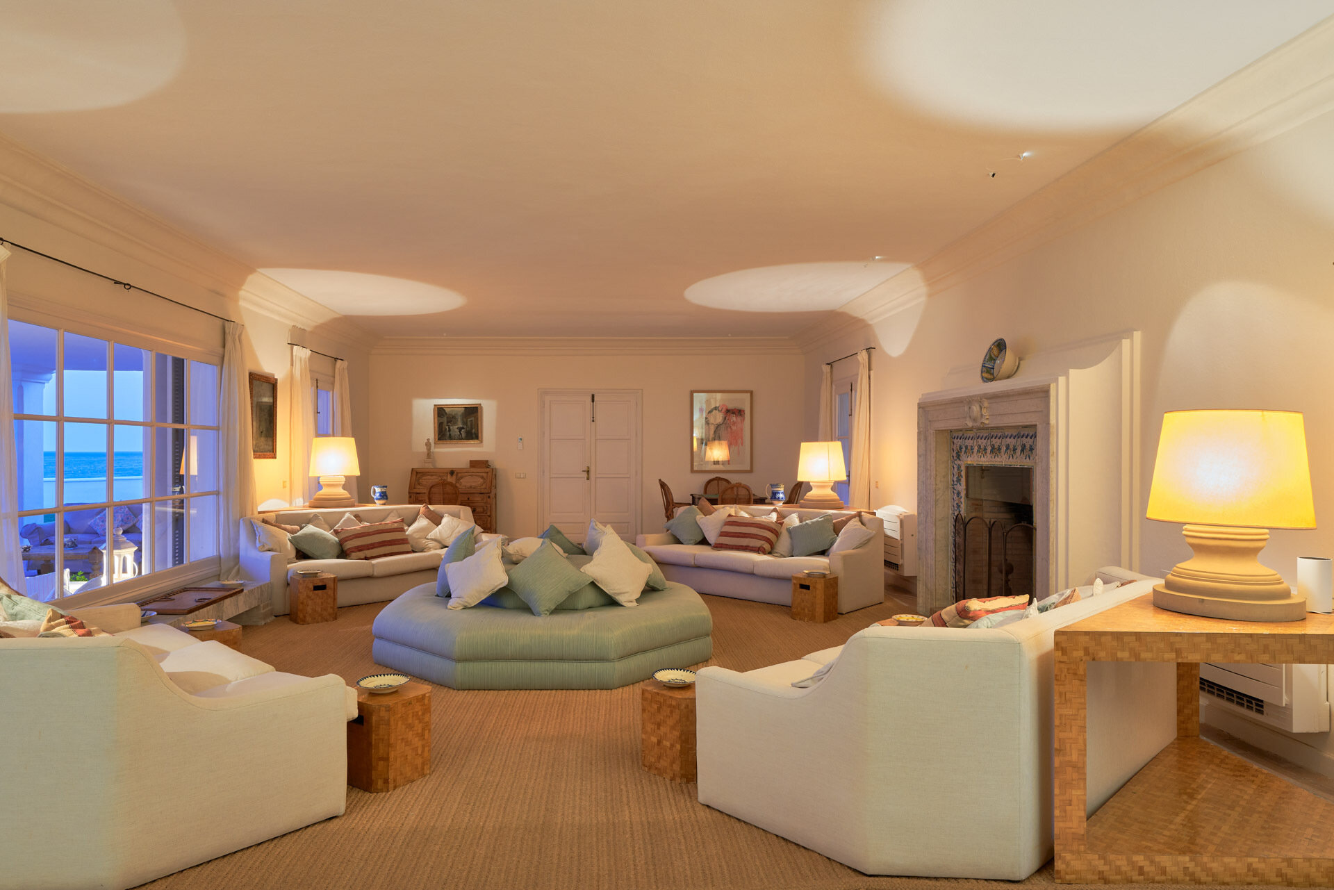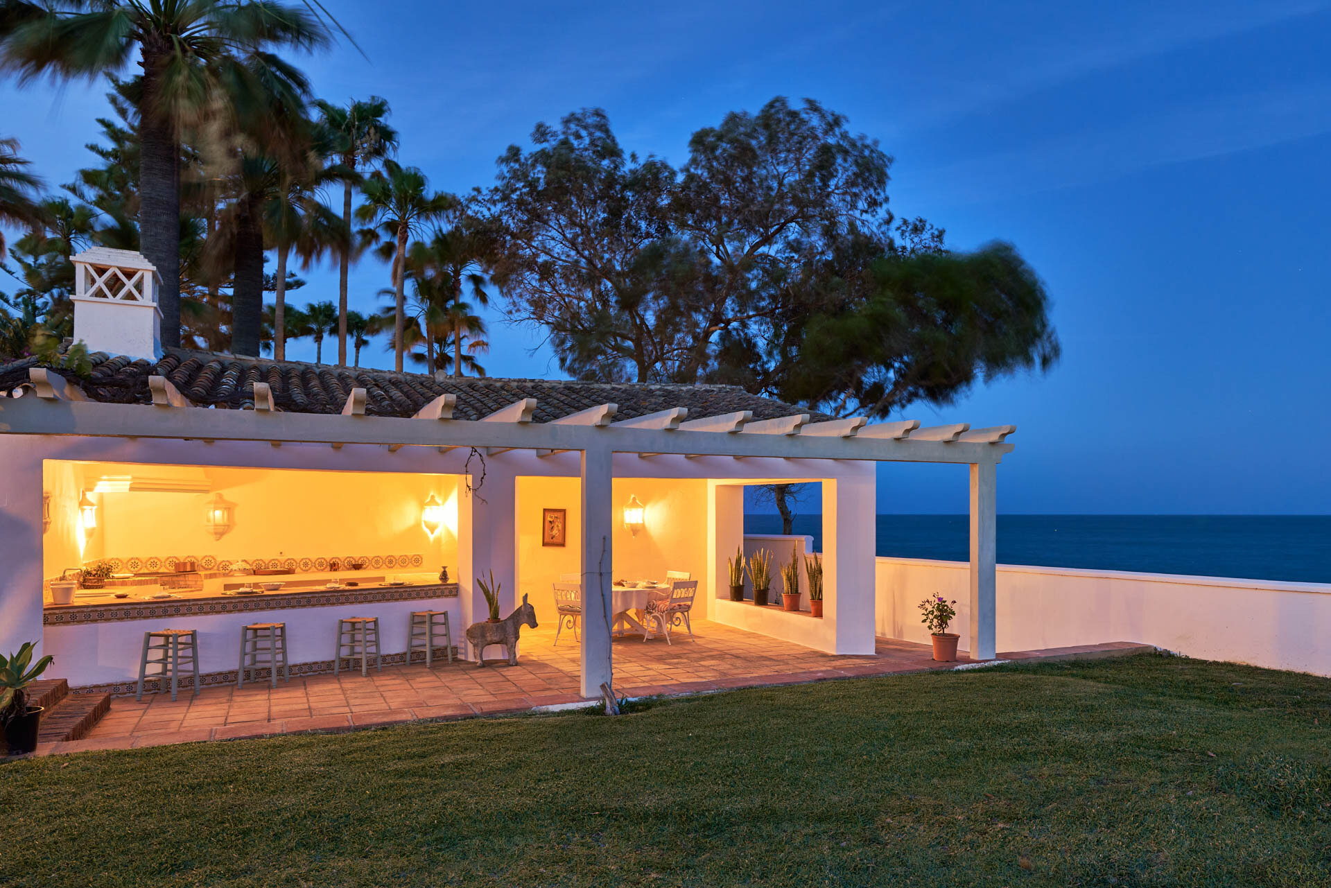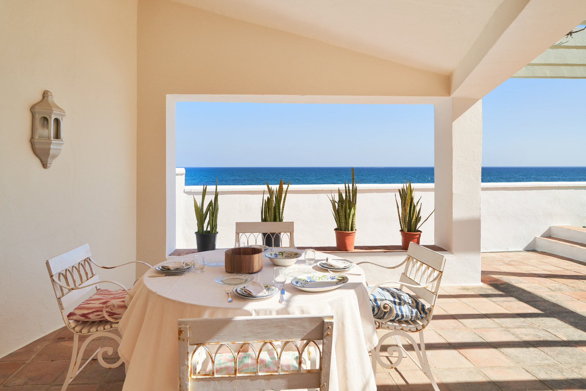 Set within more than fourteen thousand square metres of grounds, the outdoor spaces are a defining feature of the property. Lawns, orchards, vegetable gardens, and mature trees surround the hacienda, creating a sense of space and seclusion. A beachfront swimming pool overlooks the Mediterranean, while shaded terraces and patios provide multiple settings for dining, relaxing, and enjoying the sea air throughout the day.
