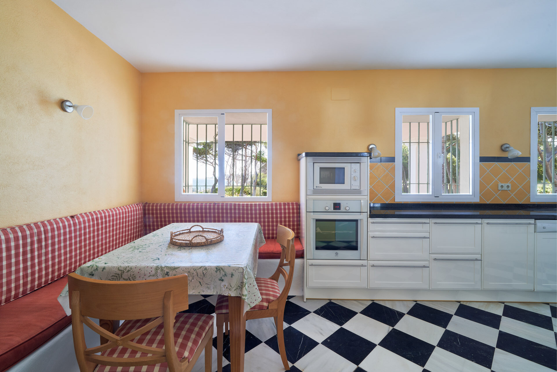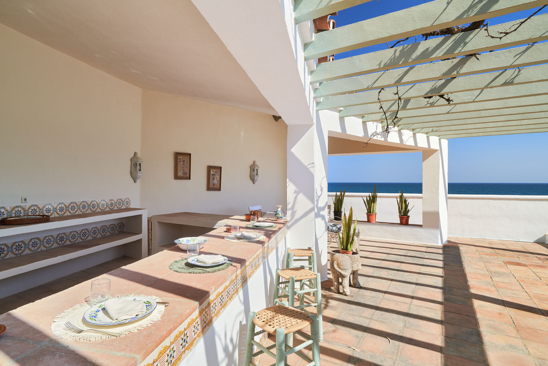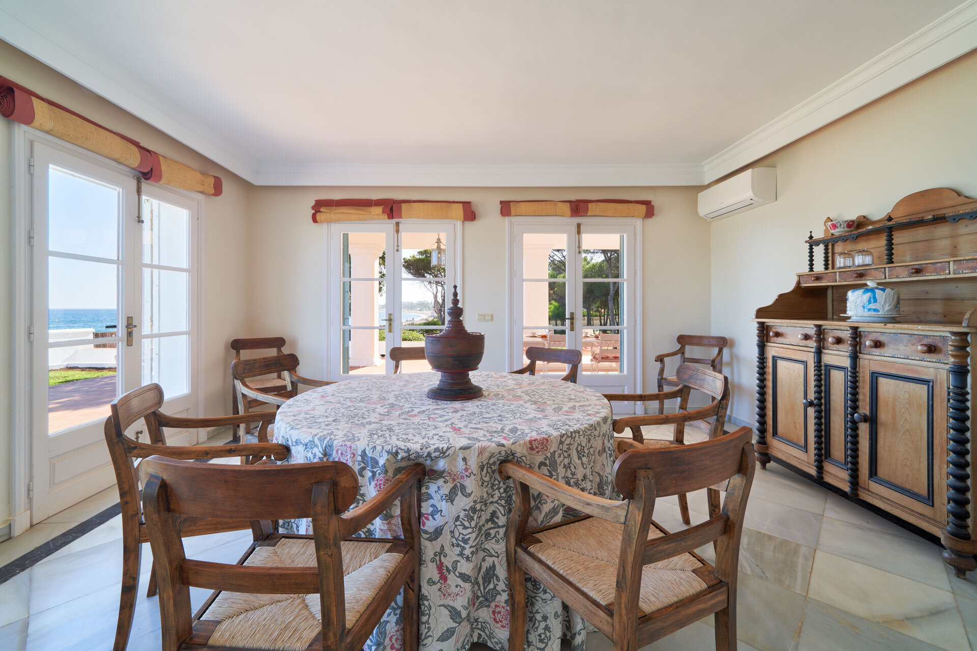 Set within more than fourteen thousand square metres of grounds, the outdoor spaces are a defining feature of the property. Lawns, orchards, vegetable gardens, and mature trees surround the hacienda, creating a sense of space and seclusion. A beachfront swimming pool overlooks the Mediterranean, while shaded terraces and patios provide multiple settings for dining, relaxing, and enjoying the sea air throughout the day.