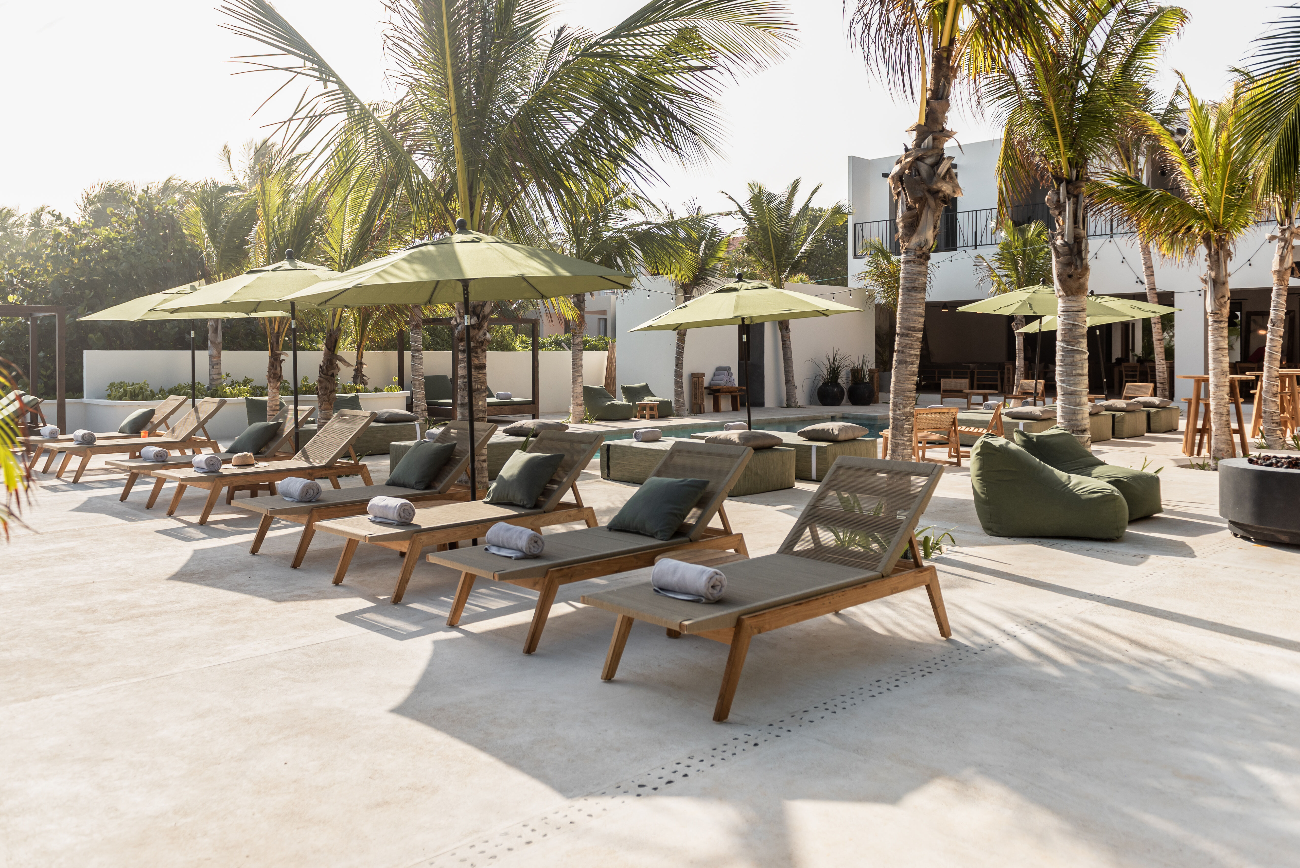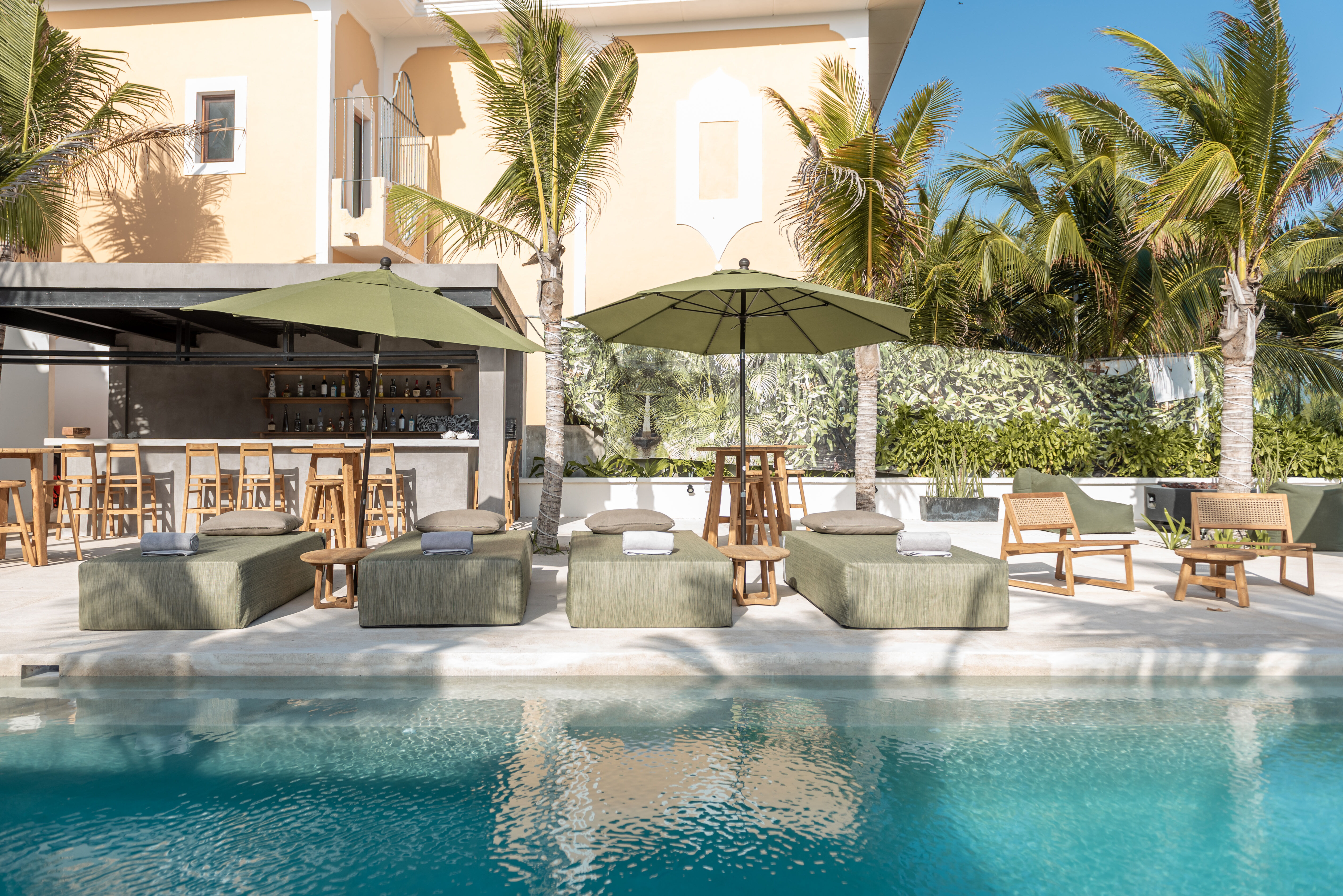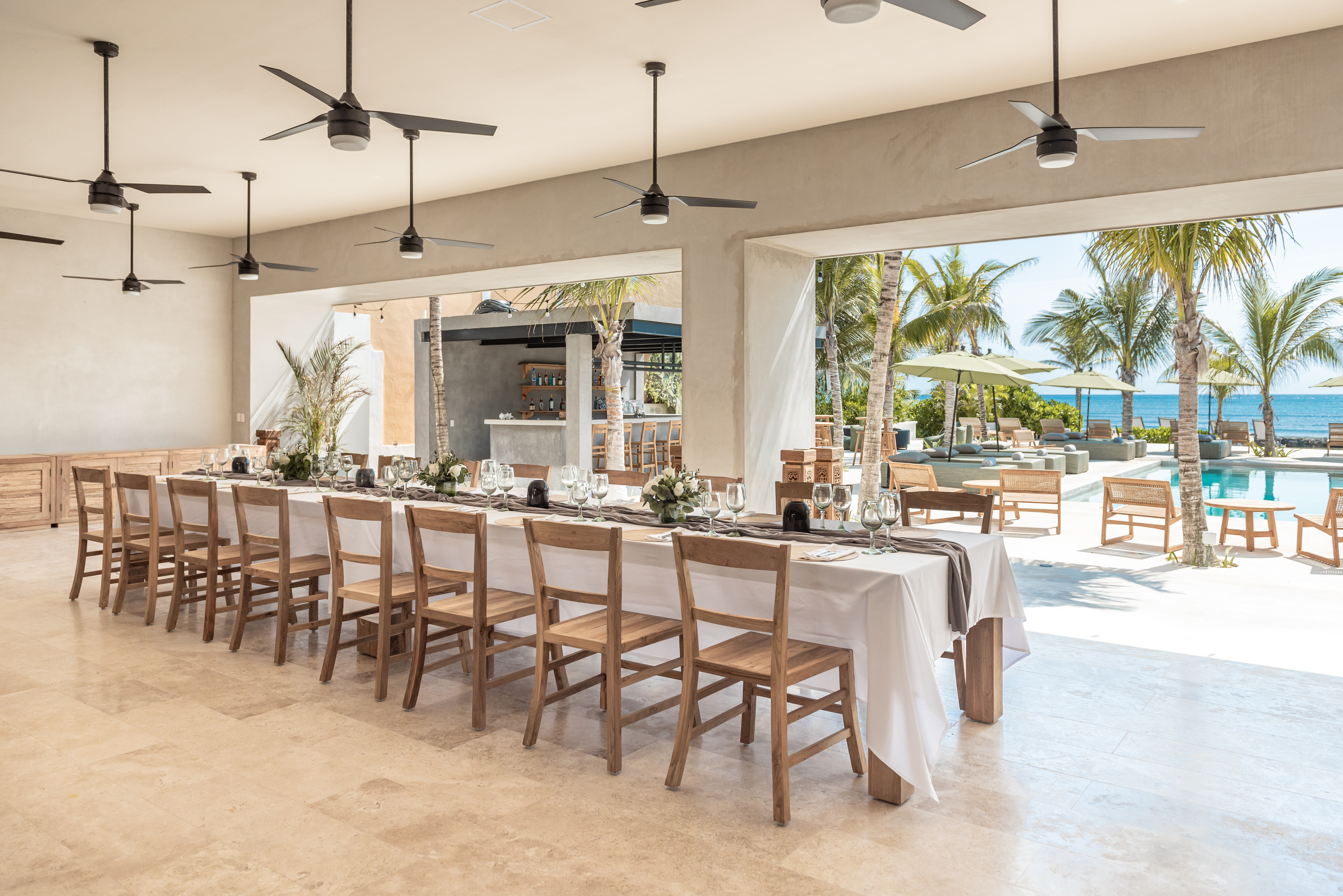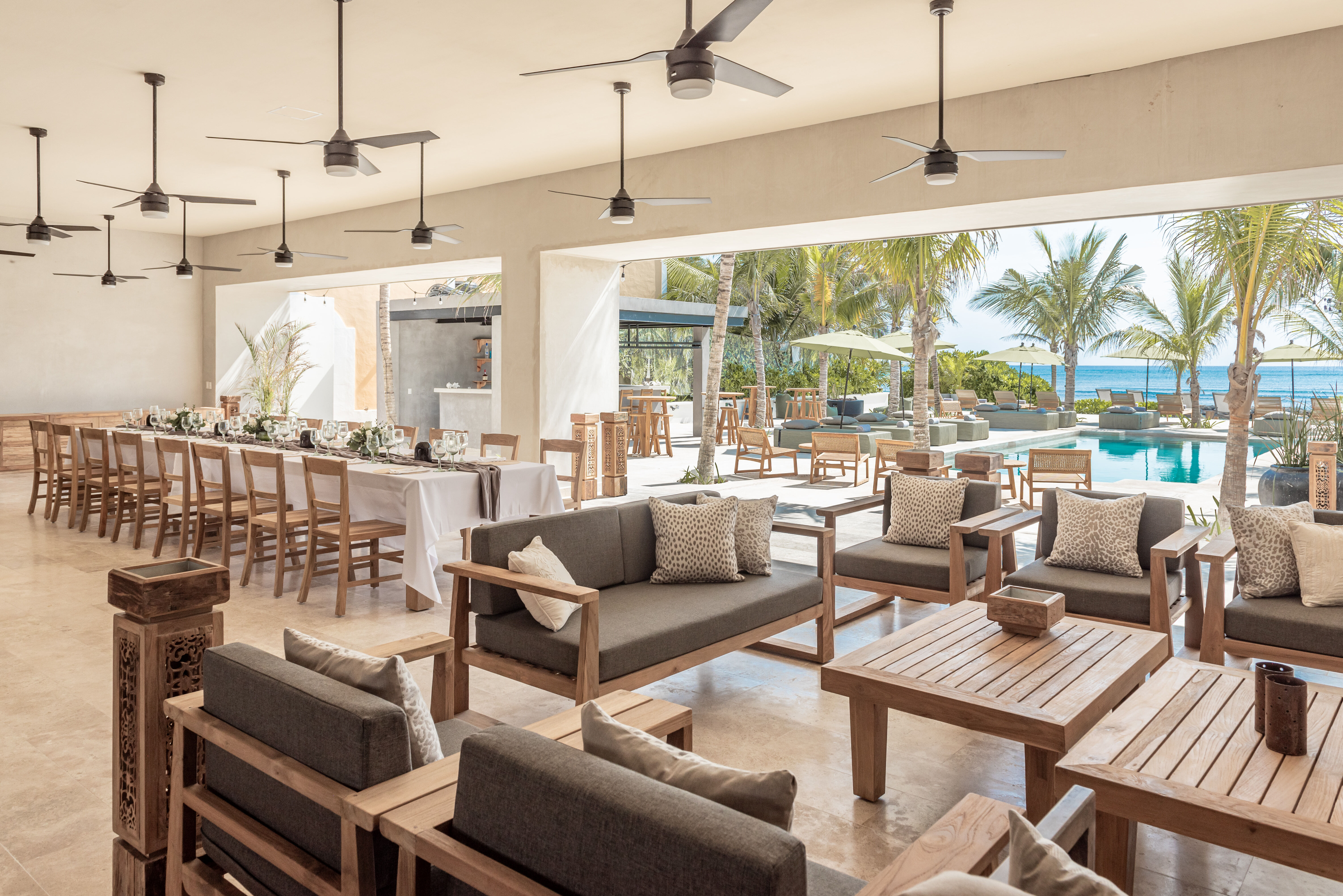 Outdoor living is a defining feature of Hacienda Jaguar. A large central swimming pool with ocean views anchors the property, surrounded by sun loungers, shaded terraces, and social spaces. The beachfront setting allows guests to step directly onto the sand, while outdoor bars, dining areas, and landscaped courtyards provide multiple environments for relaxation and celebration.