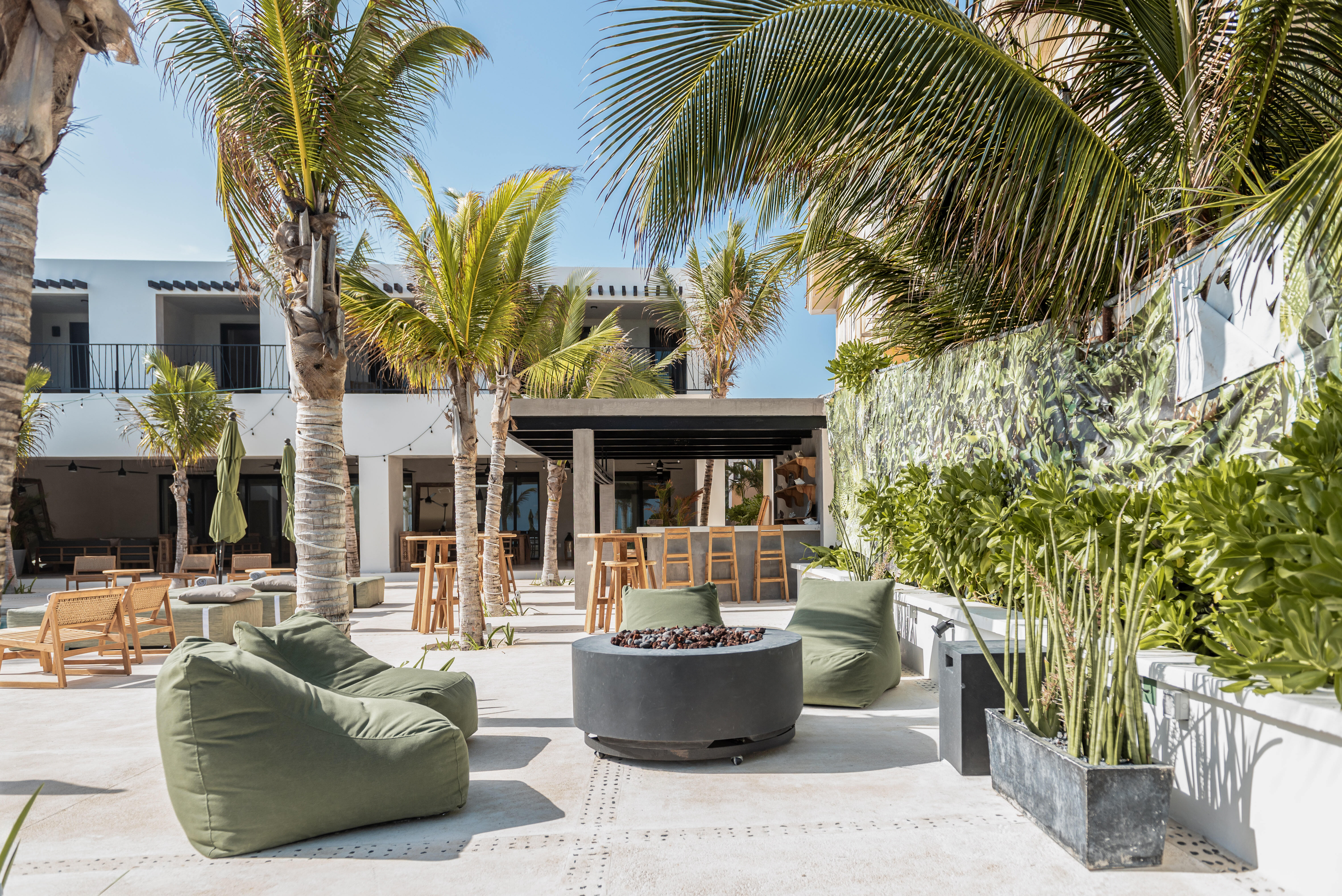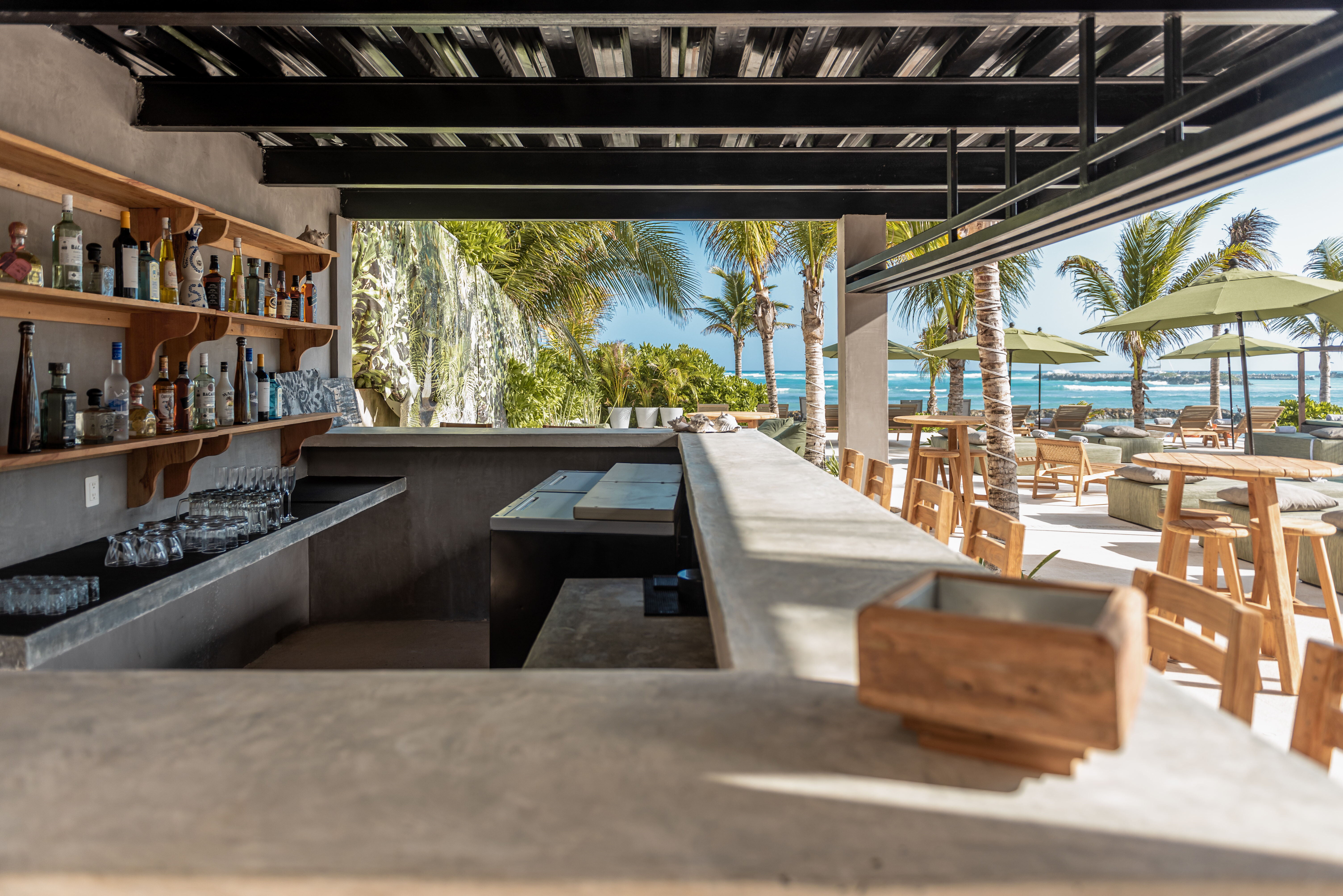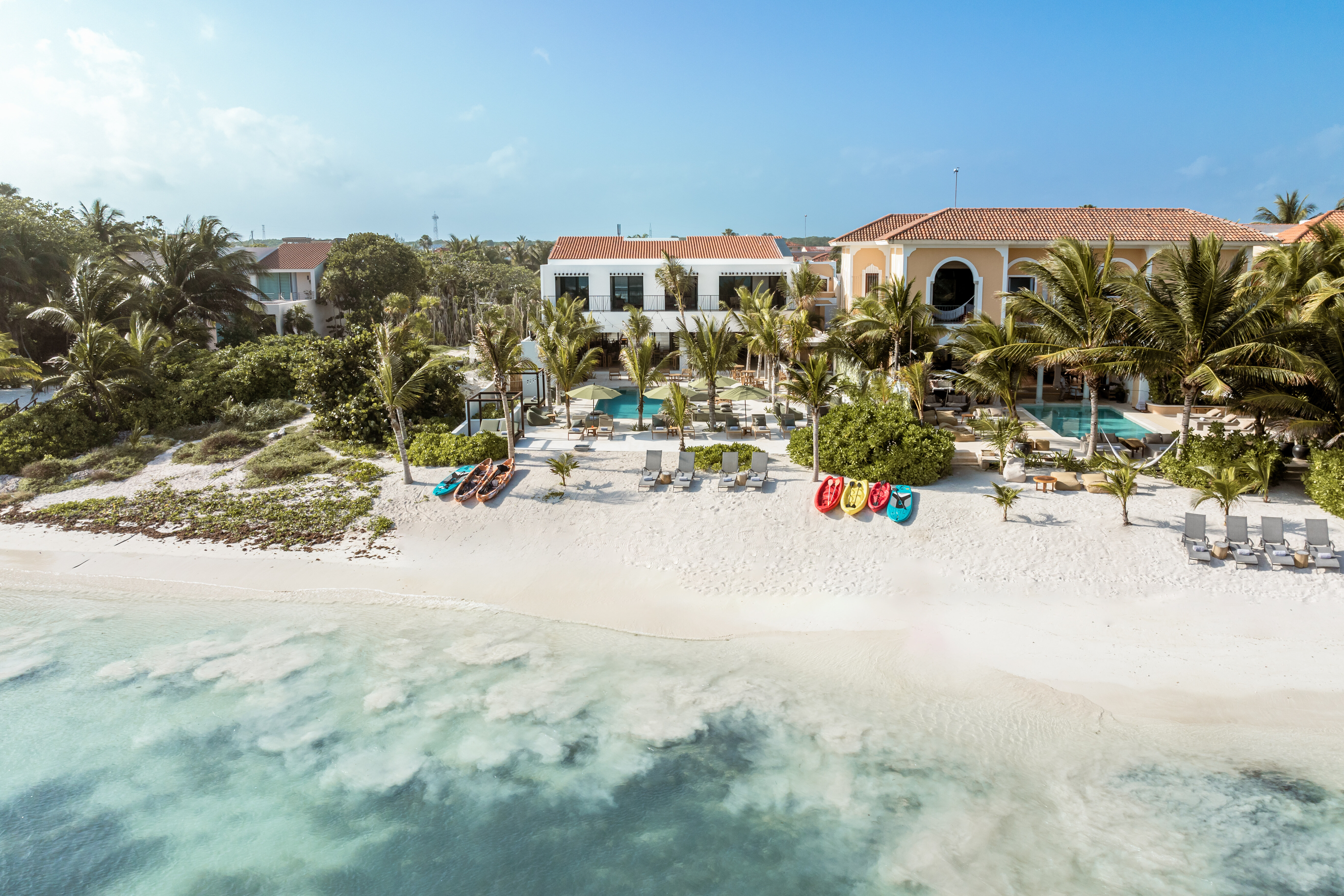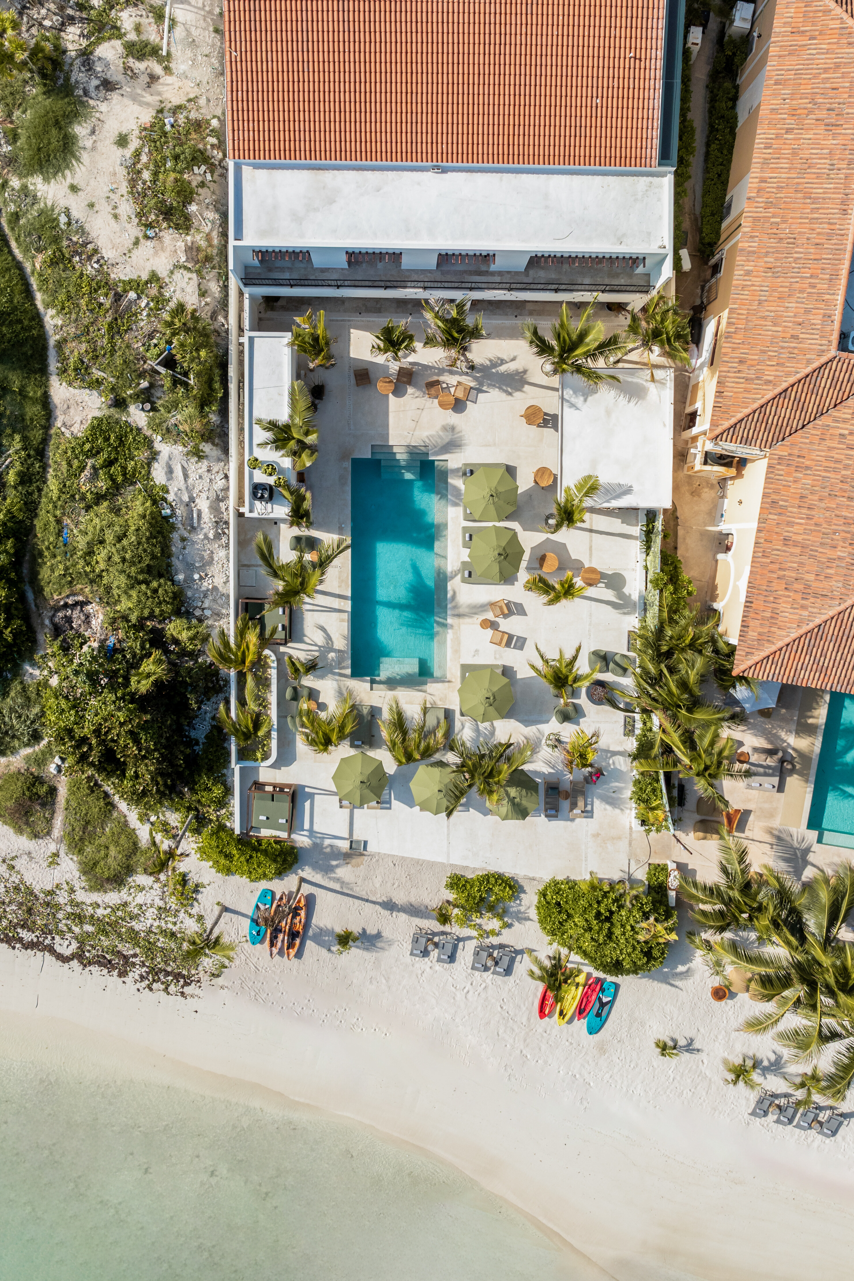 Outdoor living is a defining feature of Hacienda Jaguar. A large central swimming pool with ocean views anchors the property, surrounded by sun loungers, shaded terraces, and social spaces. The beachfront setting allows guests to step directly onto the sand, while outdoor bars, dining areas, and landscaped courtyards provide multiple environments for relaxation and celebration.