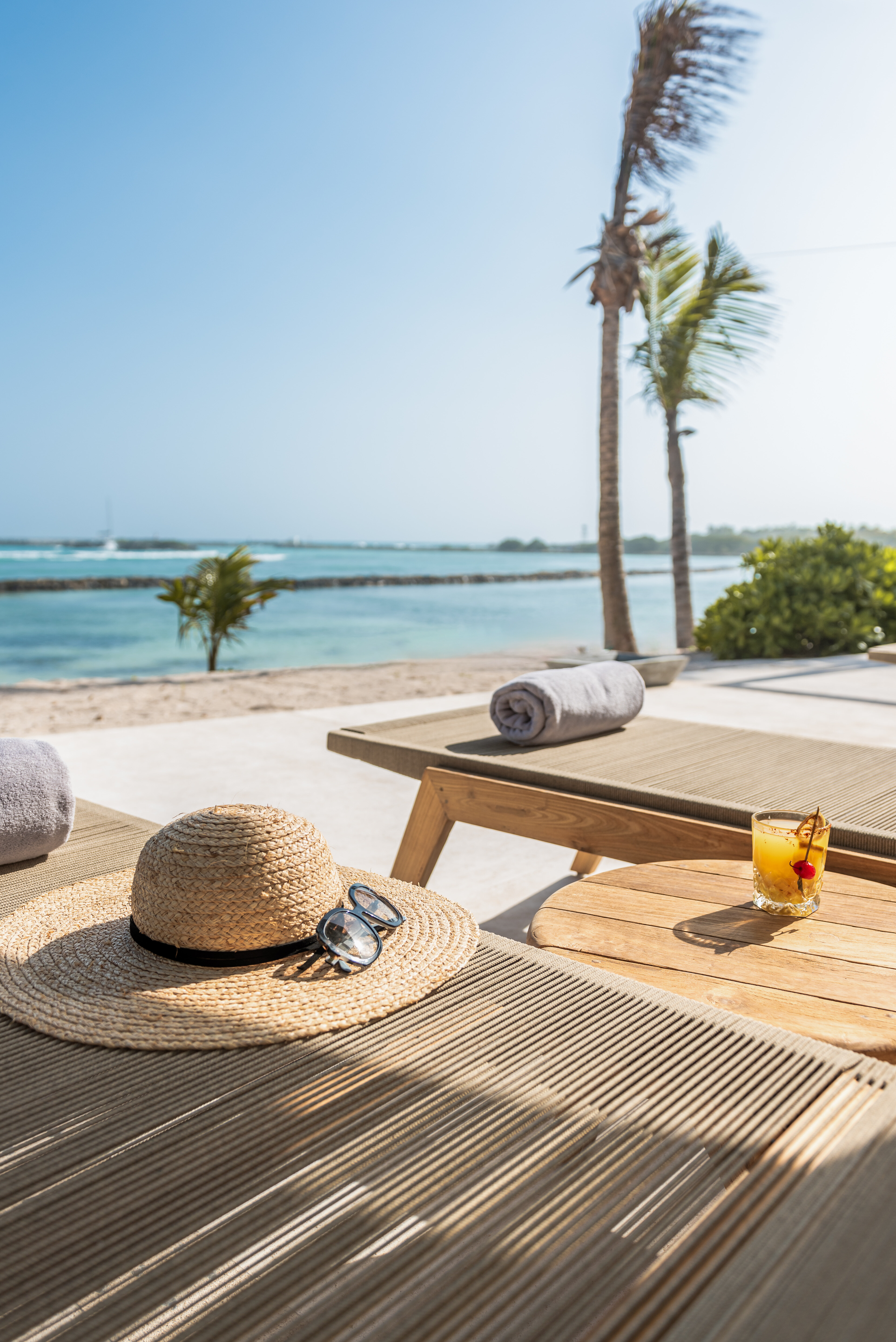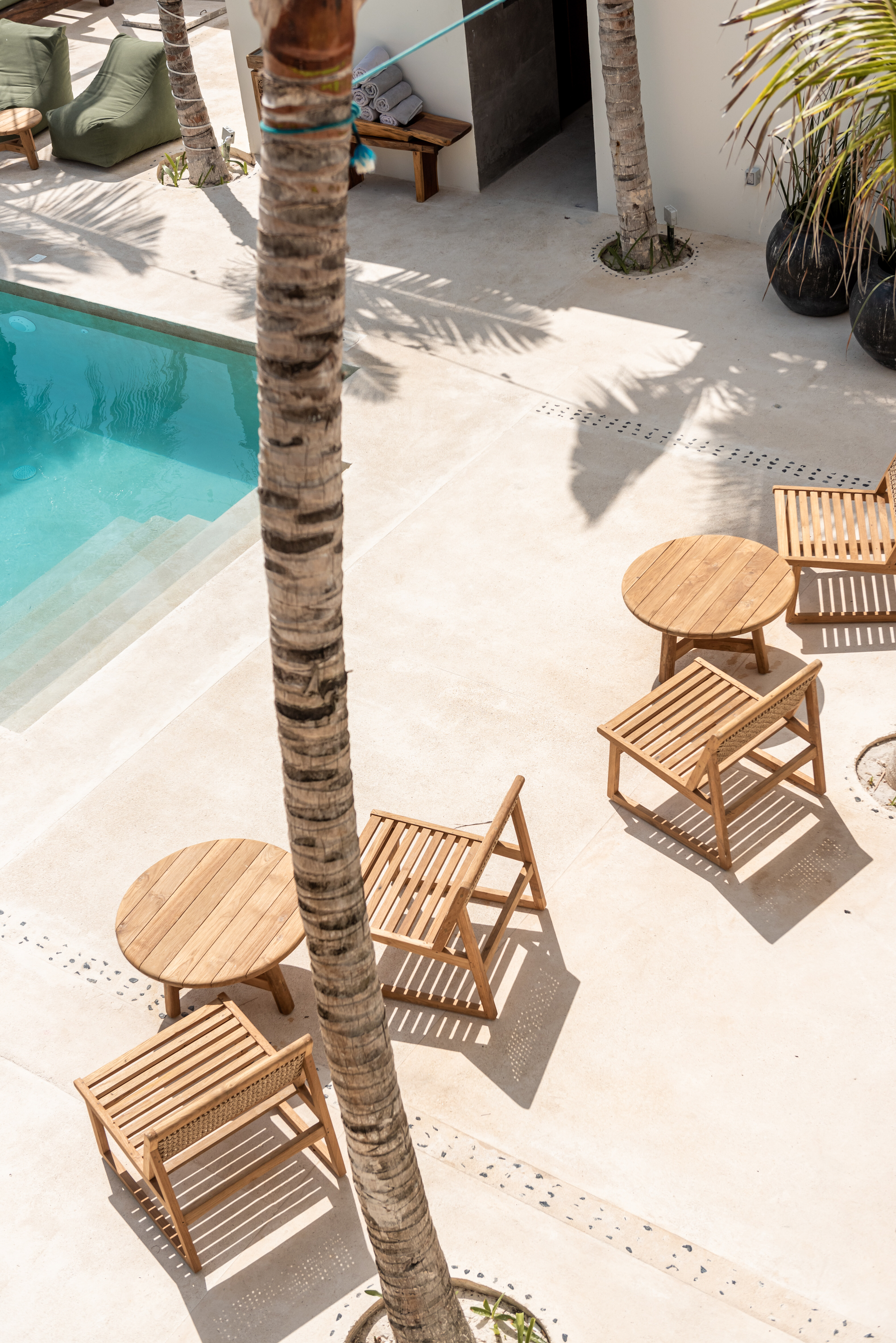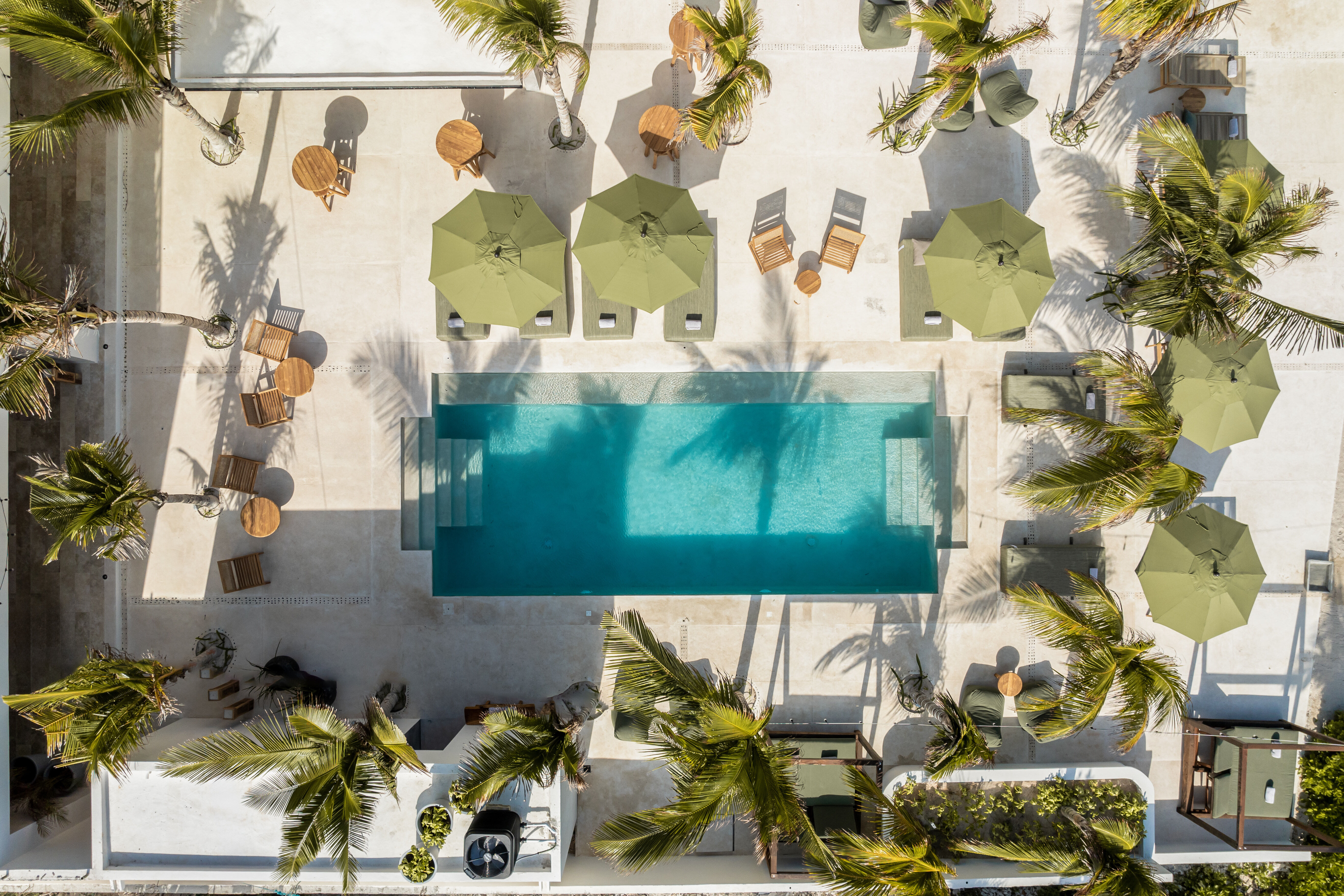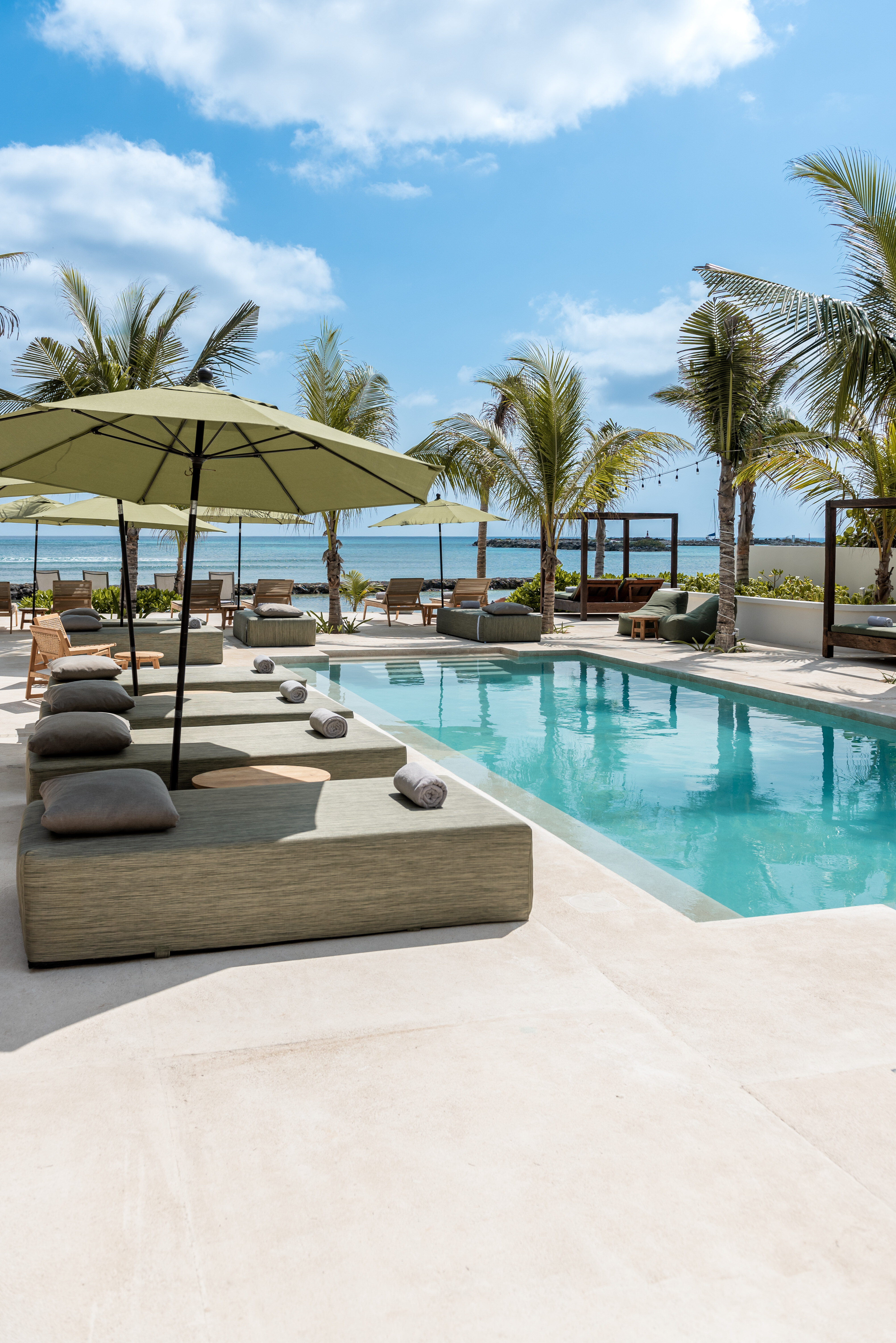Outdoor living is a defining feature of Hacienda Jaguar. A large central swimming pool with ocean views anchors the property, surrounded by sun loungers, shaded terraces, and social spaces. The beachfront setting allows guests to step directly onto the sand, while outdoor bars, dining areas, and landscaped courtyards provide multiple environments for relaxation and celebration.