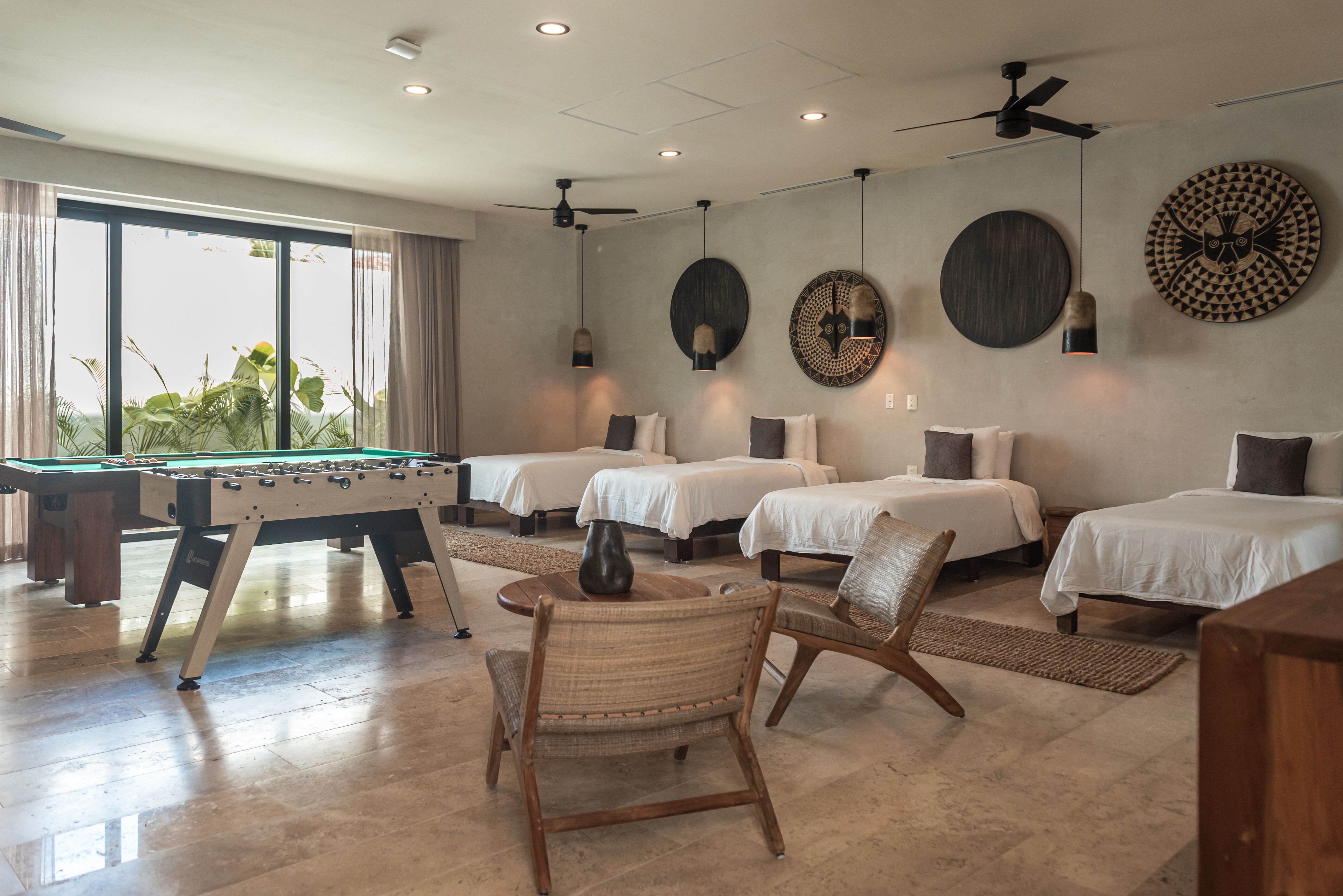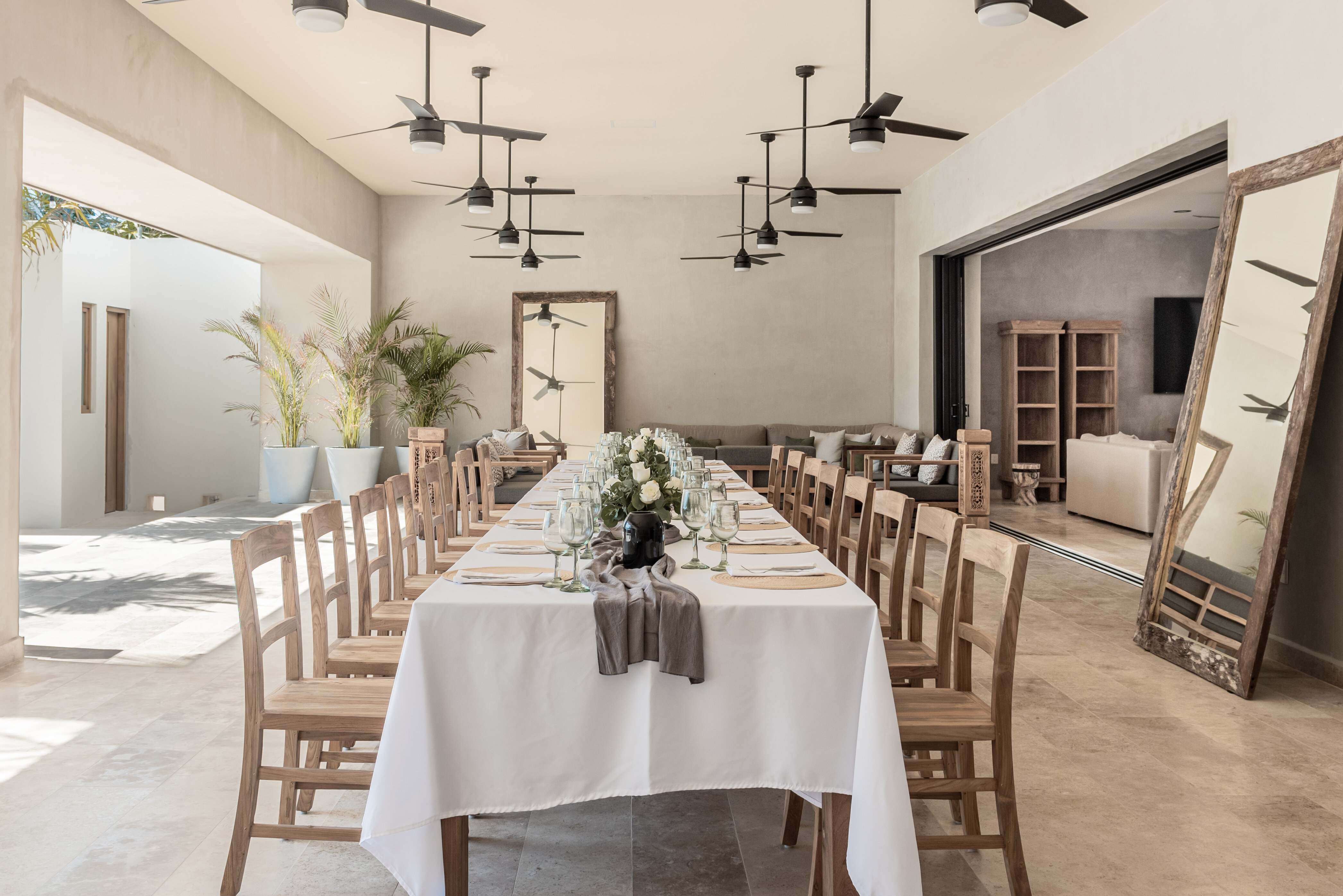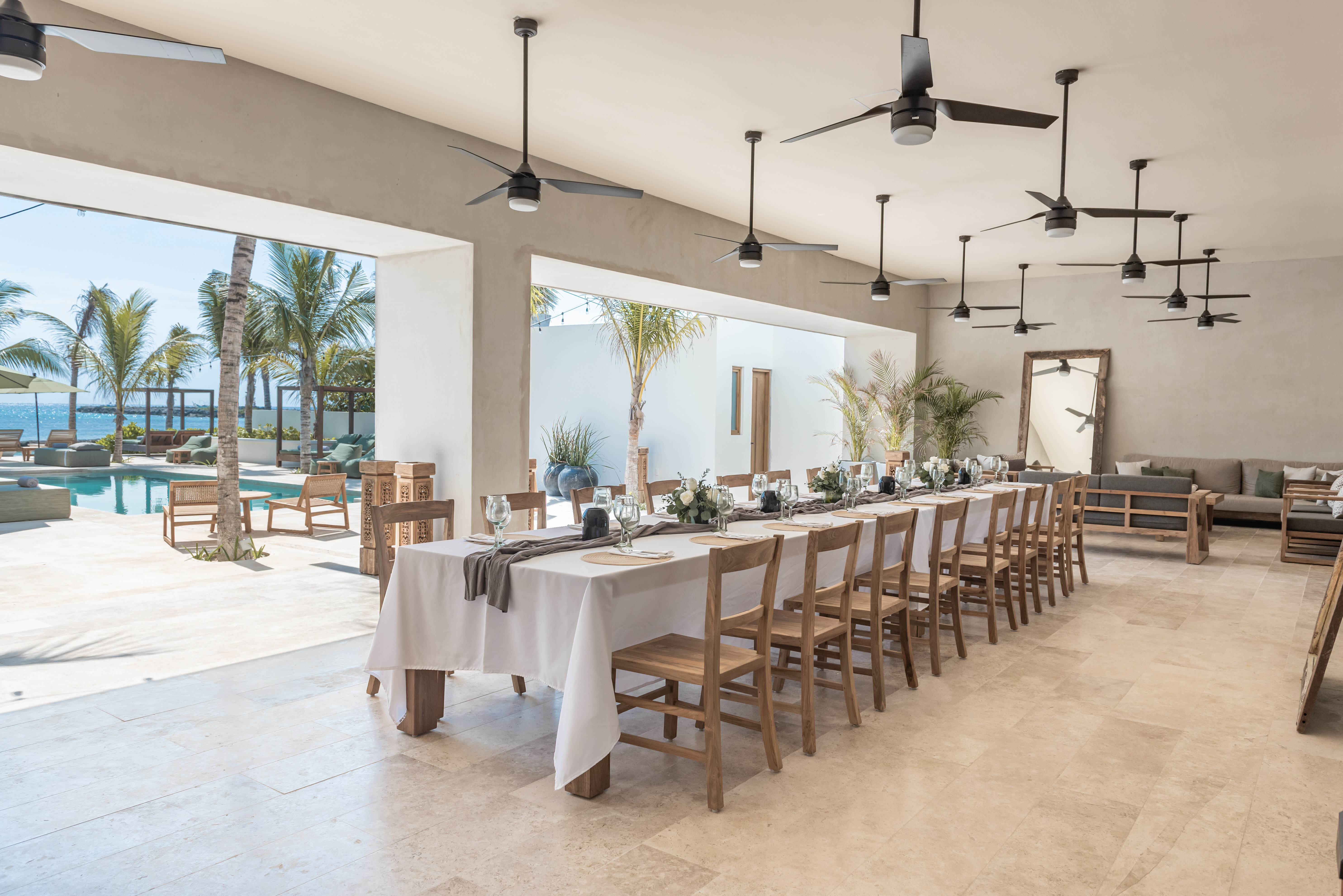 Hacienda Jaguar is designed around generous, open plan living that encourages connection while remaining effortlessly refined. Indoor lounges flow seamlessly into shaded terraces and poolside spaces, allowing guests to move naturally between interior comfort and oceanfront living. The layout is ideal for large groups, offering ample room for gathering, dining, and relaxing without feeling crowded.