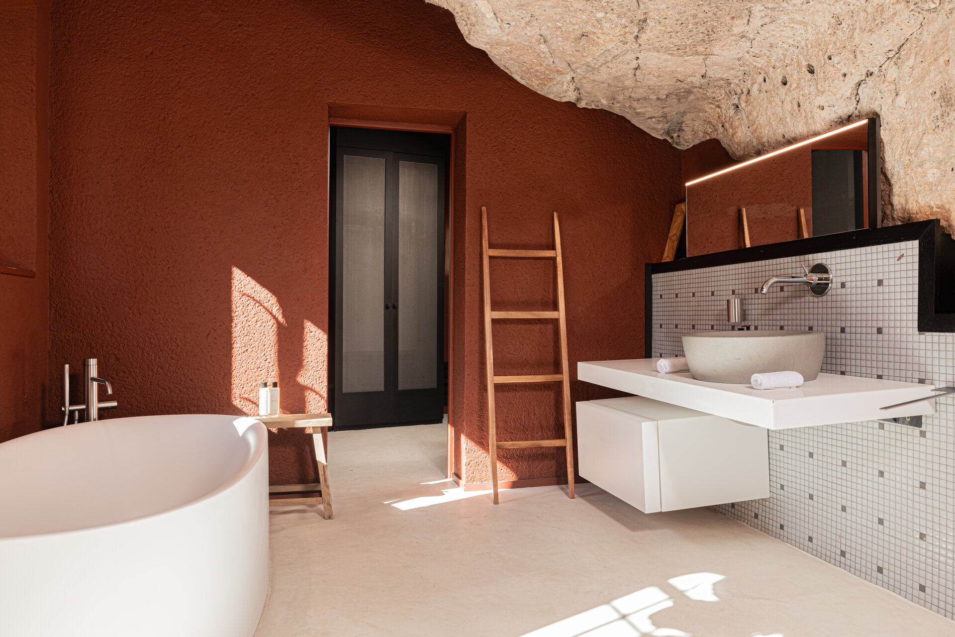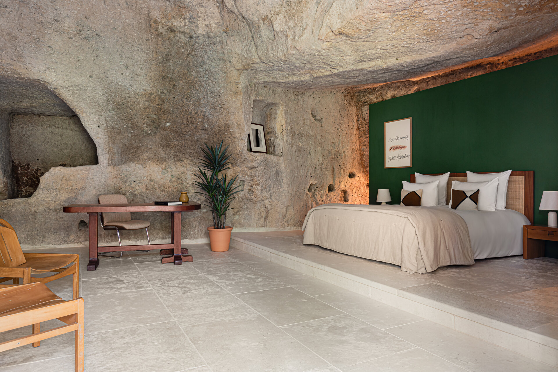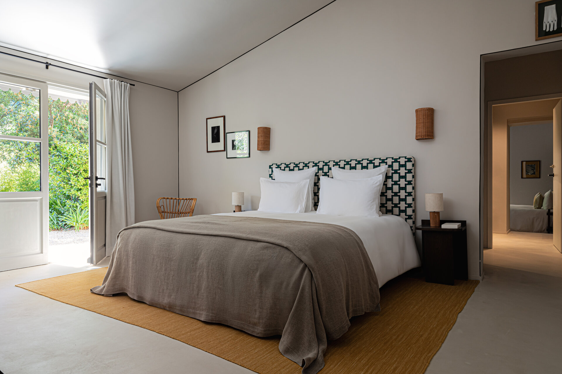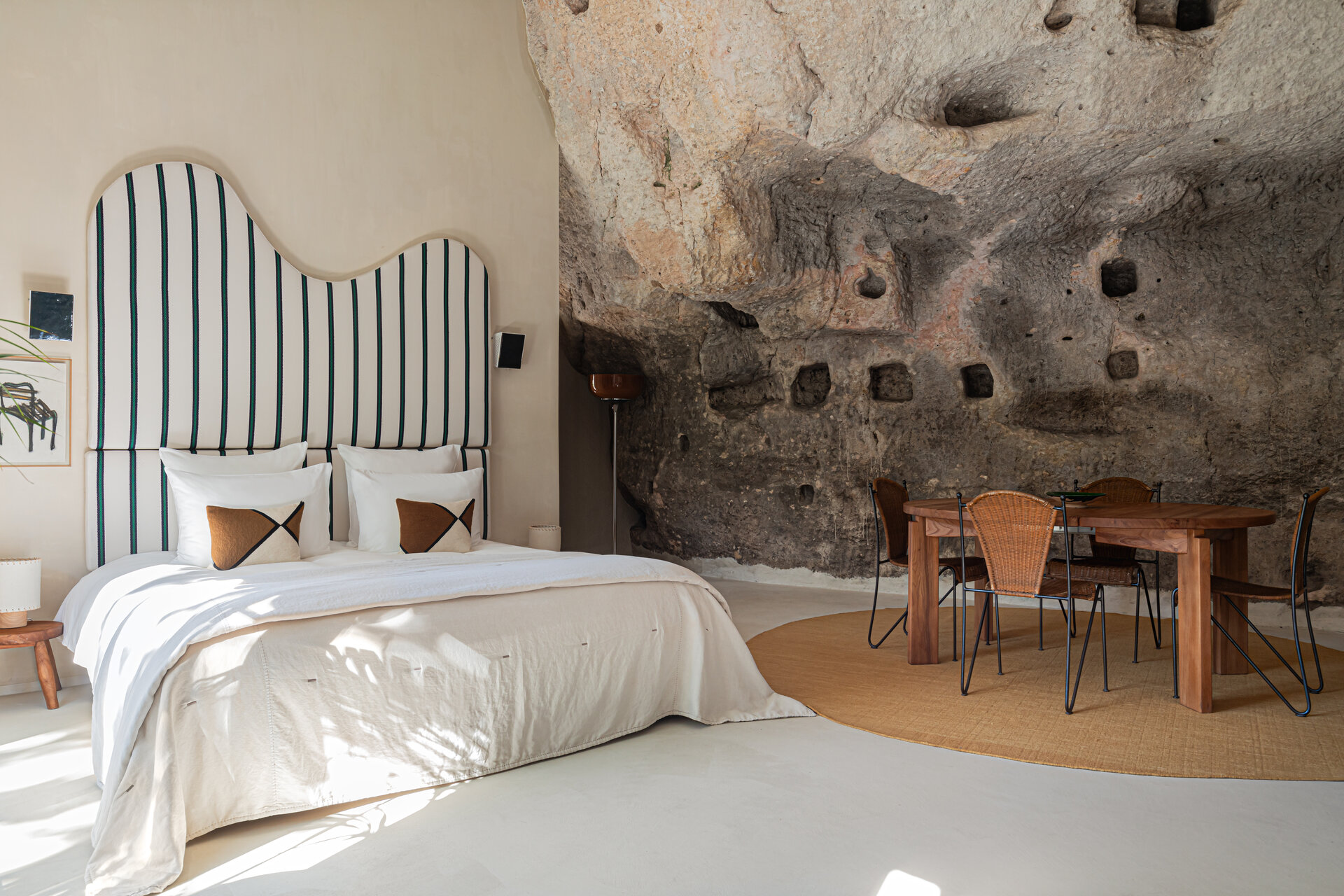 At over 650 square metres, the Mas offers generous interiors balanced by intimate corners and thoughtful details. Eight beautifully appointed ensuite bedrooms sleep up to fifteen guests, including atmospheric troglodyte rooms carved directly into the rock. Each space feels calm and grounding, shaped by stone, light, and views across the village and surrounding countryside.