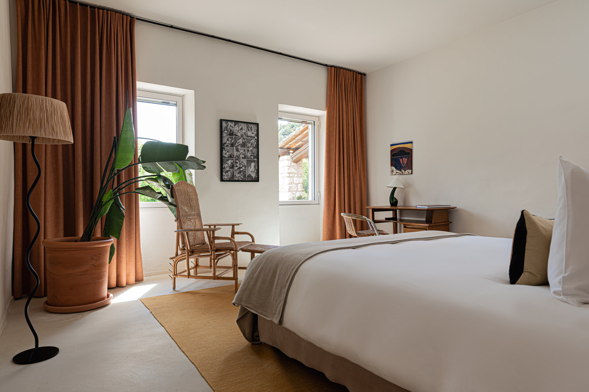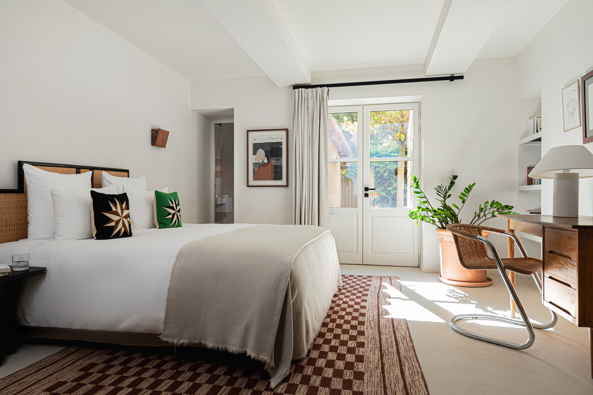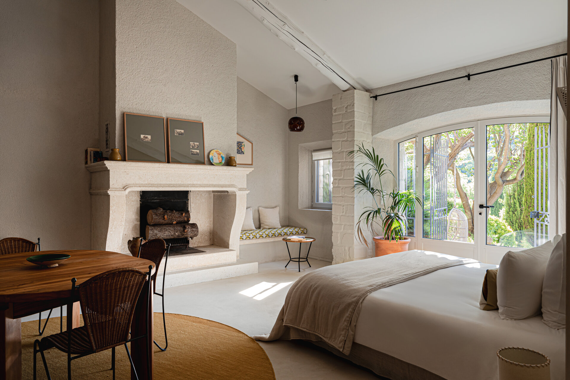 Eight ensuite bedrooms accommodate up to fifteen guests, each offering privacy, comfort, and a strong sense of place. Several rooms are troglodyte, carved directly into the limestone rock, providing a naturally cool and deeply restful environment. Room sizes vary generously, some opening onto terraces or gardens with village or countryside views. Daily housekeeping ensures the bedrooms remain calm, ordered, and inviting throughout your stay, with laundry services available on request.