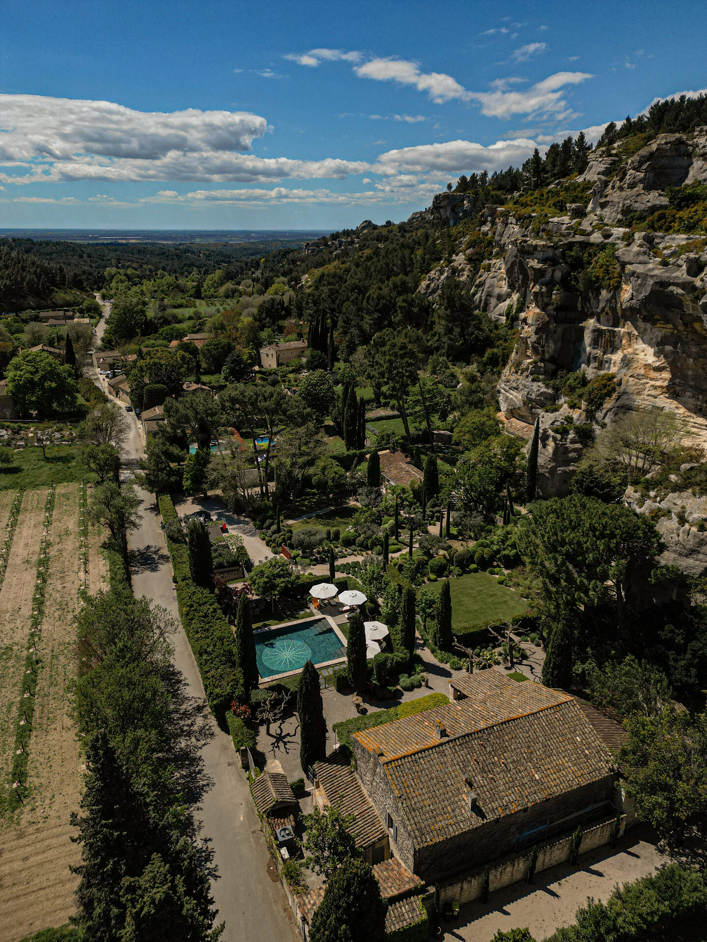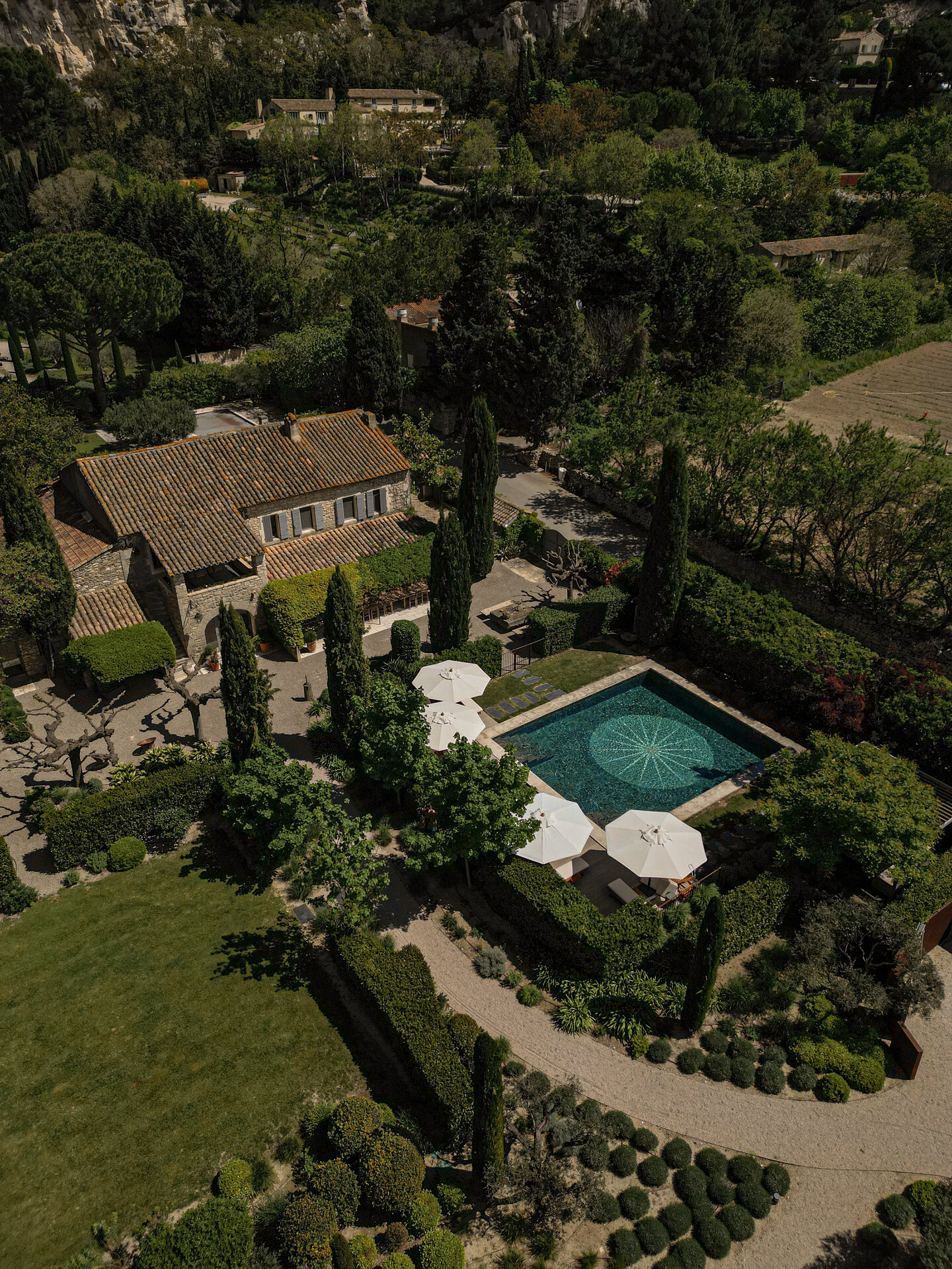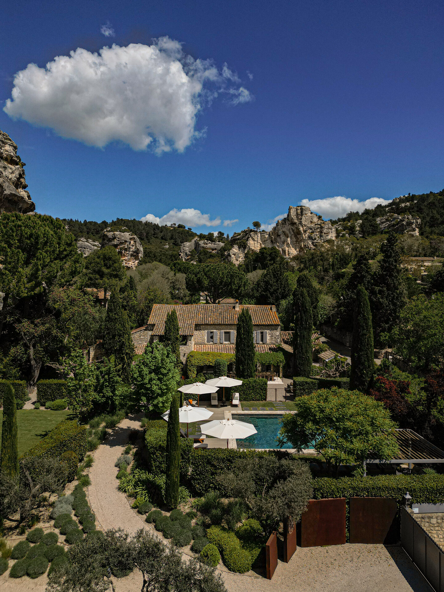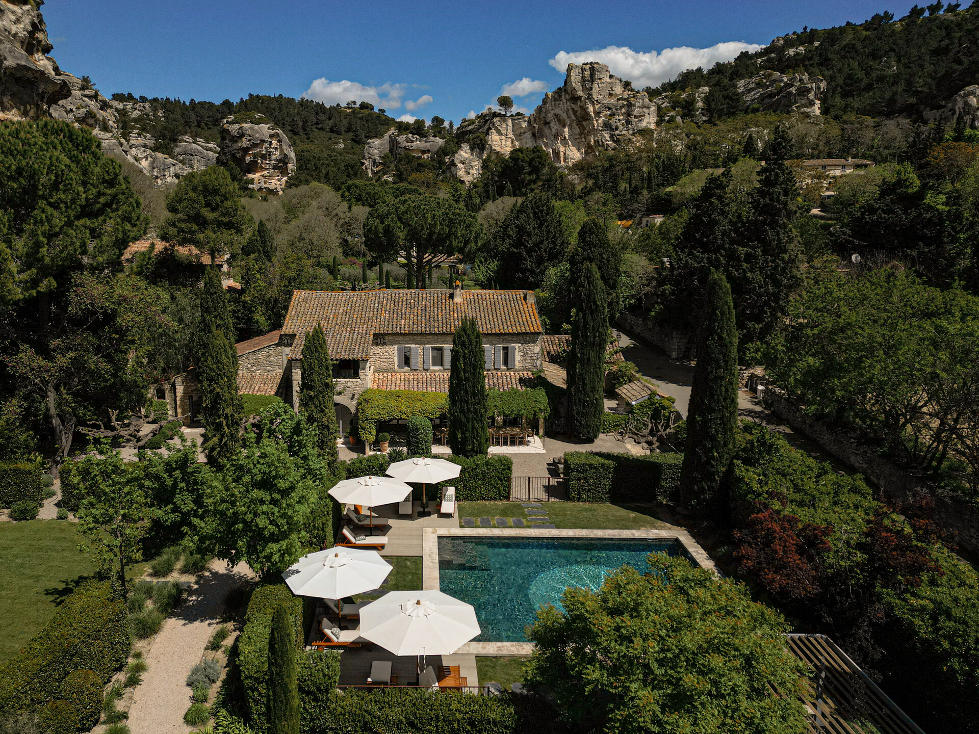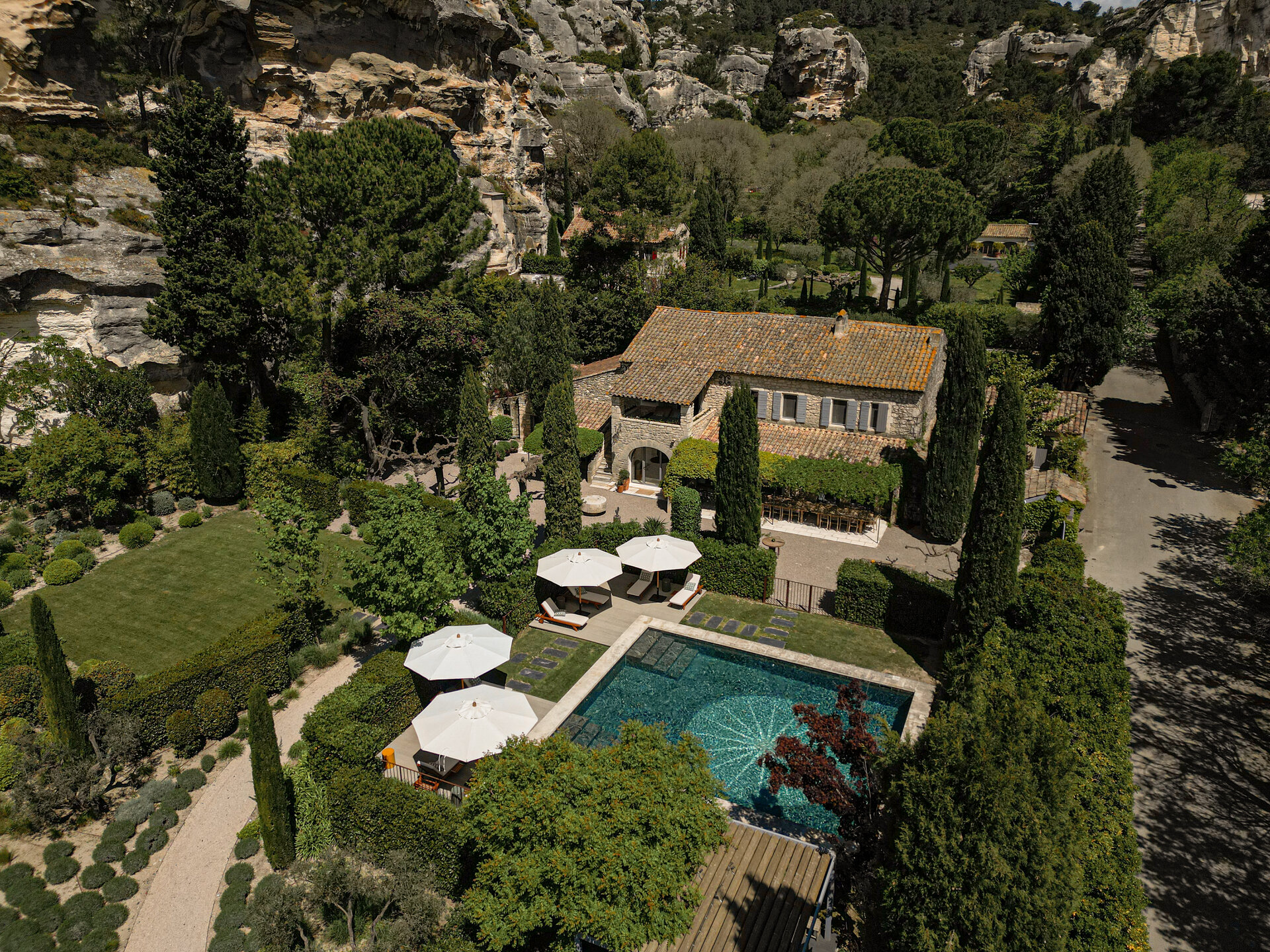 Set within the Alpilles Regional Natural Park, L’Étoile des Baux enjoys a privileged position just outside the historic village of Les Baux de Provence. The surrounding landscape is defined by limestone cliffs, olive groves, and open countryside, offering both privacy and easy access to local life. Avignon TGV is approximately thirty five minutes away, with Marseille and Aix en Provence reachable in around an hour by car. A mini electric car is available at the property for local journeys, while transfers and drivers can be arranged by the concierge.