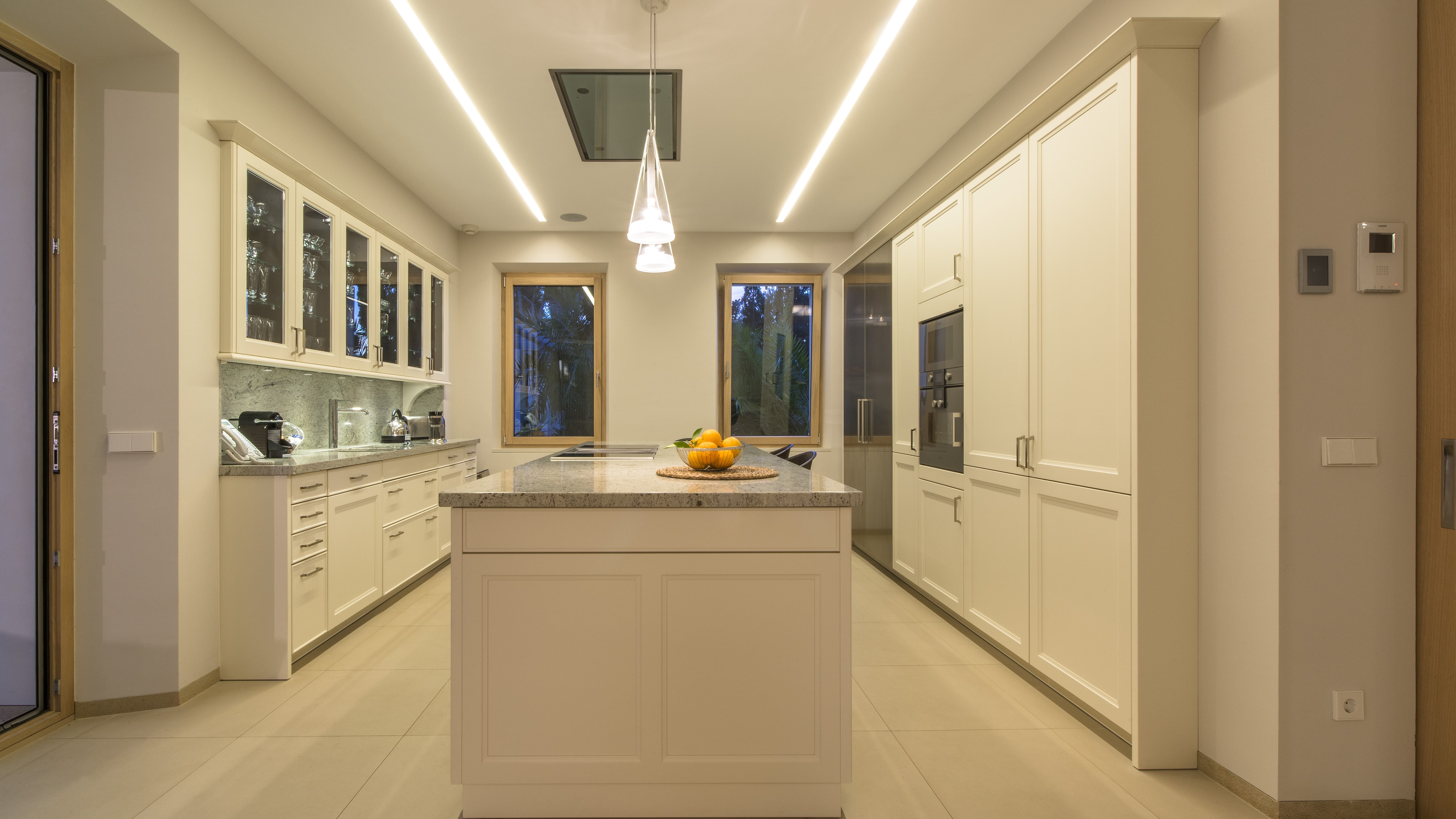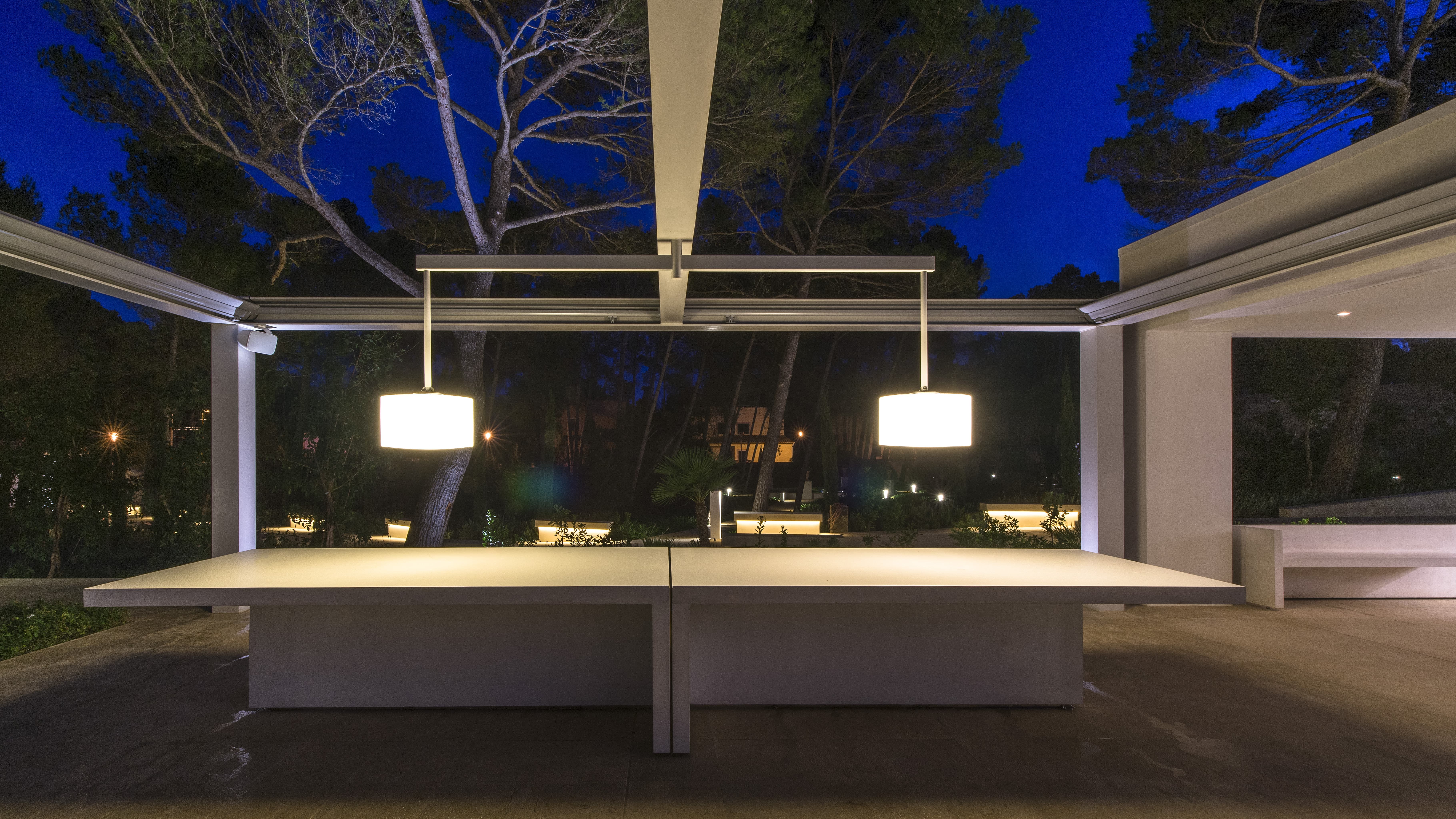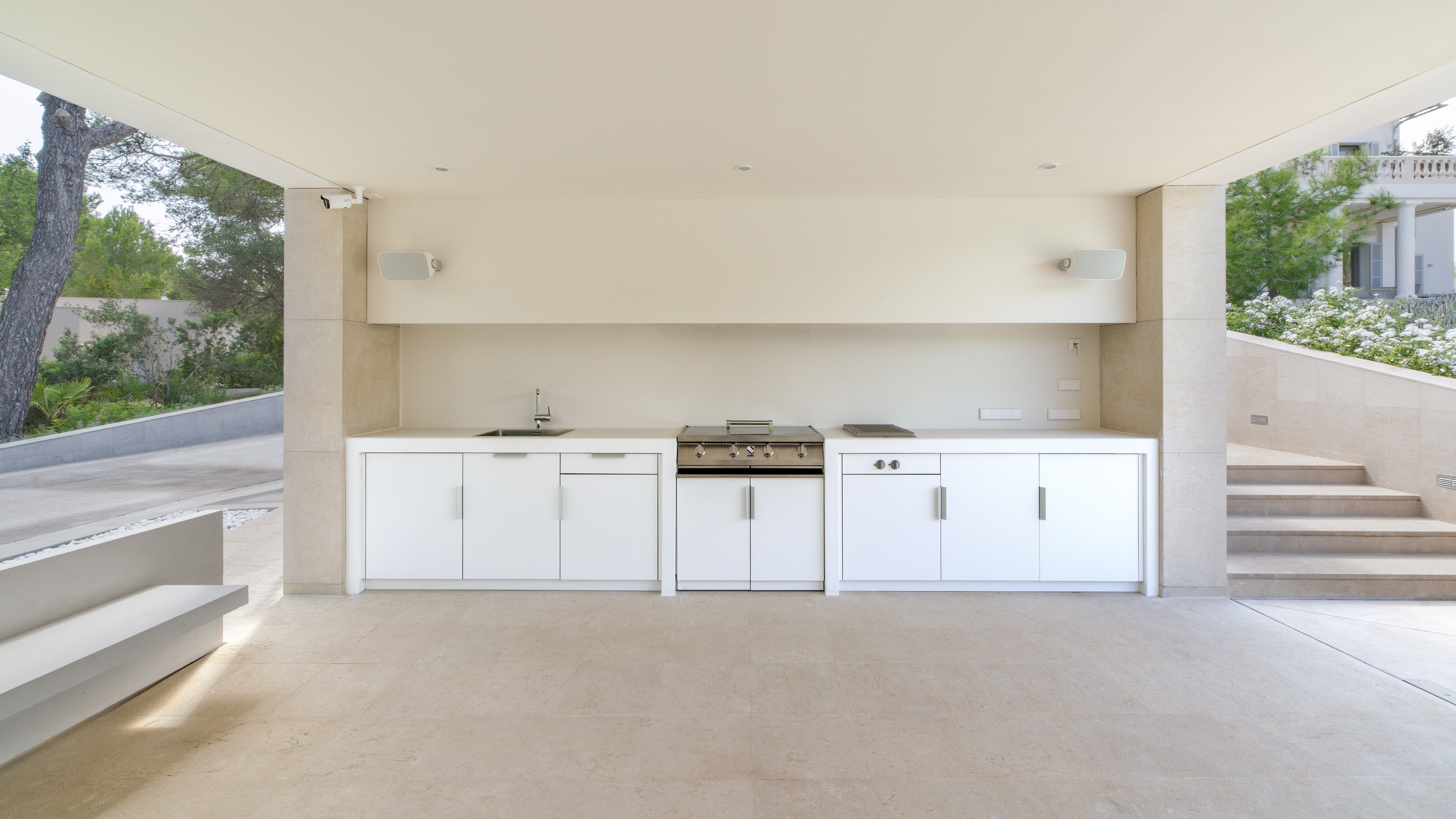A fully equipped designer kitchen forms the heart of the home, flowing into a spacious dining area suited to shared meals and larger gatherings. Outdoors, a generous dining setting for up to 20 guests allows long, unhurried evenings beneath the open sky.