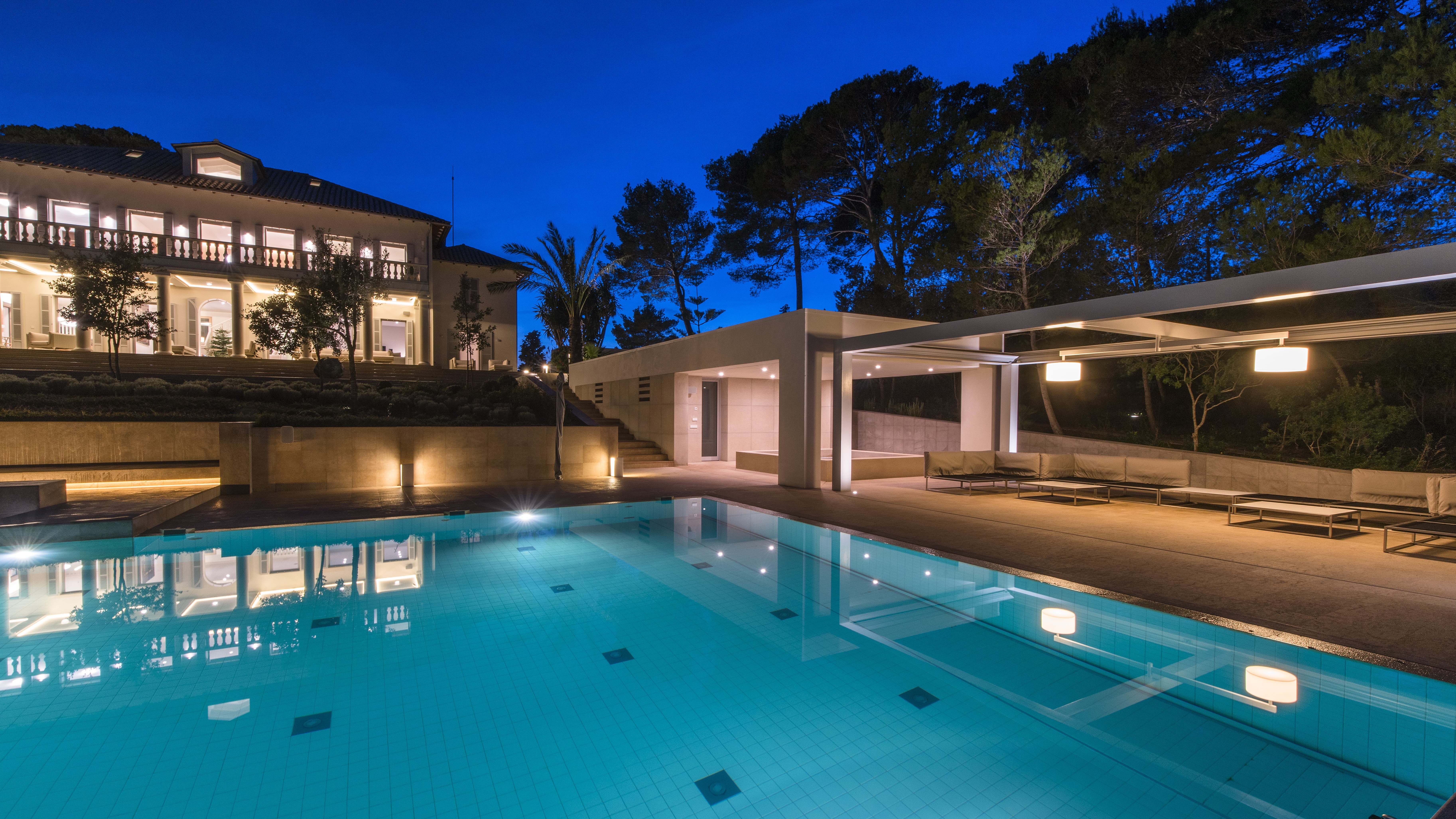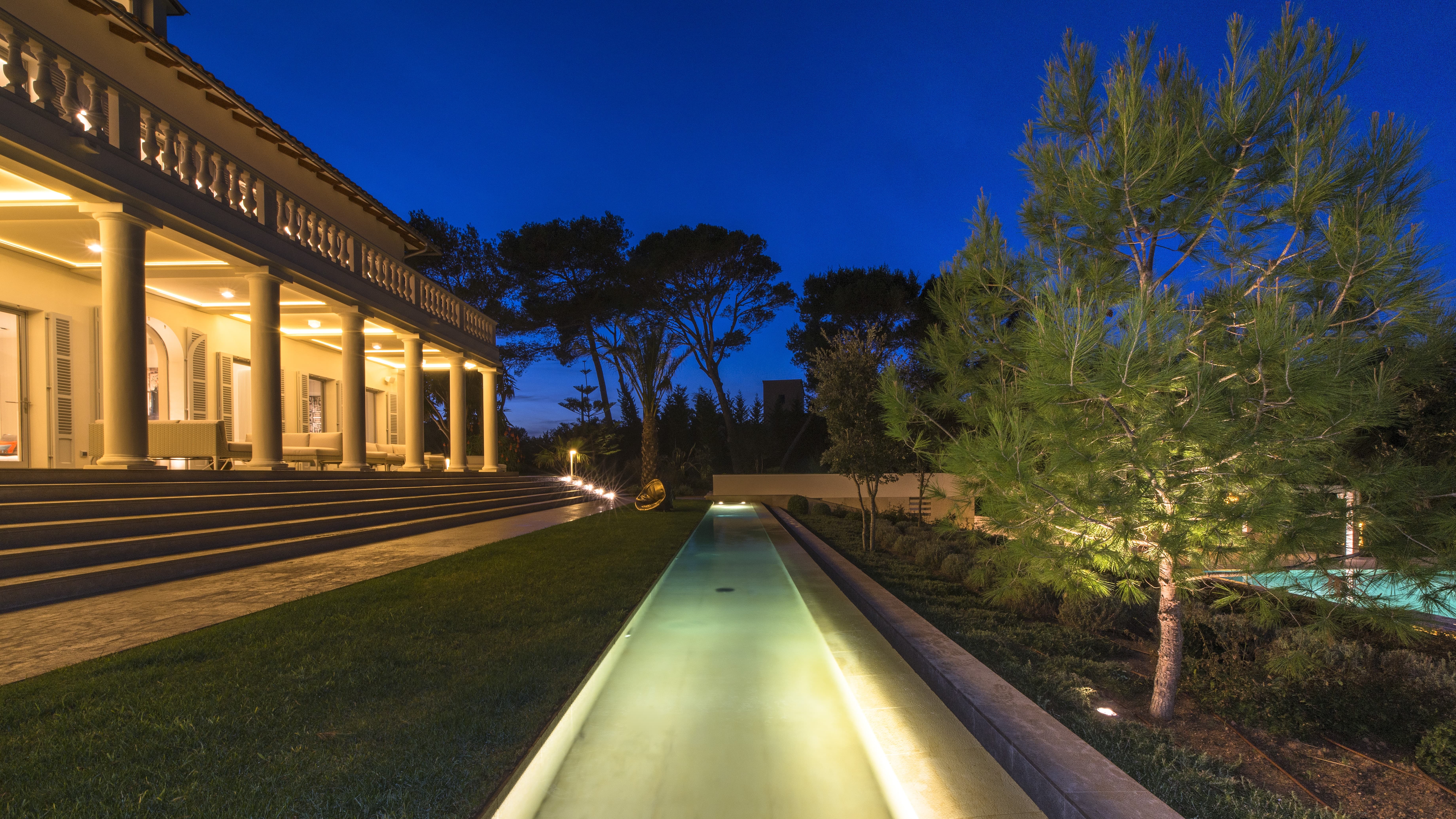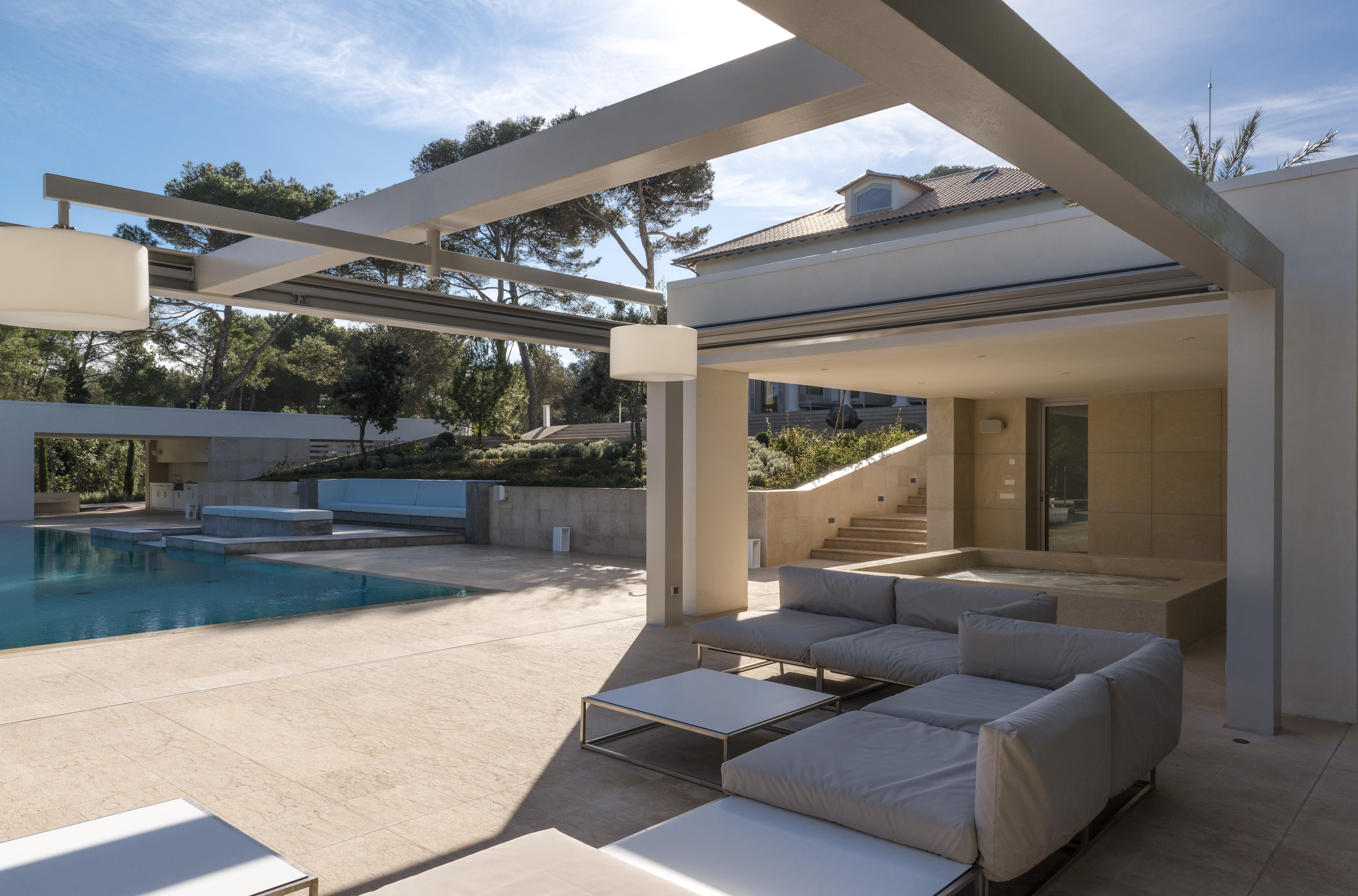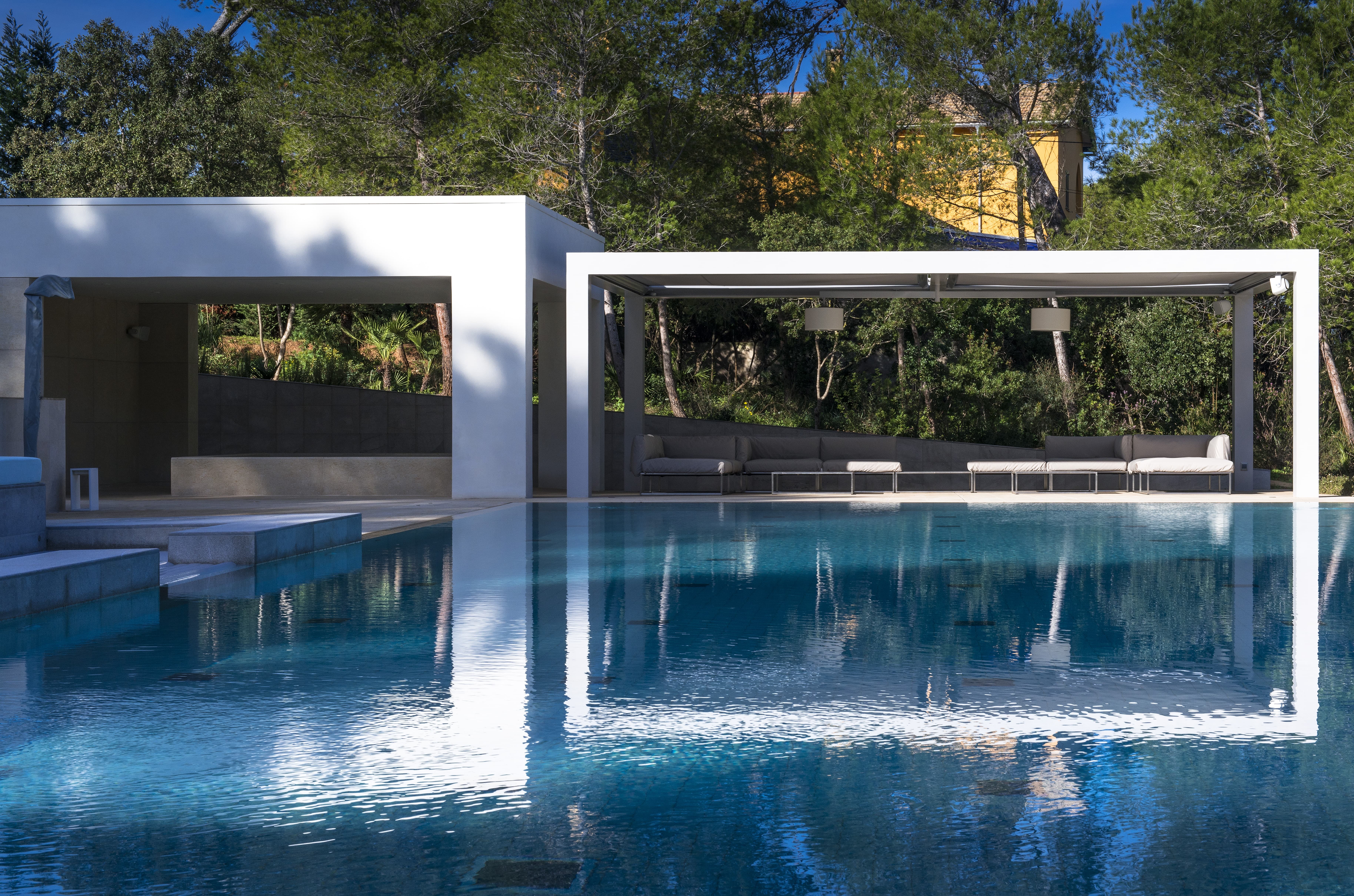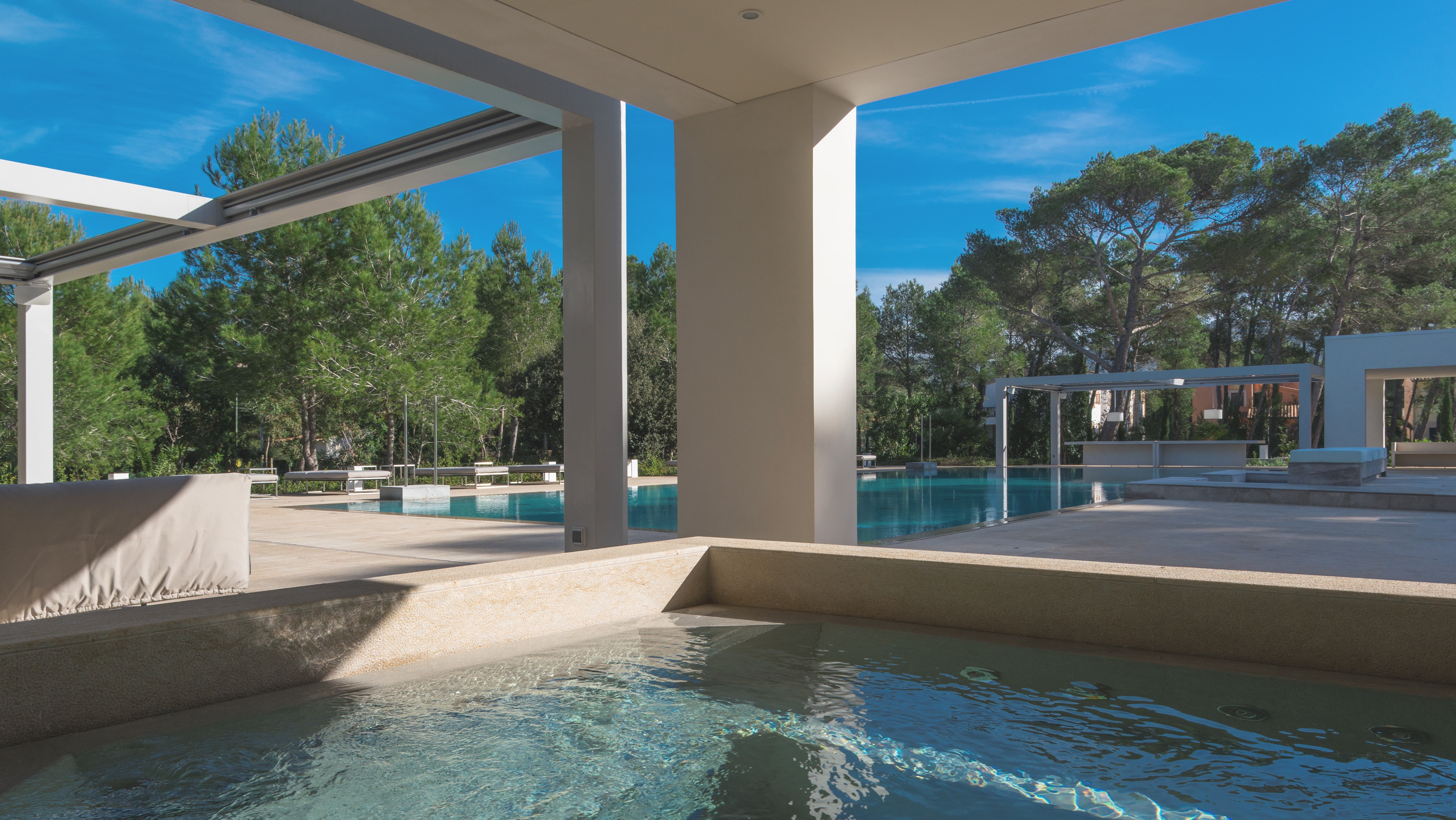 Extensive landscaped grounds open into a series of terraces and garden spaces designed for both activity and stillness. A heated saltwater pool sits at the centre, complemented by a jacuzzi, optional sauna, and areas for relaxation, dining, and gathering in a true resort-style setting.