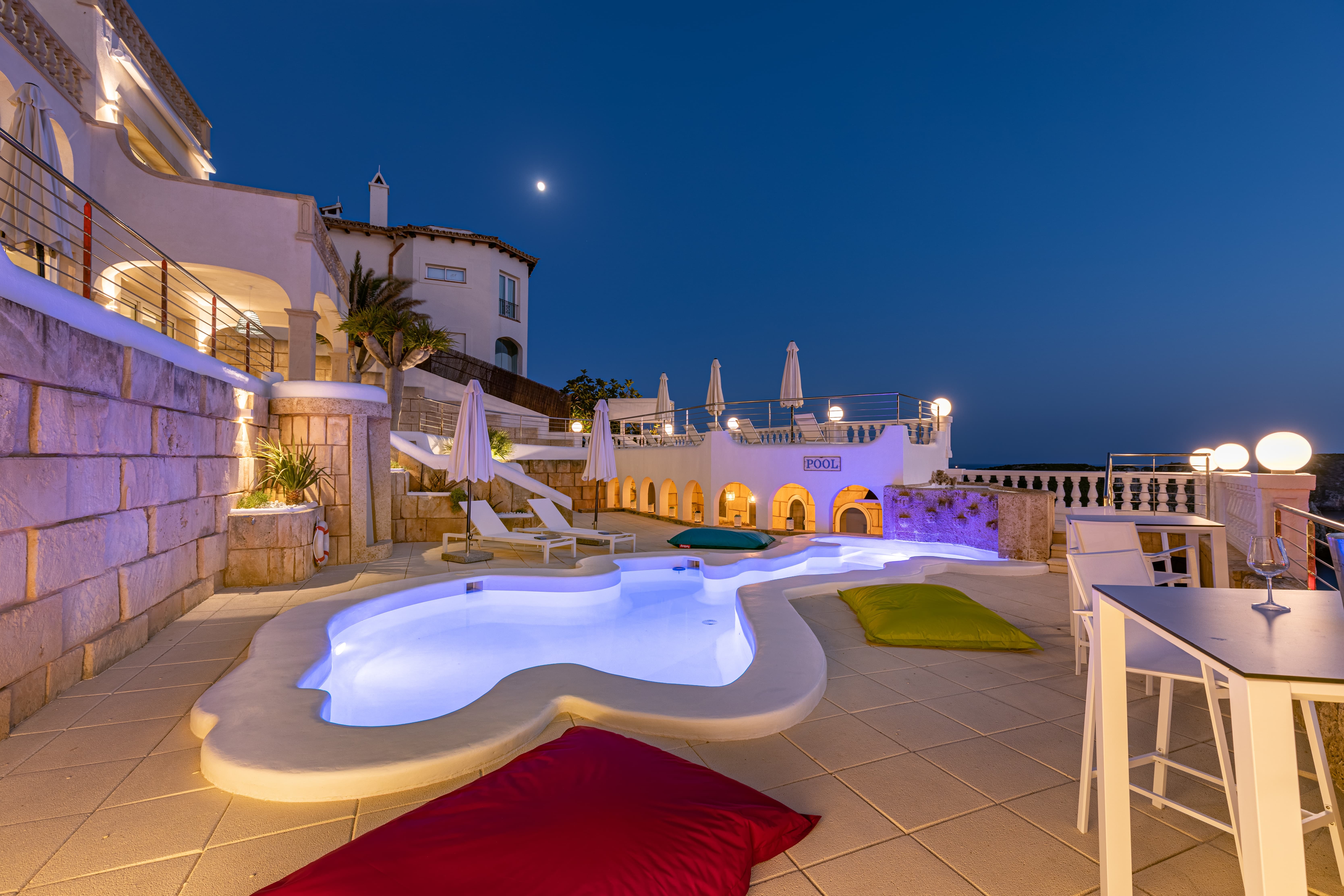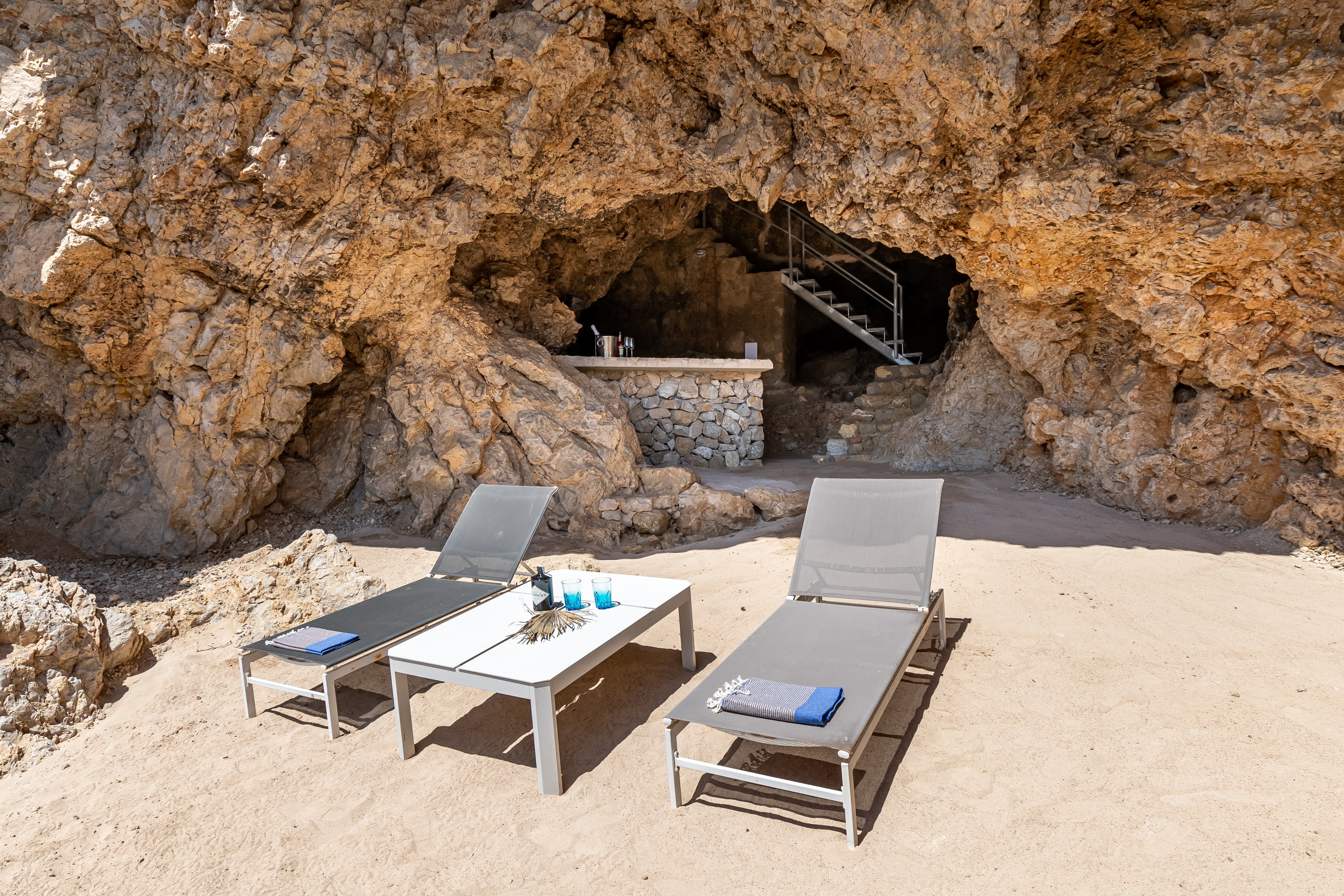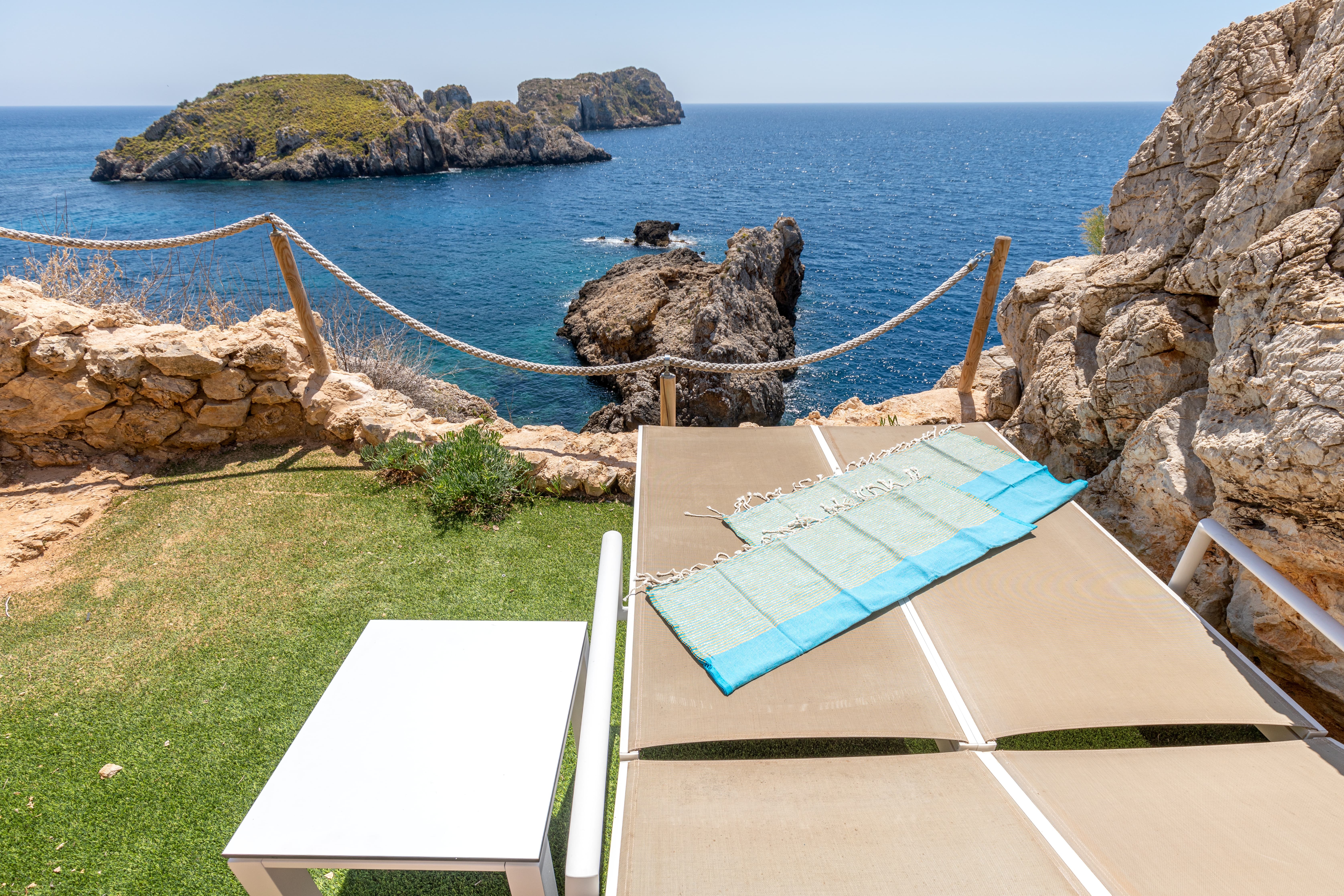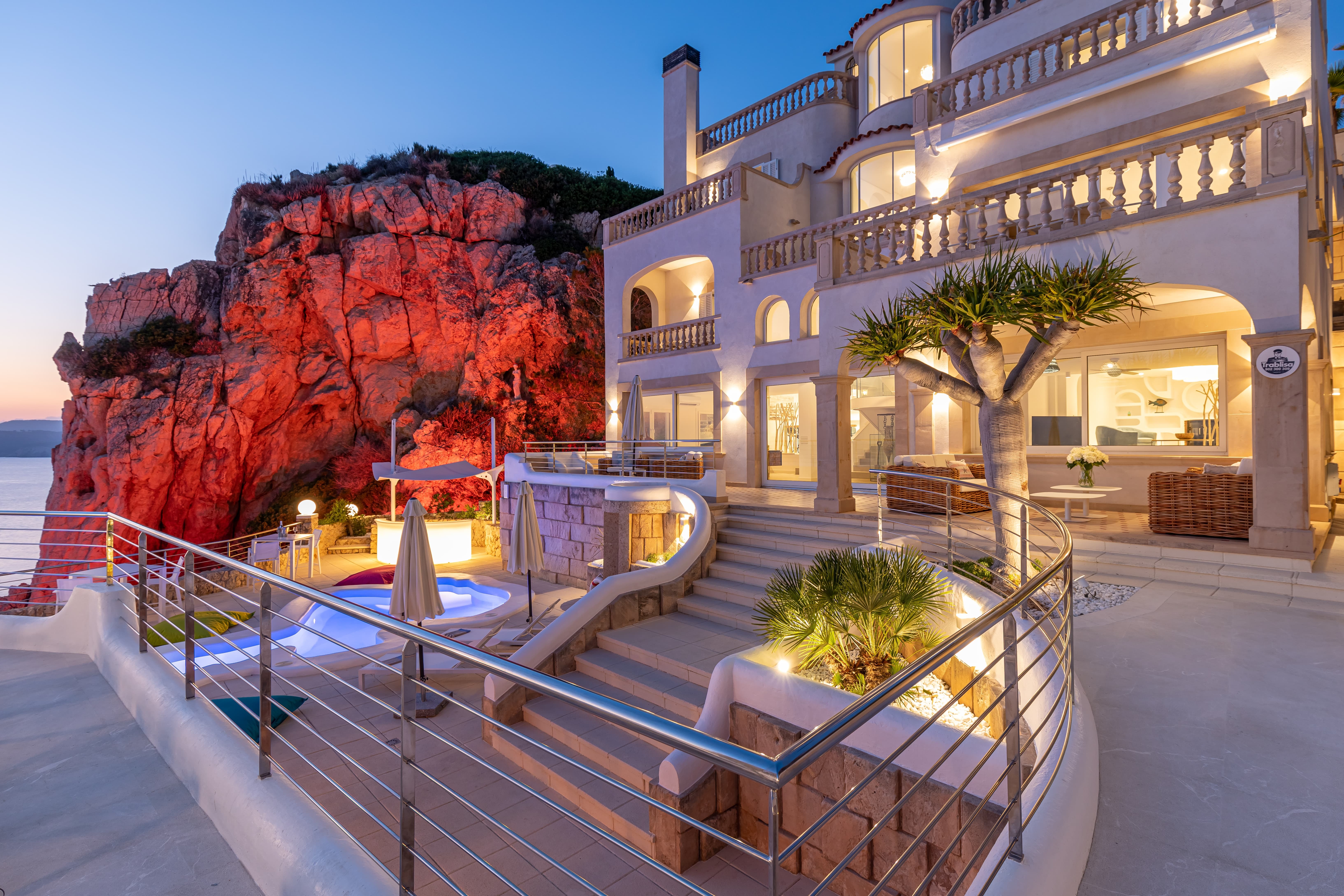 A series of terraces and chill-out areas unfold towards the water, offering both sun and shade throughout the day. The pool with pool bar overlooks the sea, while the secluded grotto, summer kitchen, and open-air dining spaces create a setting made for outdoor living.