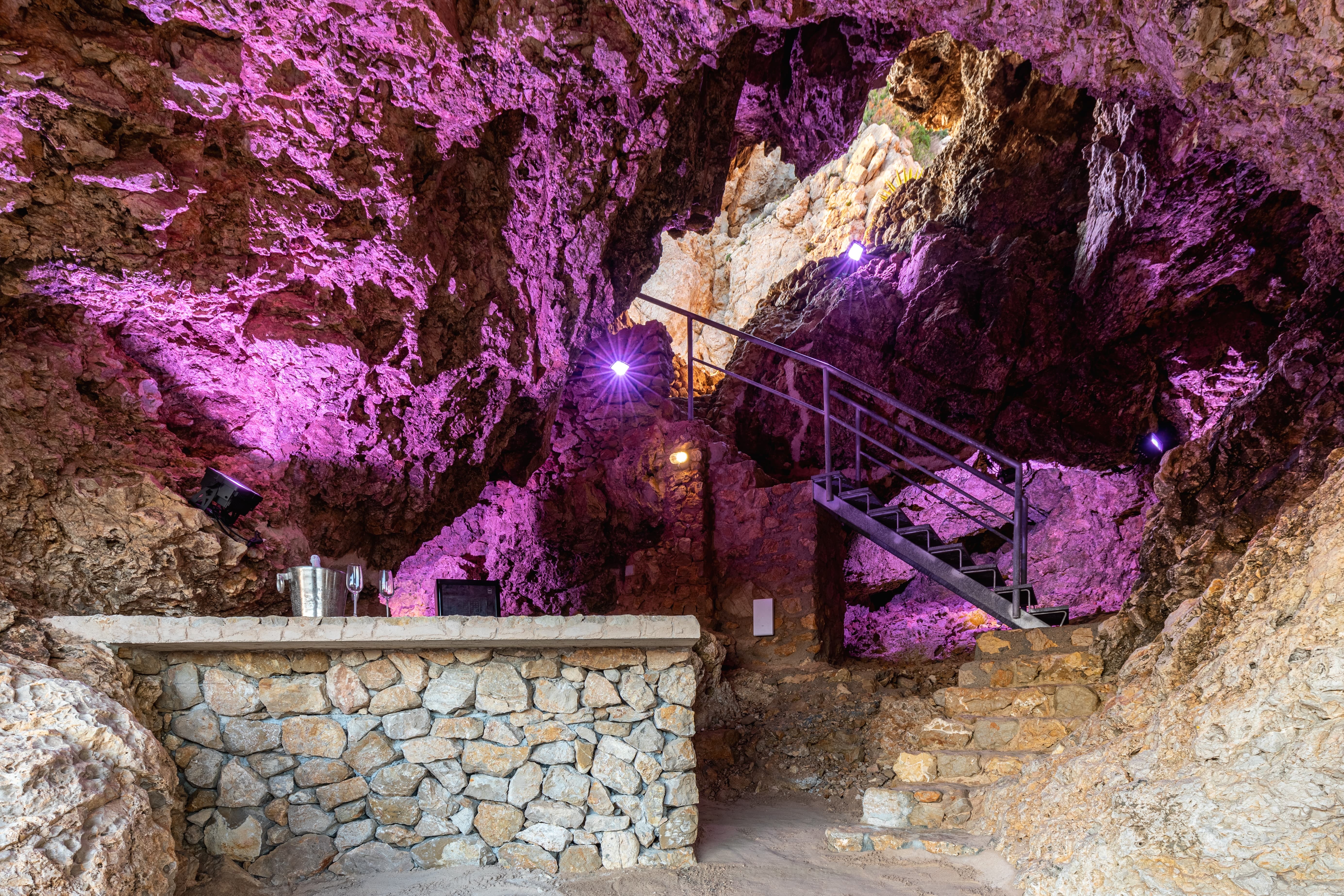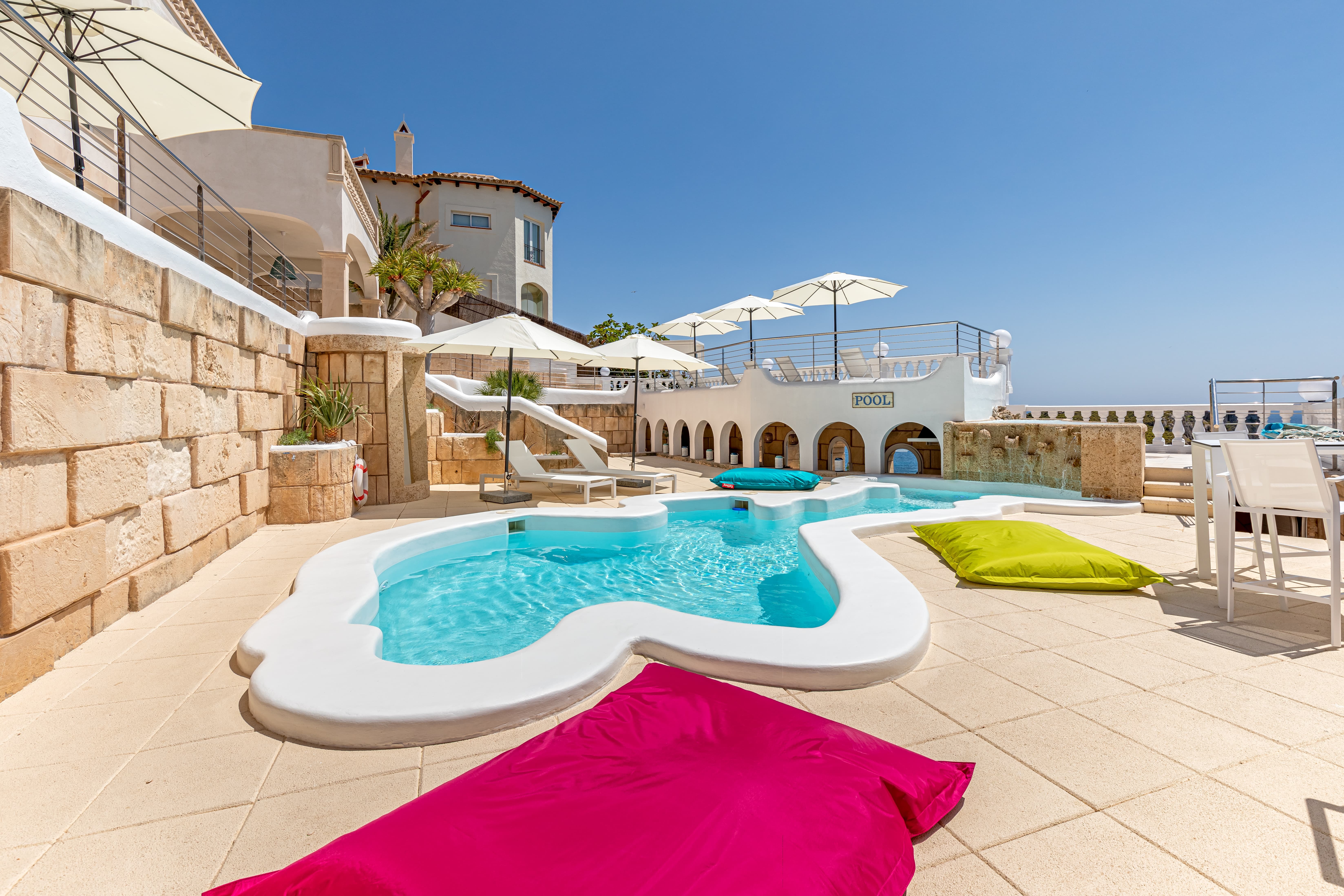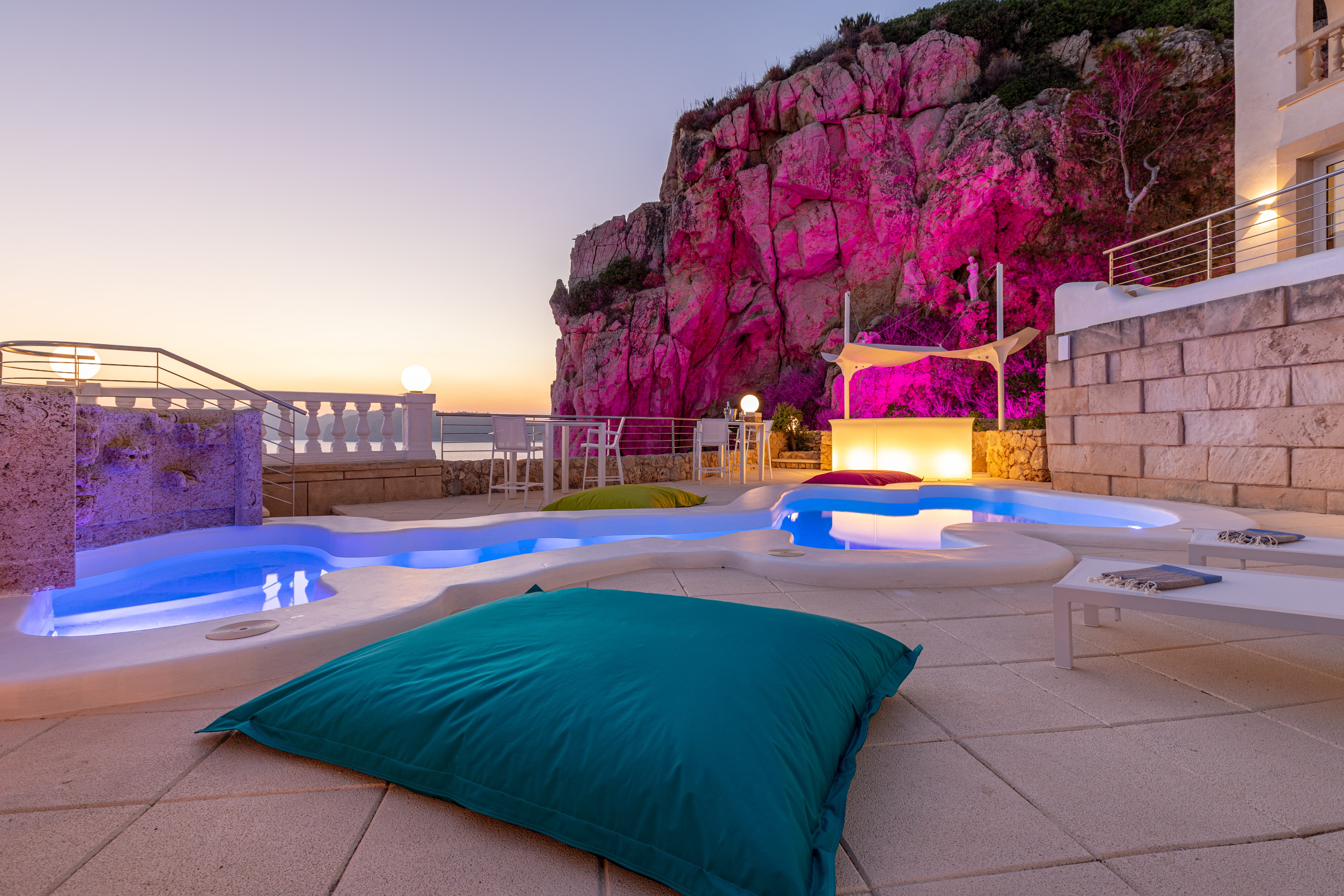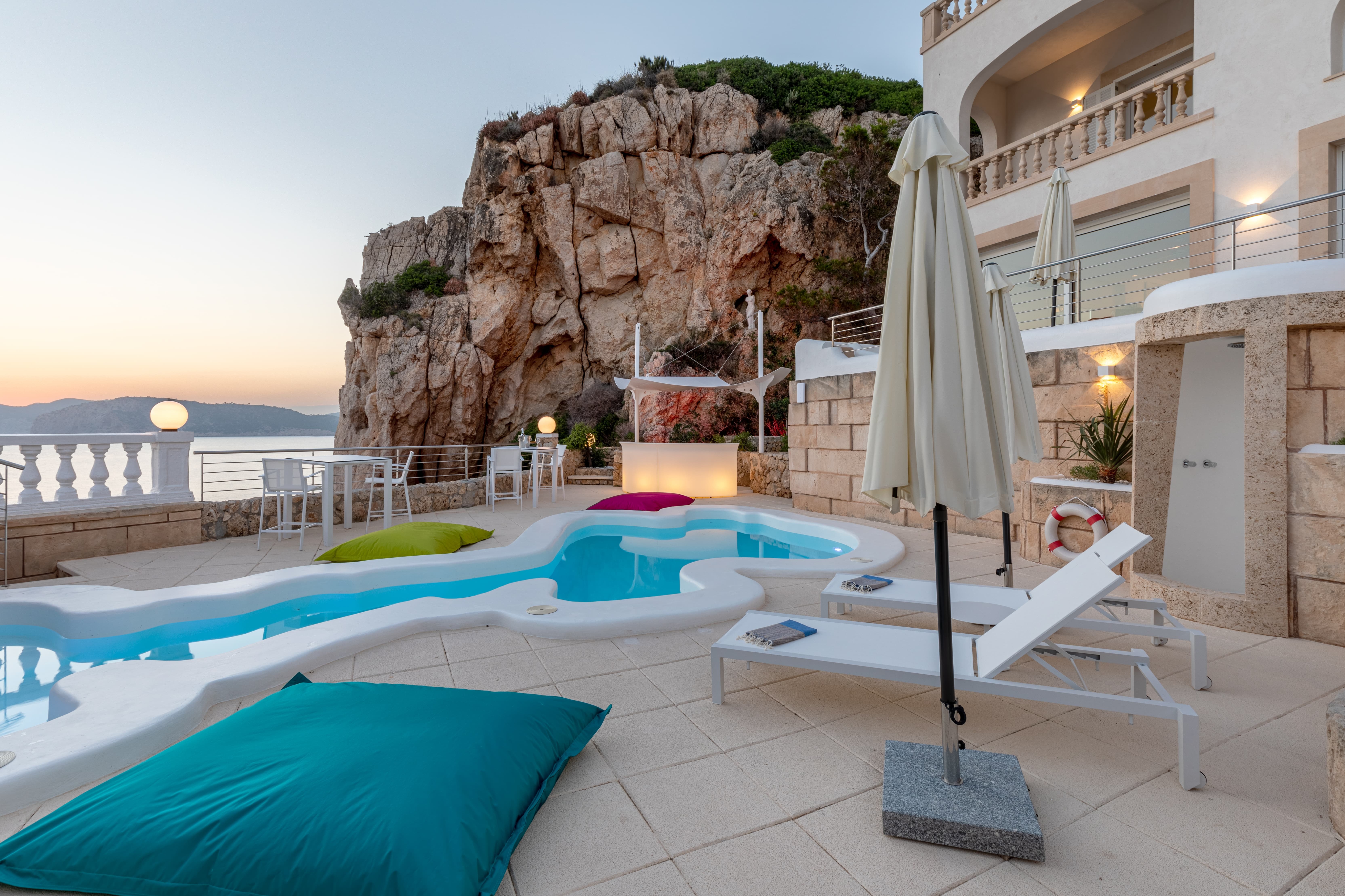 A series of terraces and chill-out areas unfold towards the water, offering both sun and shade throughout the day. The pool with pool bar overlooks the sea, while the secluded grotto, summer kitchen, and open-air dining spaces create a setting made for outdoor living.