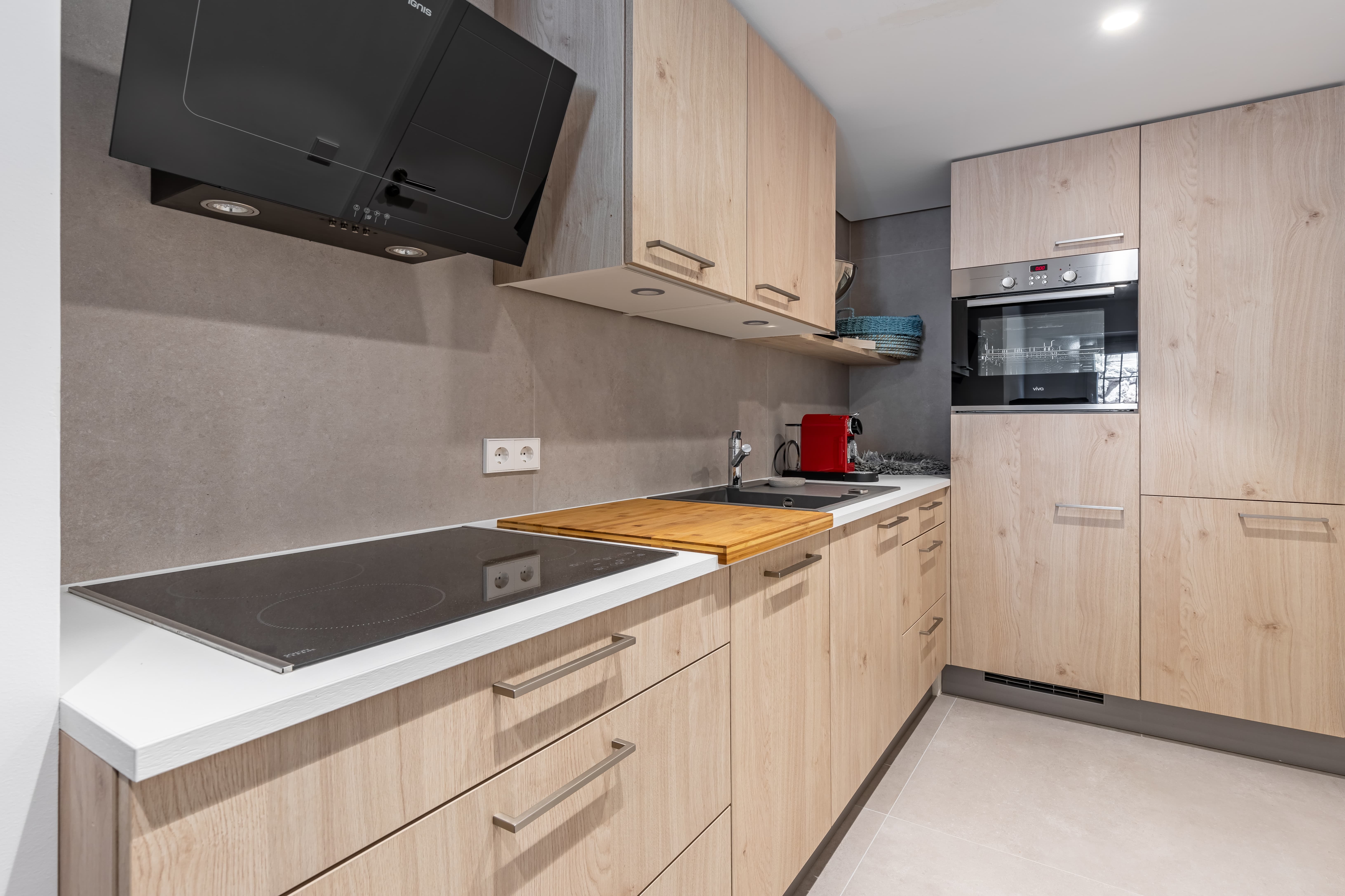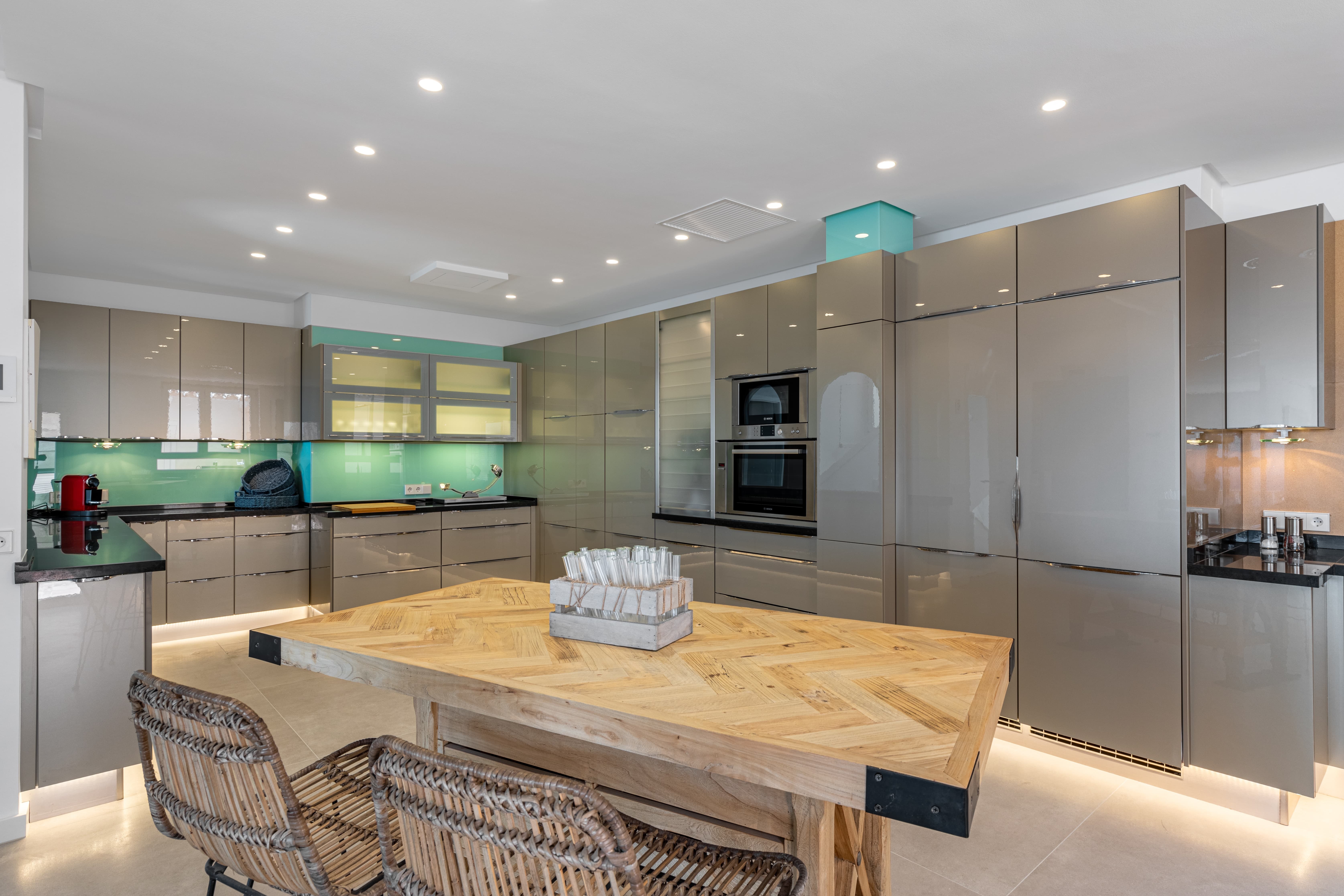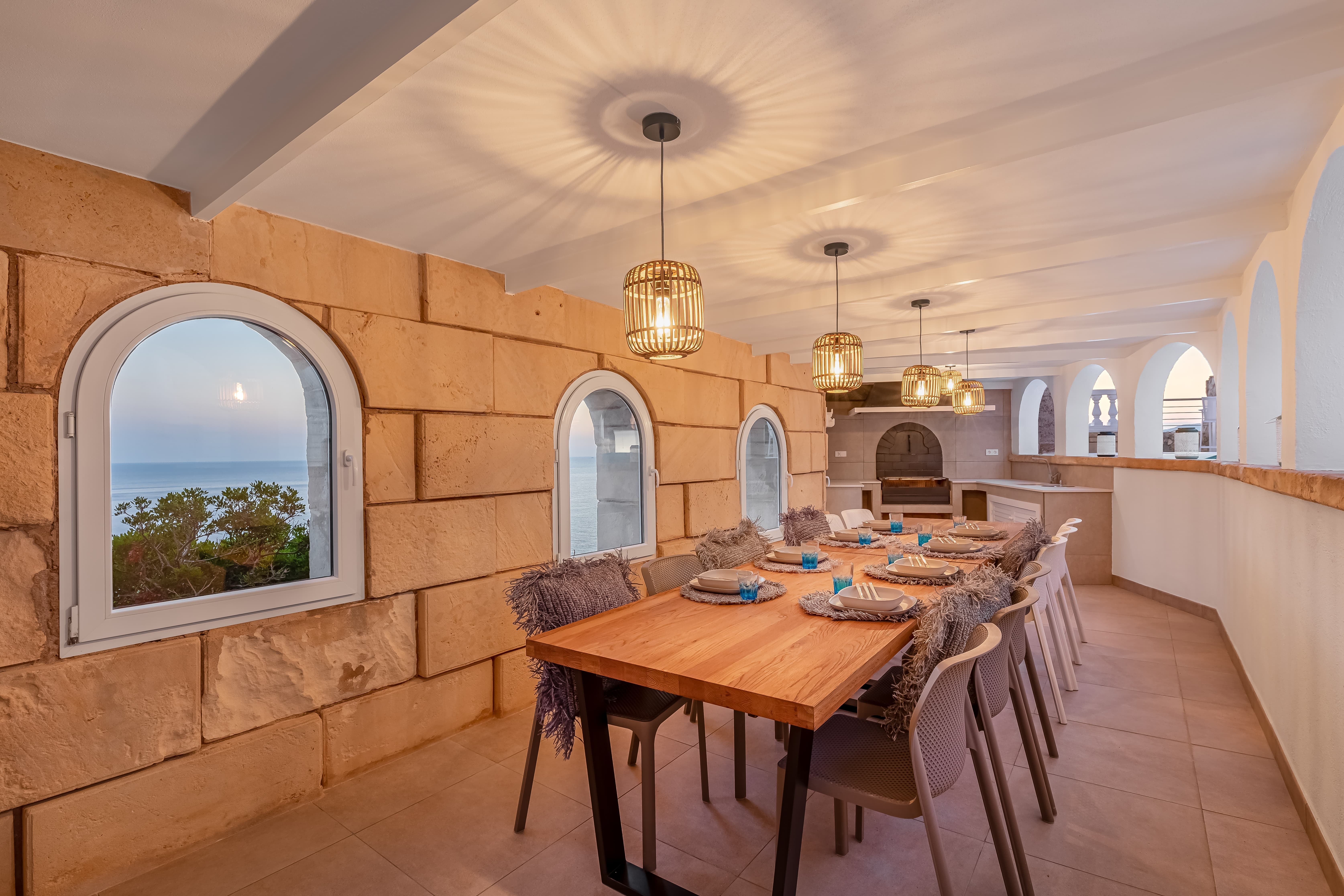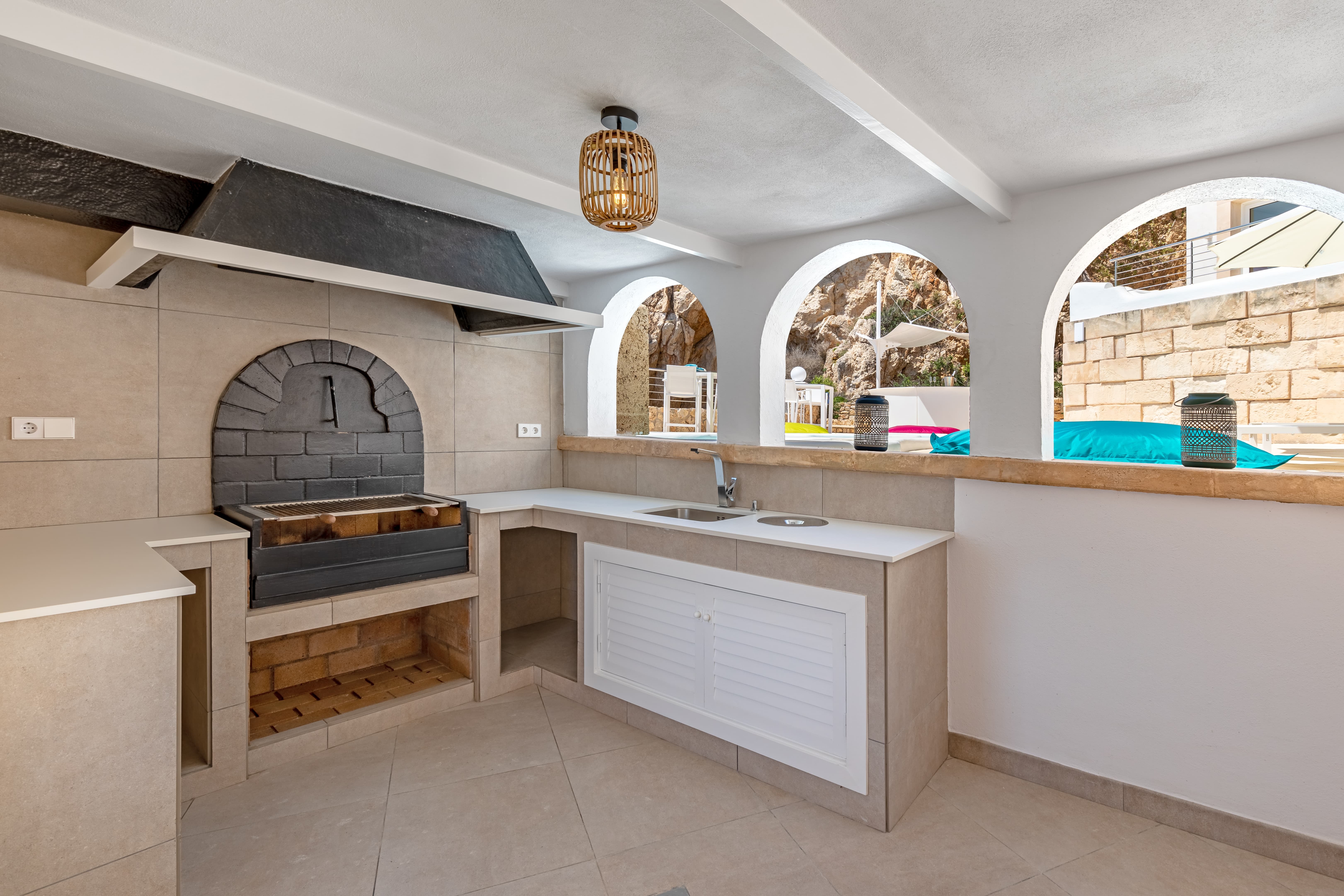A fully equipped modern kitchen sits at the heart of the villa, flowing naturally into the main dining and living areas. Outdoors, a summer kitchen, barbecue, and pizza oven create an effortless setting for long lunches and relaxed evenings by the sea
