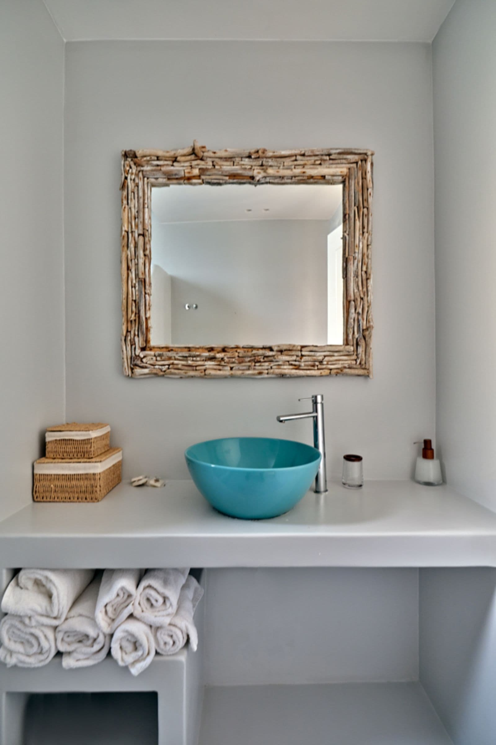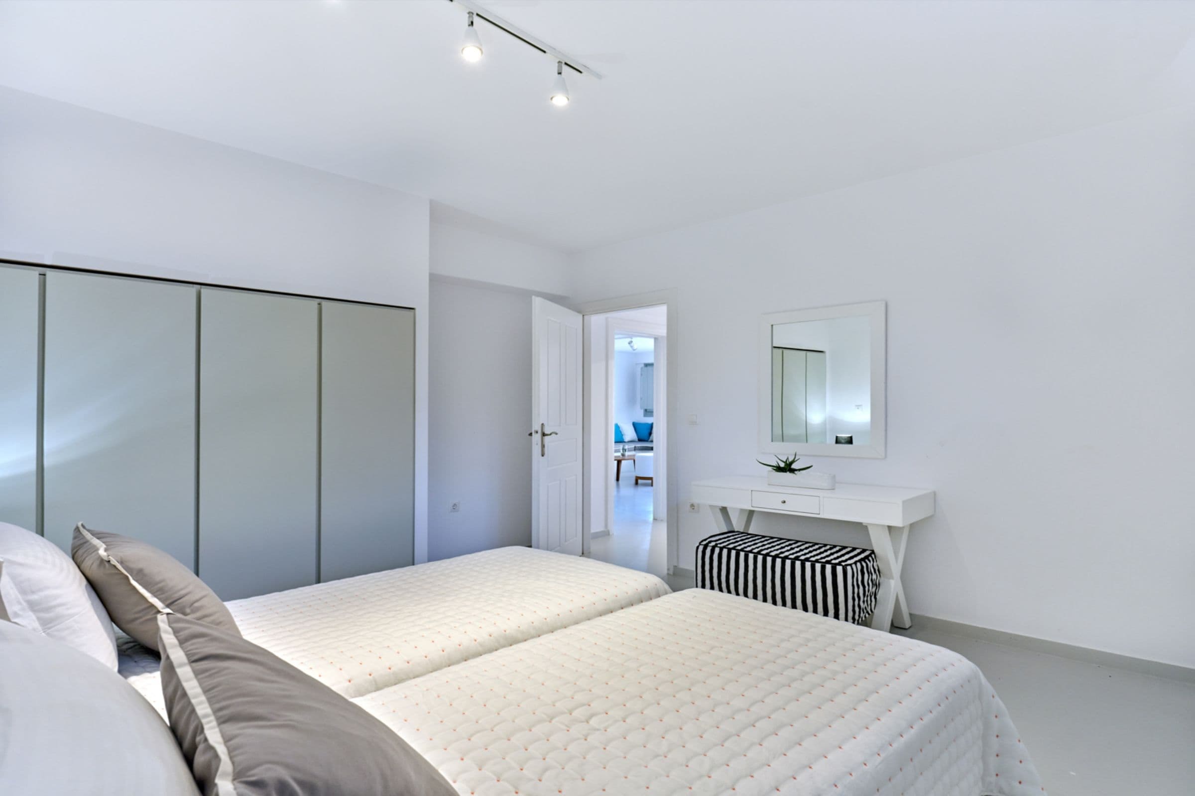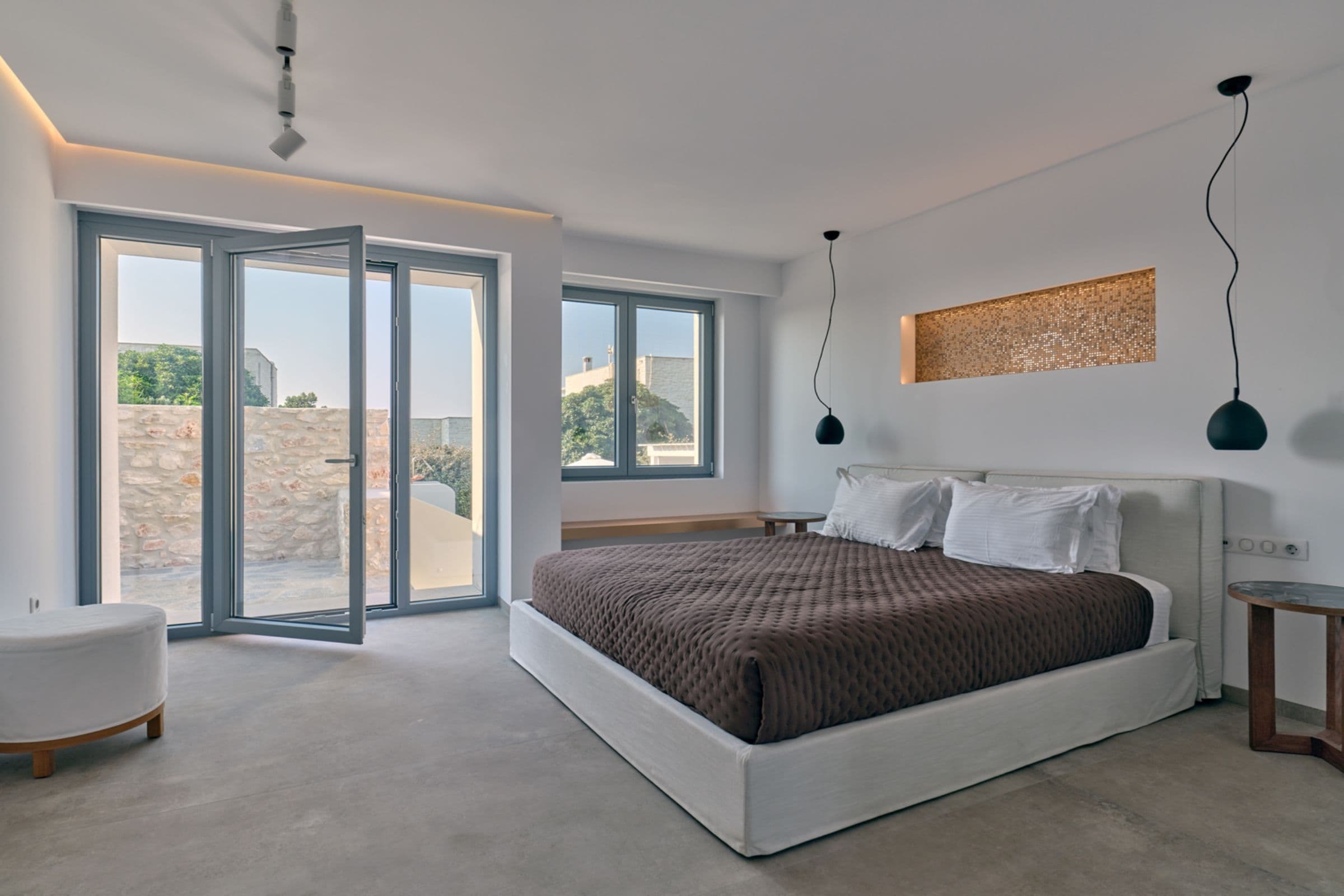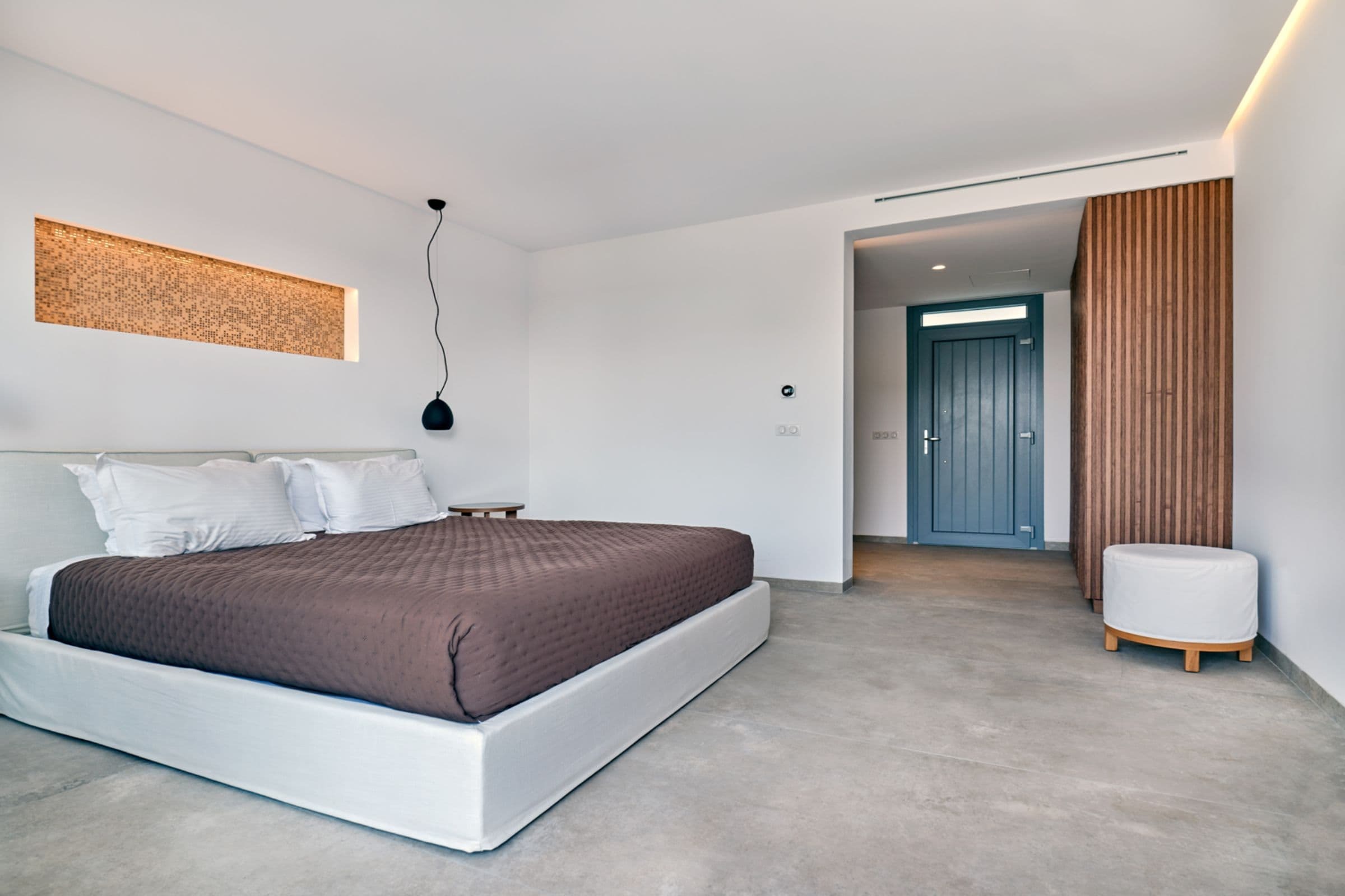 There is an immediate sense of calm here. The design leans into a minimal Cycladic aesthetic, clean lines, natural textures, and soft tones that allow light and landscape to define the space. It is a setting that feels considered yet unforced, designed for living rather than display.